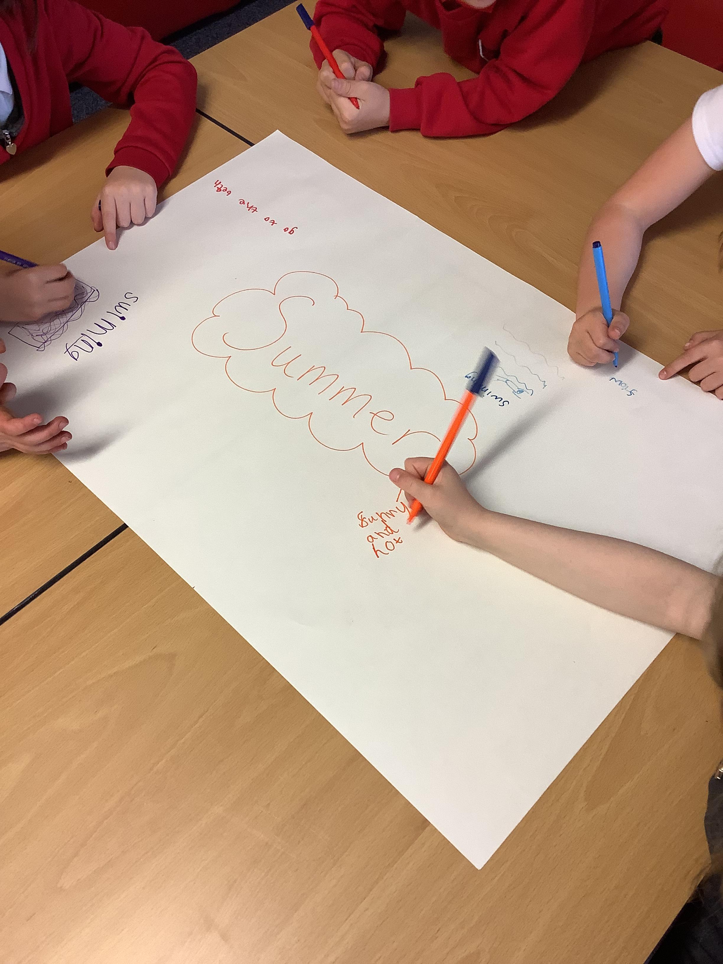 In English we have been looking at poetry. Last week, we explored how play makes us feel by playing in sand, mud and water. Today, we thought of different vocabulary to describe our play to help us write our own poems.