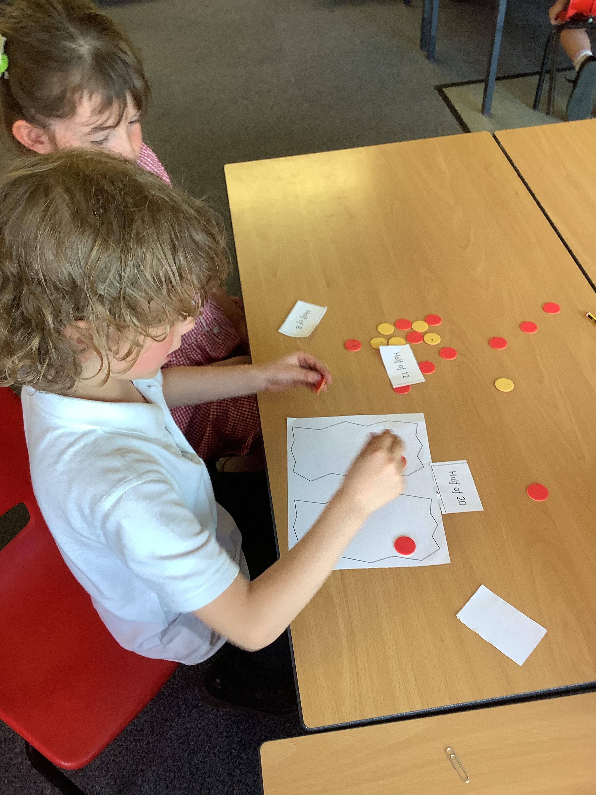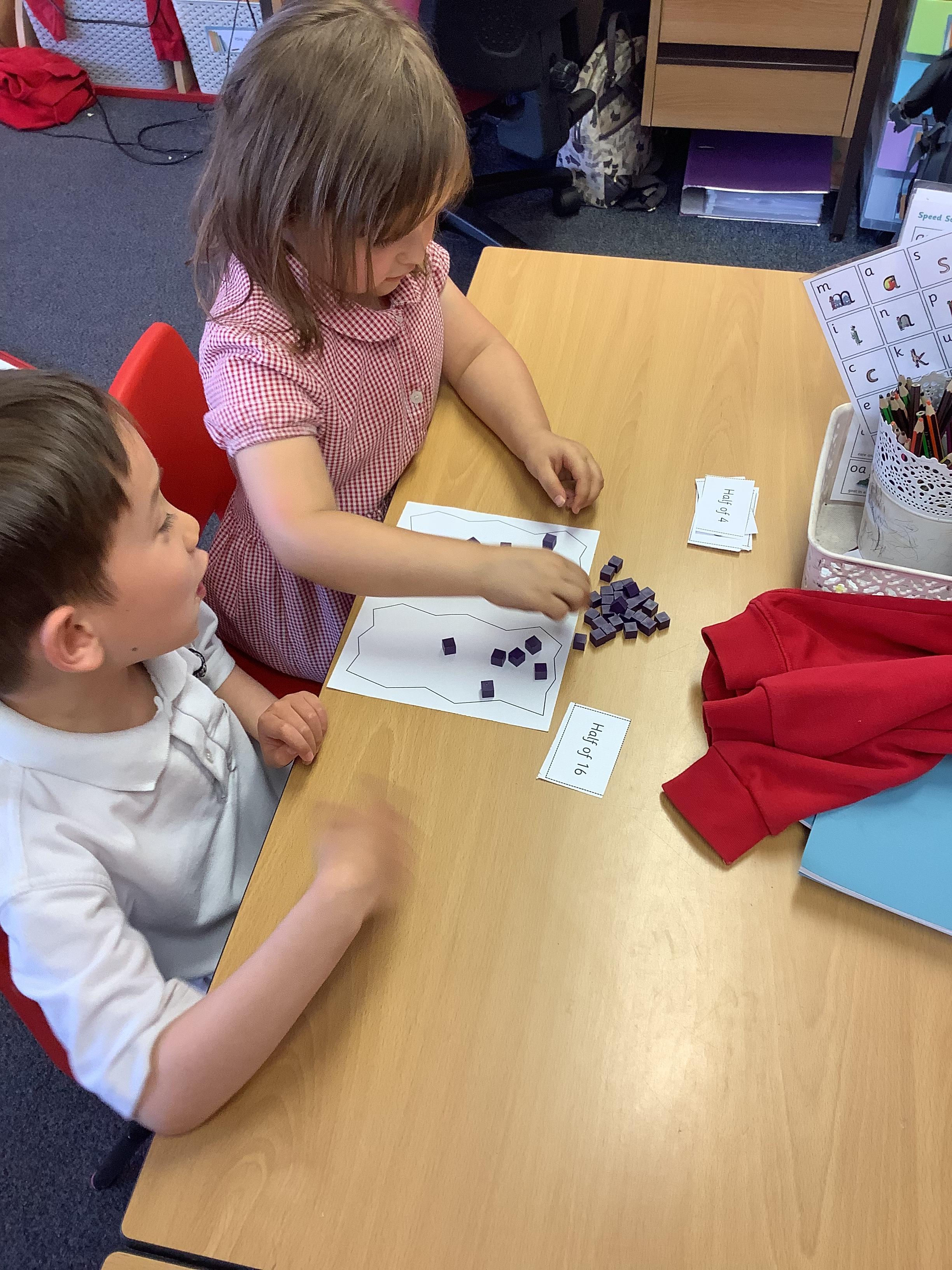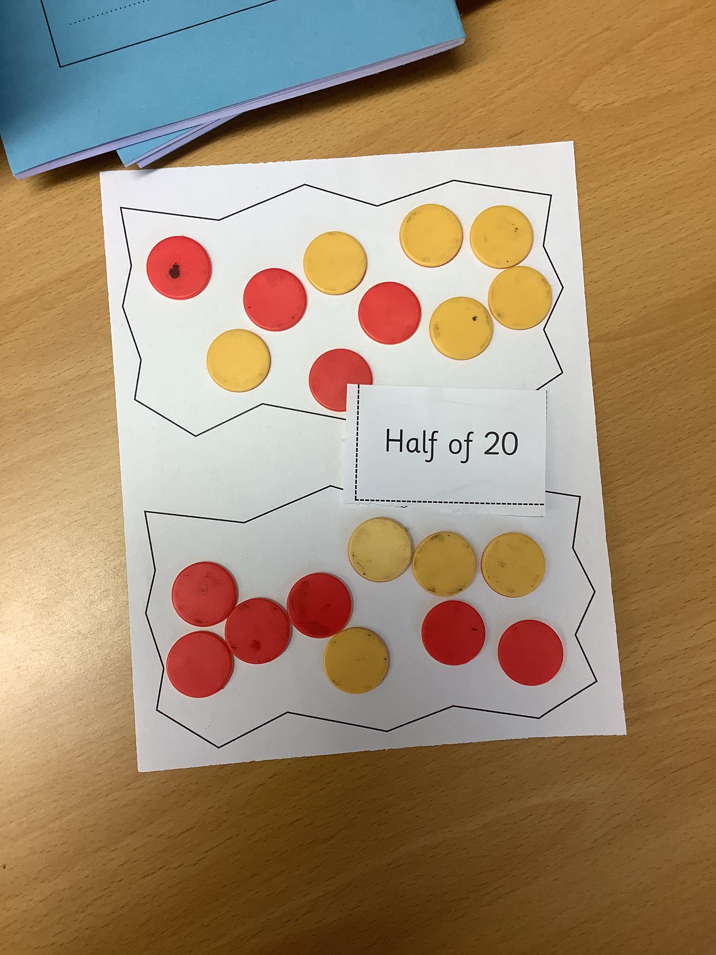 In Maths this week we have been halving shapes and then we moved on to halving amounts of objects. We worked with a partner to find half of lots of different numbers.