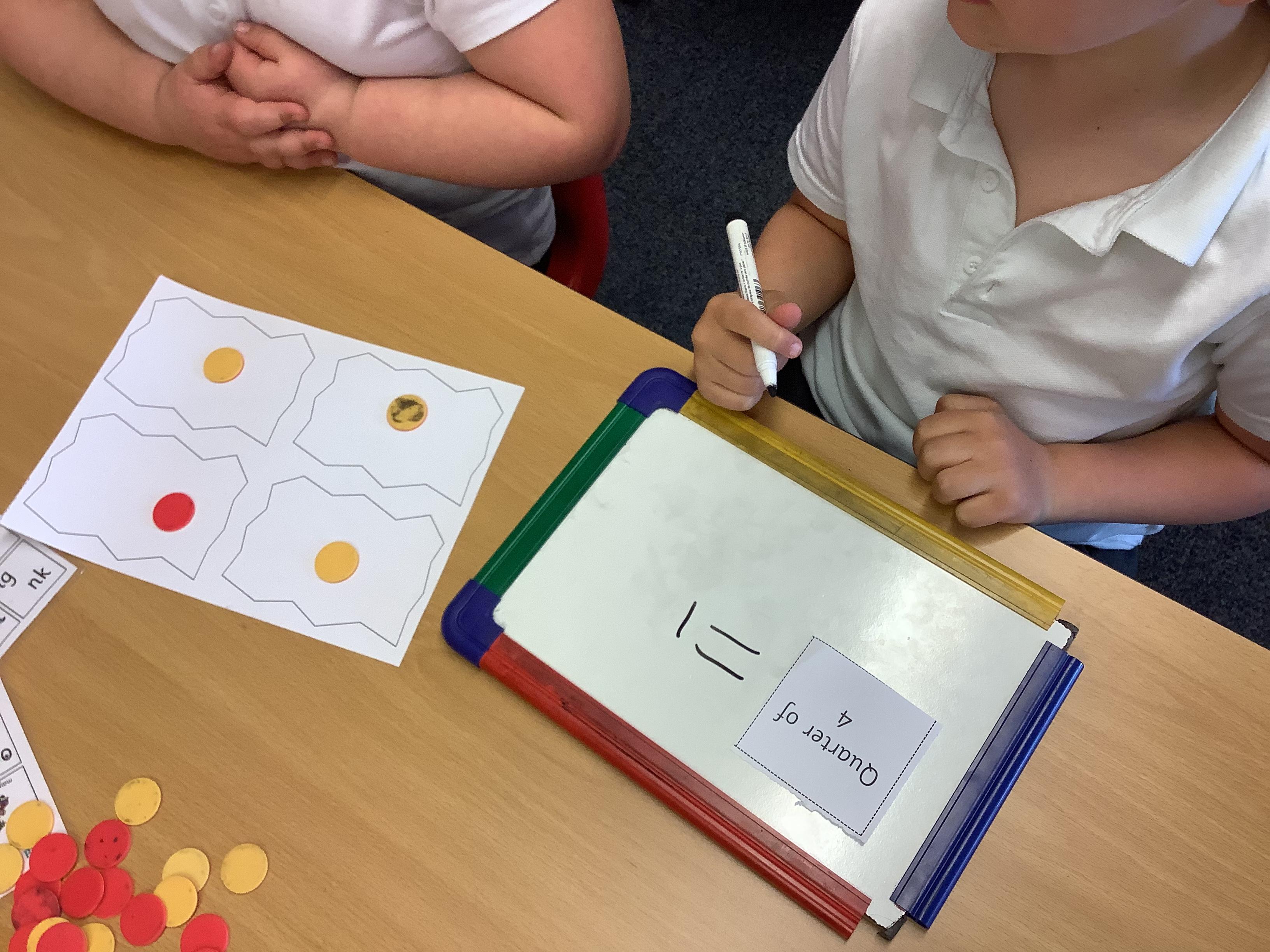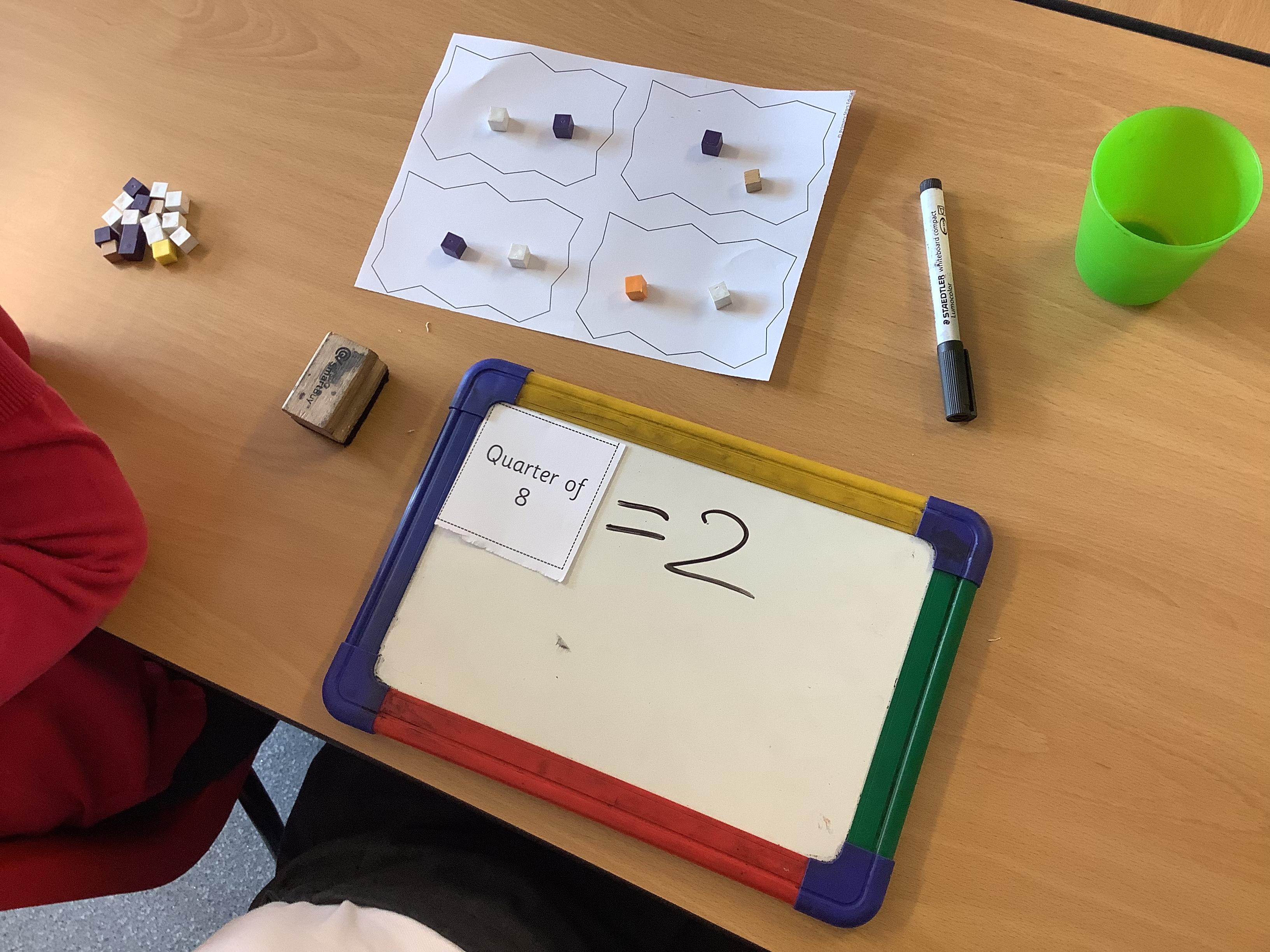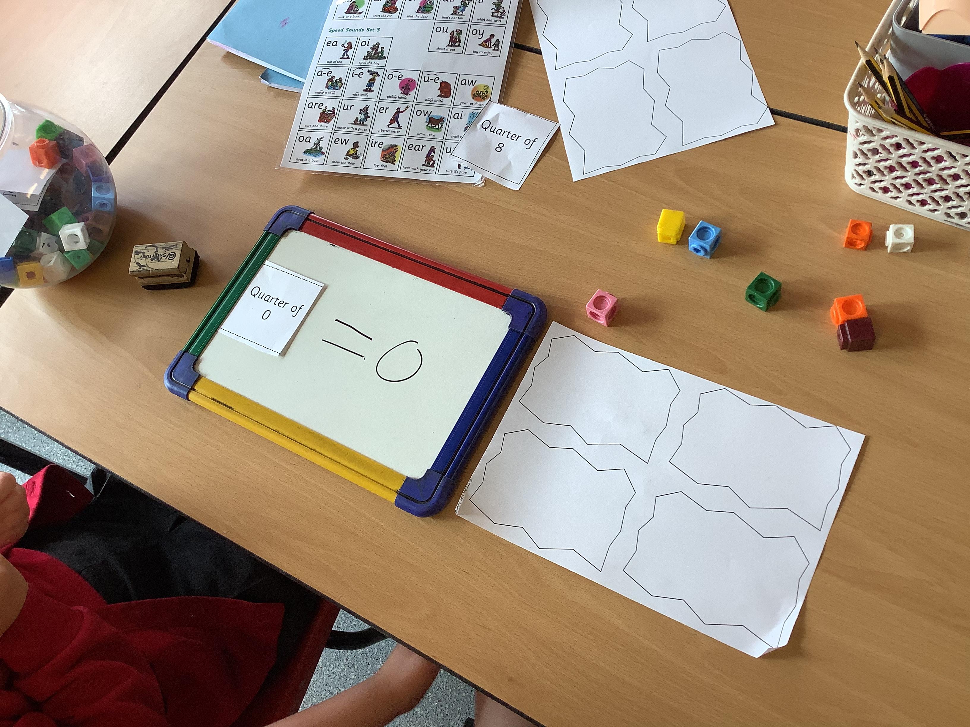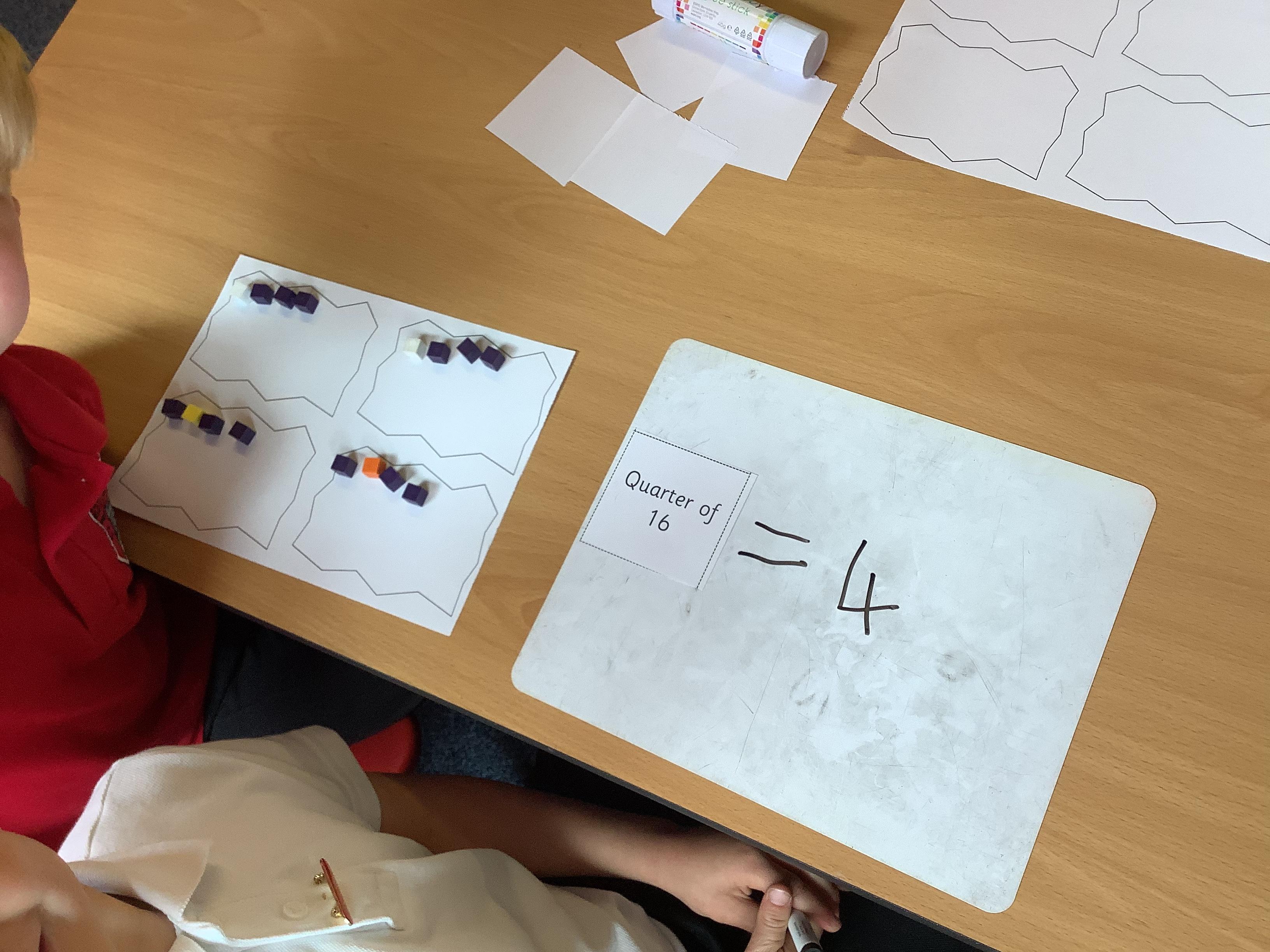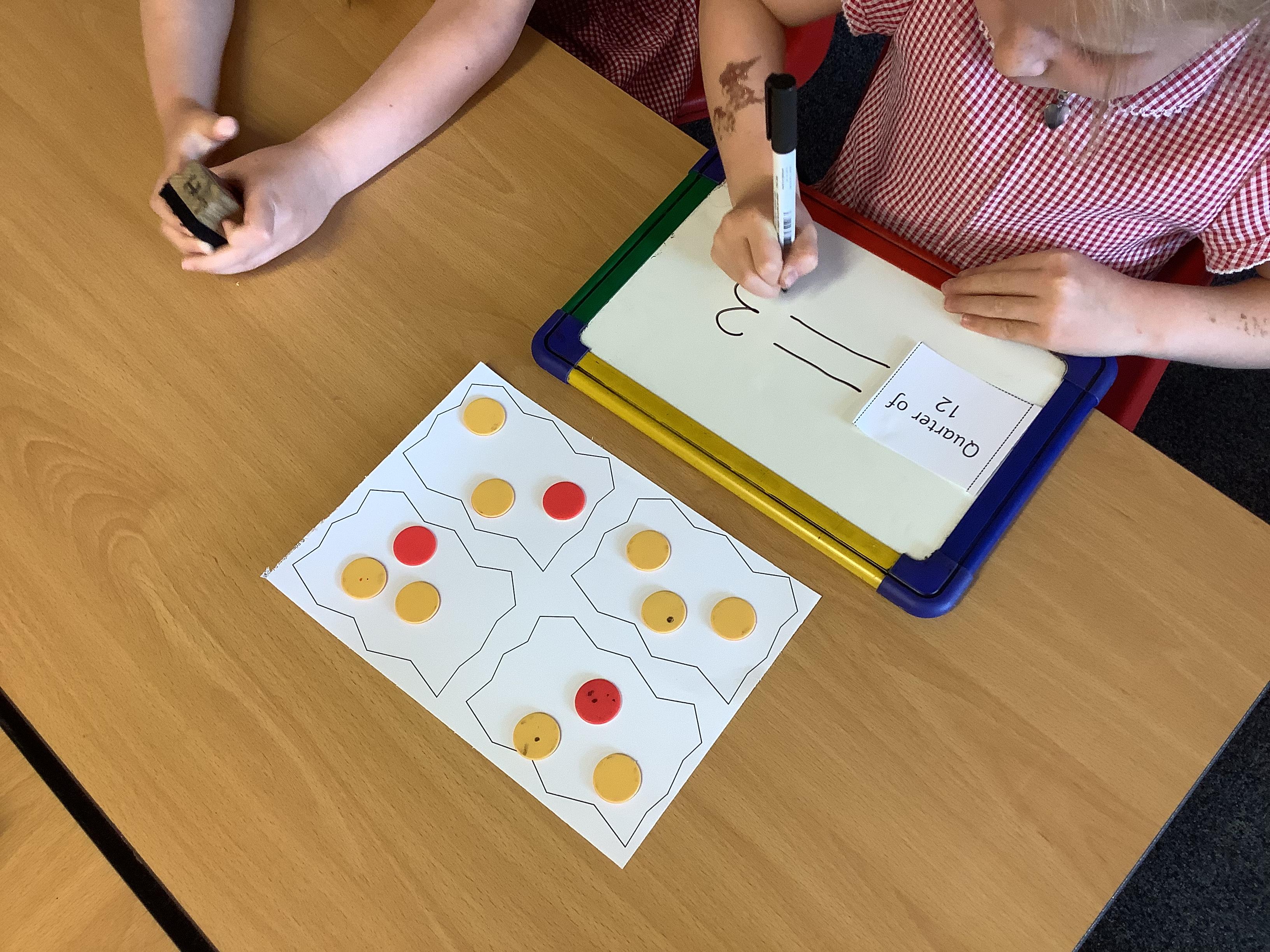 In Maths today, we looked at finding quarters of different amounts. We used practical resources to help us.