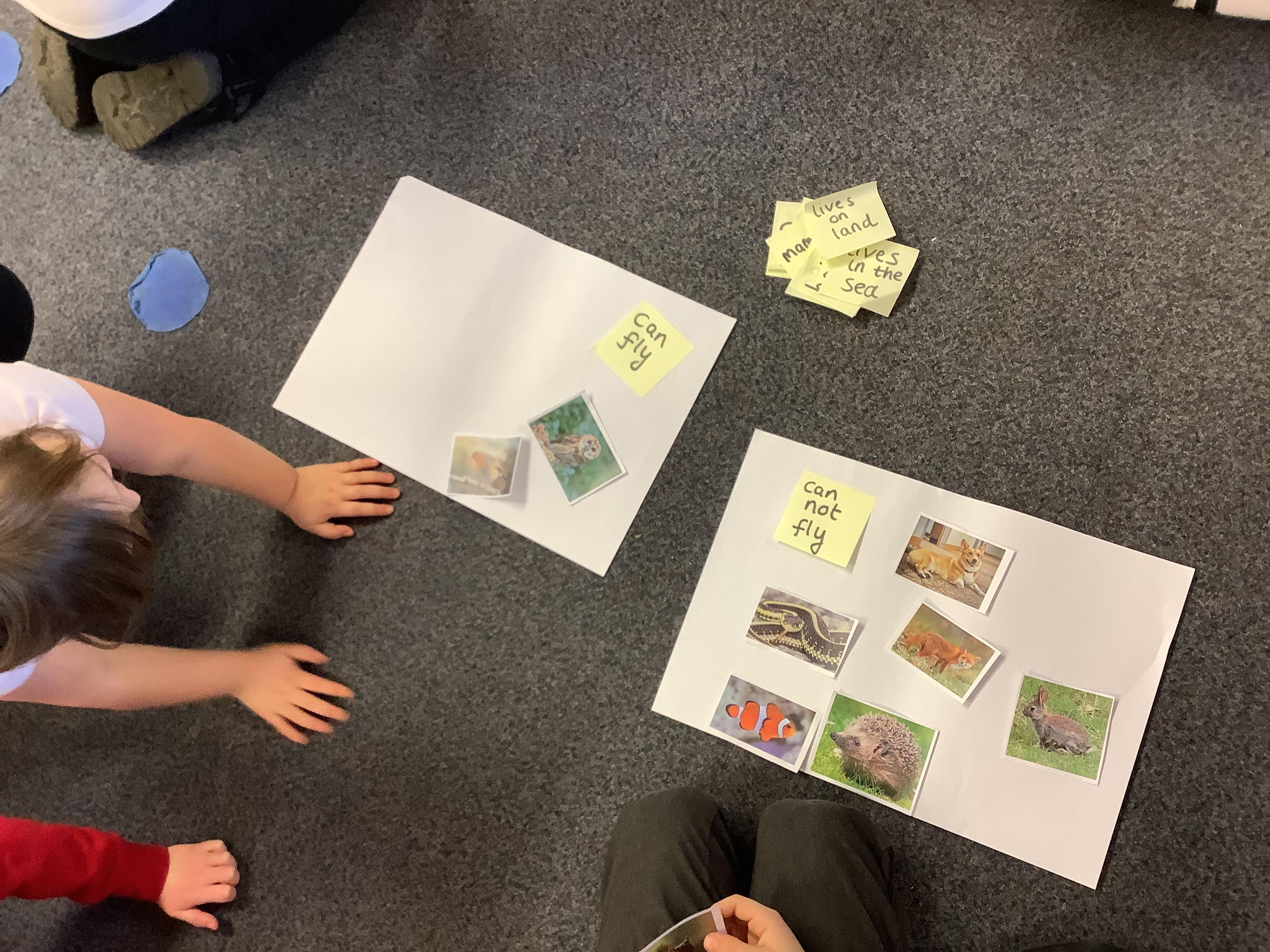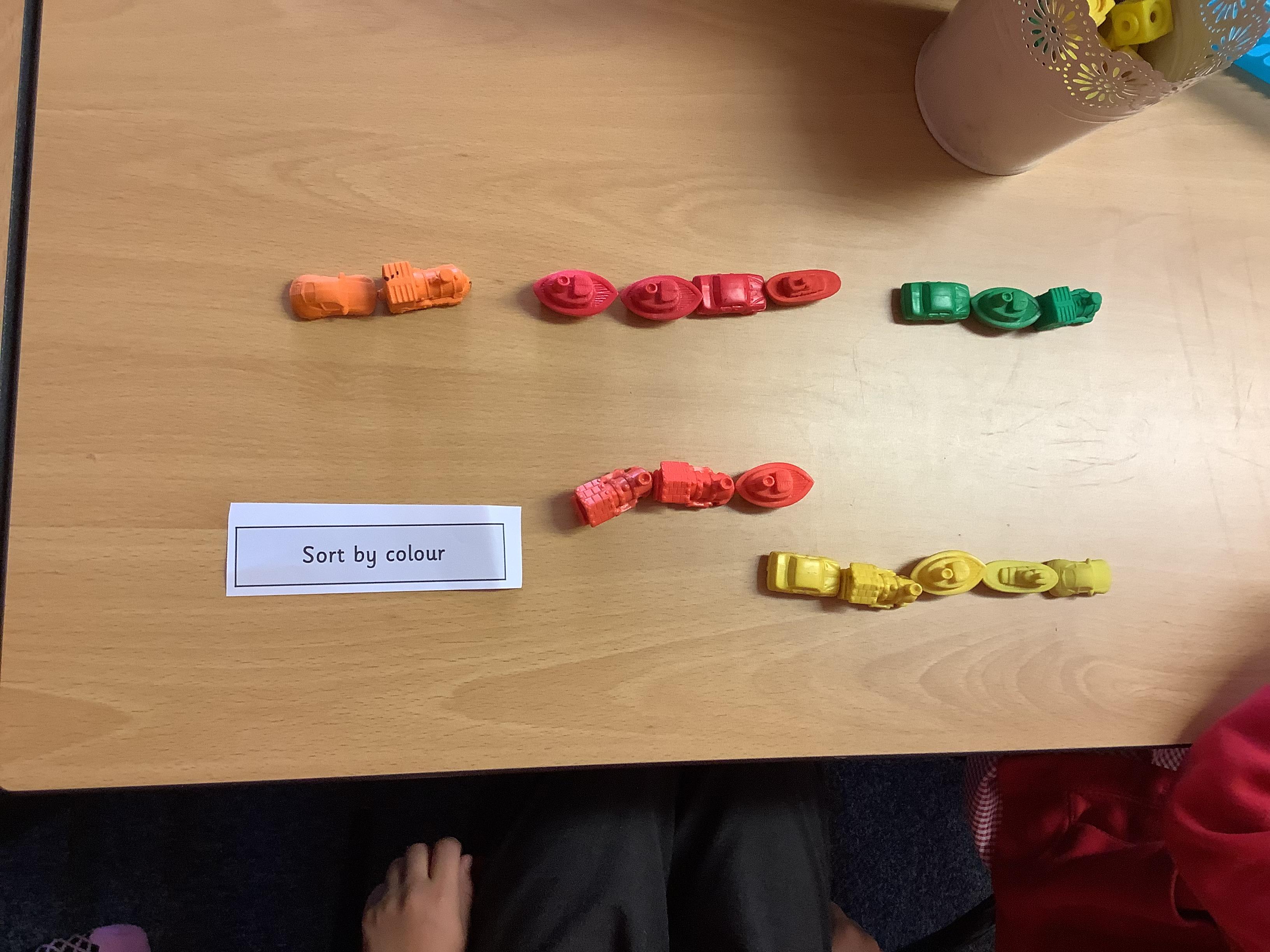 In Maths, we have been exploring different ways to sort objects into groups. We explored how we could sort by colour, type and size.