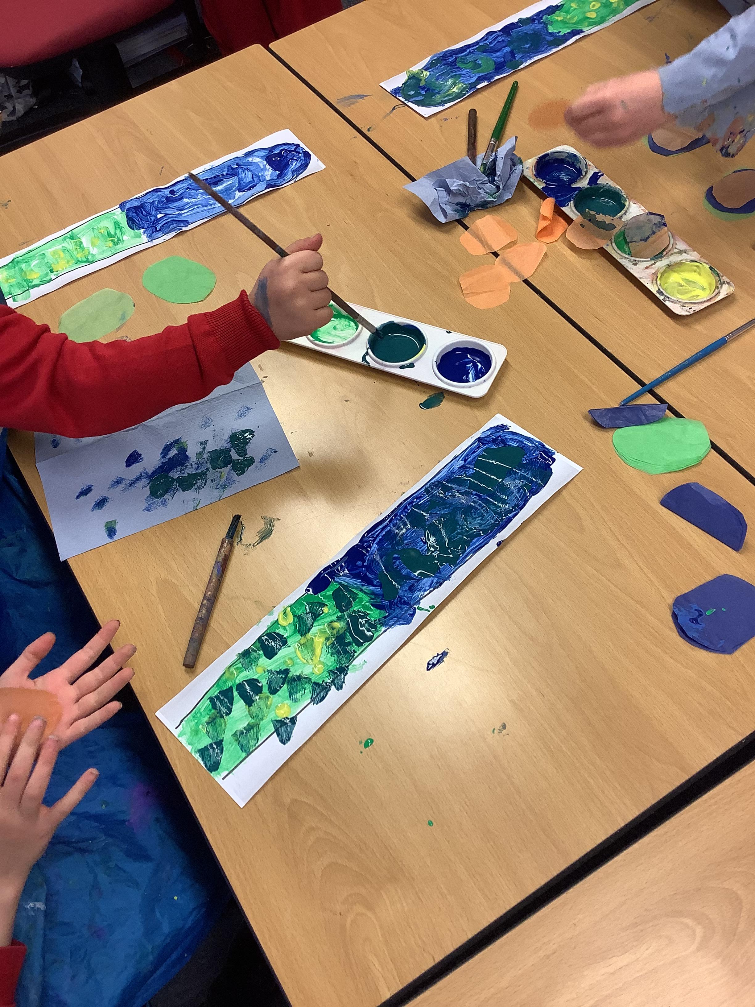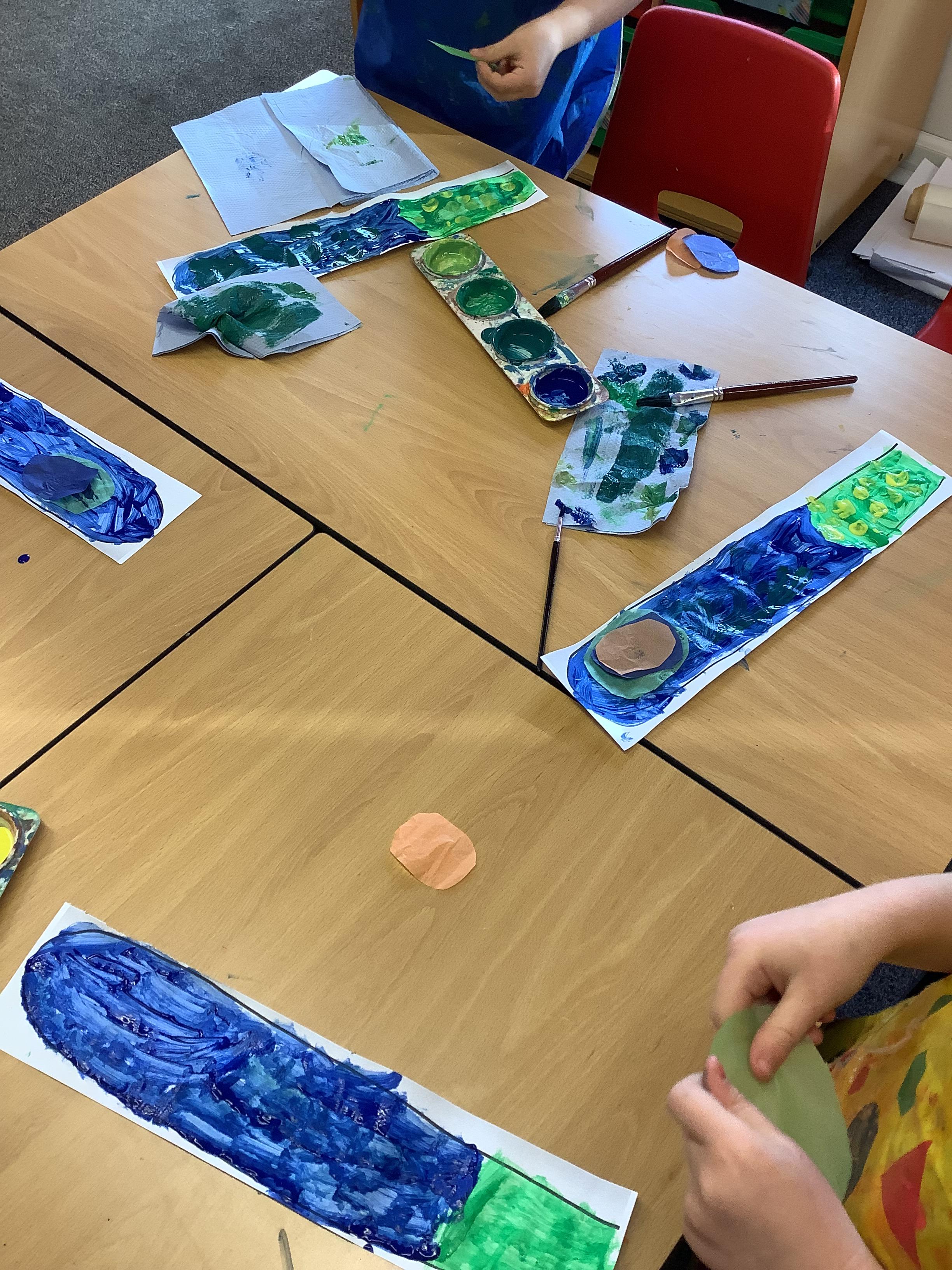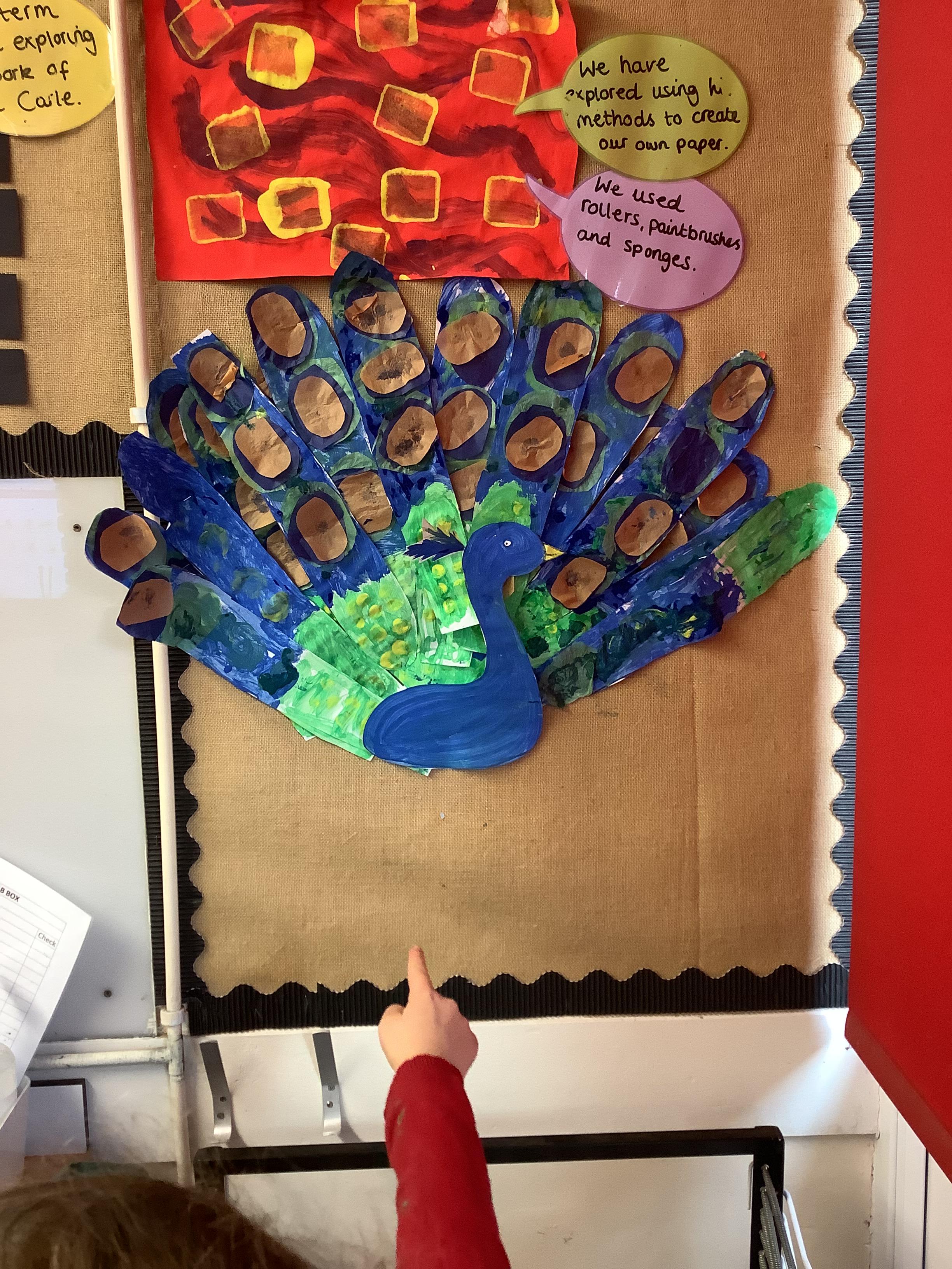 In Art we have been looking at the work of Eric Carle. We have explored how we can use rollers, paintbrushes and sponges to create artwork in a similar style. We used some of these methods to create our class peacock.
