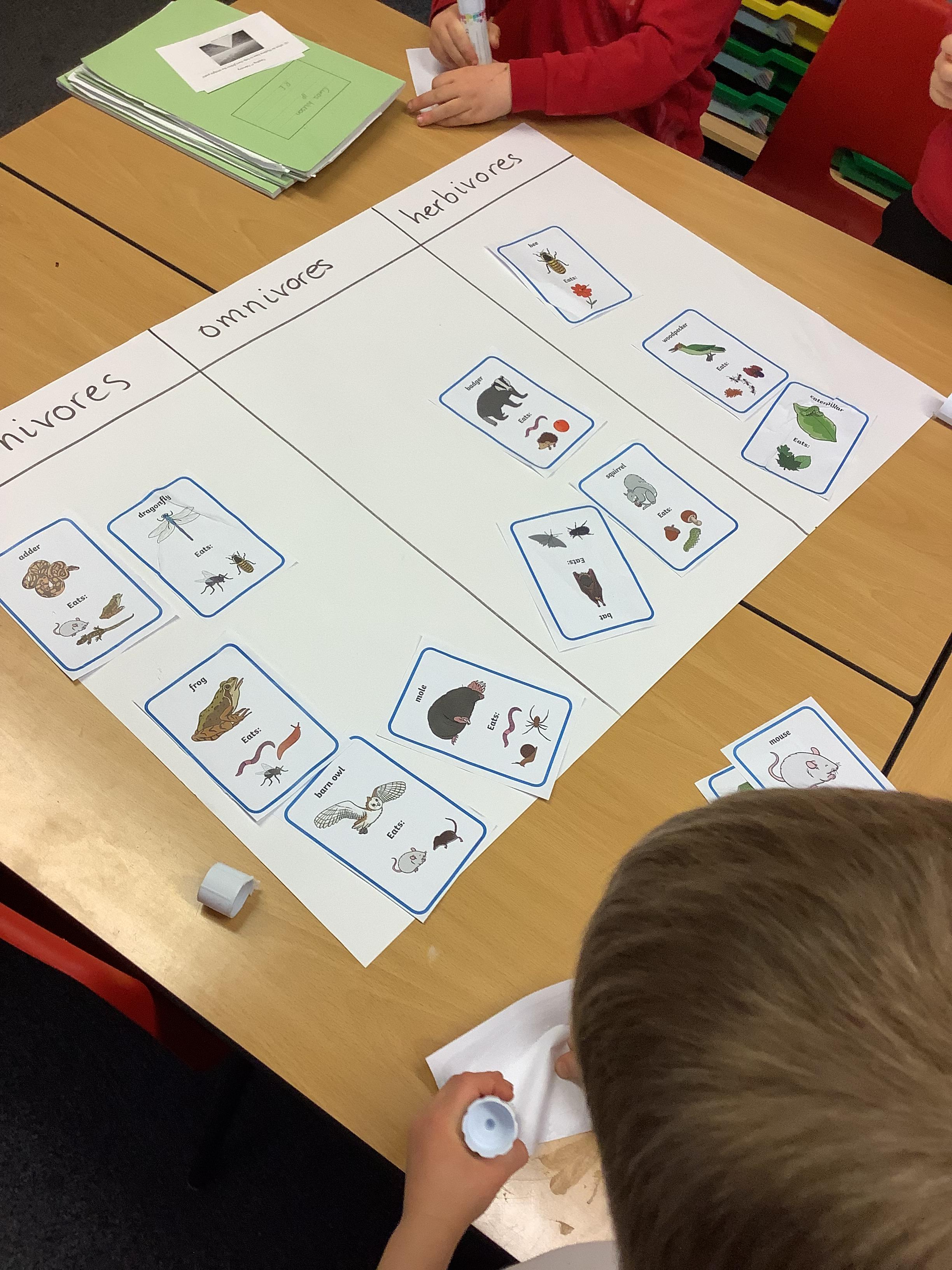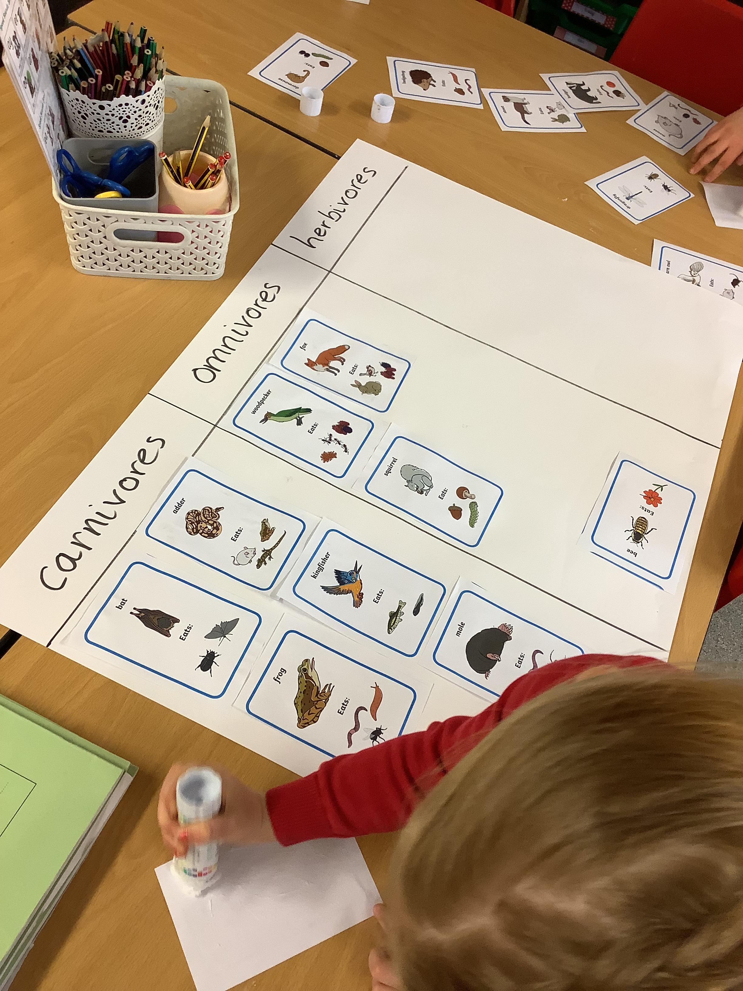 In Science this week we looked at what different animals eat. We found out that carnivores eat meat, herbivores eat plants and omnivores eat meat and plants. We sorted animals into groups based on what they eat.