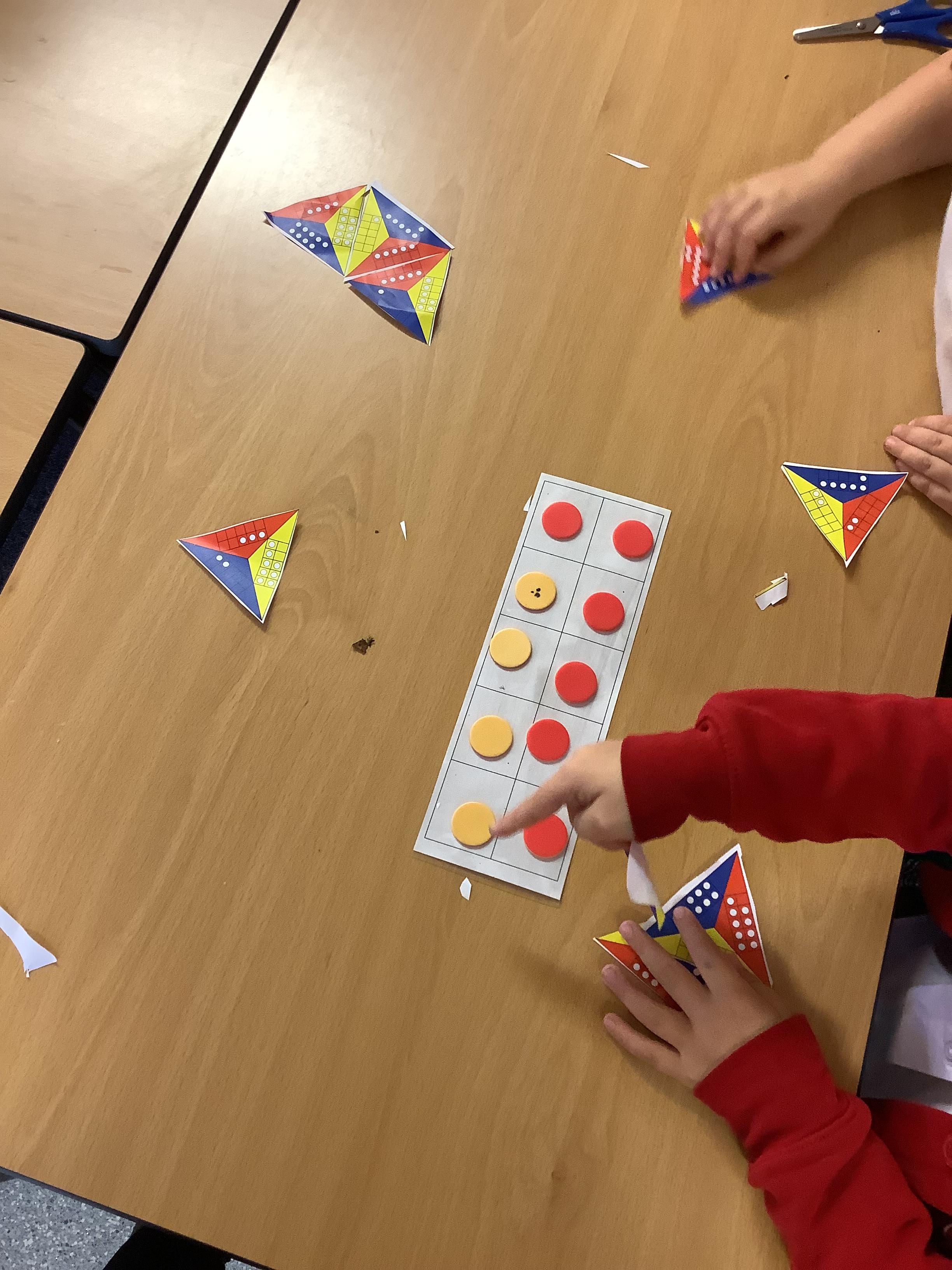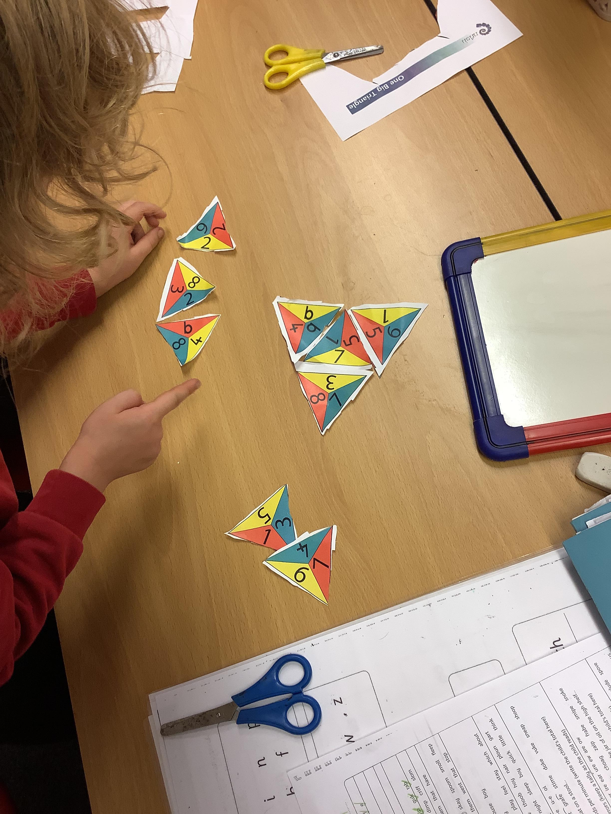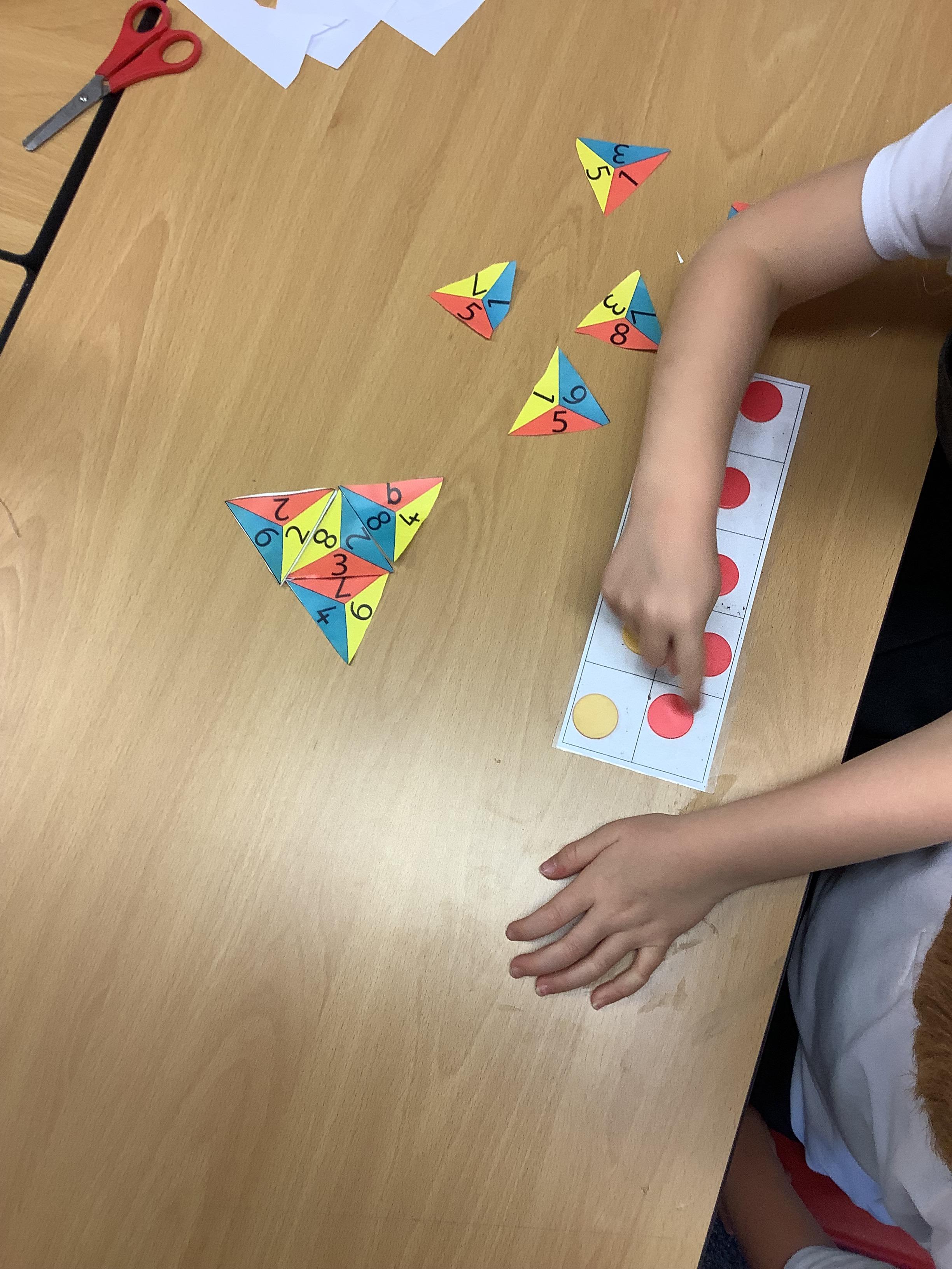 This week in Maths we have been learning our number bonds to 10. We worked hard to complete the big triangle challenge. For this challenge, we had to match the number bonds on each triangle to create one big triangle. We used our tens frames to help us.