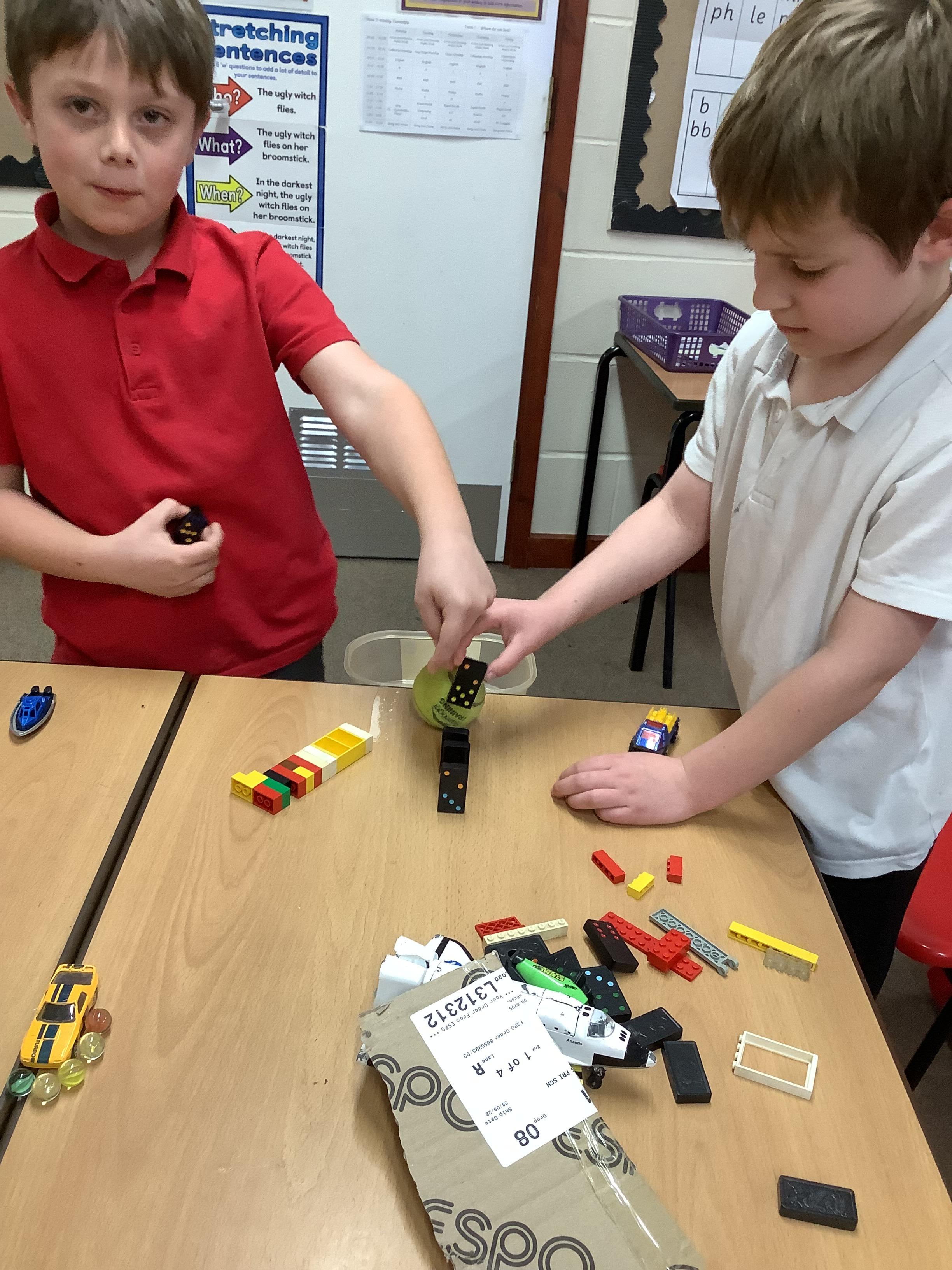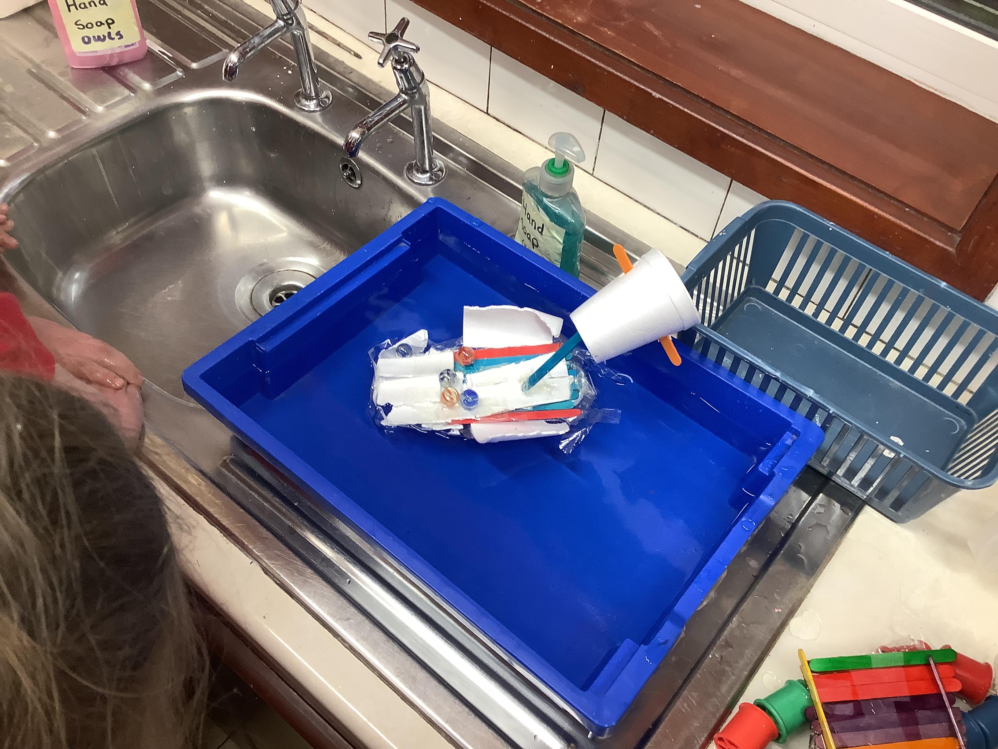 Children had to work together to construct a boat that will float a certain distance (when pushed) without sinking. This must be done whilst carrying a number of marbles. The number of marbles should be increased for each test to see how strong the vessel is. The initial challenge was for children to explore the equipment. Children could also ask for a ‘top tip’ as a group if they find the challenge difficult.