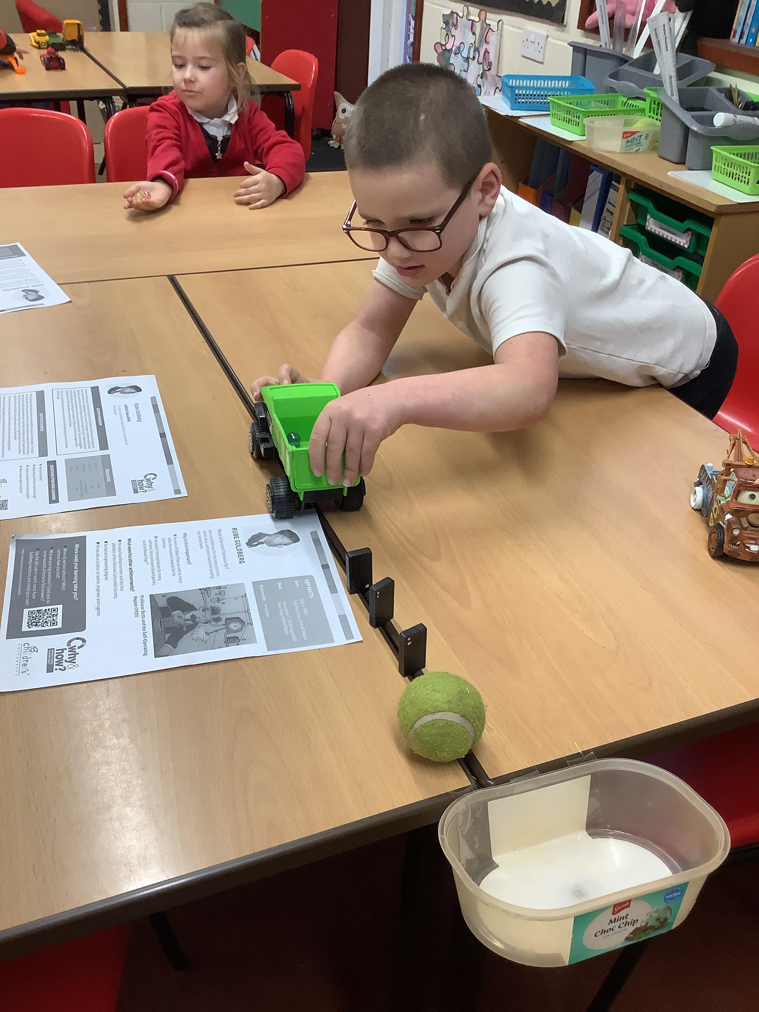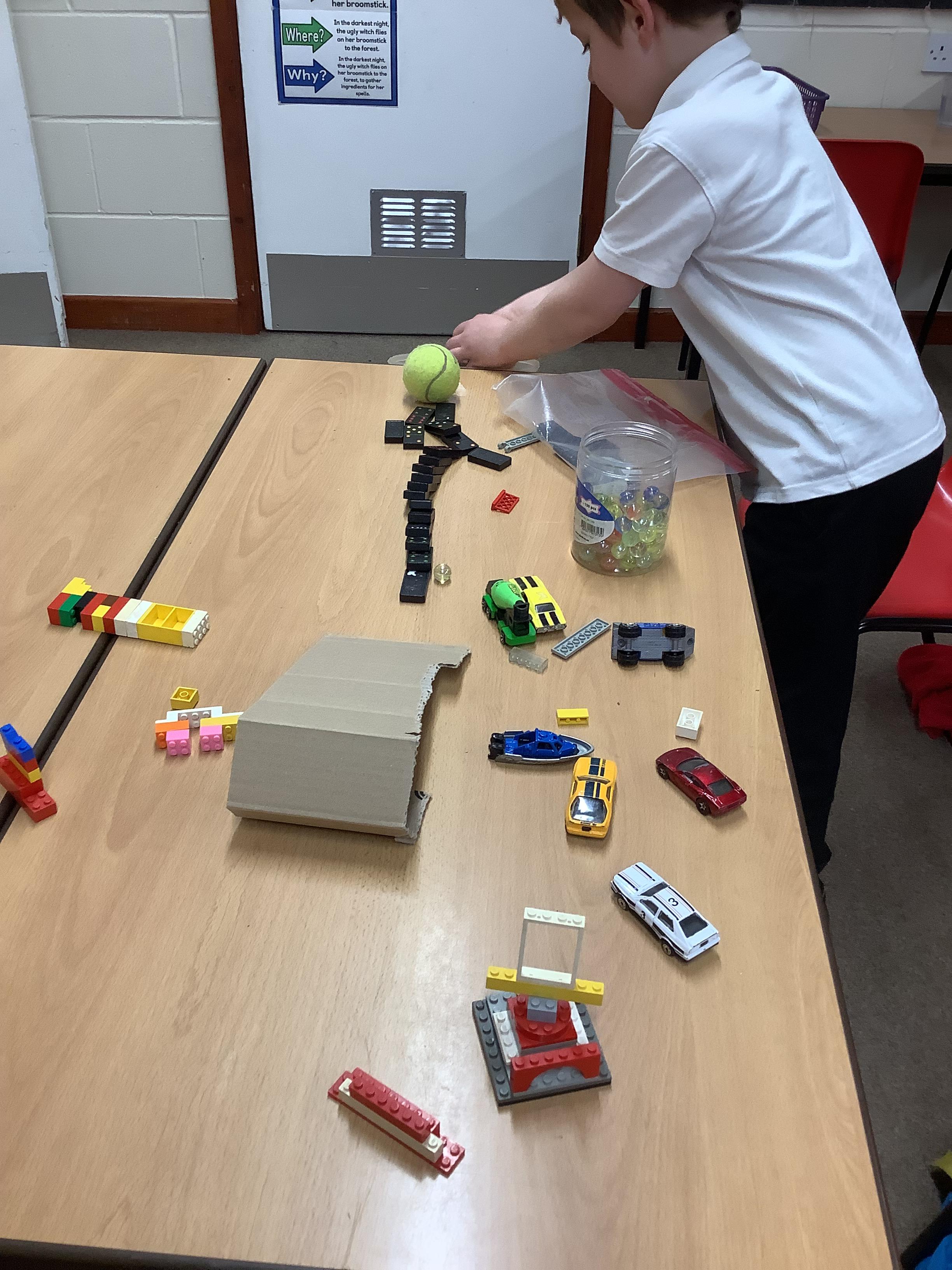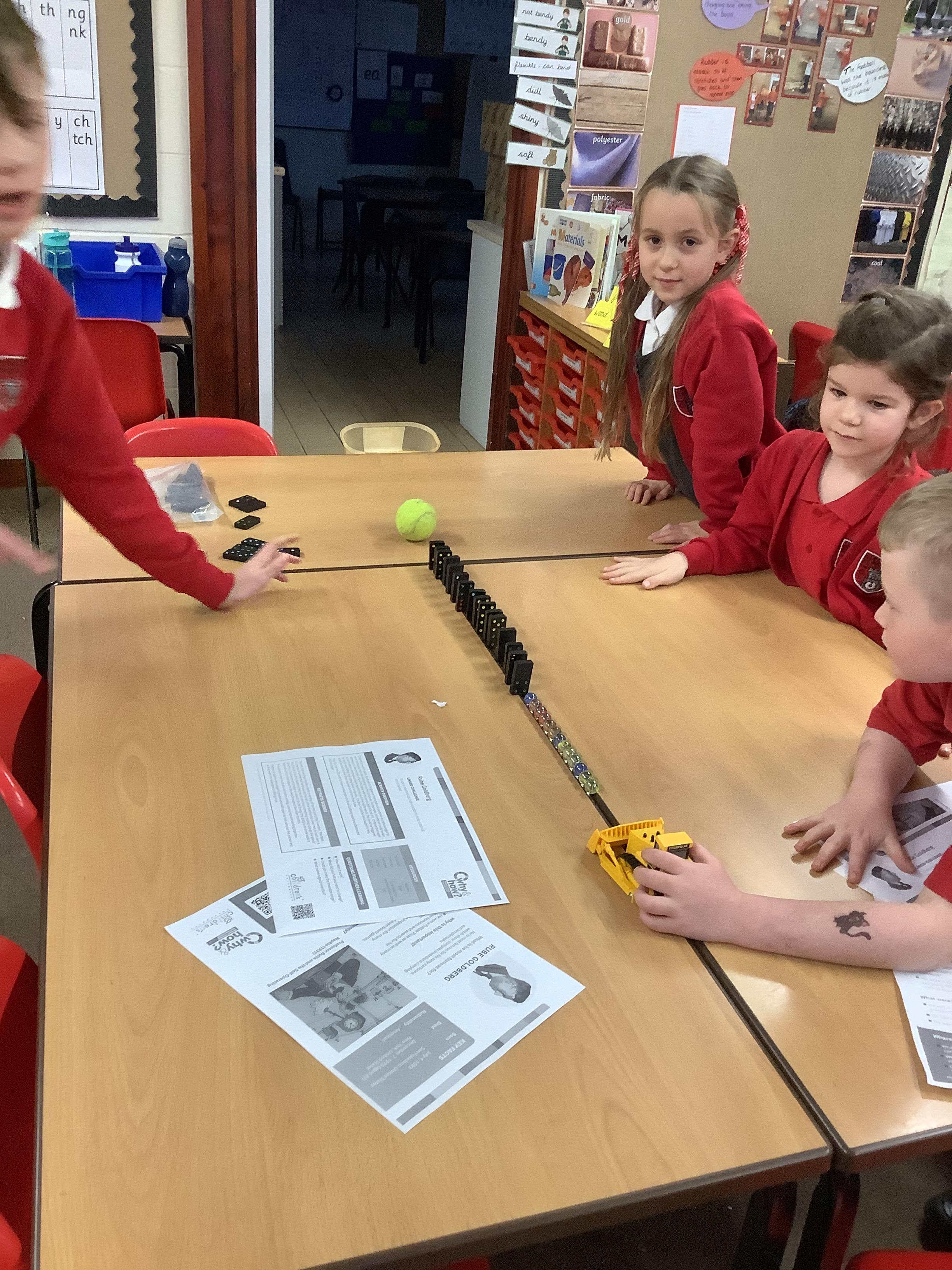 This week in STEM club we have been looking at the work of Rube Goldberg who won a Pulitzer Prize as well as many other honours and awards for his cartoons. His work is the inspiration for many cartoons, films and even board games, such as Mouse Trap. Children were give a tennis ball and container and encouraged to work backwards from the ball going into the container. For example: a container could be laid sideways or attached the end of the table with the tennis ball in front of it. Children then worked to set in place a mechanical chain reaction to push the ball forwards. This could be triggered by dominoes falling, toys rolling down ramps etc. Children were encouraged to test, adapt and add to their chain reaction in the time they had.