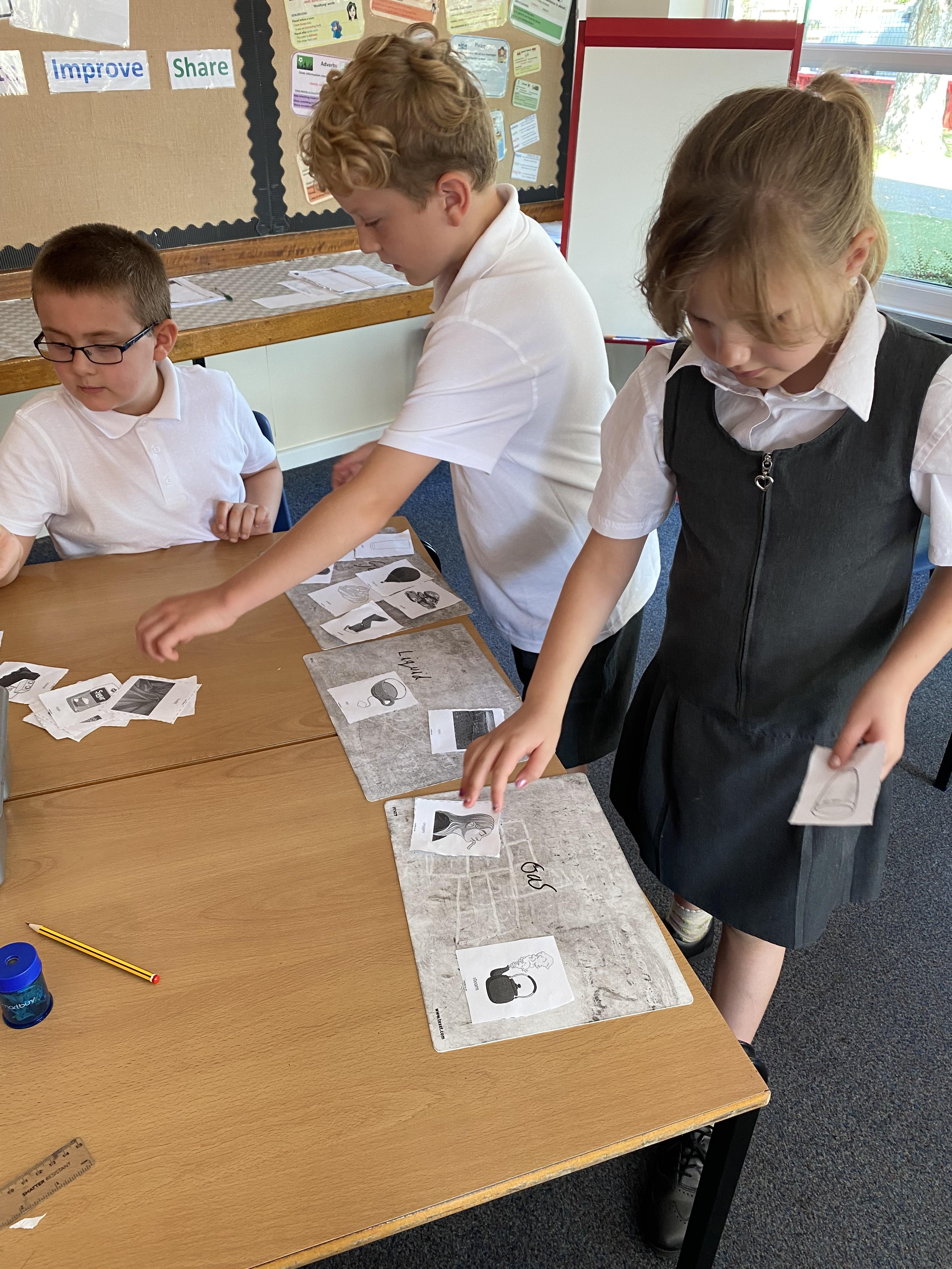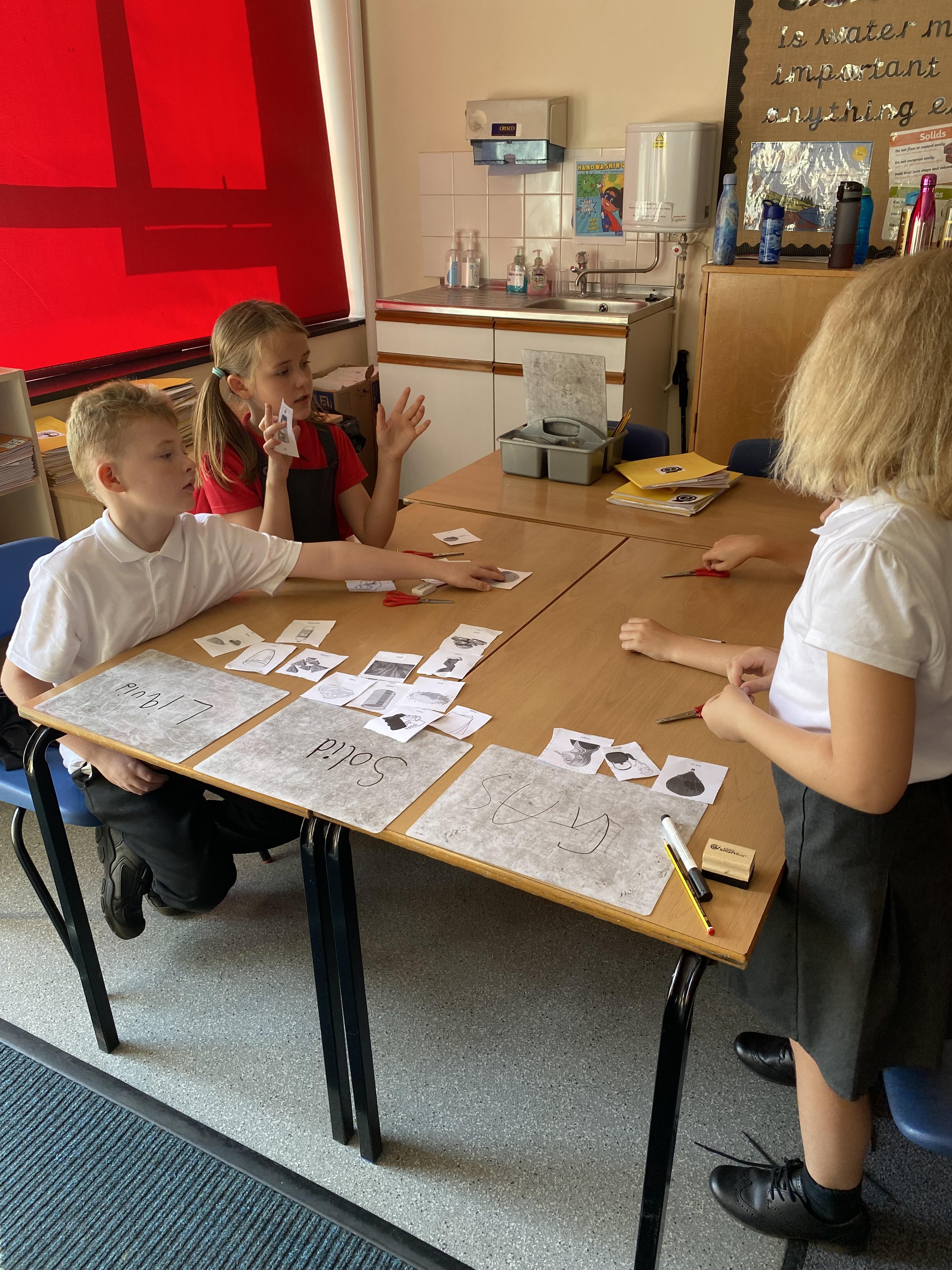 In our Science lesson we worked in groups to sort materials into solids, liquids and gases.