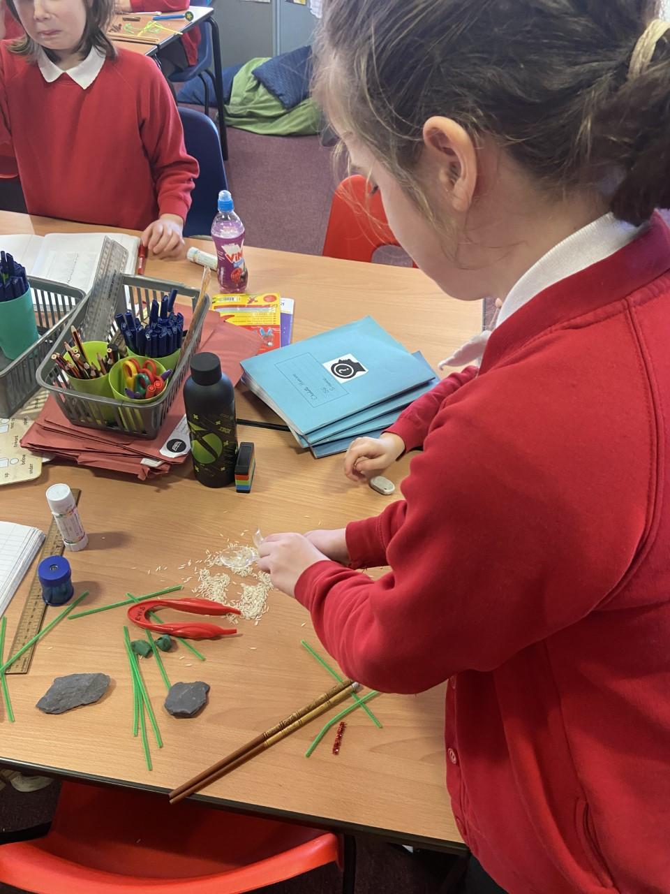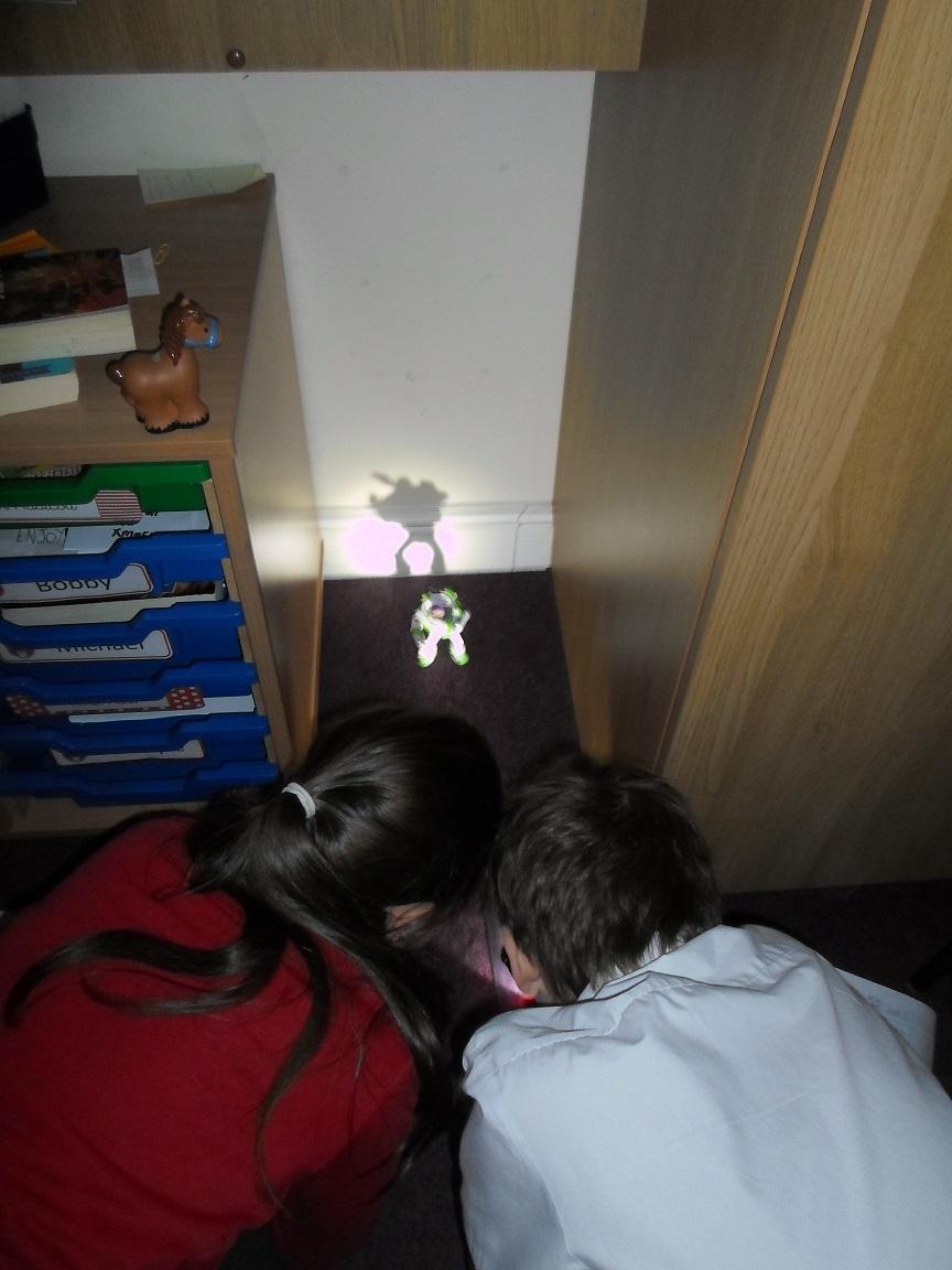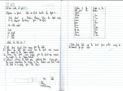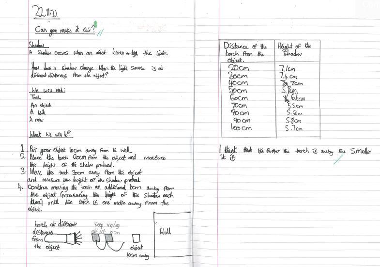 In science last week we planned a fair test to investigate what happens to shadows as a light source moves away from the object. This week we carried out our investigation ensuring that it was fair. We filled in our table of results and wrote about what our results showed. We discussed why this had happened.
