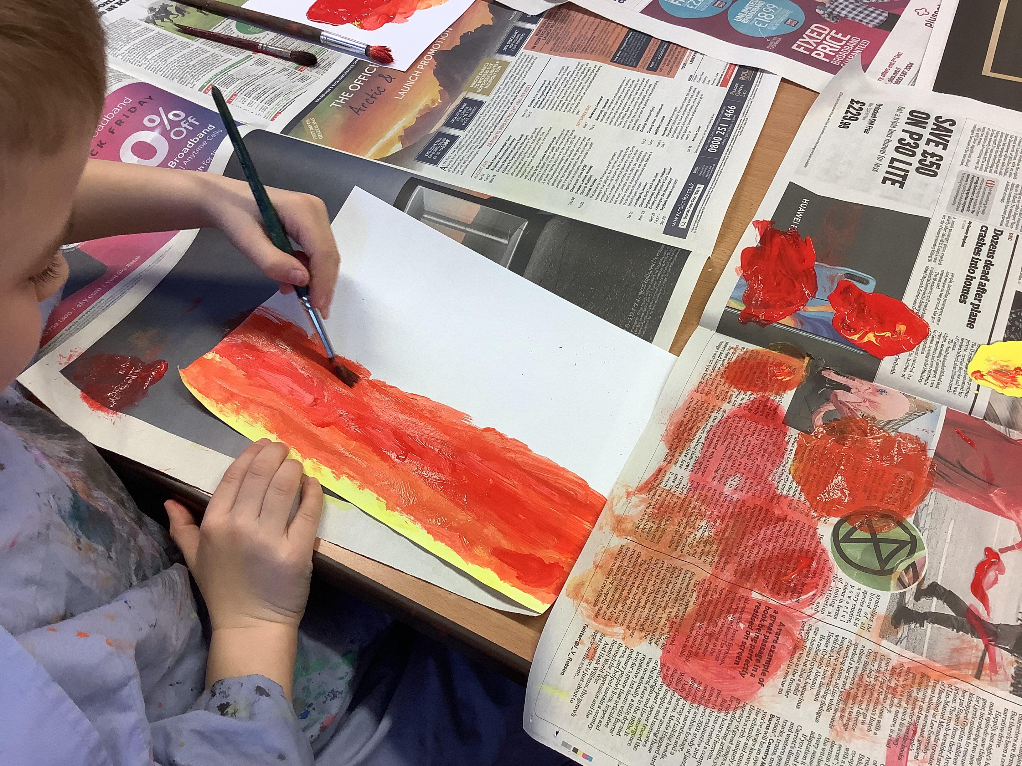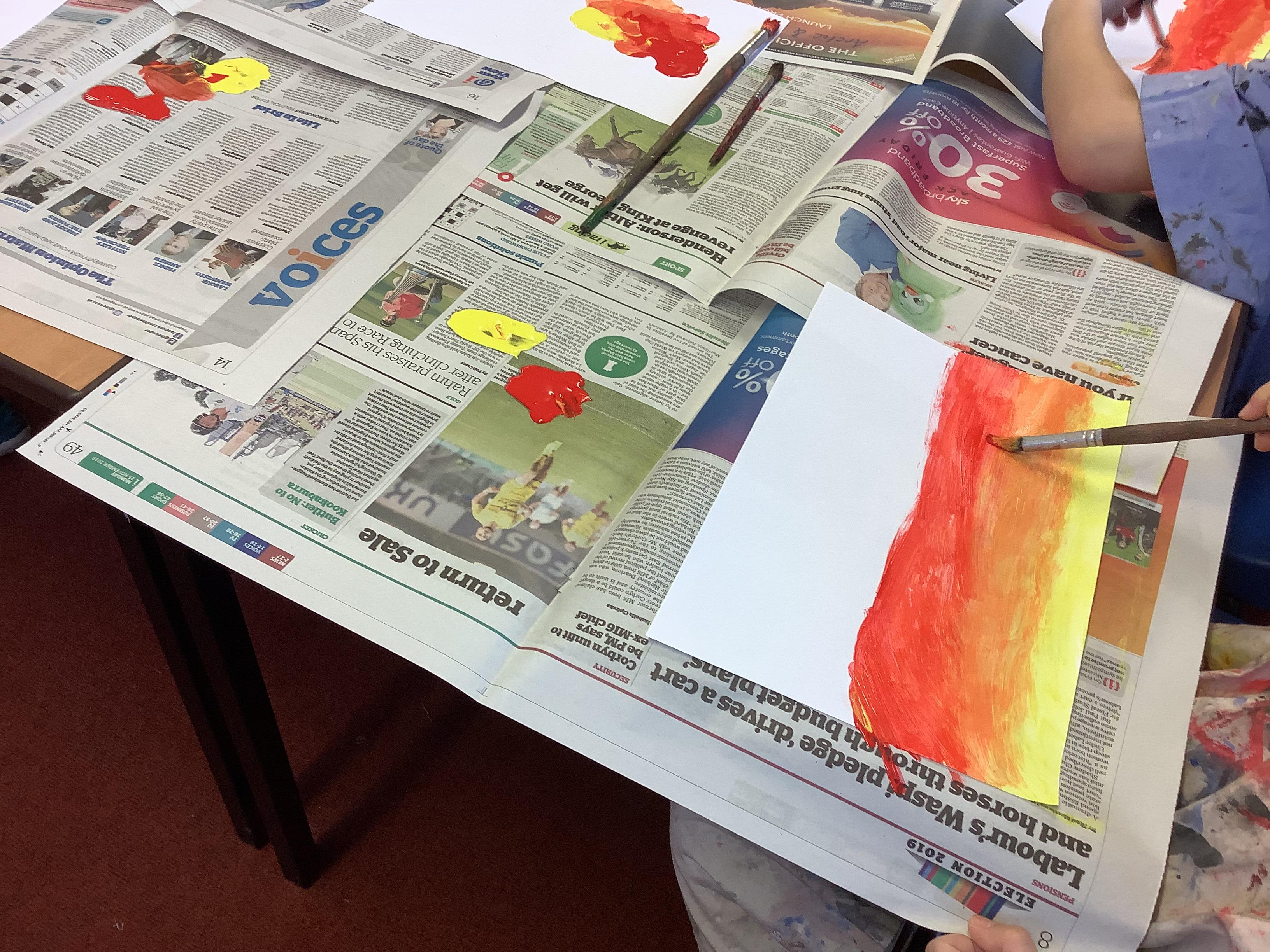 Children created a sunset using just red and yellow paint. They blended yellow with red to make different shades of orange and then drew and cut out African animals on black paper to use as silhouettes in the background.
