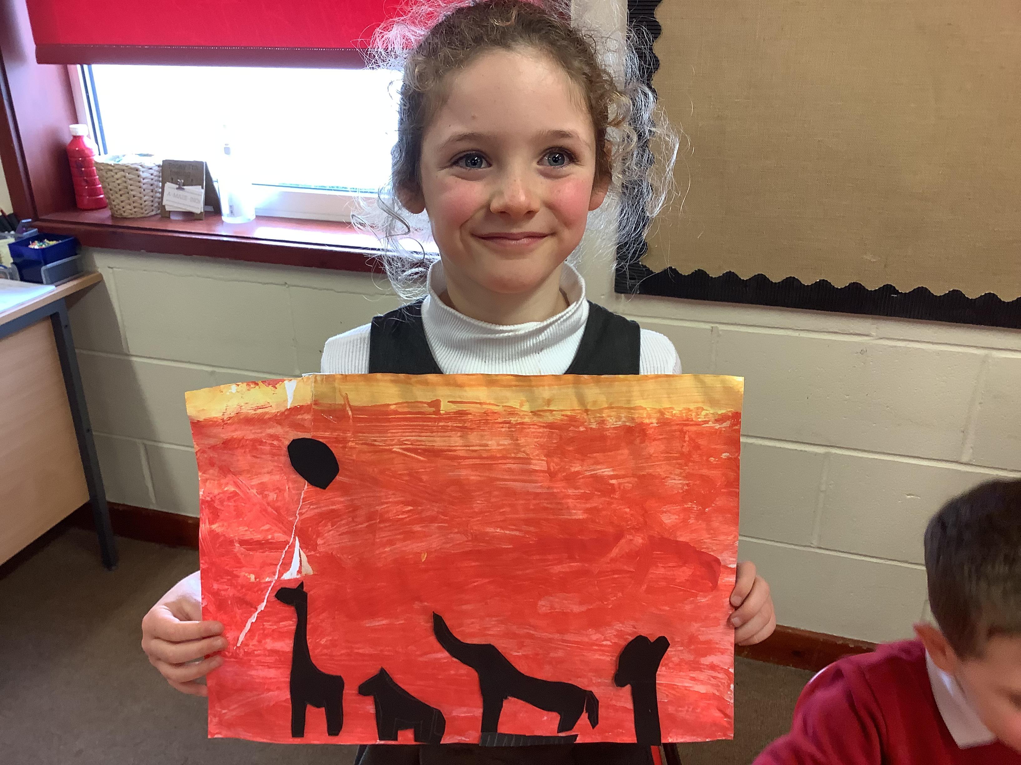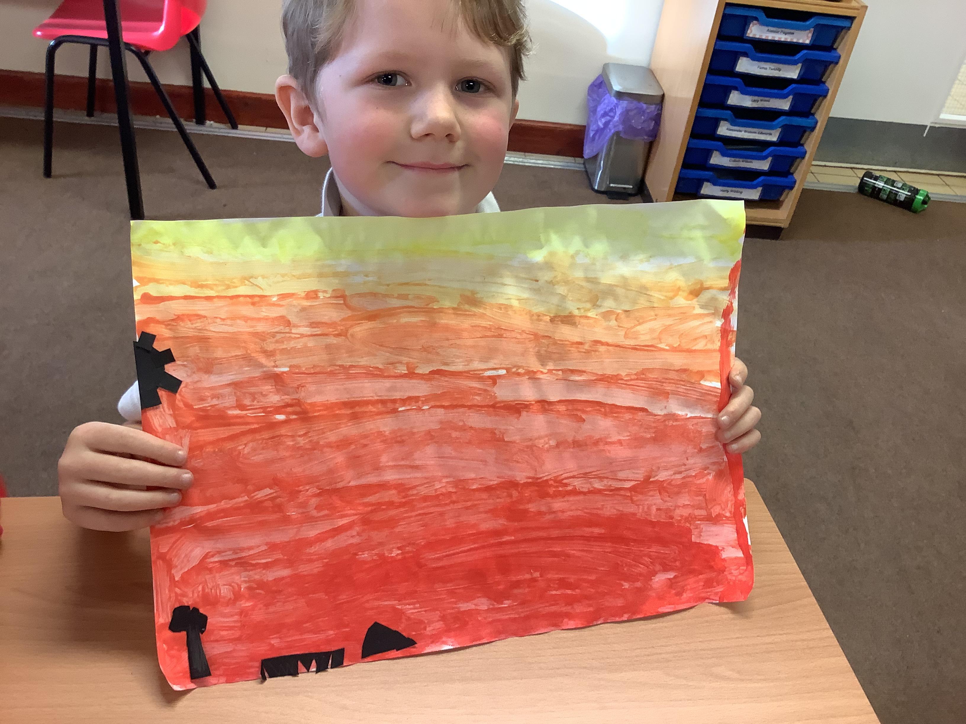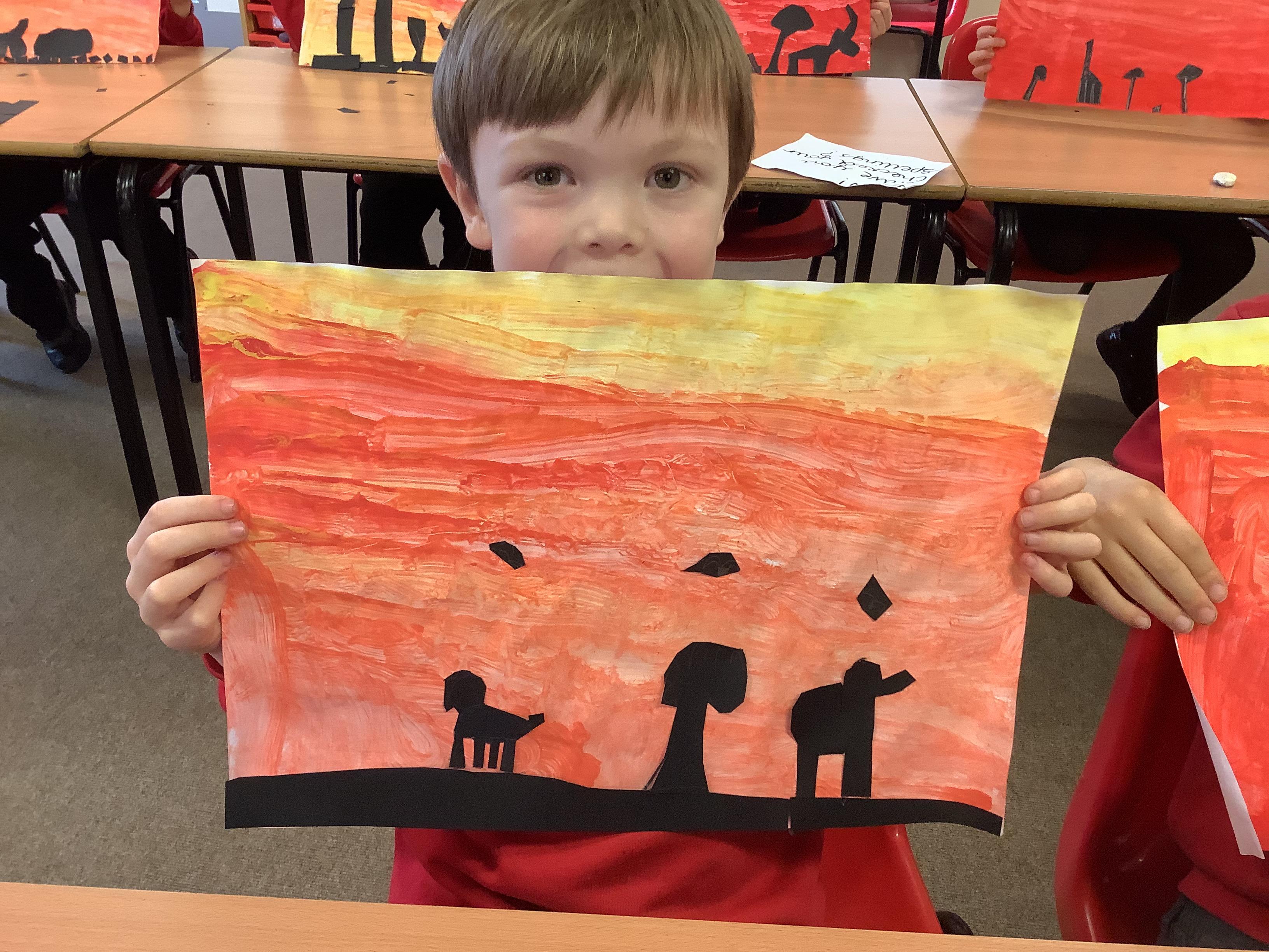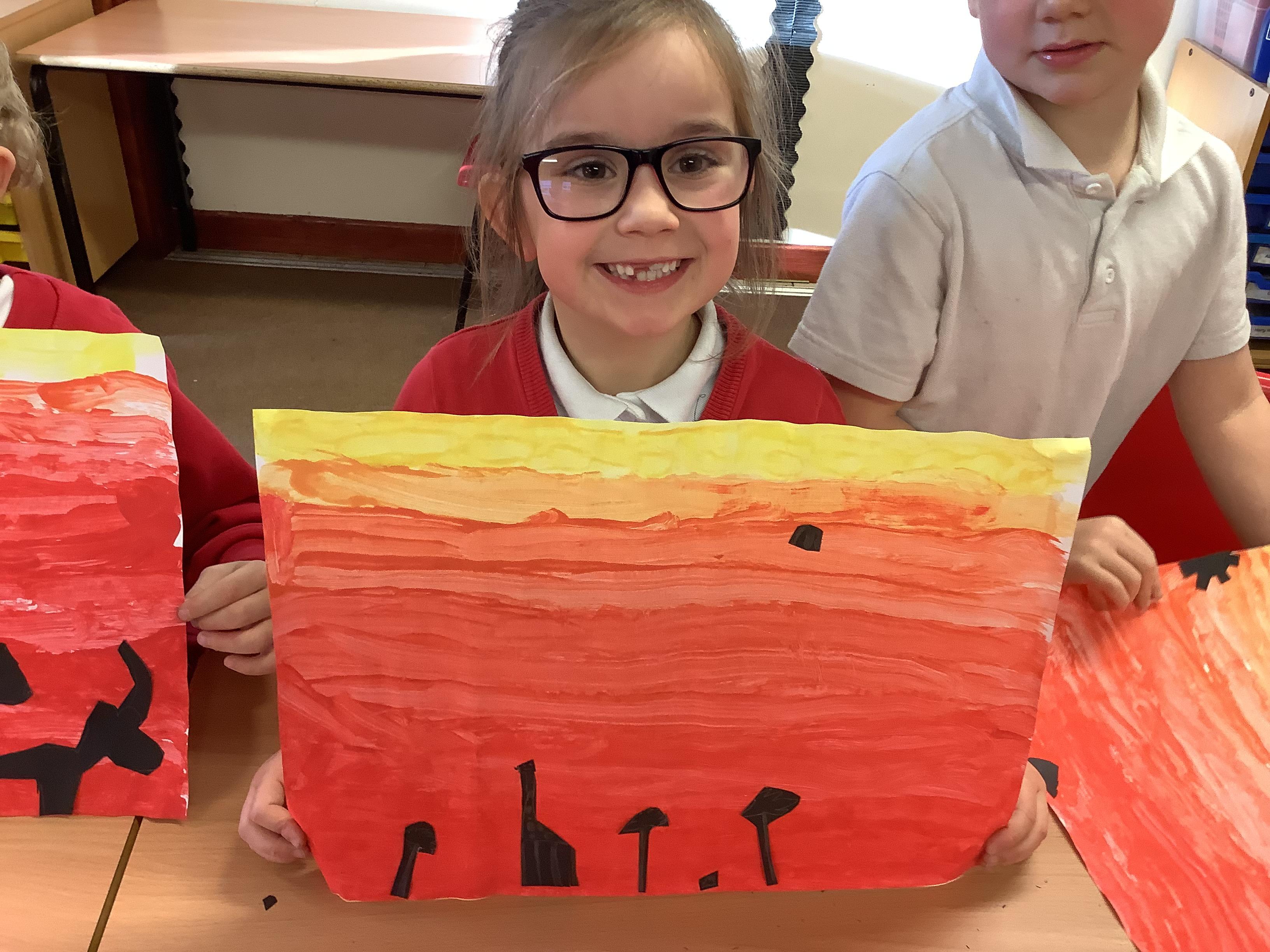 We created sunset pictures and cut out animal silhouettes! We had to think carefully about mixing our colours to create the gradual effect.