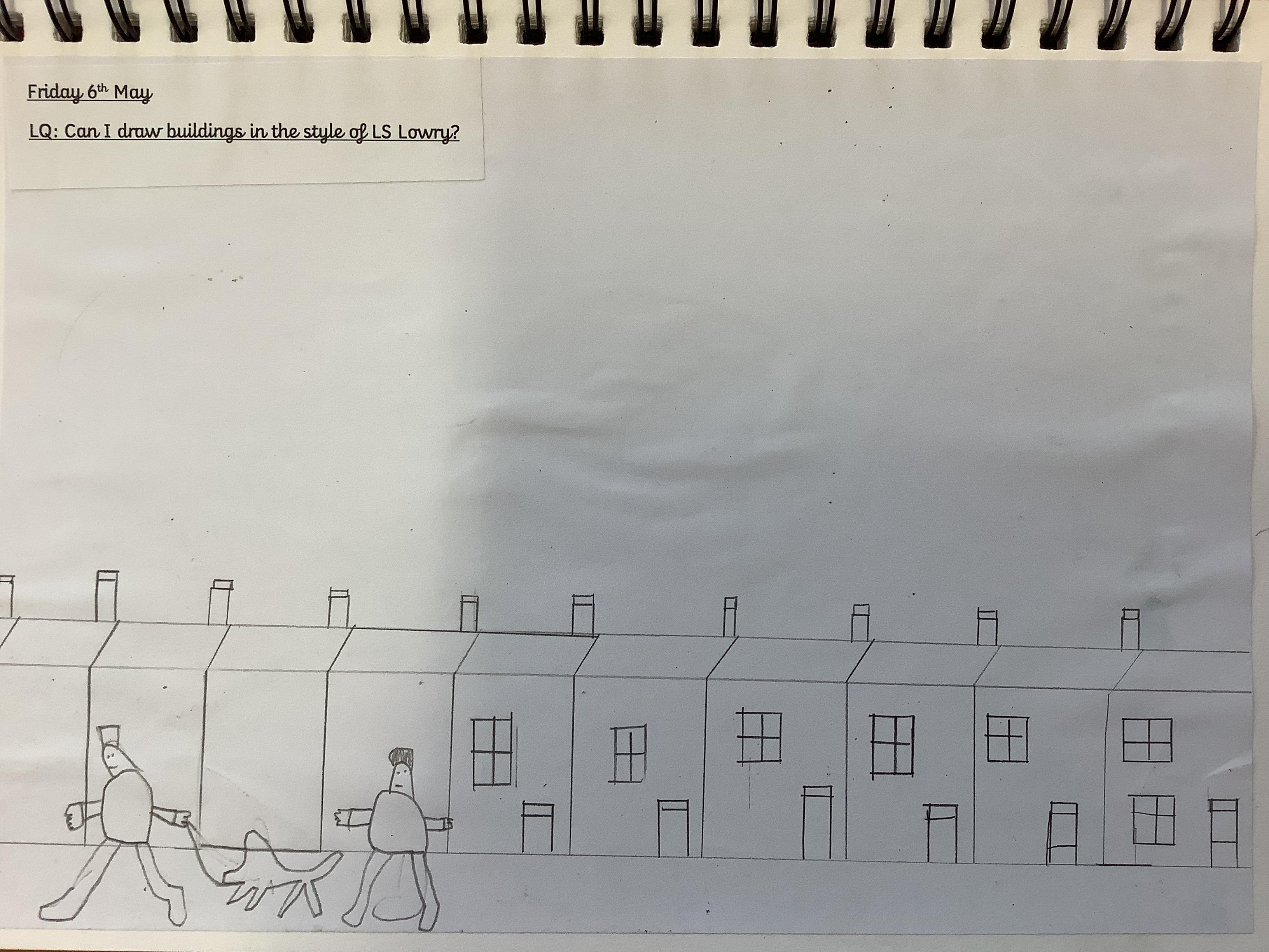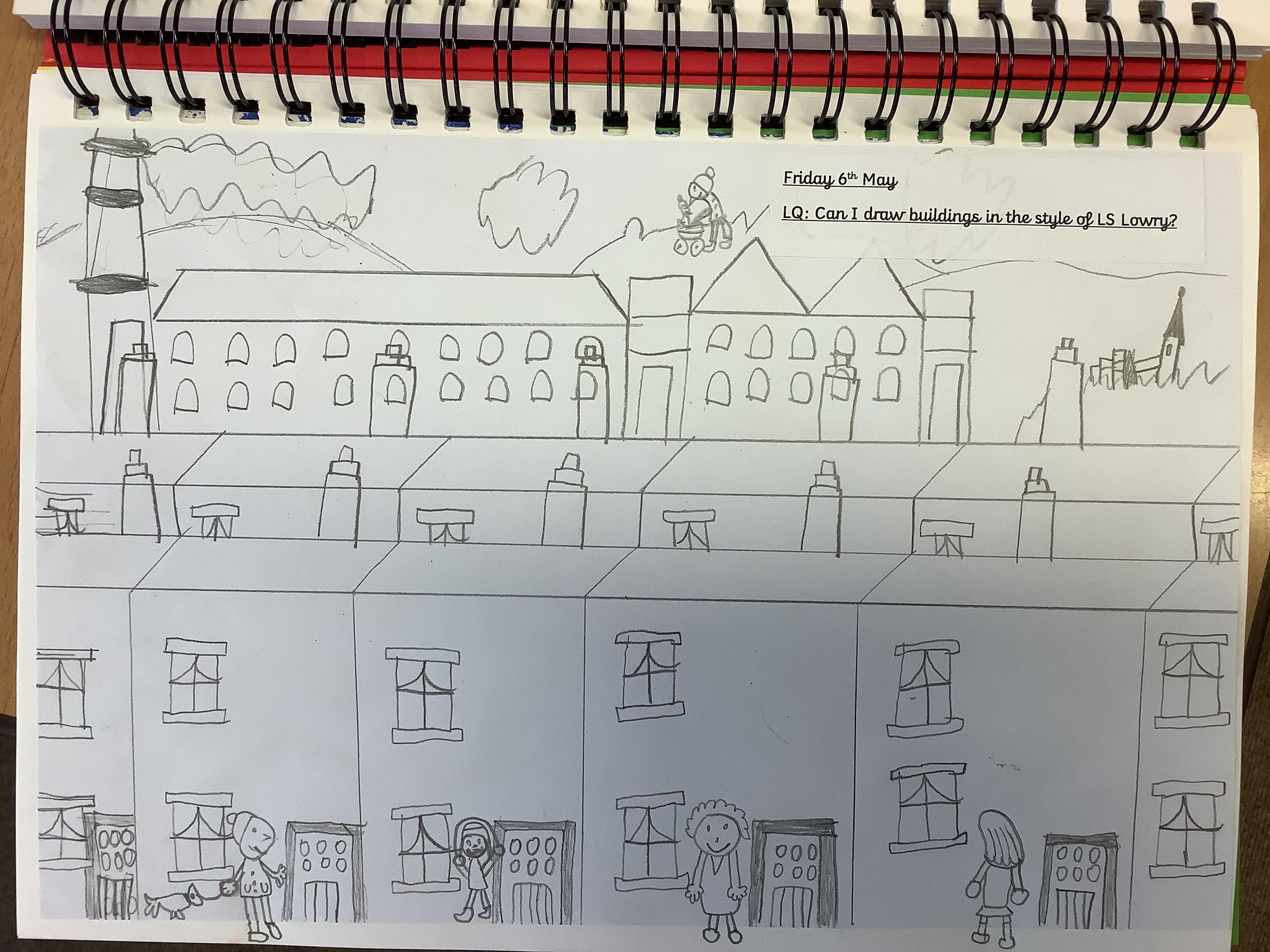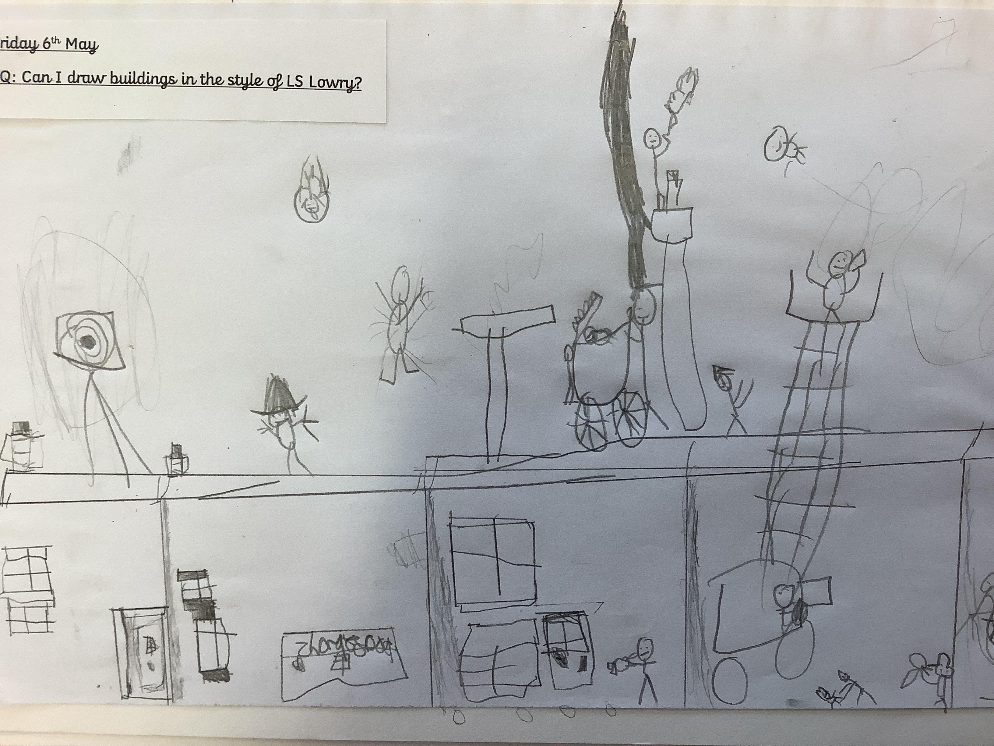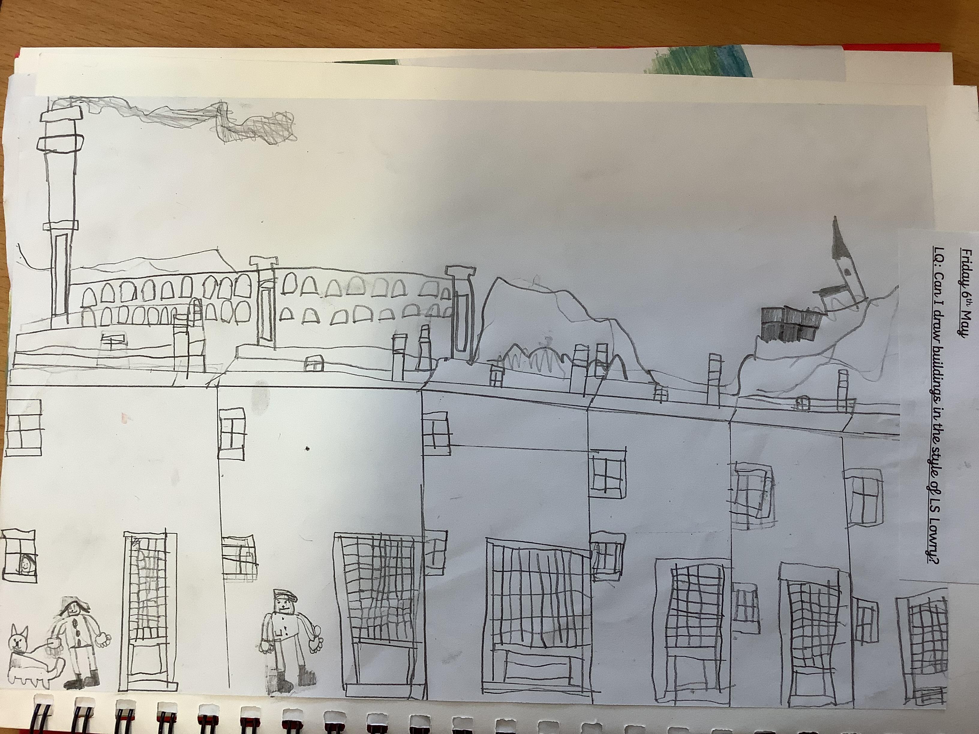 Children have spent 2 weeks creating their own versions of LS Lowry's iconic buildings, they started by drawing the outline of the buildings then filling in the finer details like the windows and doors, finally they added the people.