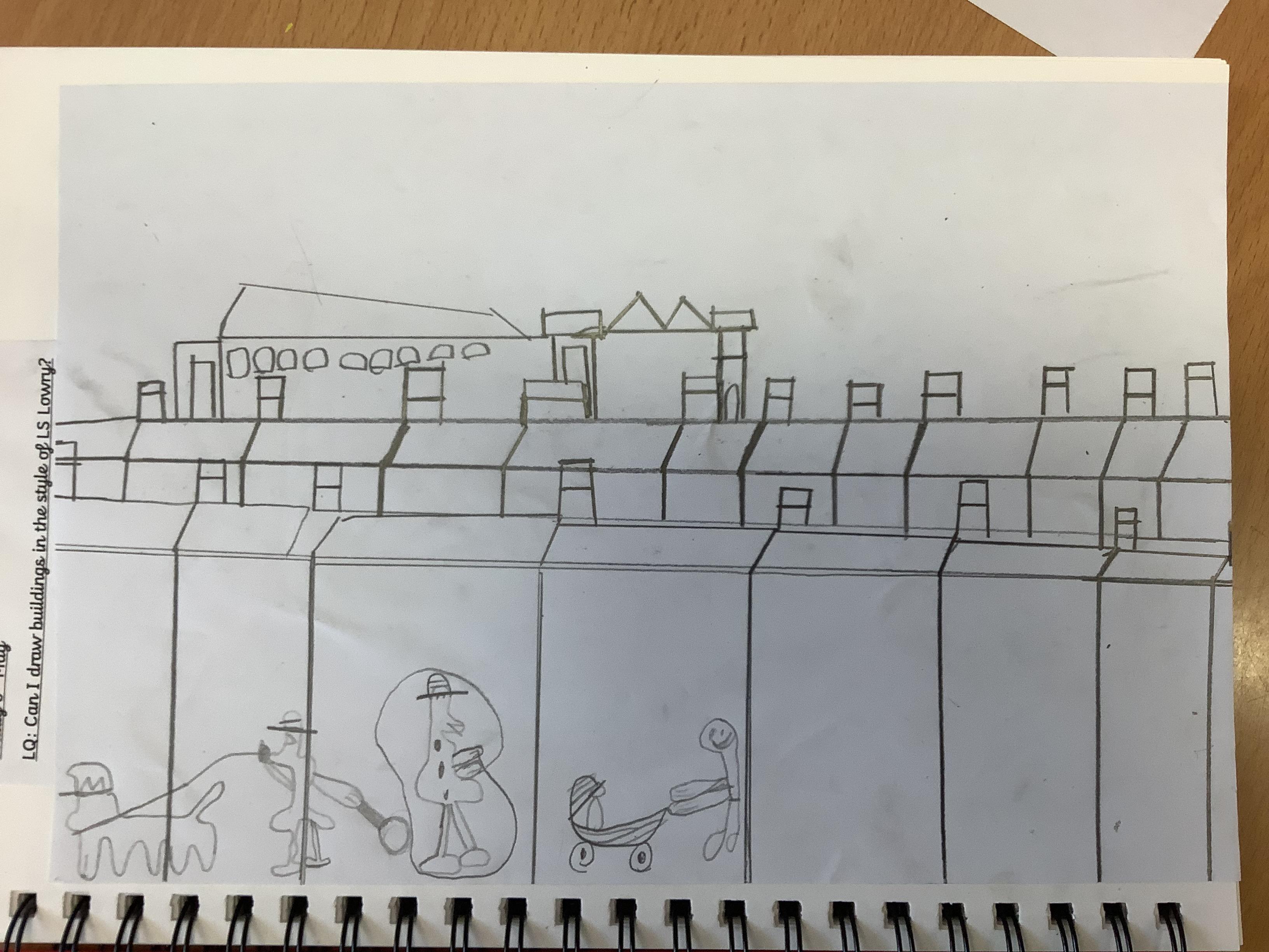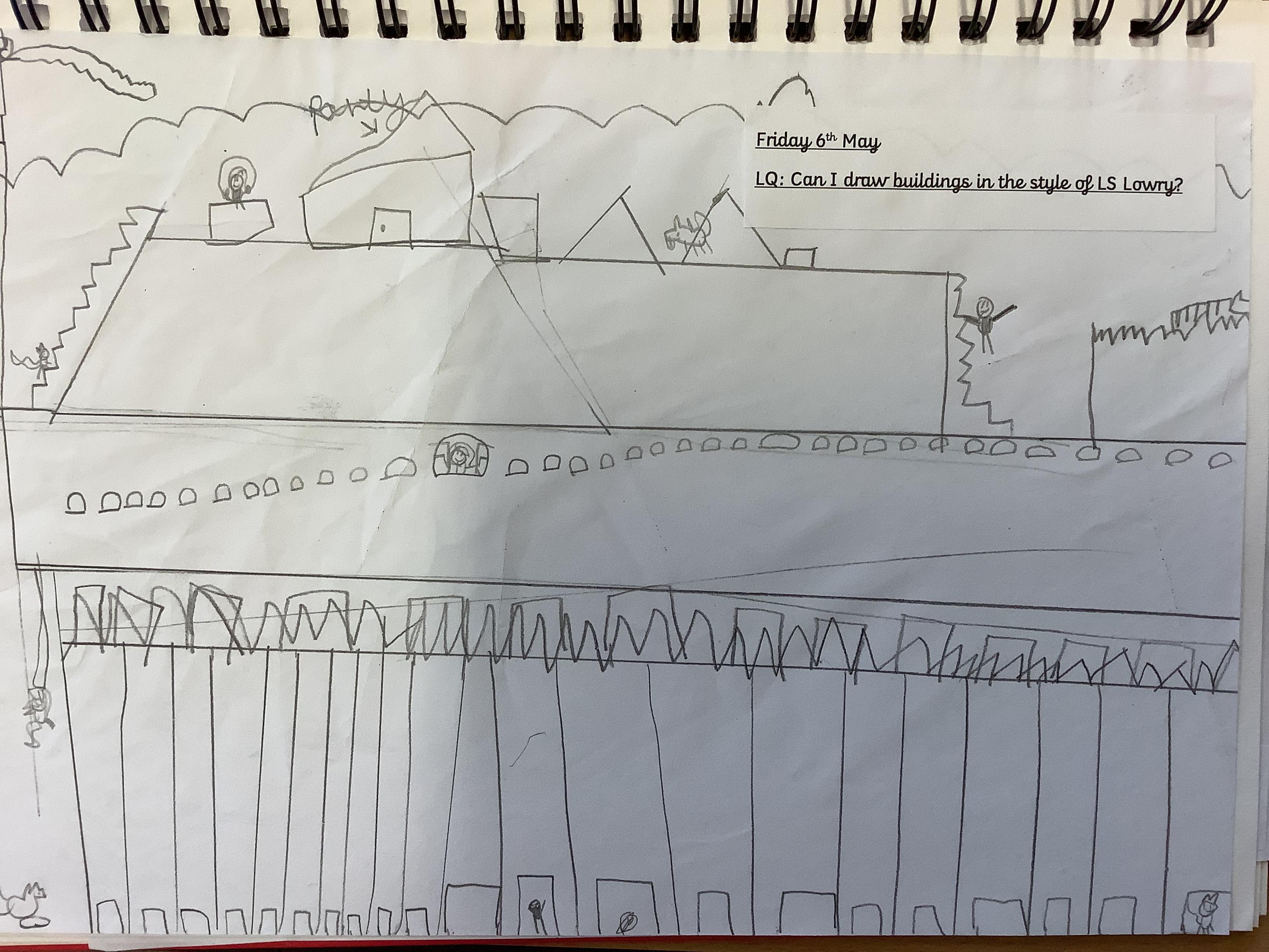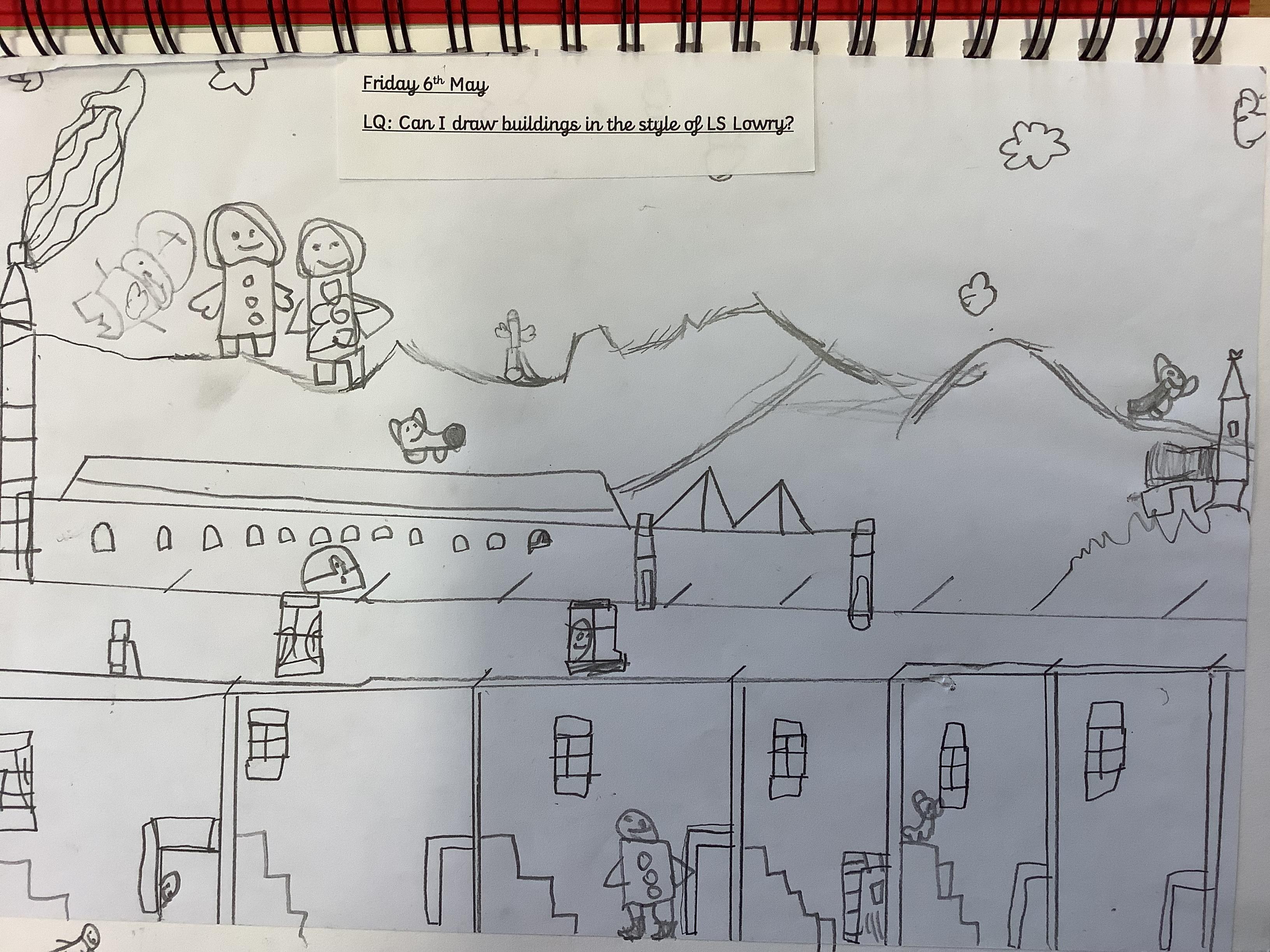 Children have spent 2 weeks creating their own versions of LS Lowry's iconic buildings, they started by drawing the outline of the buildings then filling in the finer details like the windows and doors, finally they added the people.