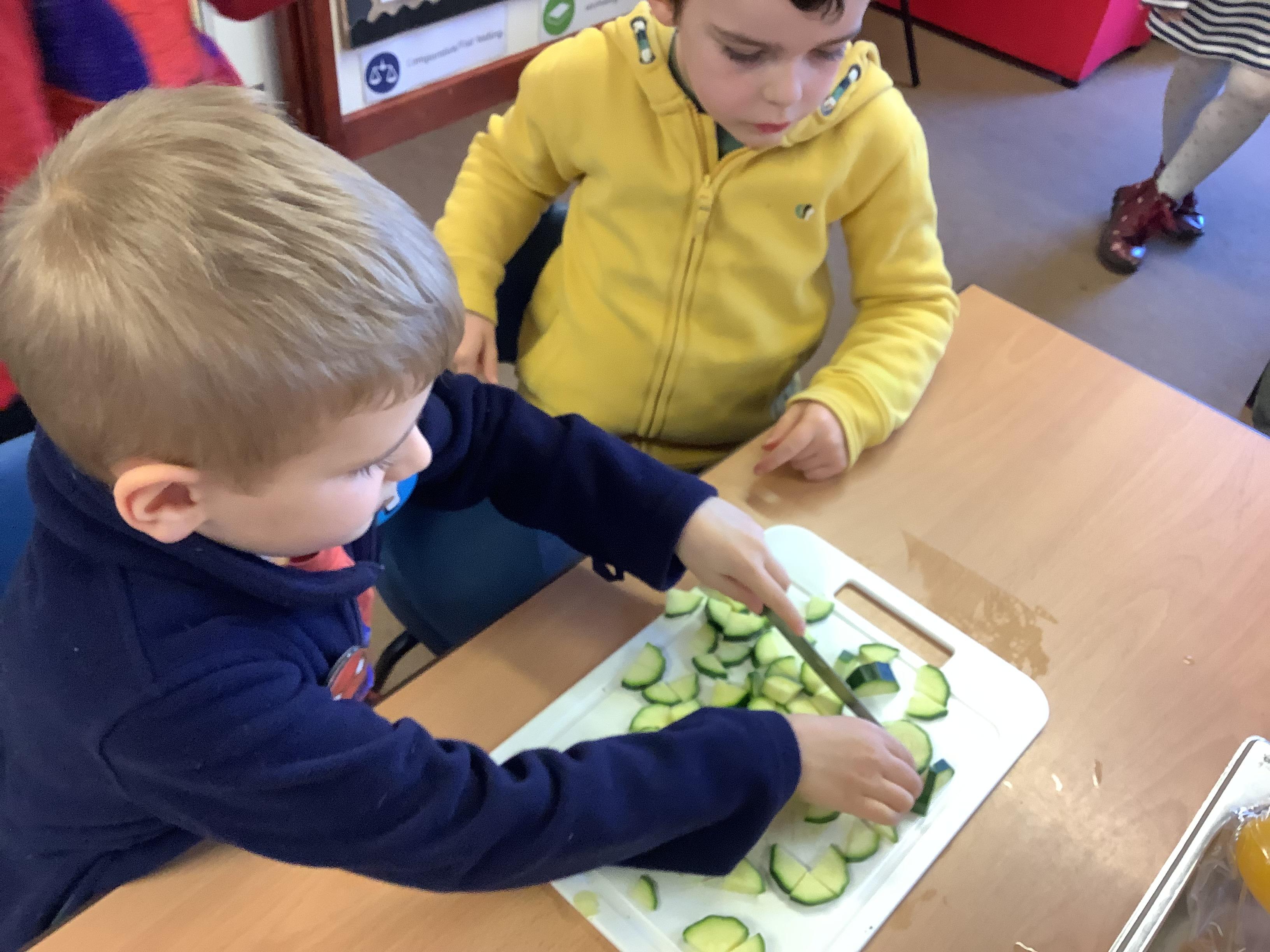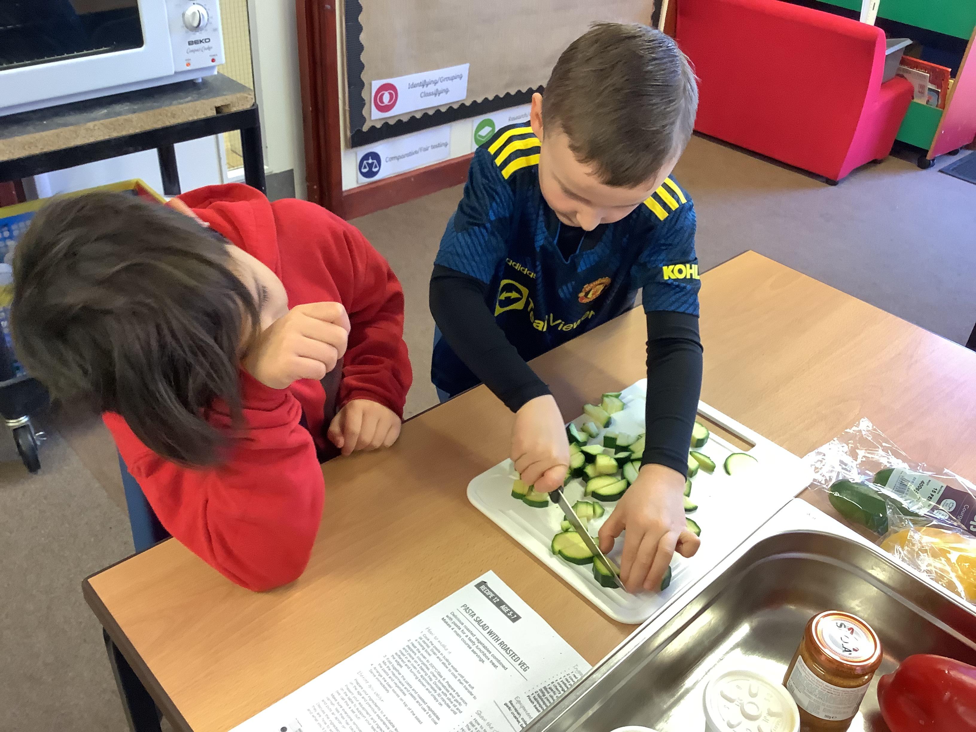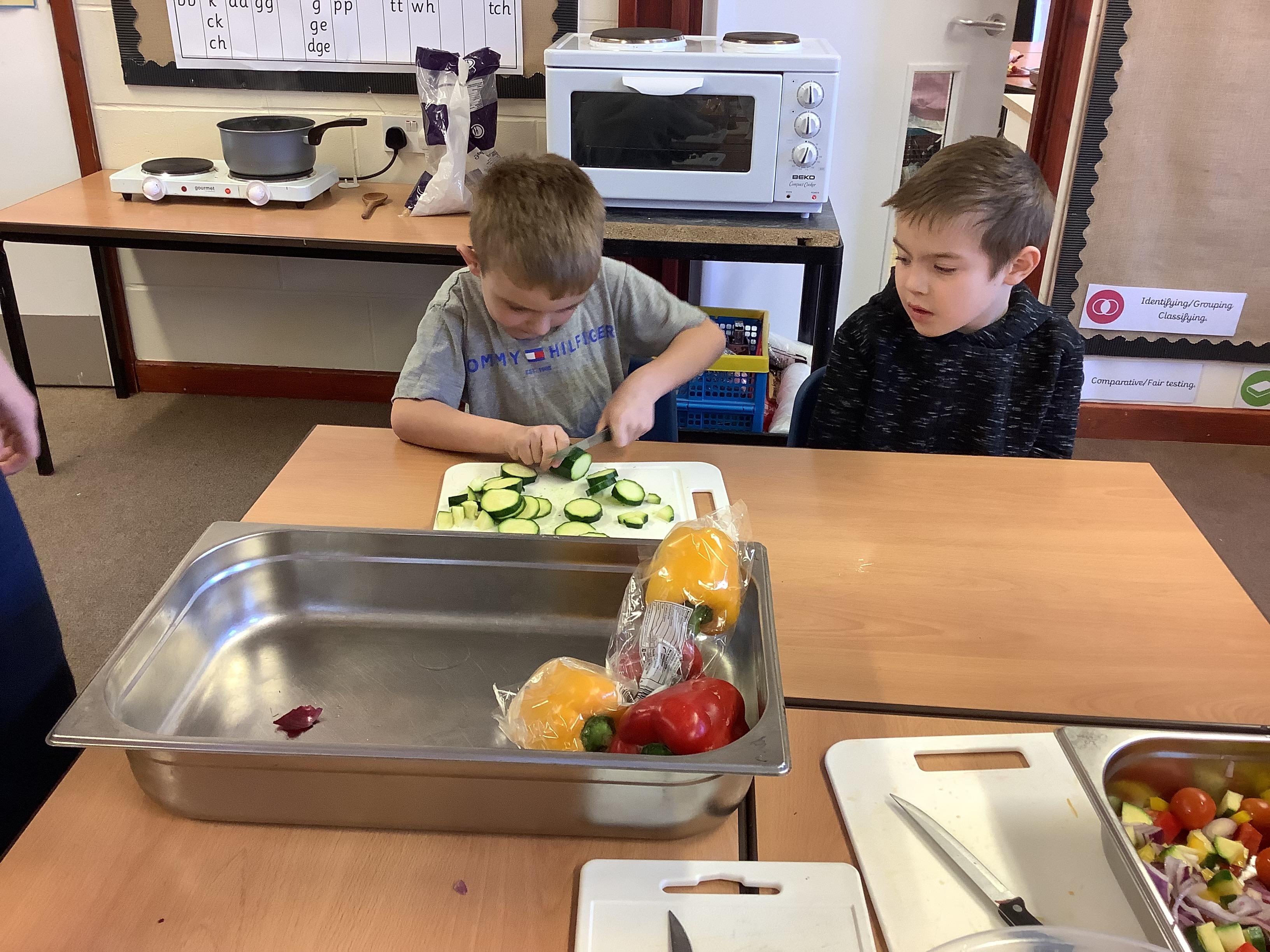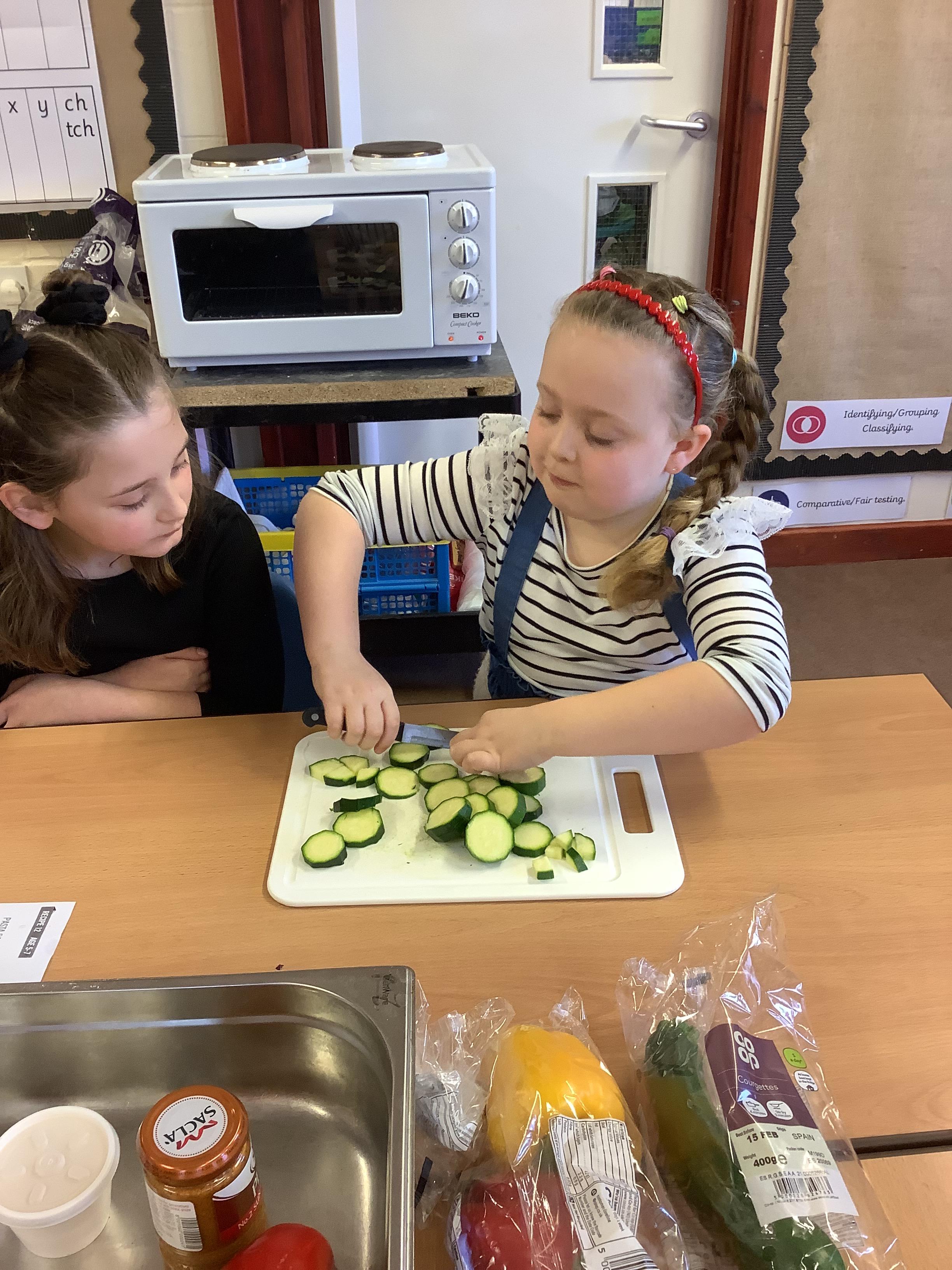 Children enjoyed cooking today, they cut up peppers, courgettes and red onions to roast with garlic in the oven, then they made pasta, drained it and added the roasted vegetables with mayonnaise and red pesto. They all had a pot to taste and they all thought it was delicious!