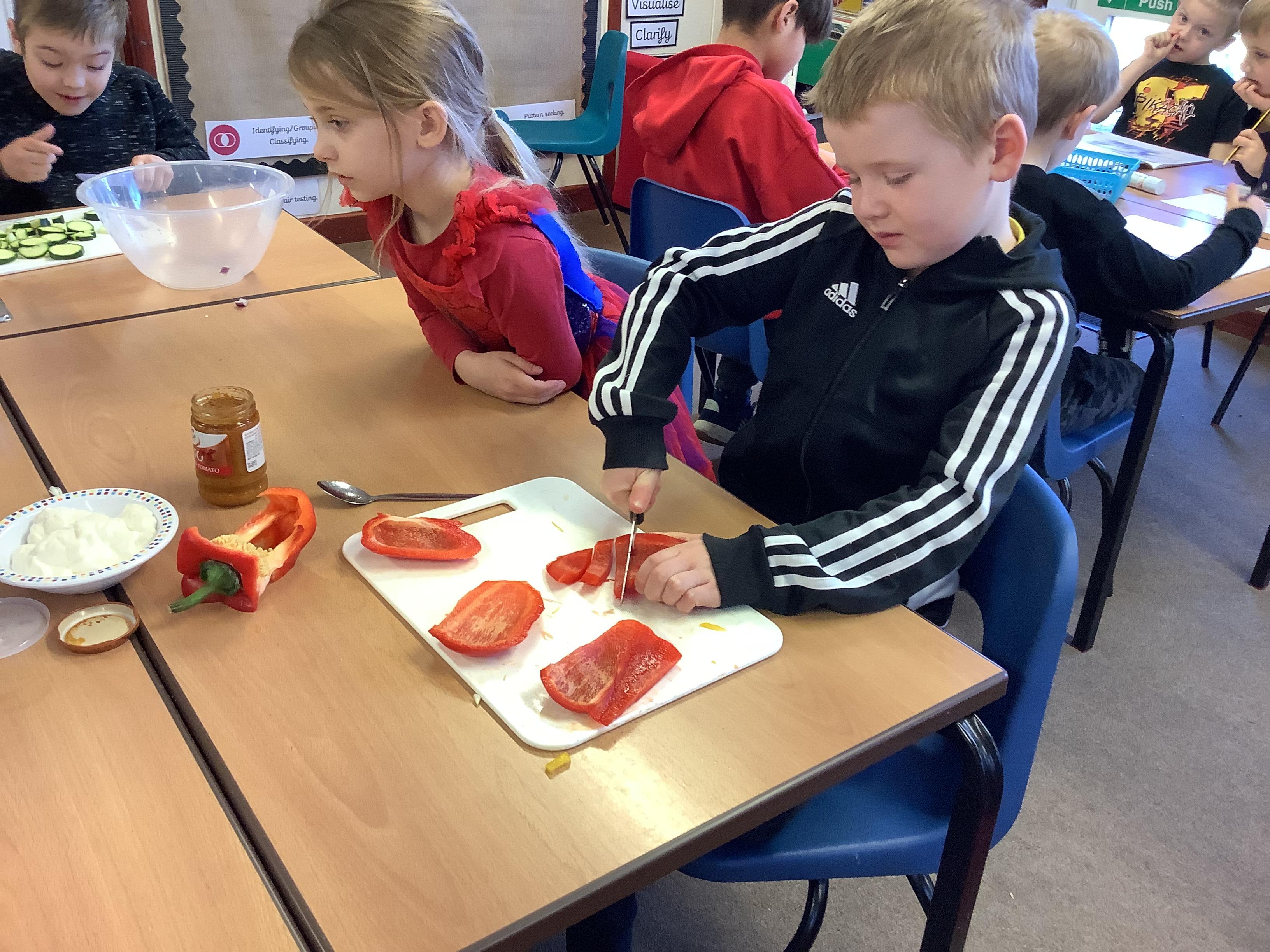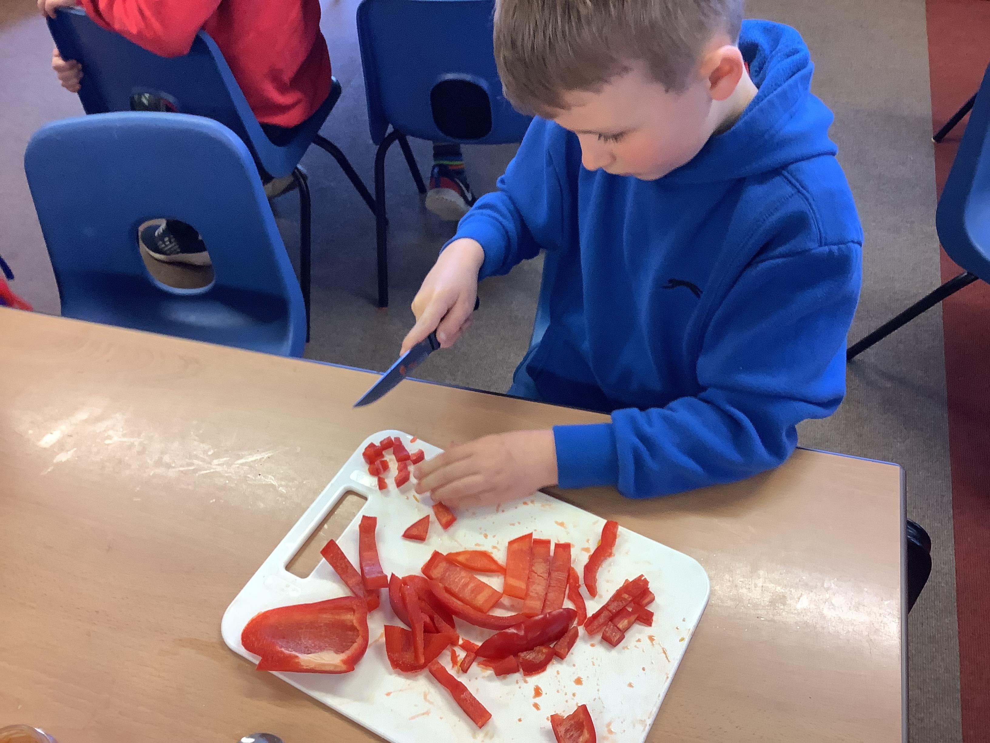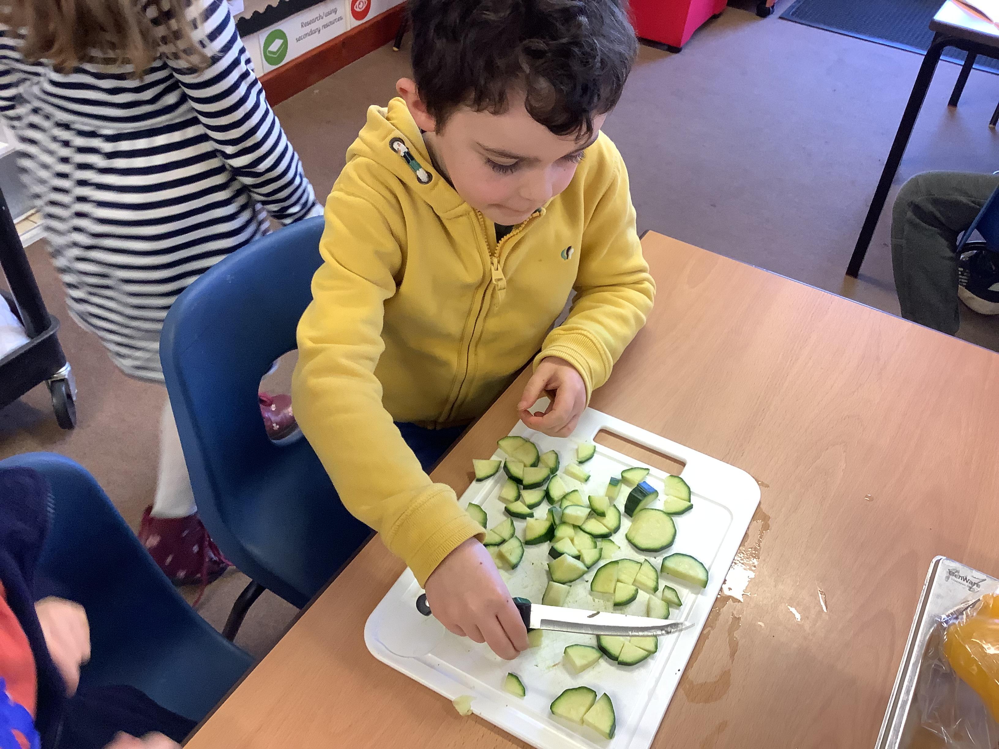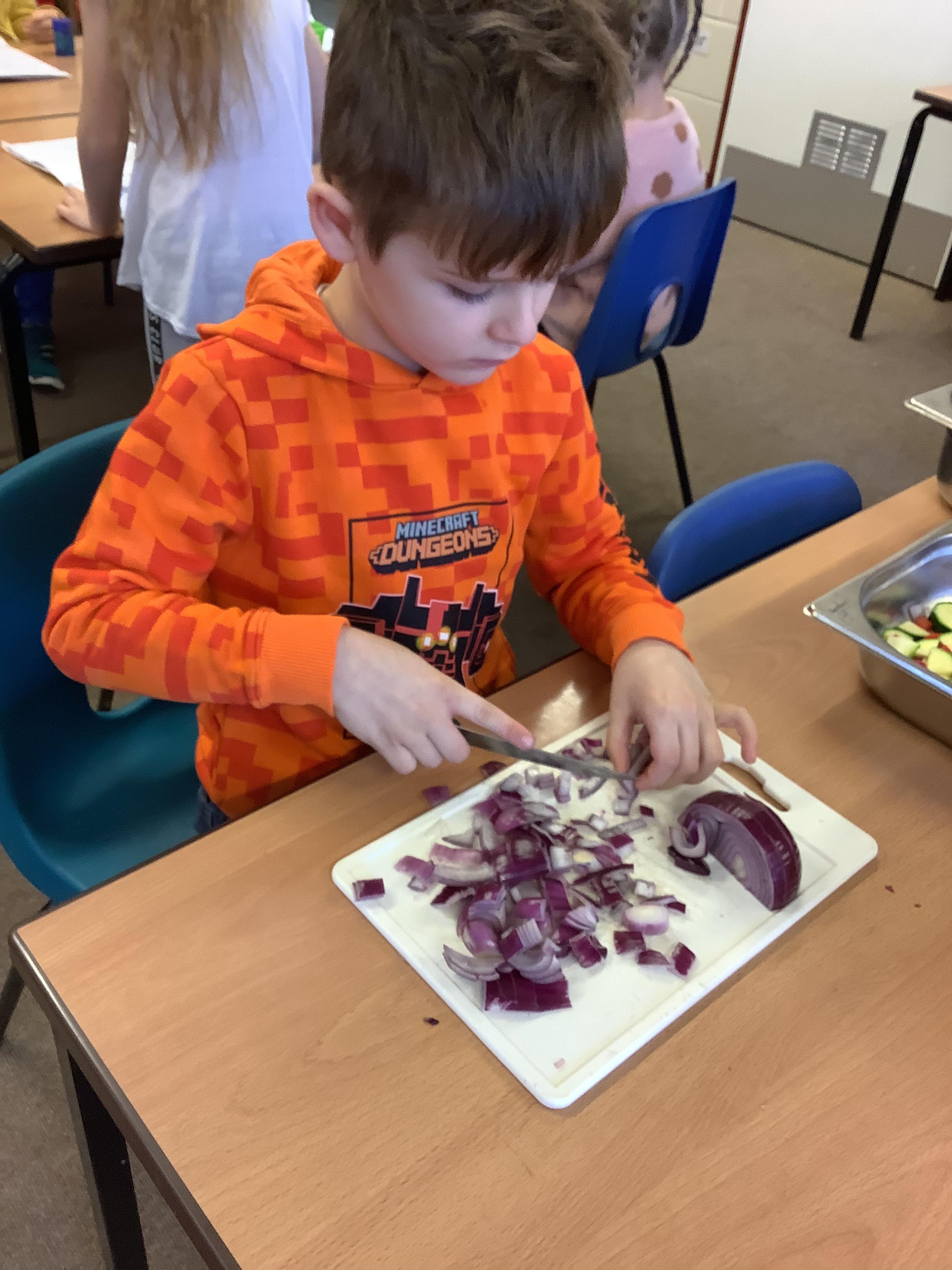 Children enjoyed cooking today, they cut up peppers, courgettes and red onions to roast with garlic in the oven, then they made pasta, drained it and added the roasted vegetables with mayonnaise and red pesto. They all had a pot to taste and they all thought it was delicious!
