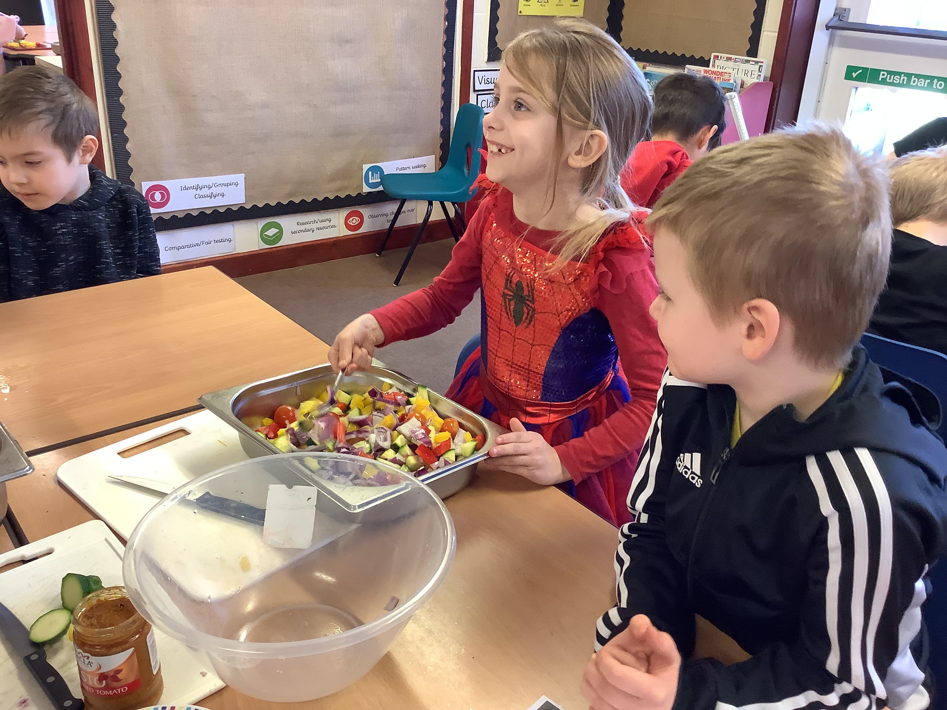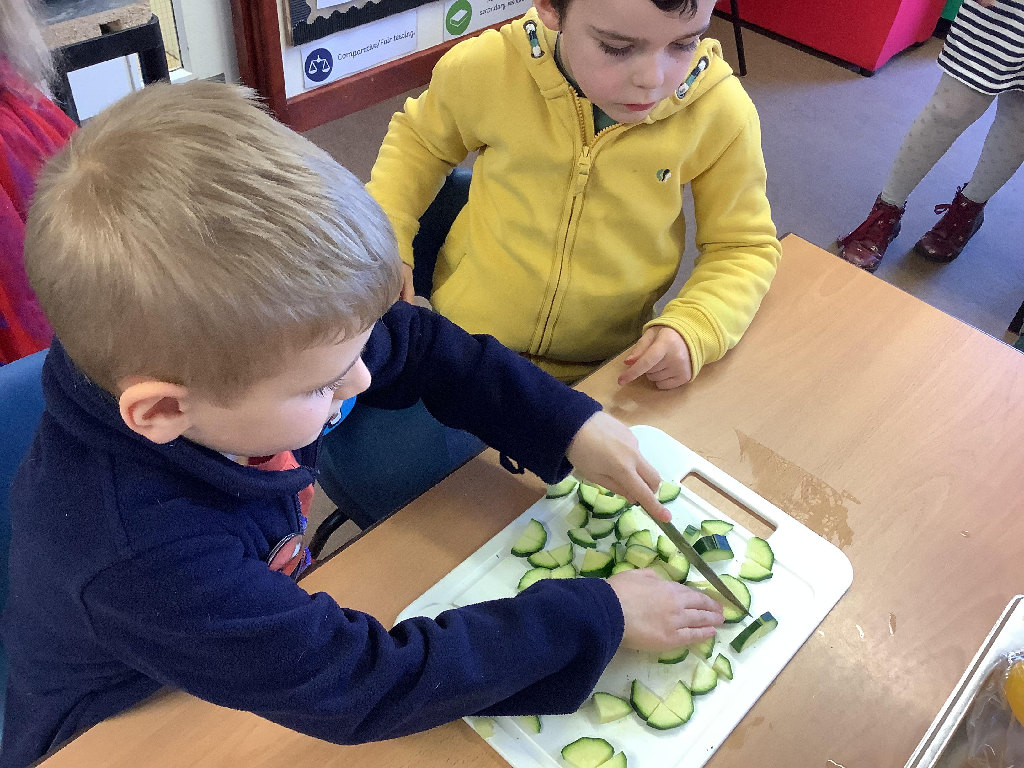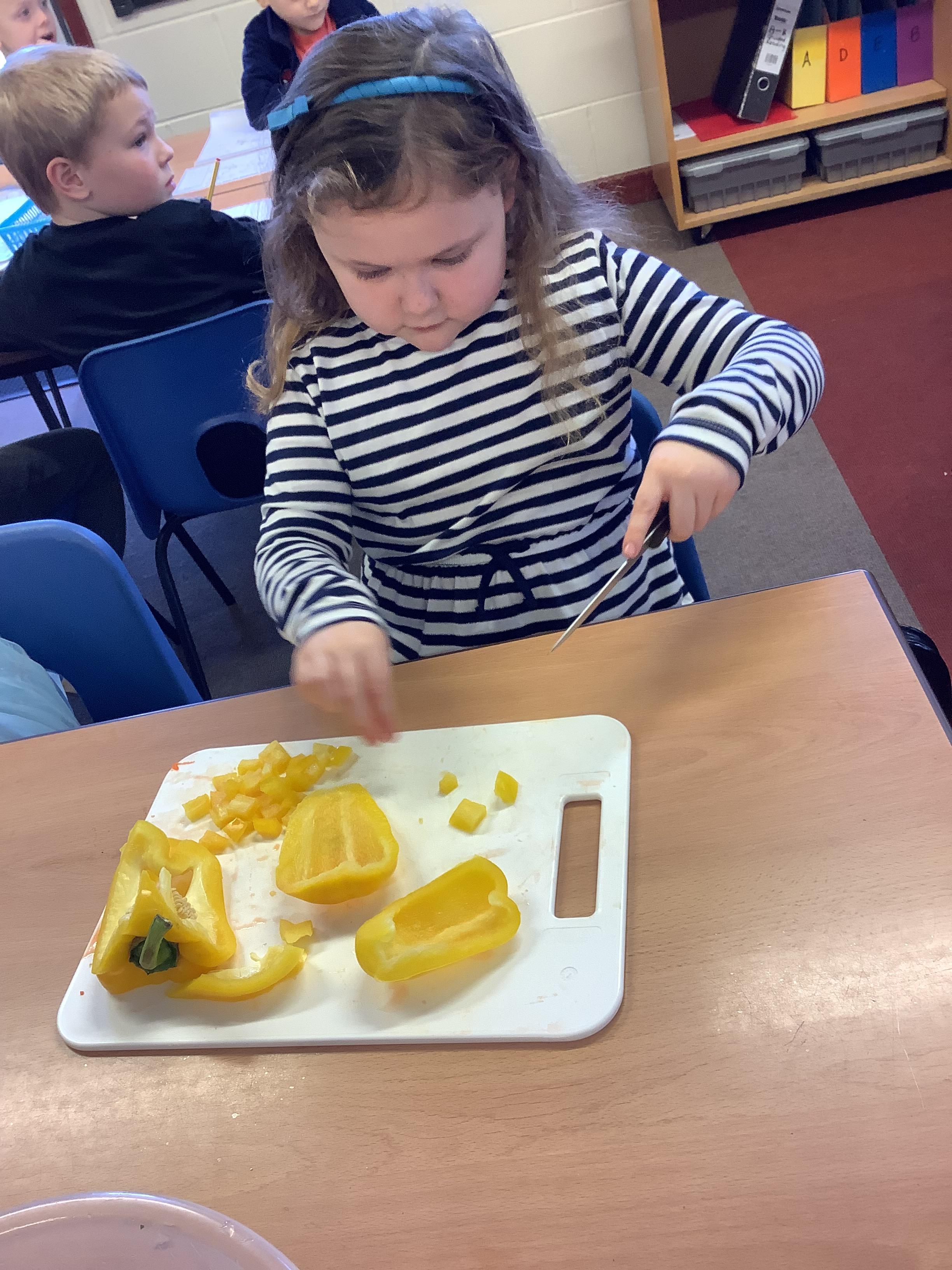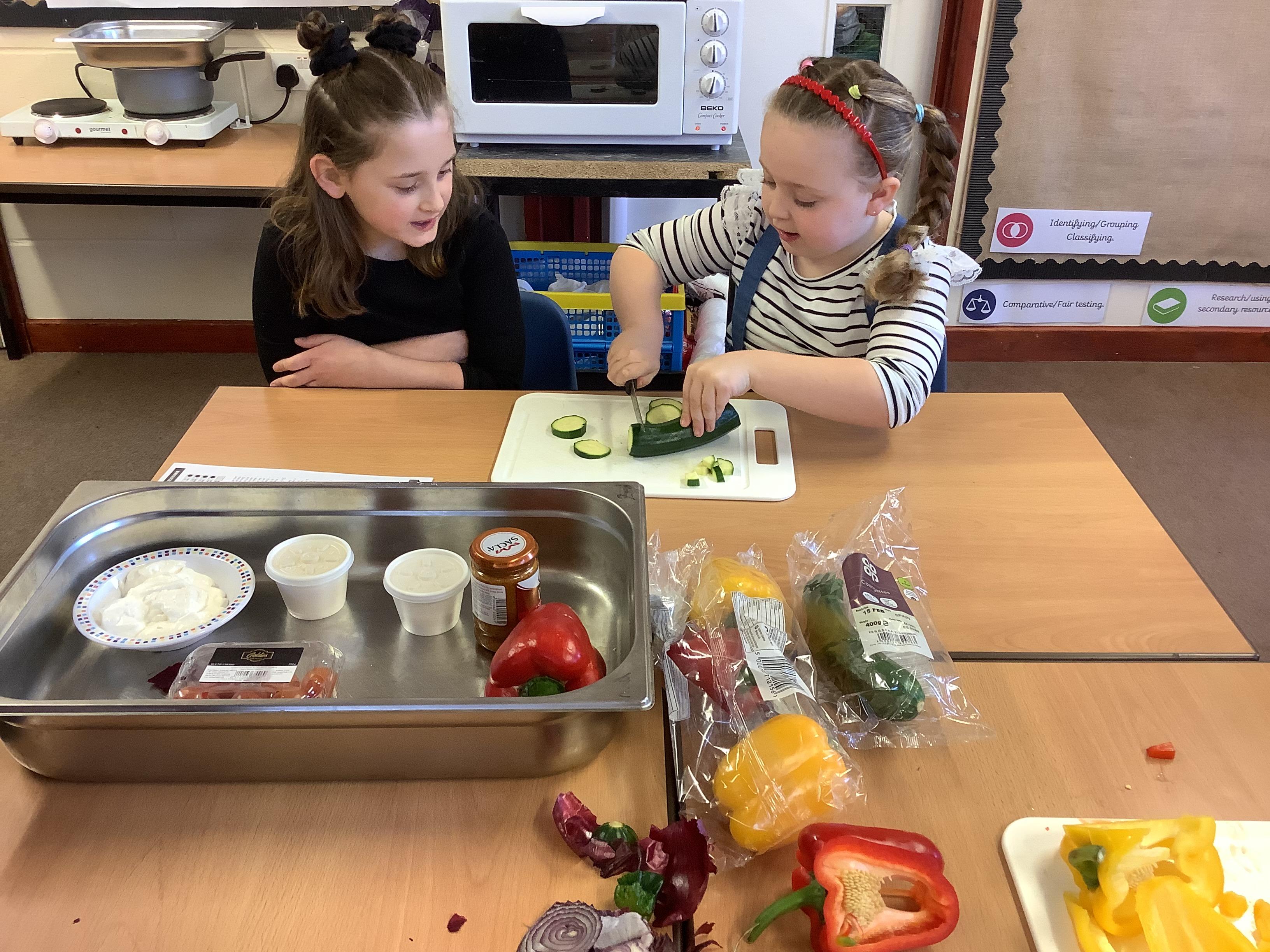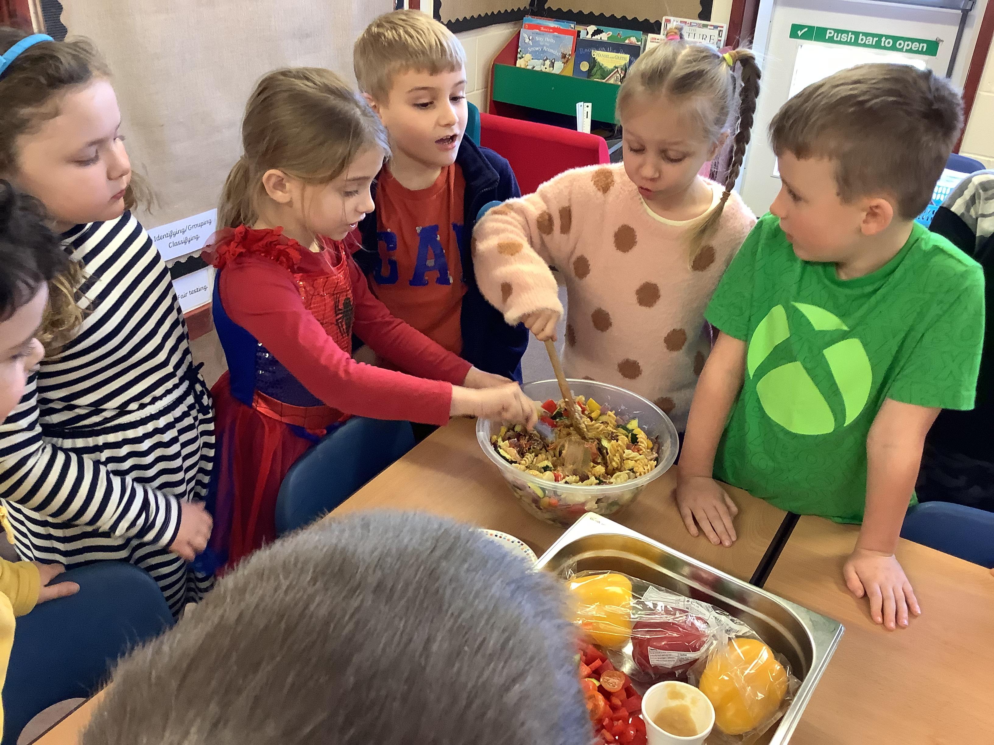 Children enjoyed cooking today, they cut up peppers, courgettes and red onions to roast with garlic in the oven, then they made pasta, drained it and added the roasted vegetables with mayonnaise and red pesto. They all had a pot to taste and they all thought it was delicious!