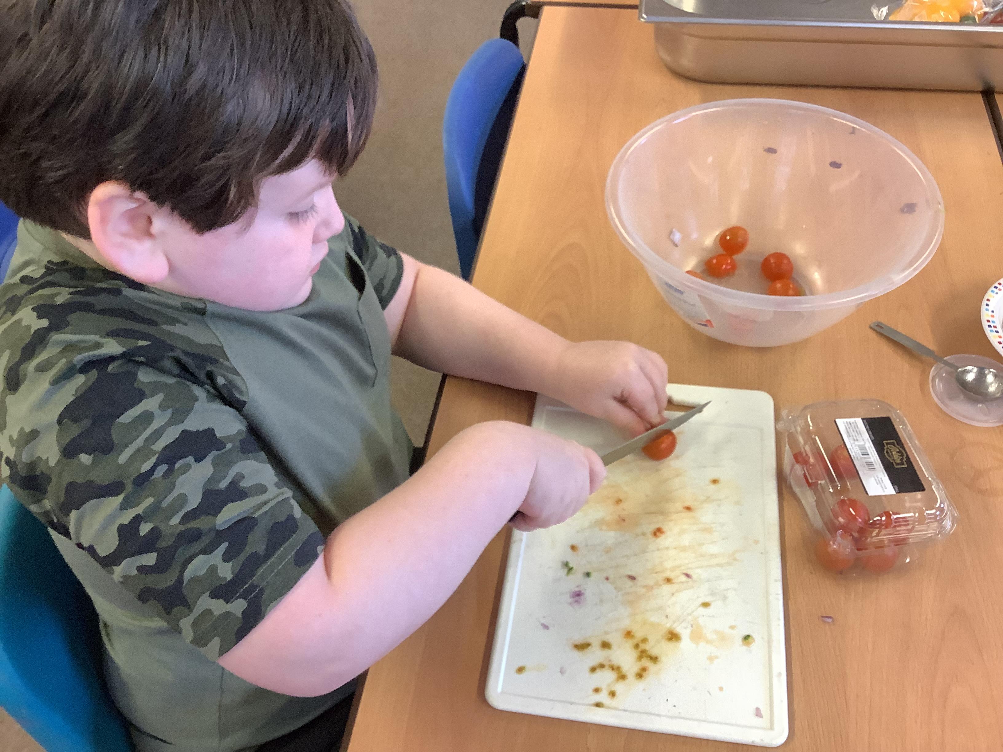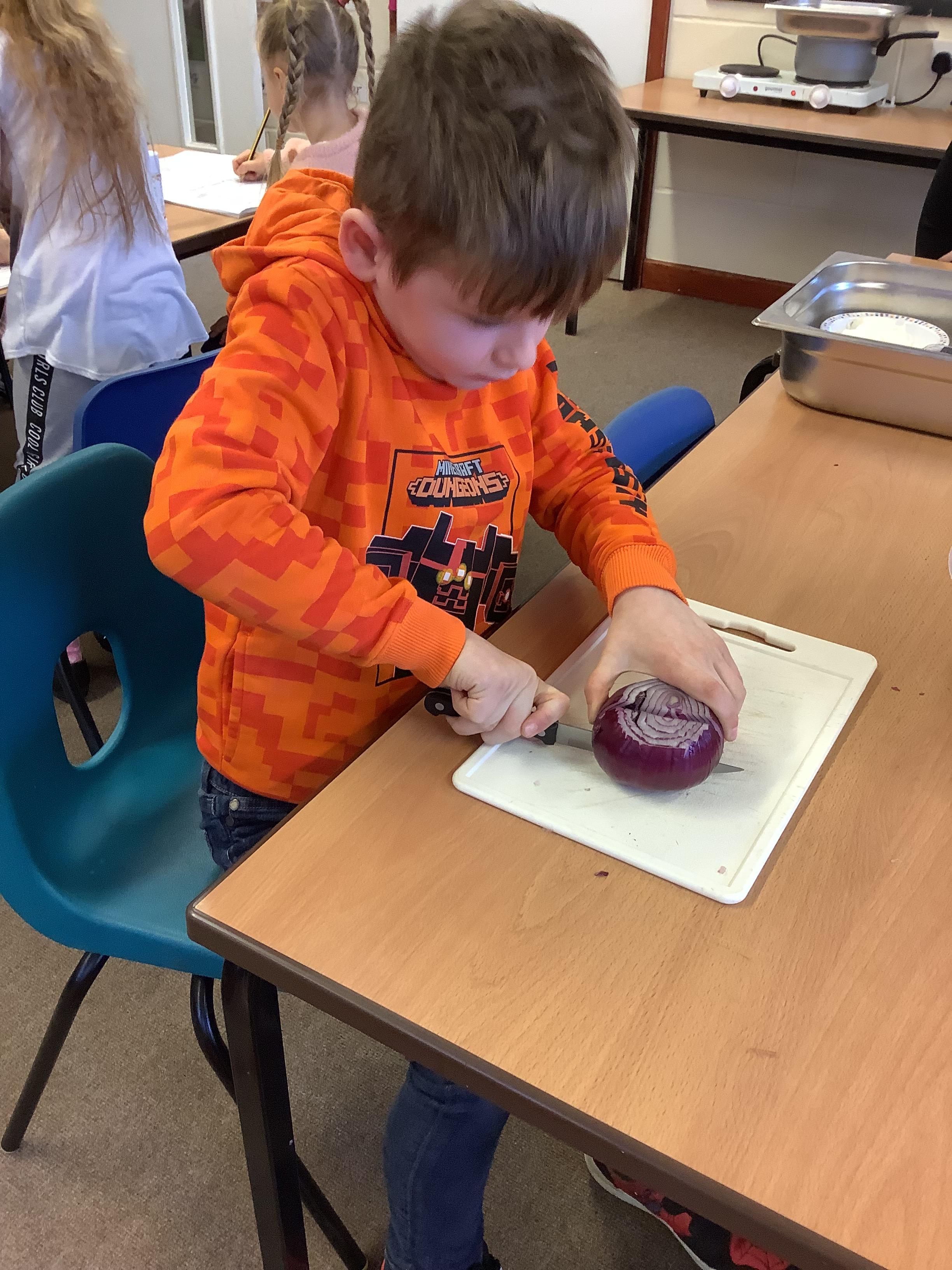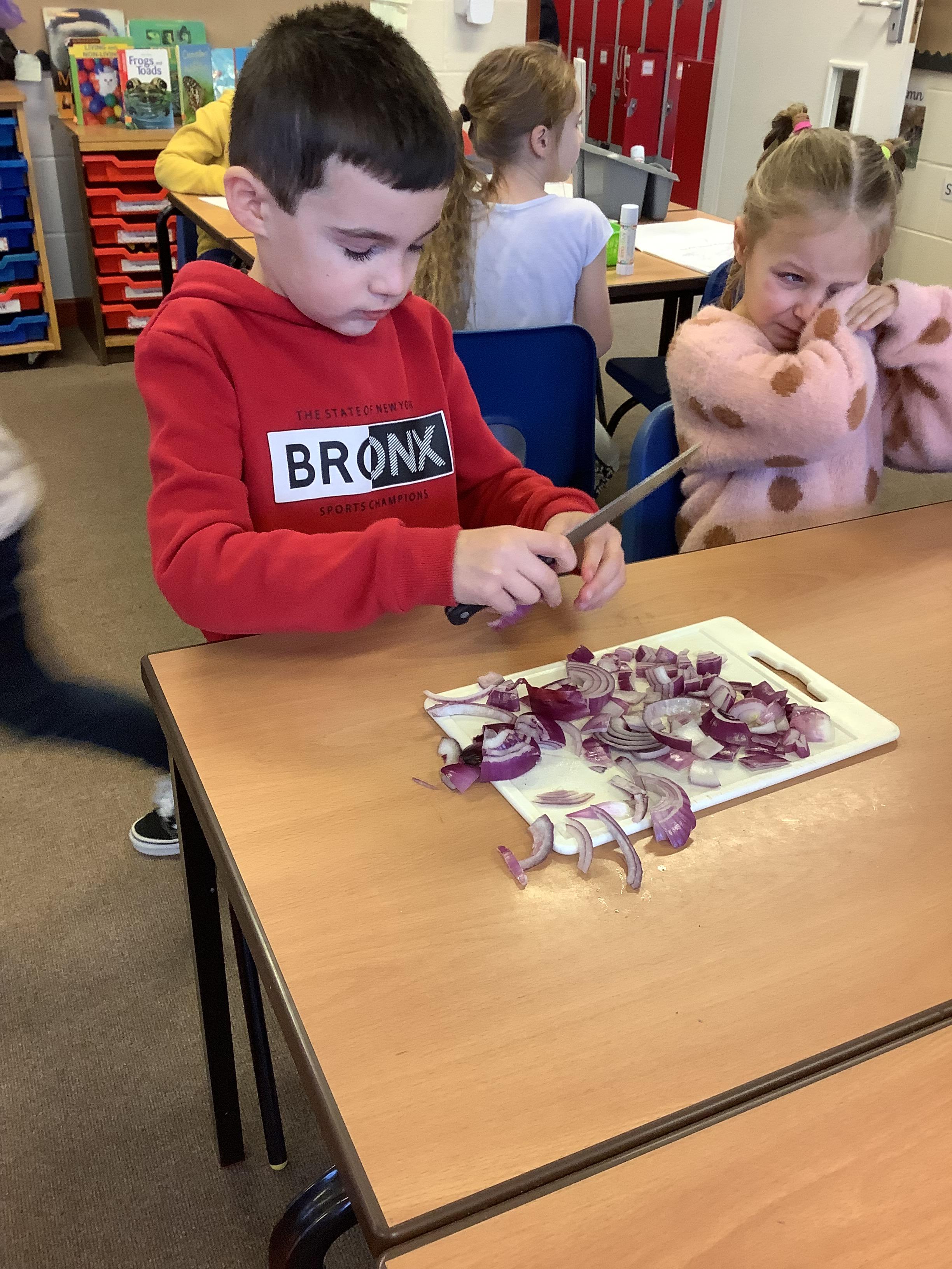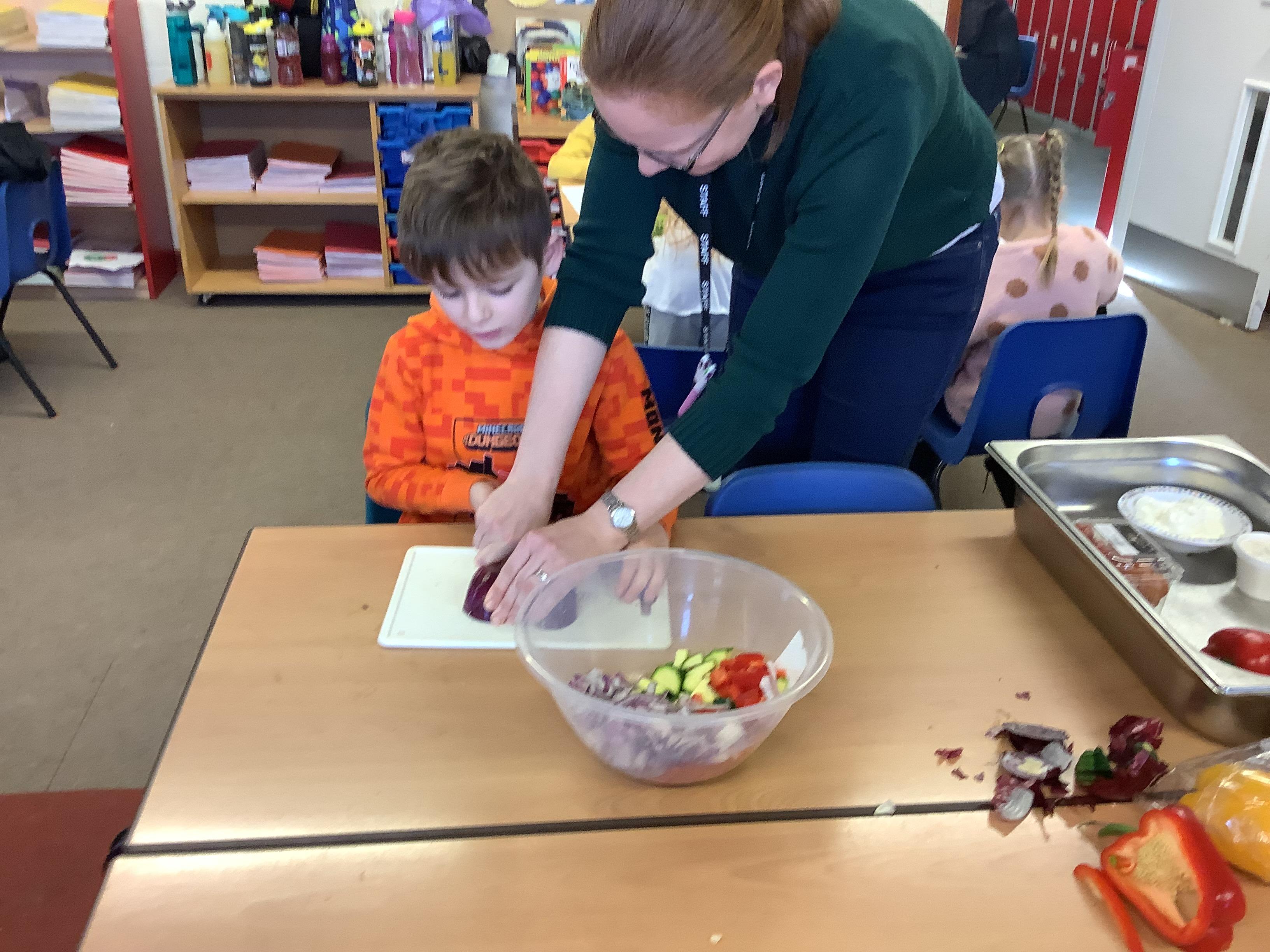 Children enjoyed cooking today, they cut up peppers, courgettes and red onions to roast with garlic in the oven, then they made pasta, drained it and added the roasted vegetables with mayonnaise and red pesto. They all had a pot to taste and they all thought it was delicious!