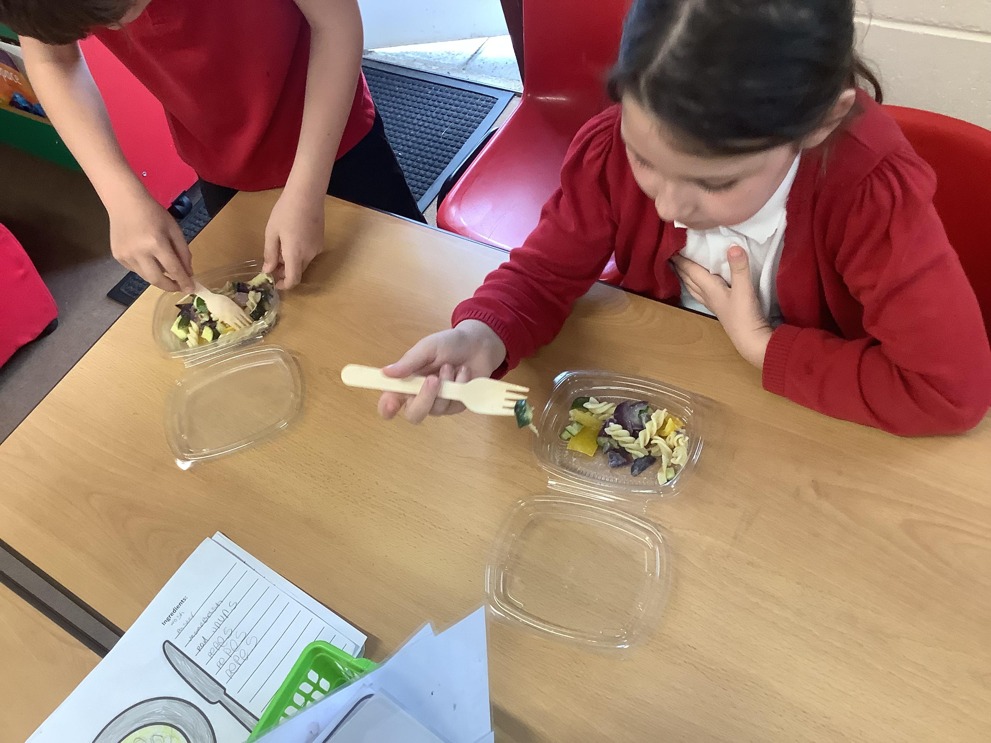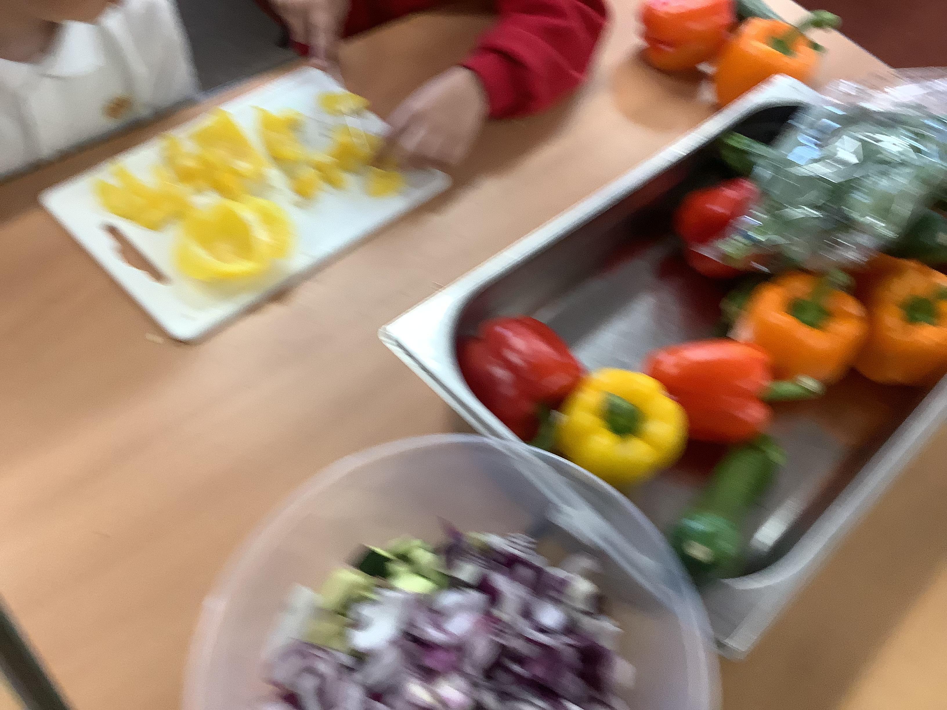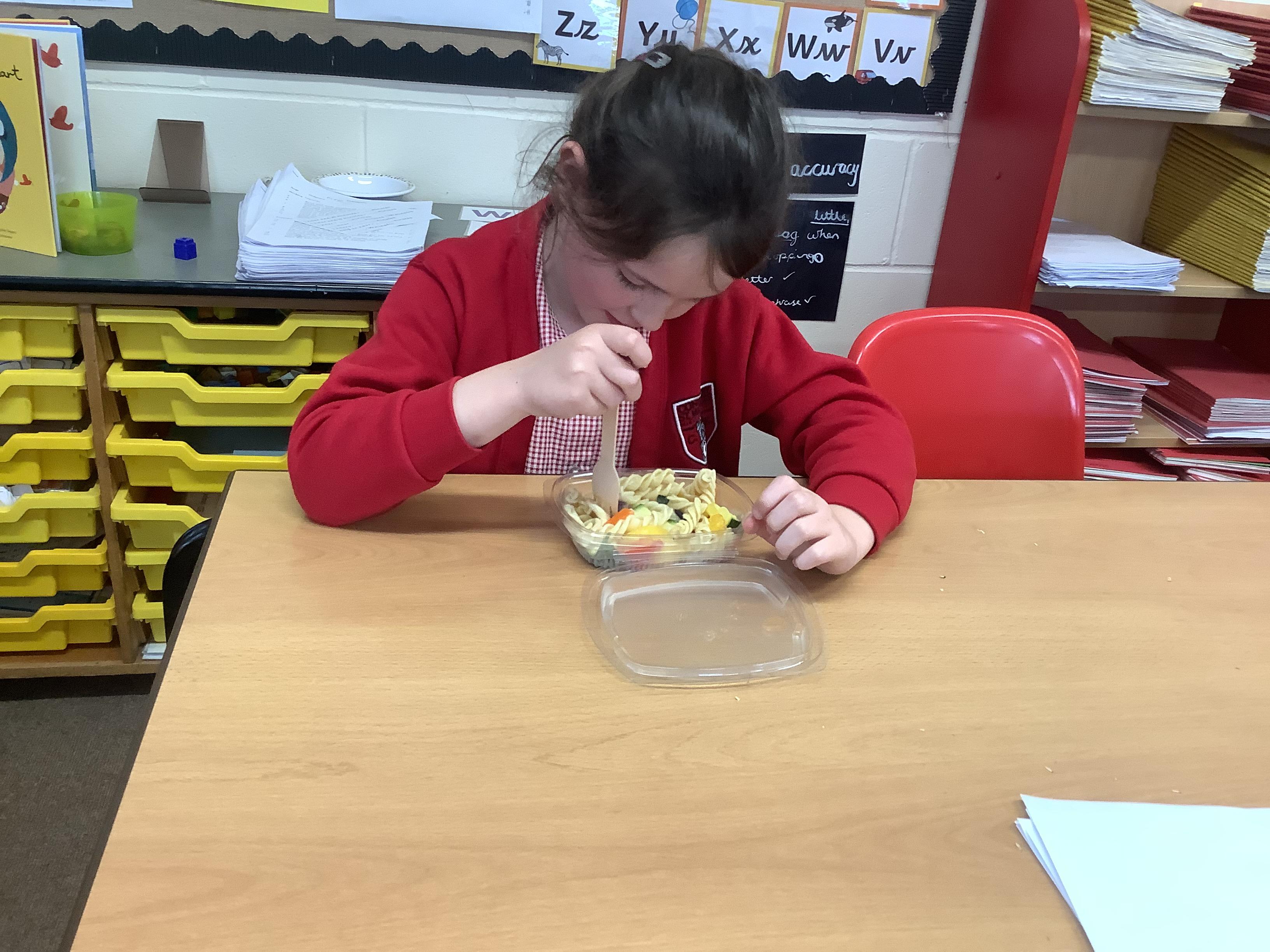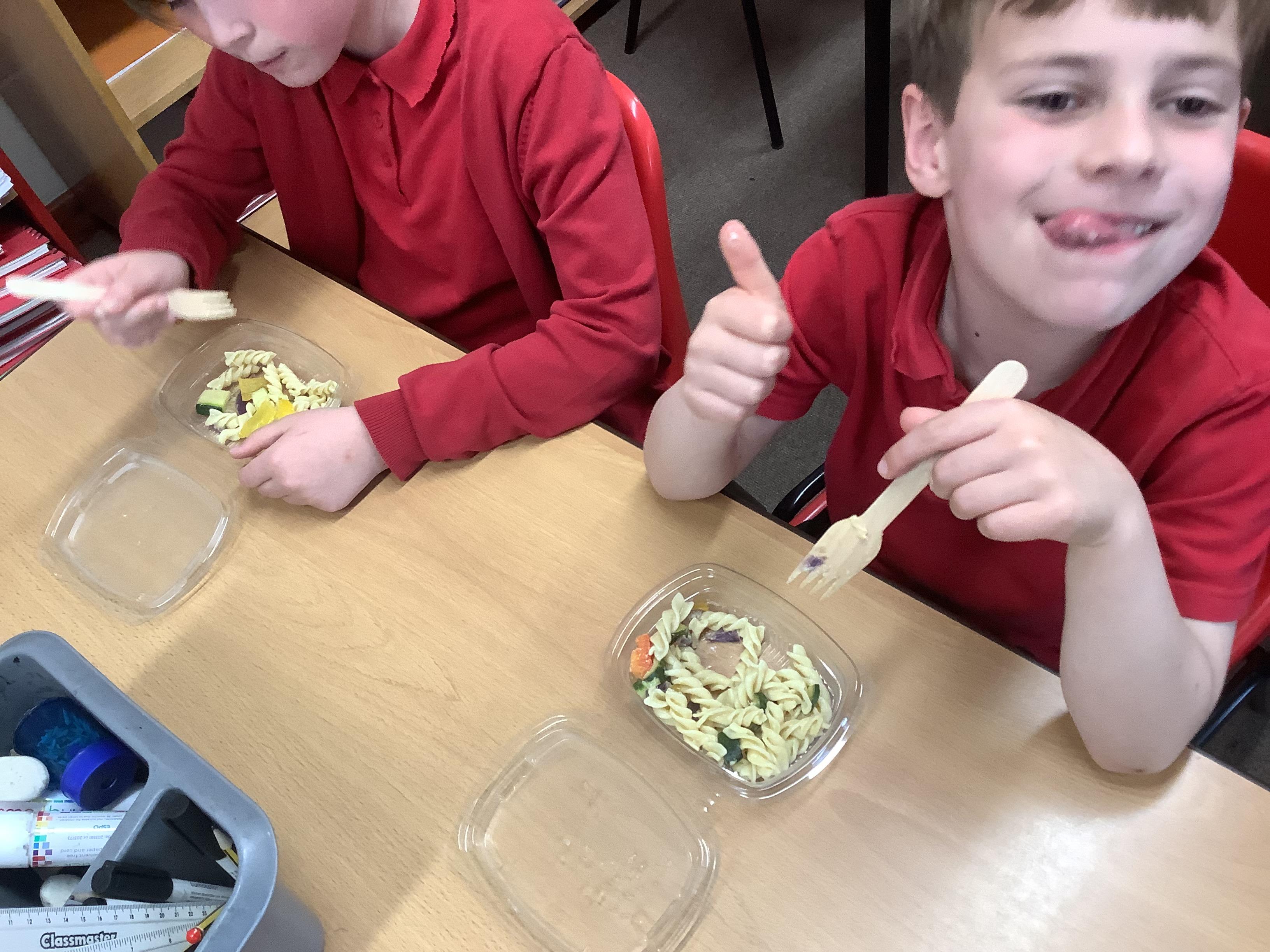 Today we got to make our healthy meal! We boiled the pasta and let it cool, then we cut all our veg into chunks, added some garlic and olive oil and roasted it in the oven. Then we combined all the ingredients with a little mayonnaise and added some basil leaves for a final touch!