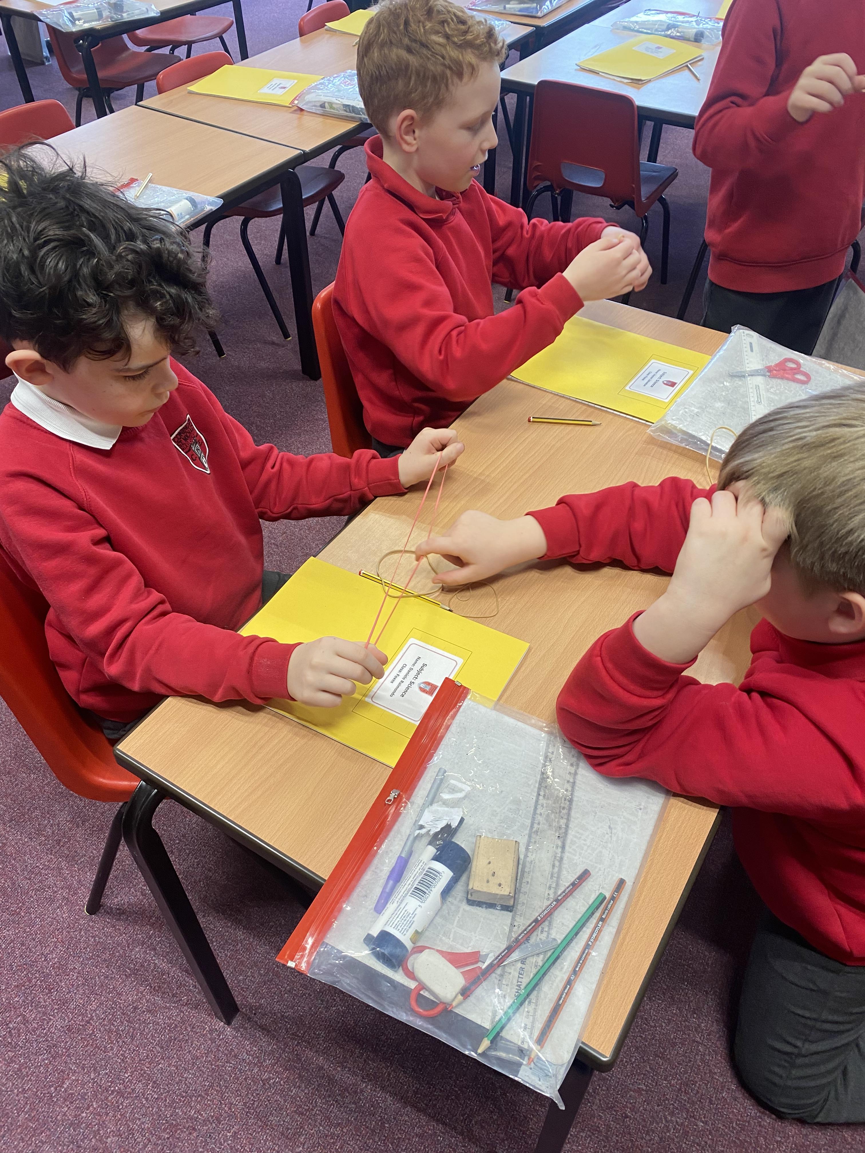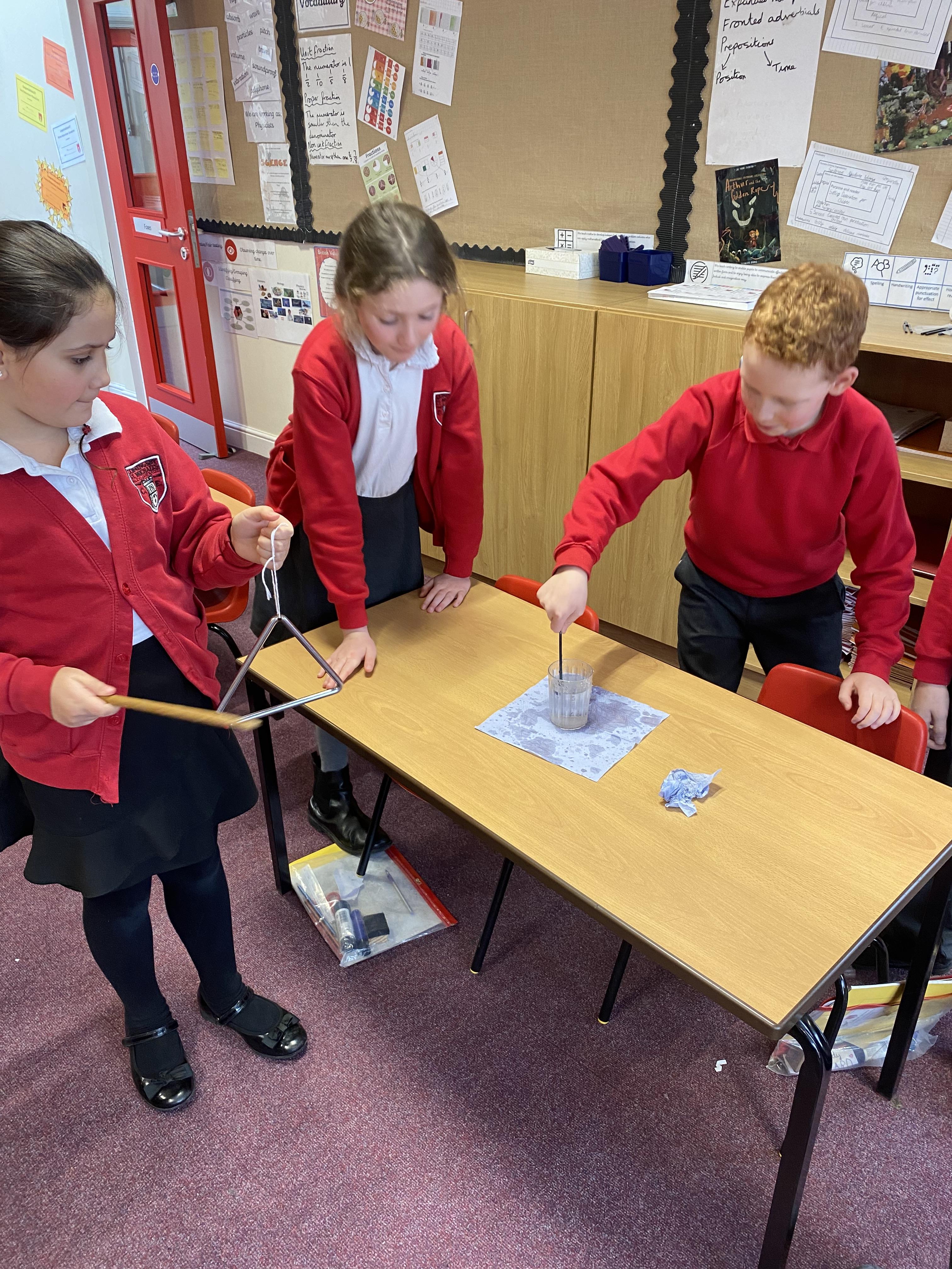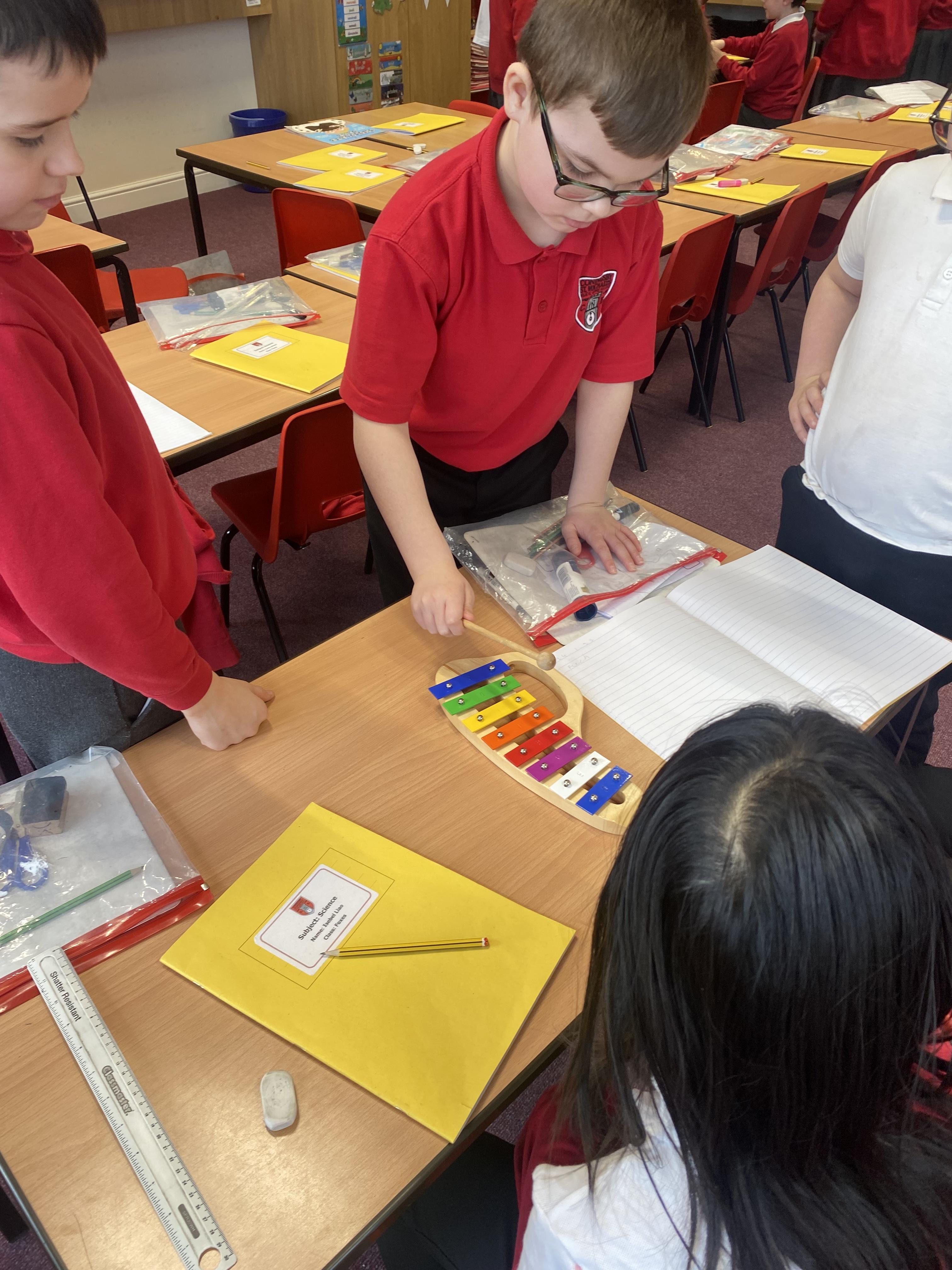 In Science, we tried to find out what changed the pitch of the sound for different producers of sound. We used elastic bands, a xylophone, drums, cups of water and a set of panpipes. We found out that: