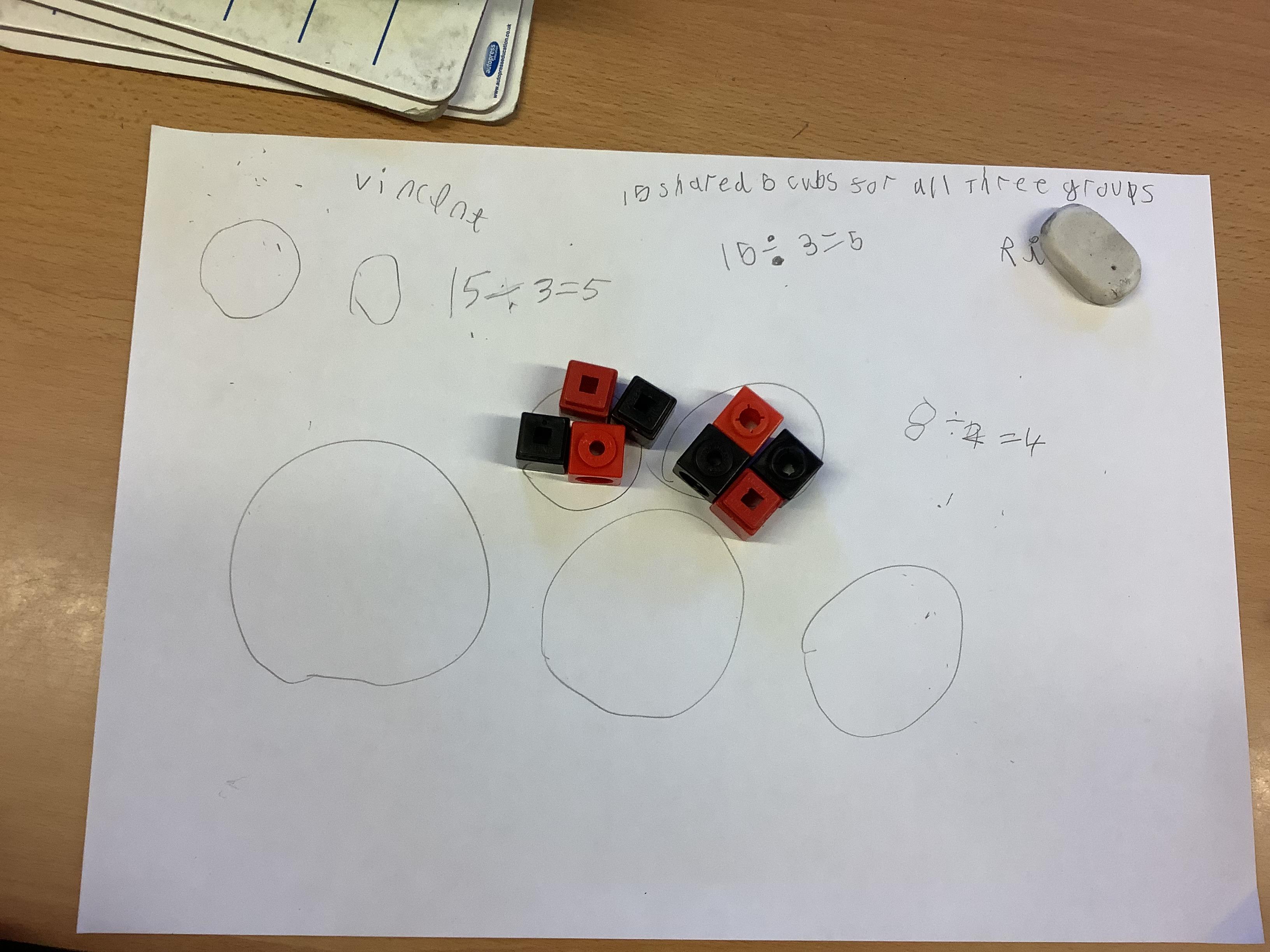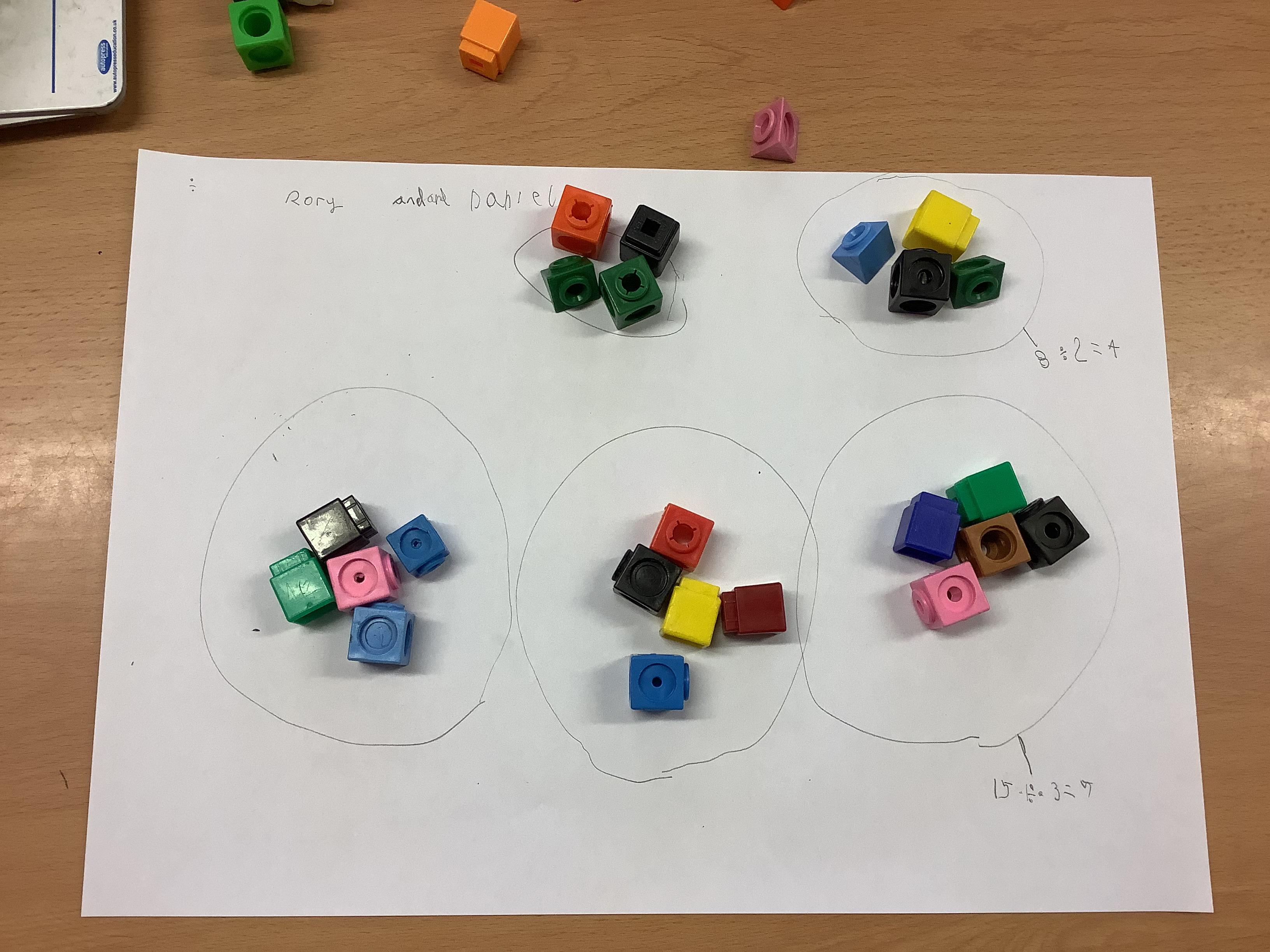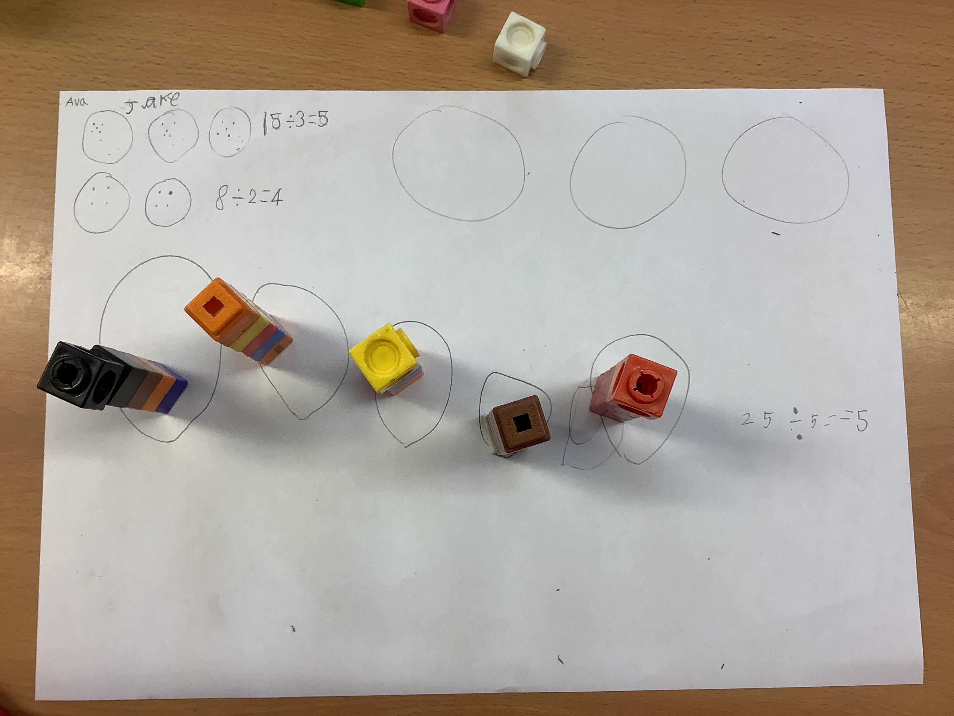This week we will be learning the inverse or opposite of multiplication, division. We started off by looking at sharing. Children were given an amount to share between groups such as, 'share 20 cubes between 5 groups. They had to draw how many groups there are, 5, and then share the amount between them so 20. They the looked at how many they had in each group to get the answer. This led to them writing 20 shared between 5 groups = 4 each.
