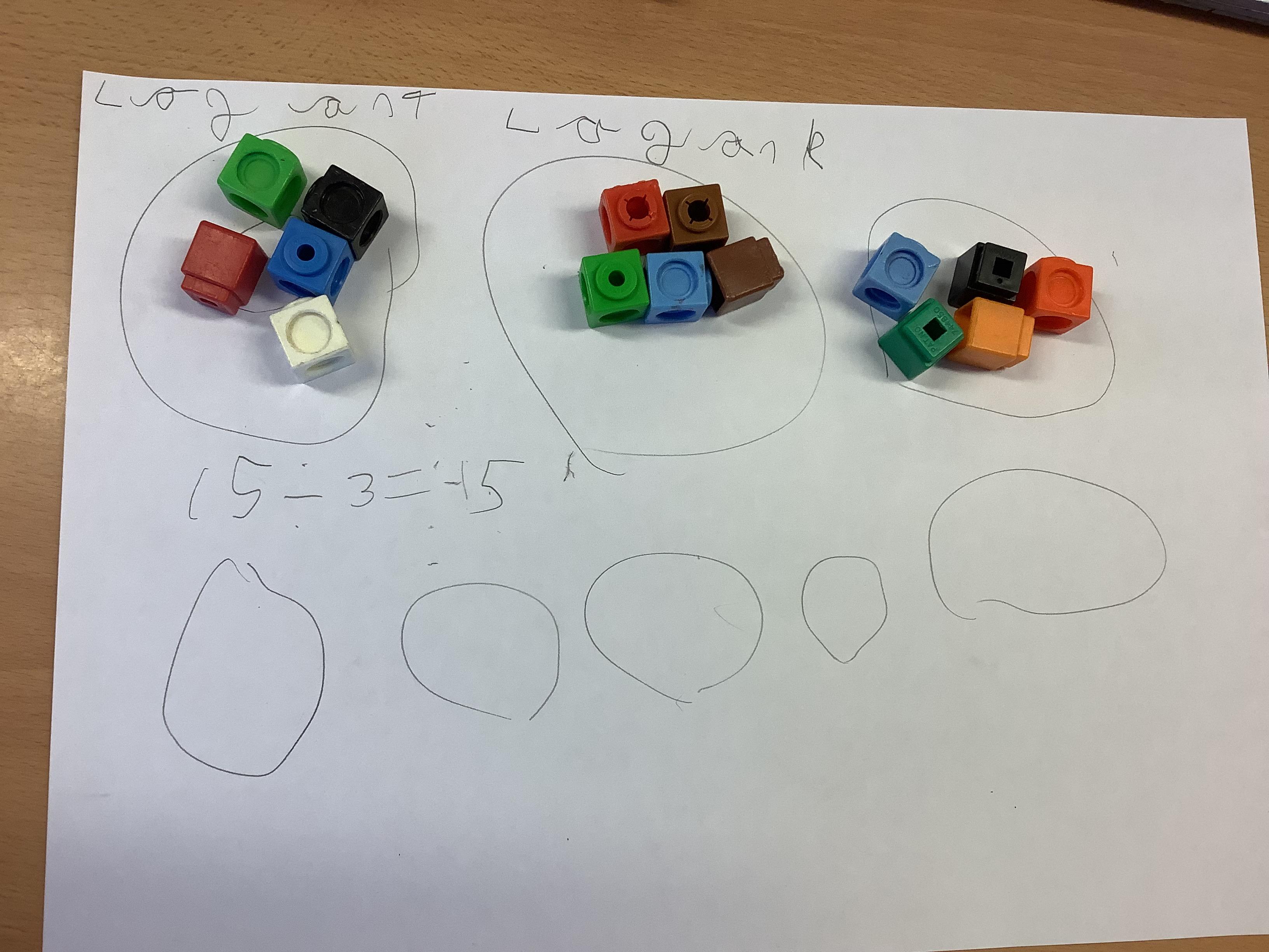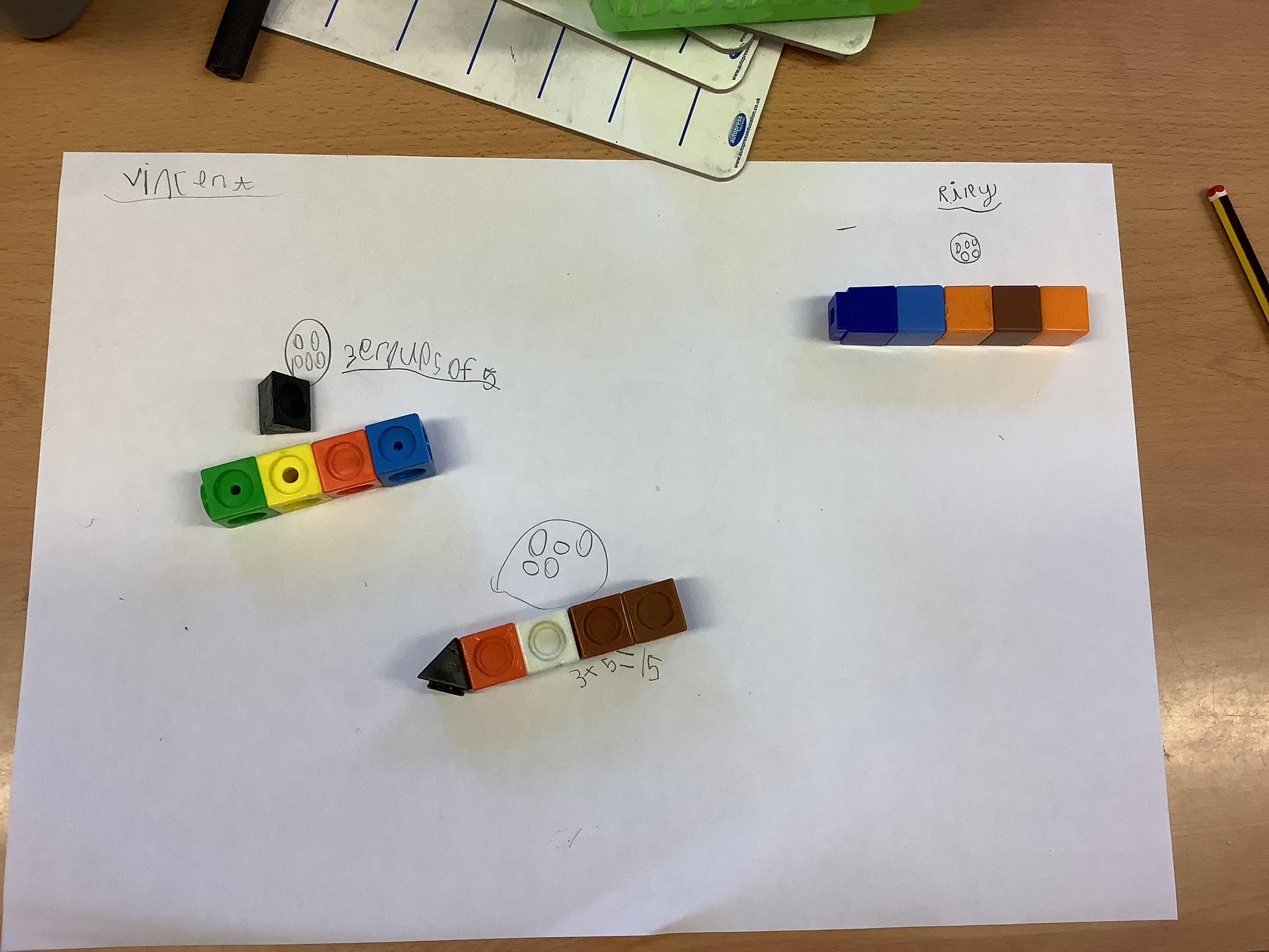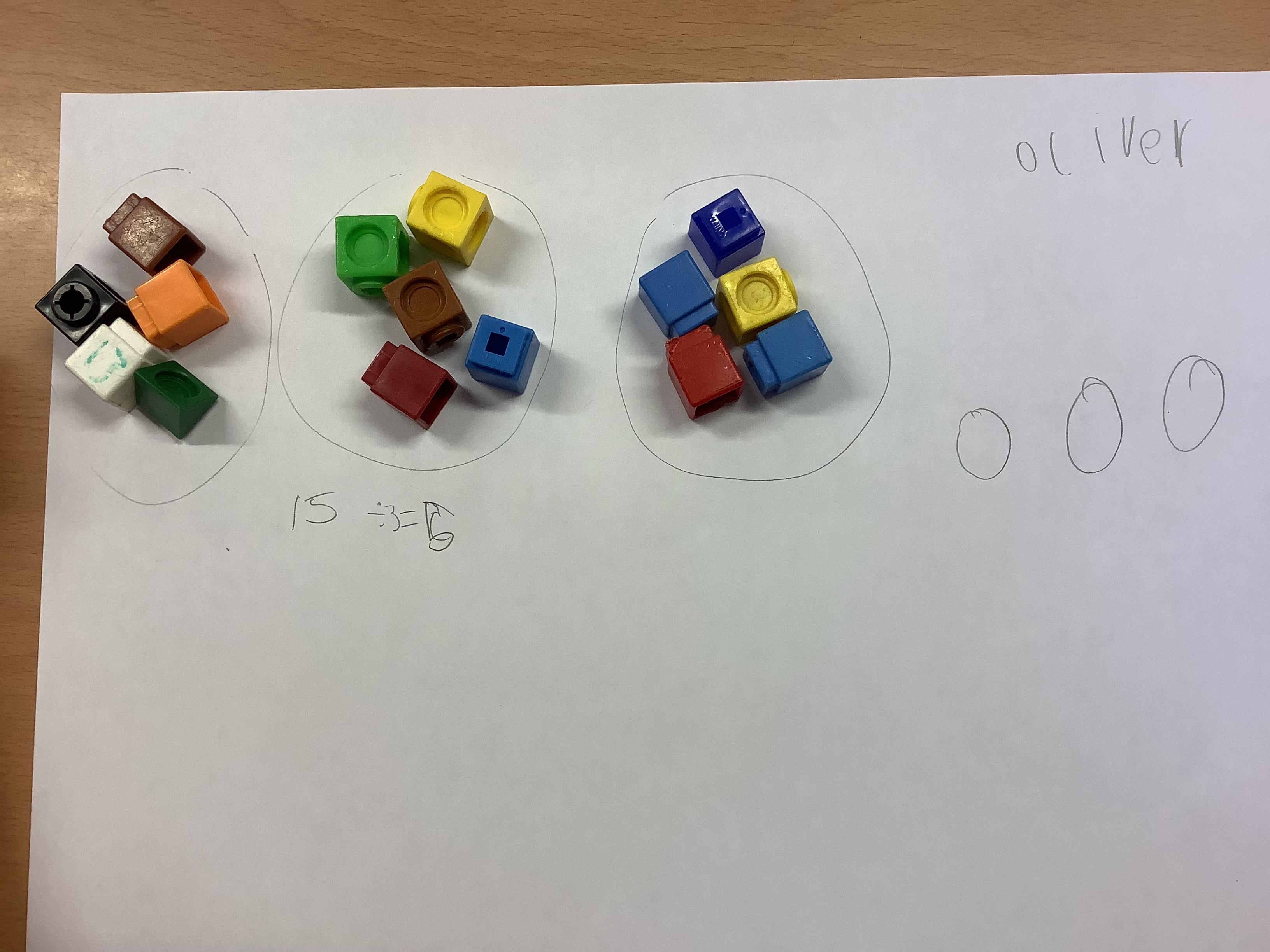 This week we will be learning the inverse or opposite of multiplication, division. We started off by looking at sharing. Children were given an amount to share between groups such as, 'share 20 cubes between 5 groups. They had to draw how many groups there are, 5, and then share the amount between them so 20. They the looked at how many they had in each group to get the answer. This led to them writing 20 shared between 5 groups = 4 each.
