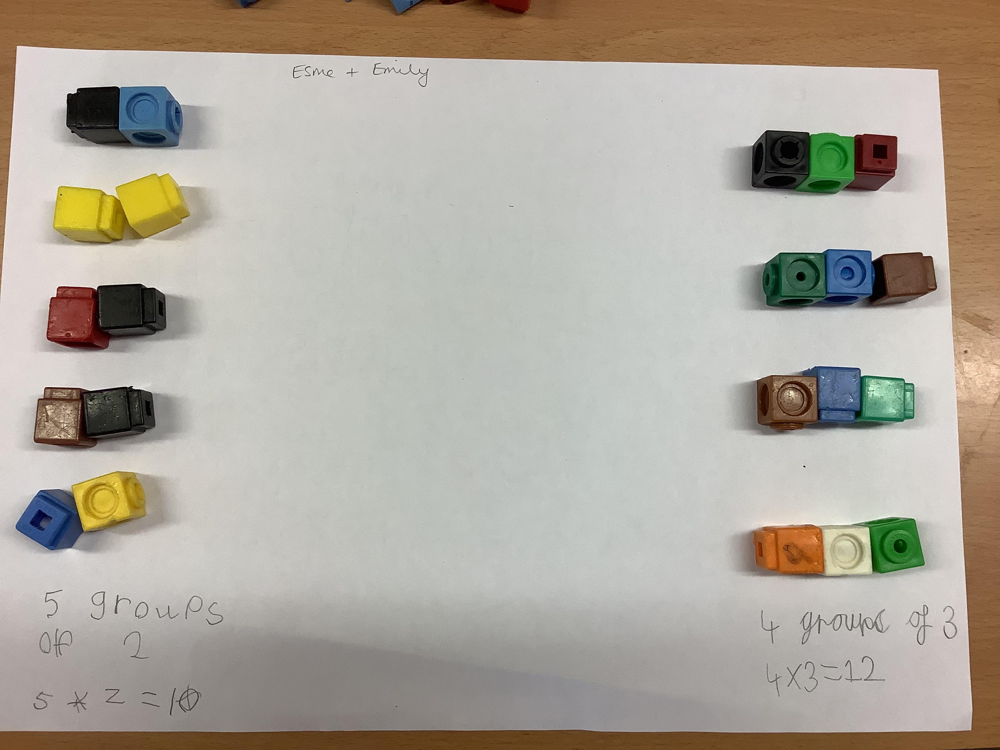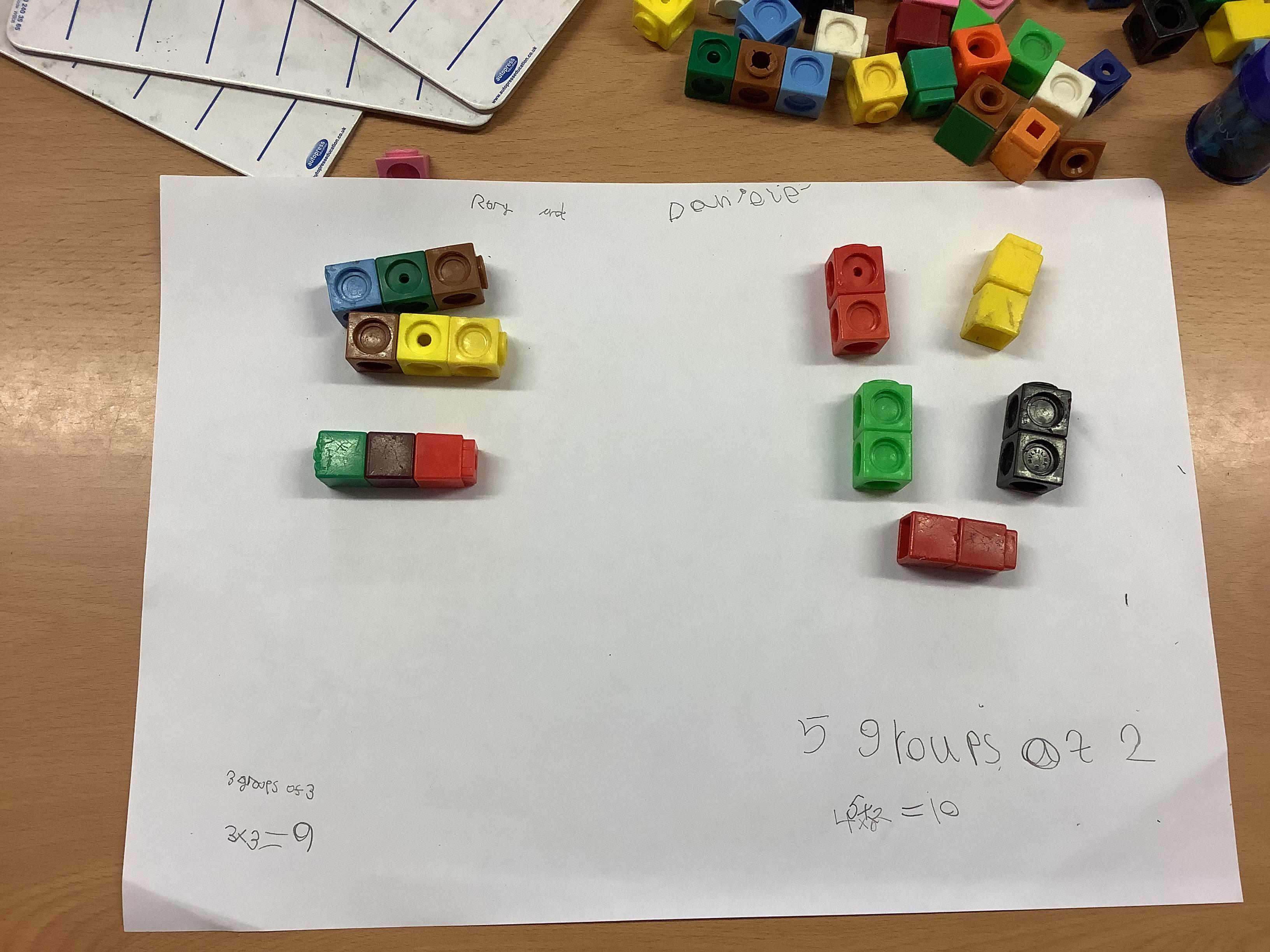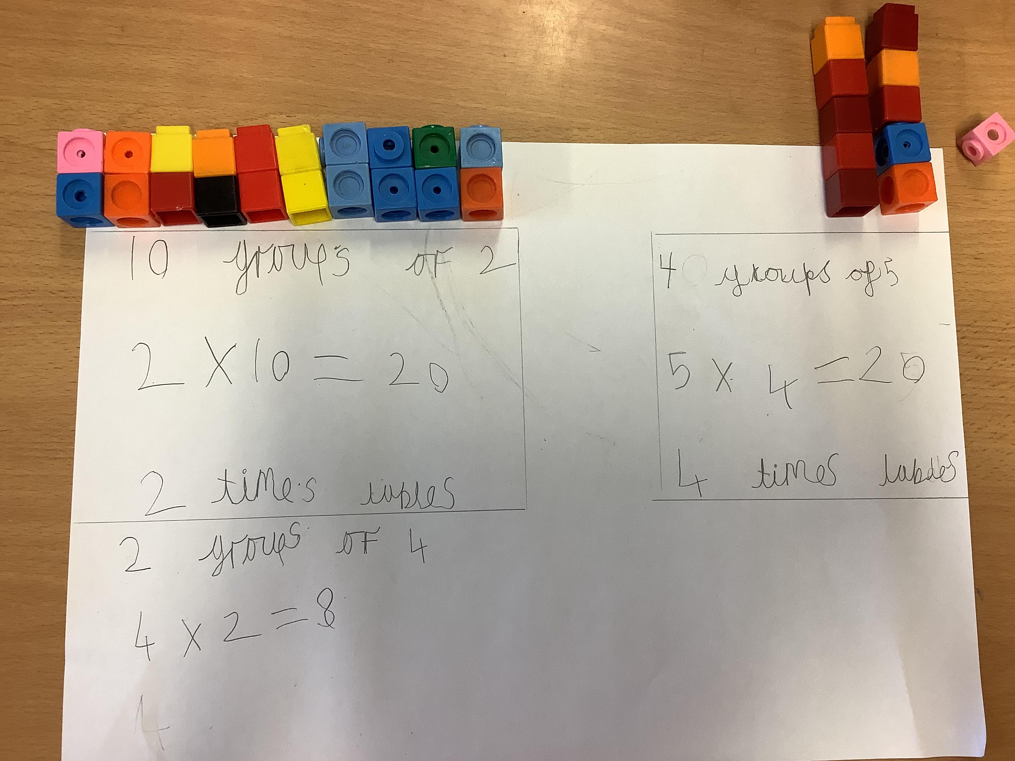 The children have started their maths learning this term with multiplication. Children started off by splitting cubes into equal groups and then describing what they had done. They used the phrases, 4 groups of 2, 4 lots of 2, then 4 x 2. They will also show what they know about multiplication using repeated addition, part whole and bar models. By the end of year 2 children should know their 2's, 5's, and 10 times tables and all associated facts including division facts.