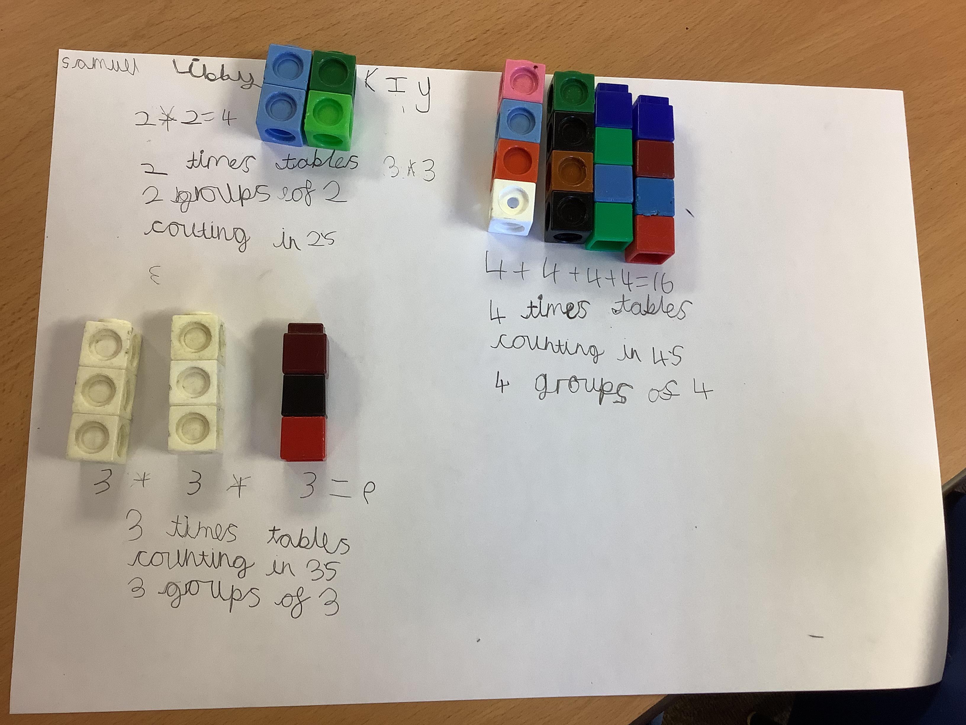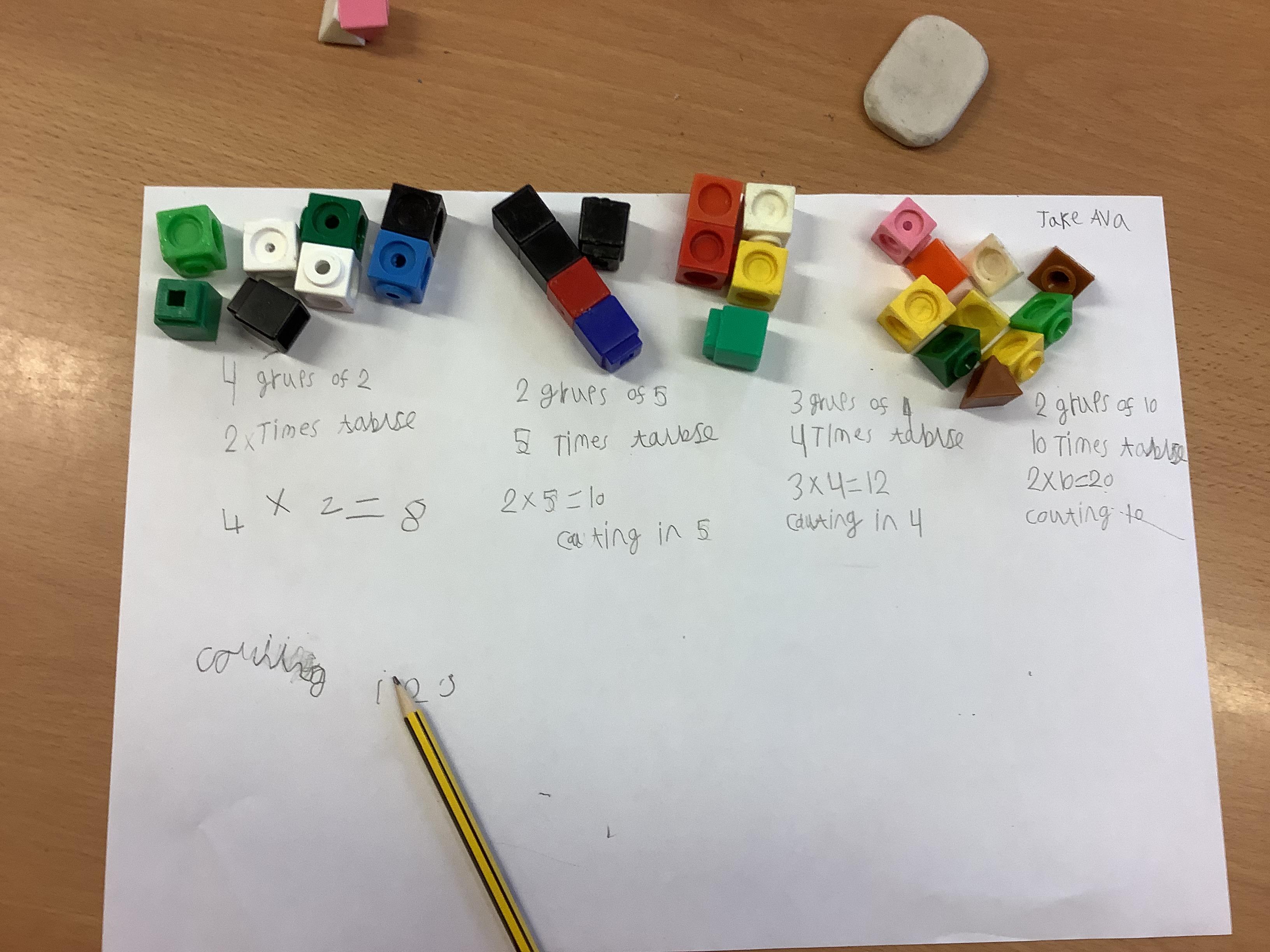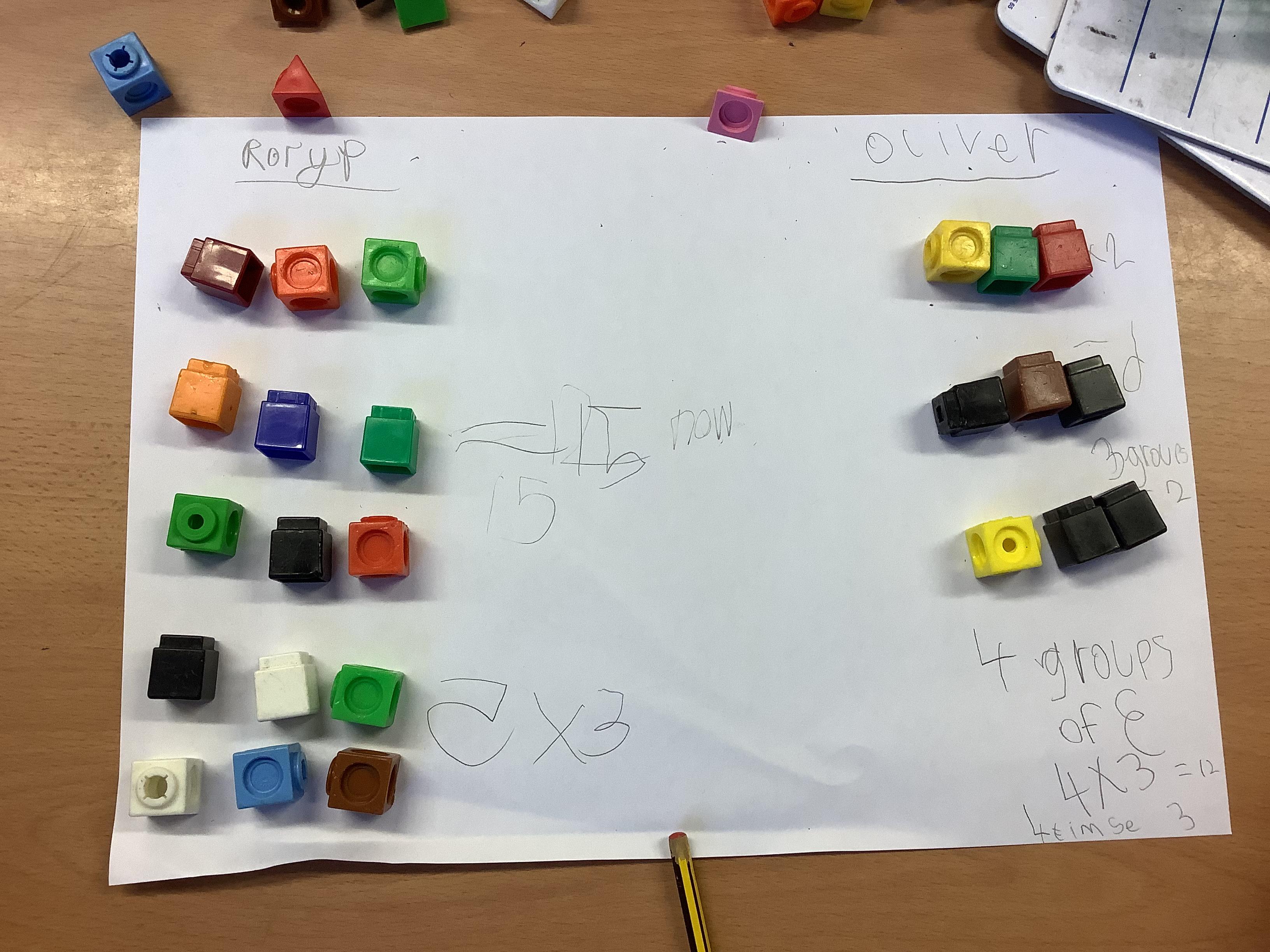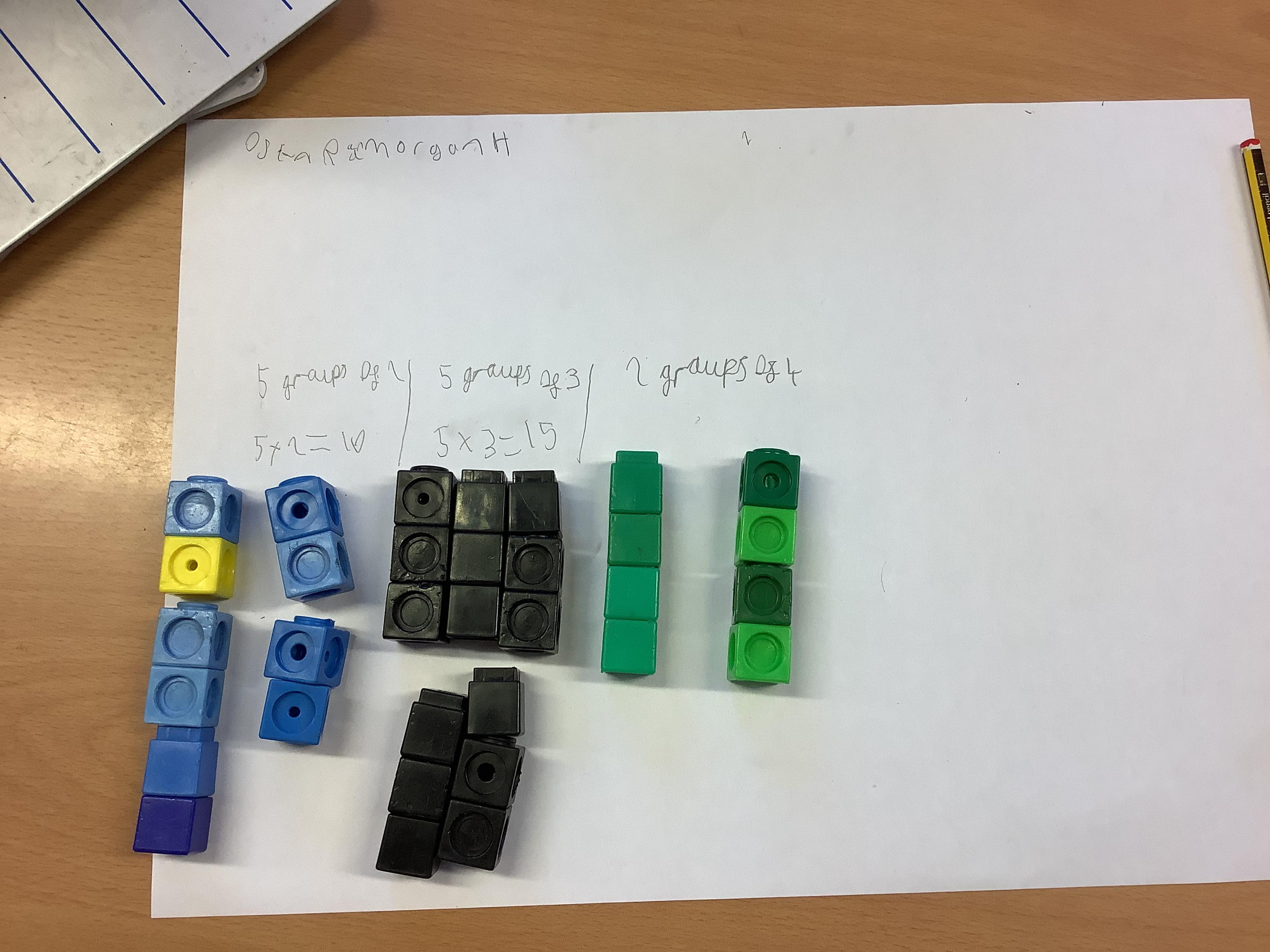 The children have started their maths learning this term with multiplication. Children started off by splitting cubes into equal groups and then describing what they had done. They used the phrases, 4 groups of 2, 4 lots of 2, then 4 x 2. They will also show what they know about multiplication using repeated addition, part whole and bar models. By the end of year 2 children should know their 2's, 5's, and 10 times tables and all associated facts including division facts.