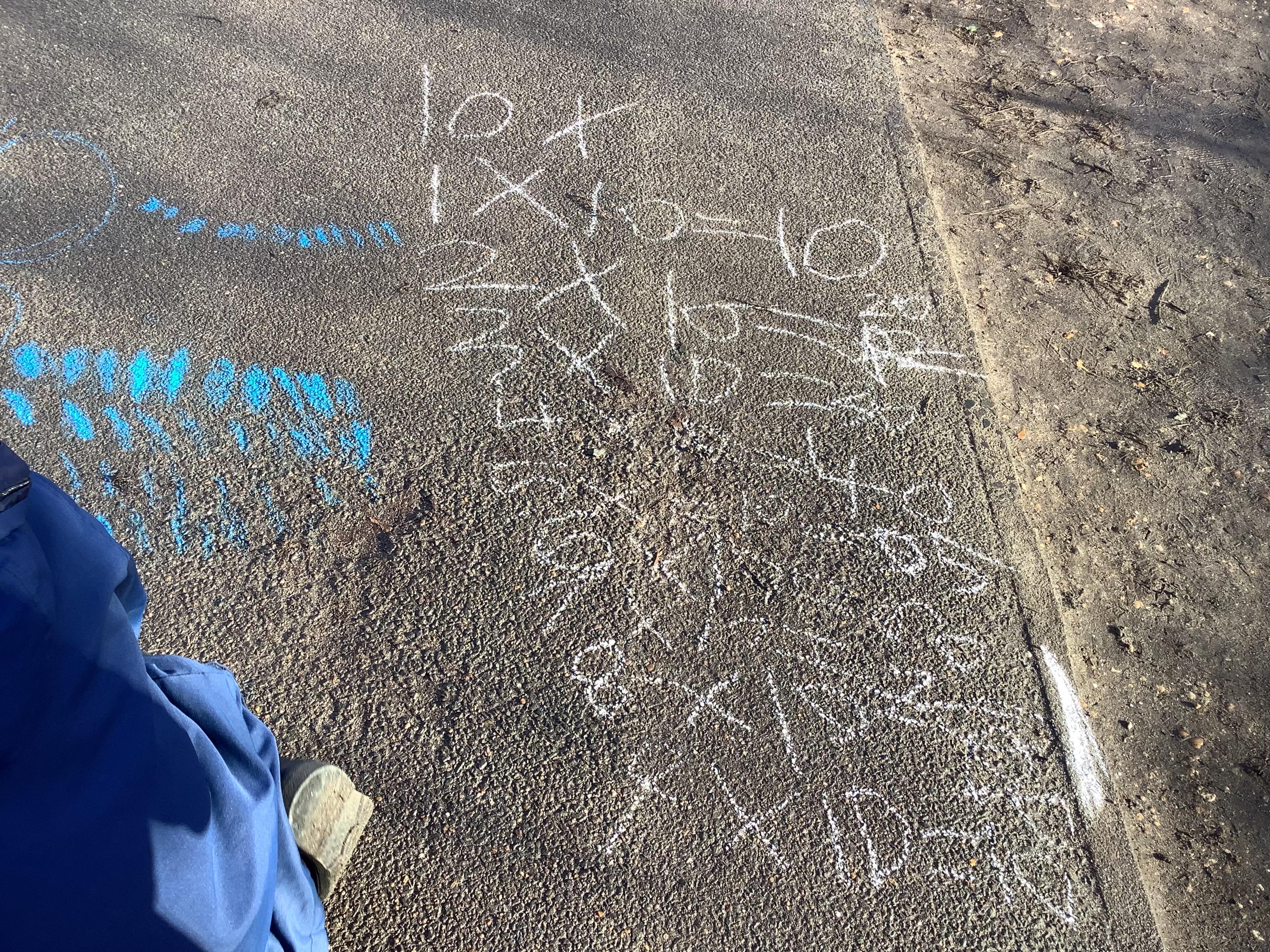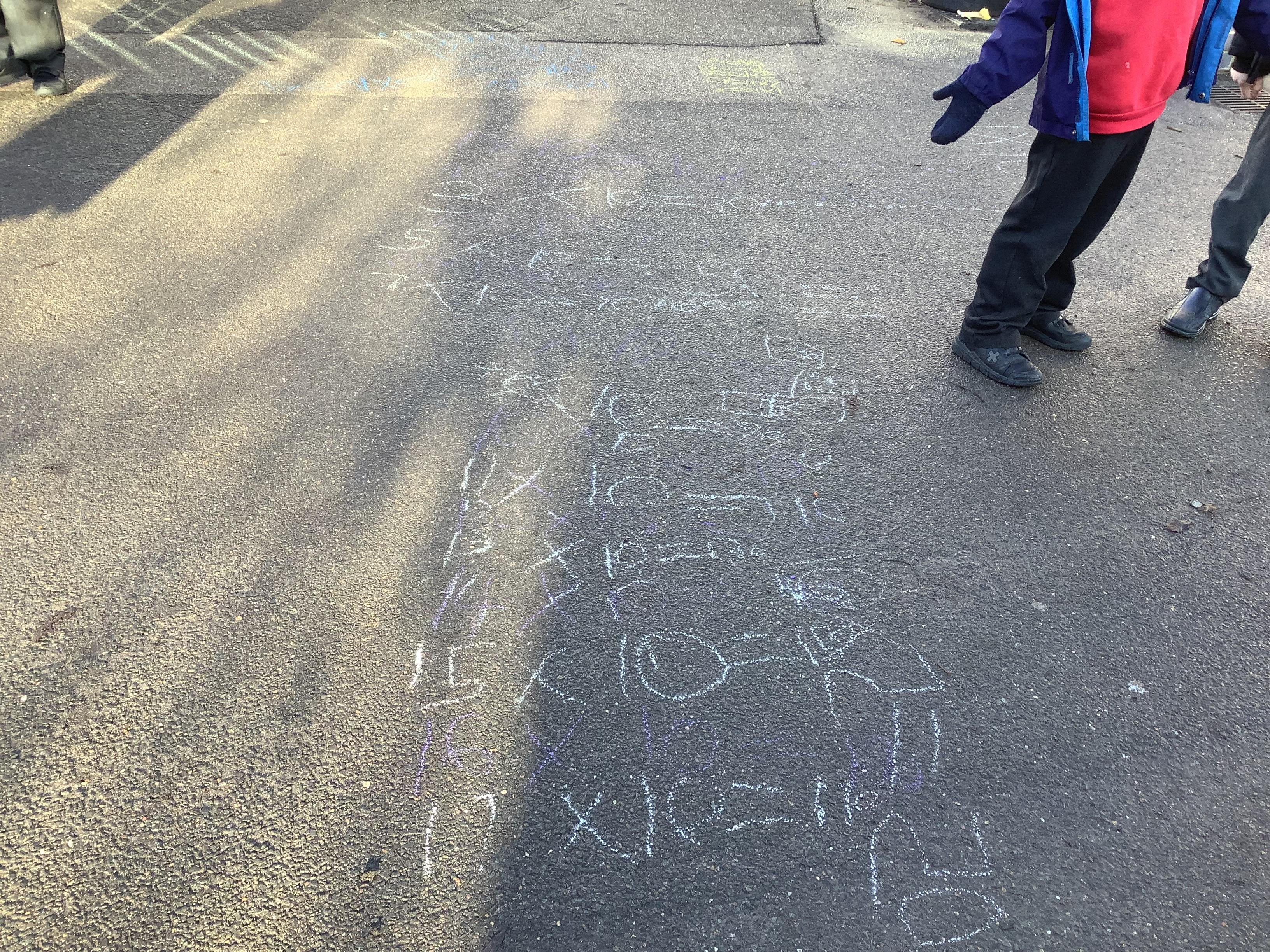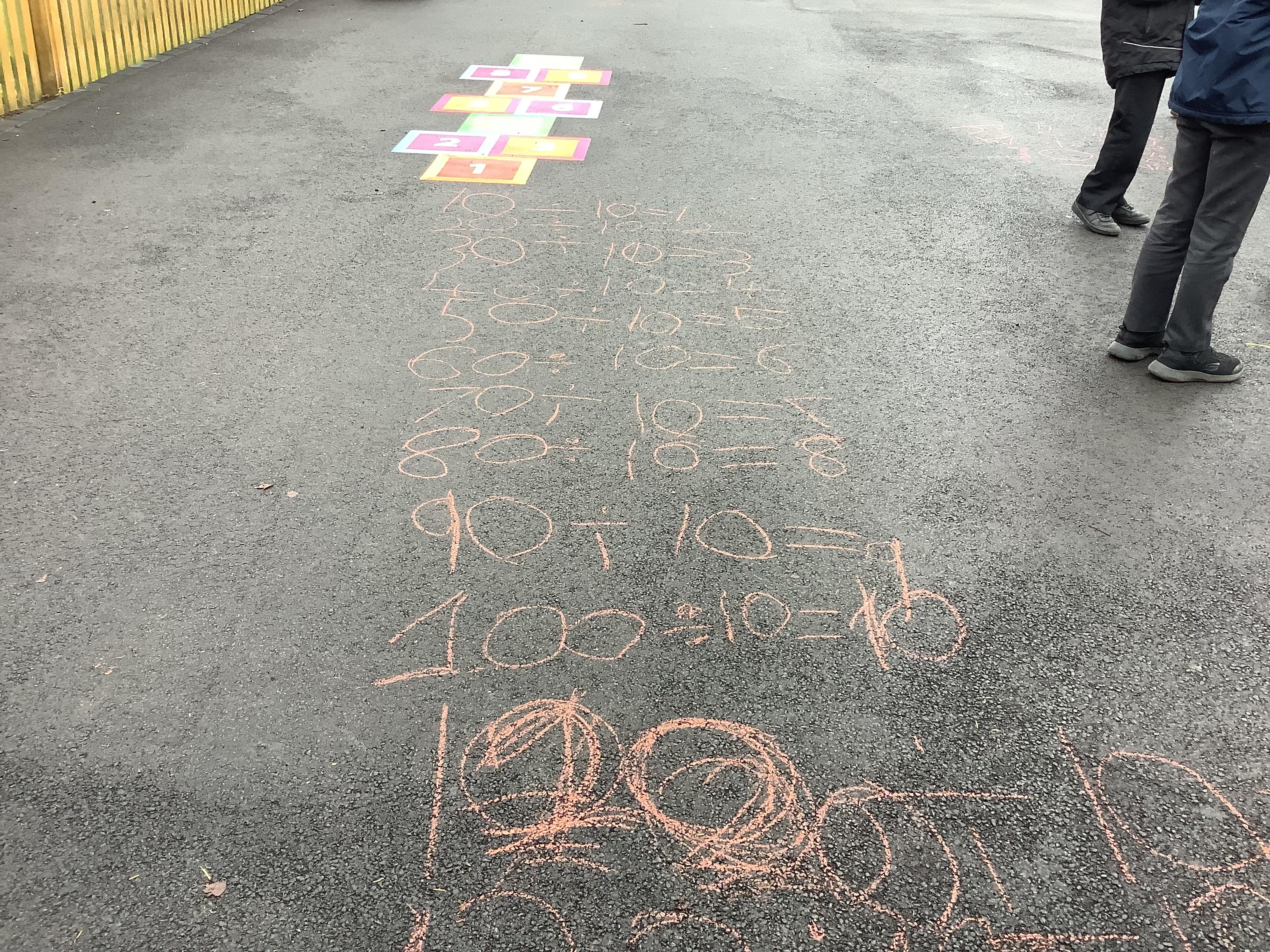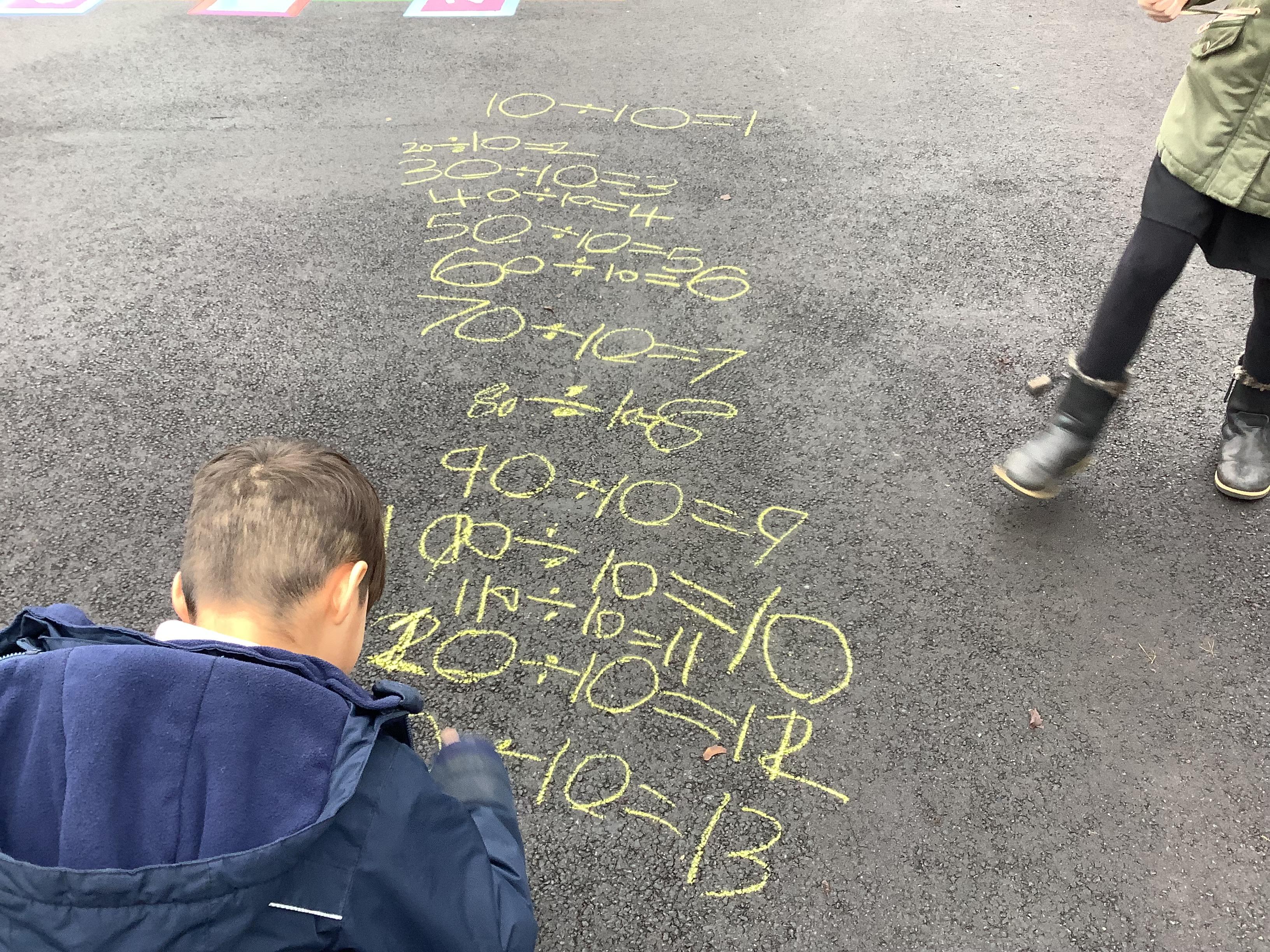 This week in maths, children have been learning how to multiply 2, 5 and 10. They went to the playground and wrote out the 10 times tables and made arrays to represent them.