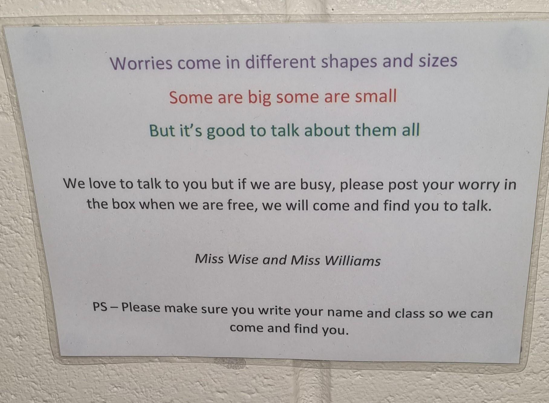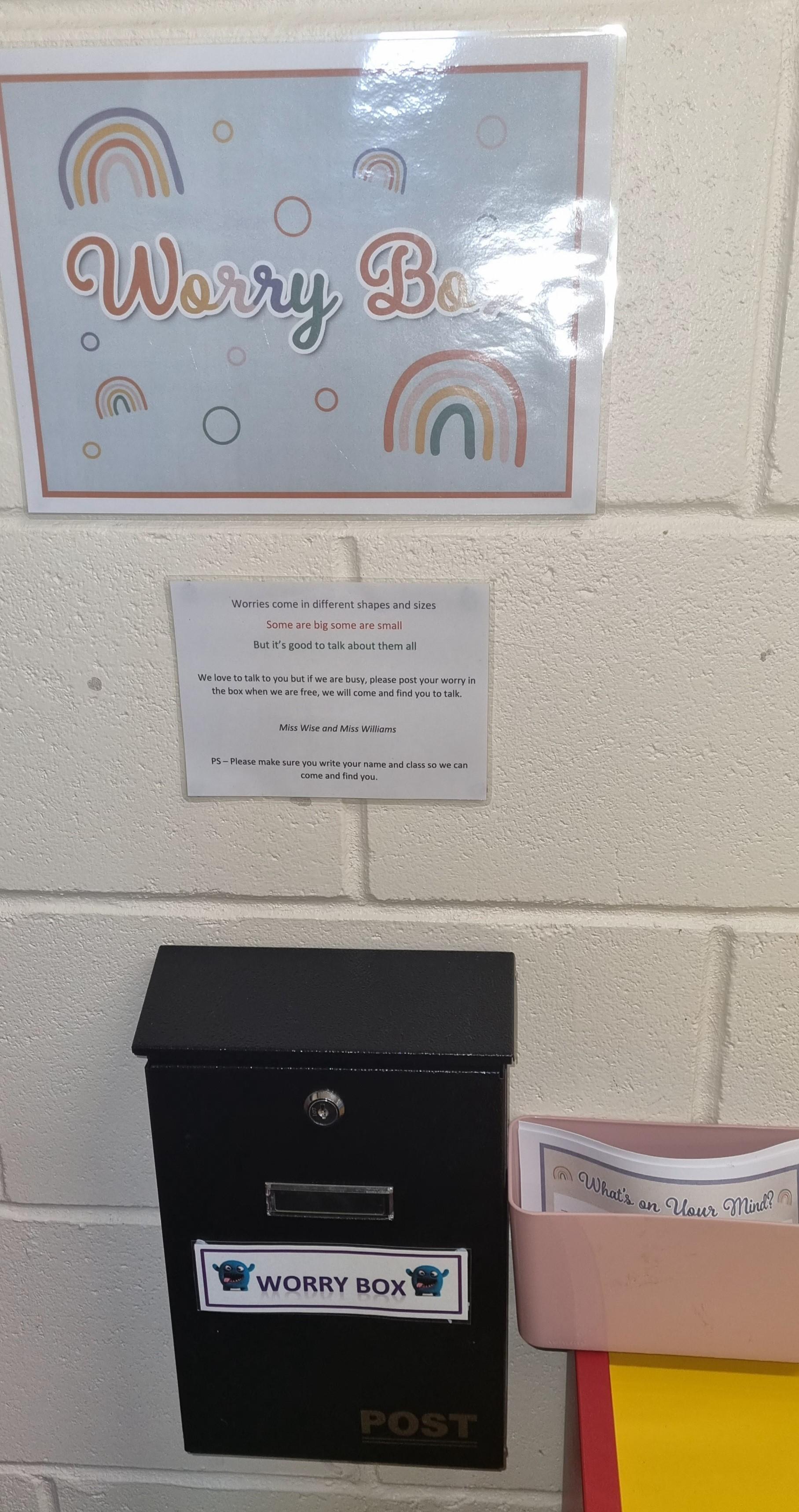 A Worry Box has been placed outside the door to the burrow. This is available to all children in school. this provides a forum through which the children are able to share their individual worries. The Pastoral Support team will then check the worry box regularly and will read the worries shared and find a suitable time to be able to discuss this with your child as soon as possible.