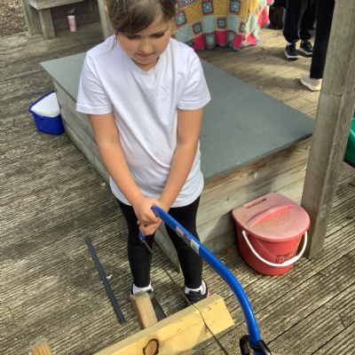 As part of the project, pupils developed a range of practical tool skills. They used bow saws to cut wooden blocks, hammers to assemble parts, and sandpaper to smooth their creations. These activities not only supported fine motor development but also encouraged safe tool handling and teamwork.