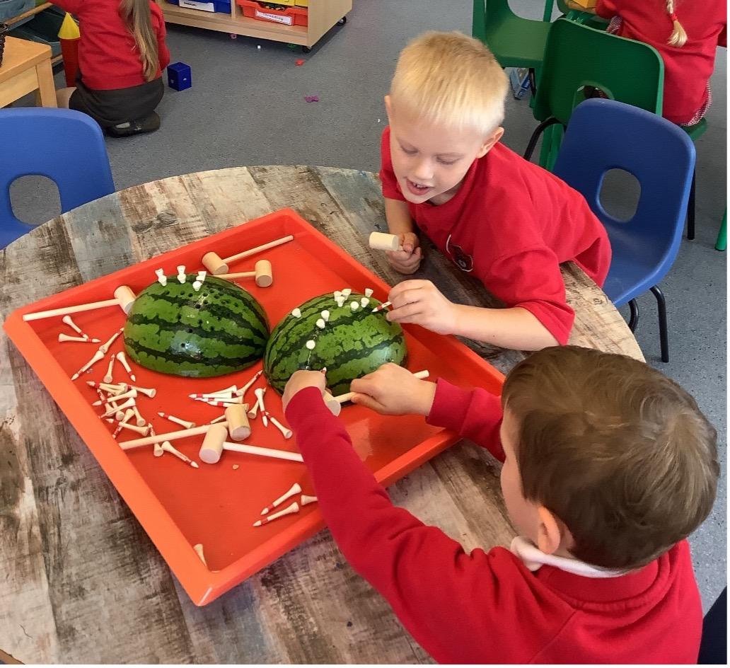 The children have enjoyed developing their fine motor skills this week by hammering golf tees into water melons.