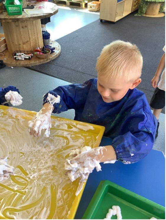 The children have been mark making in the shaving foam. They have been writing the letter sounds we have been learning this week.
