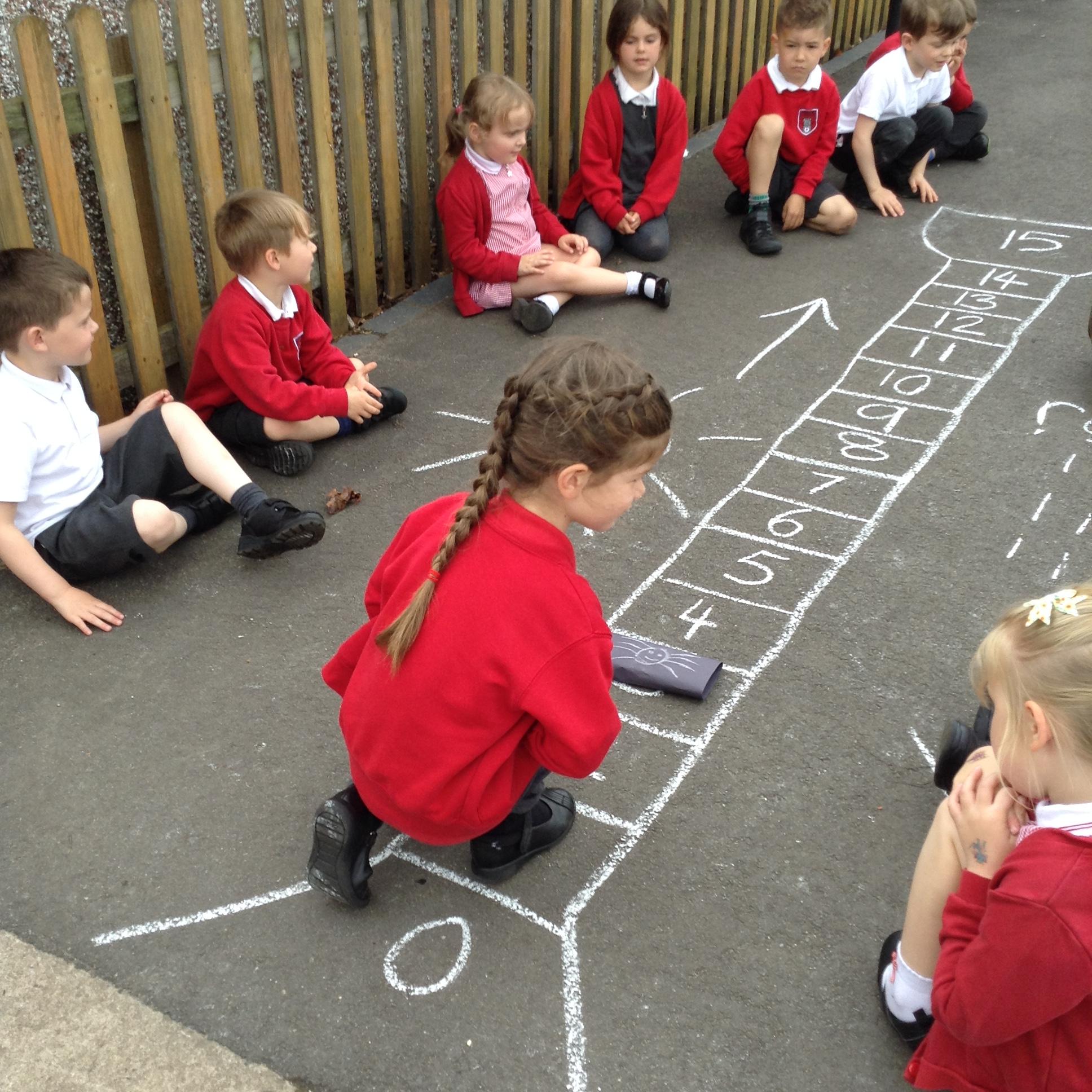 In maths we are looking at numbers bigger than 10. The children have been counting on from 10 and using the number lines on the playground for lots of fun, practical maths activities.