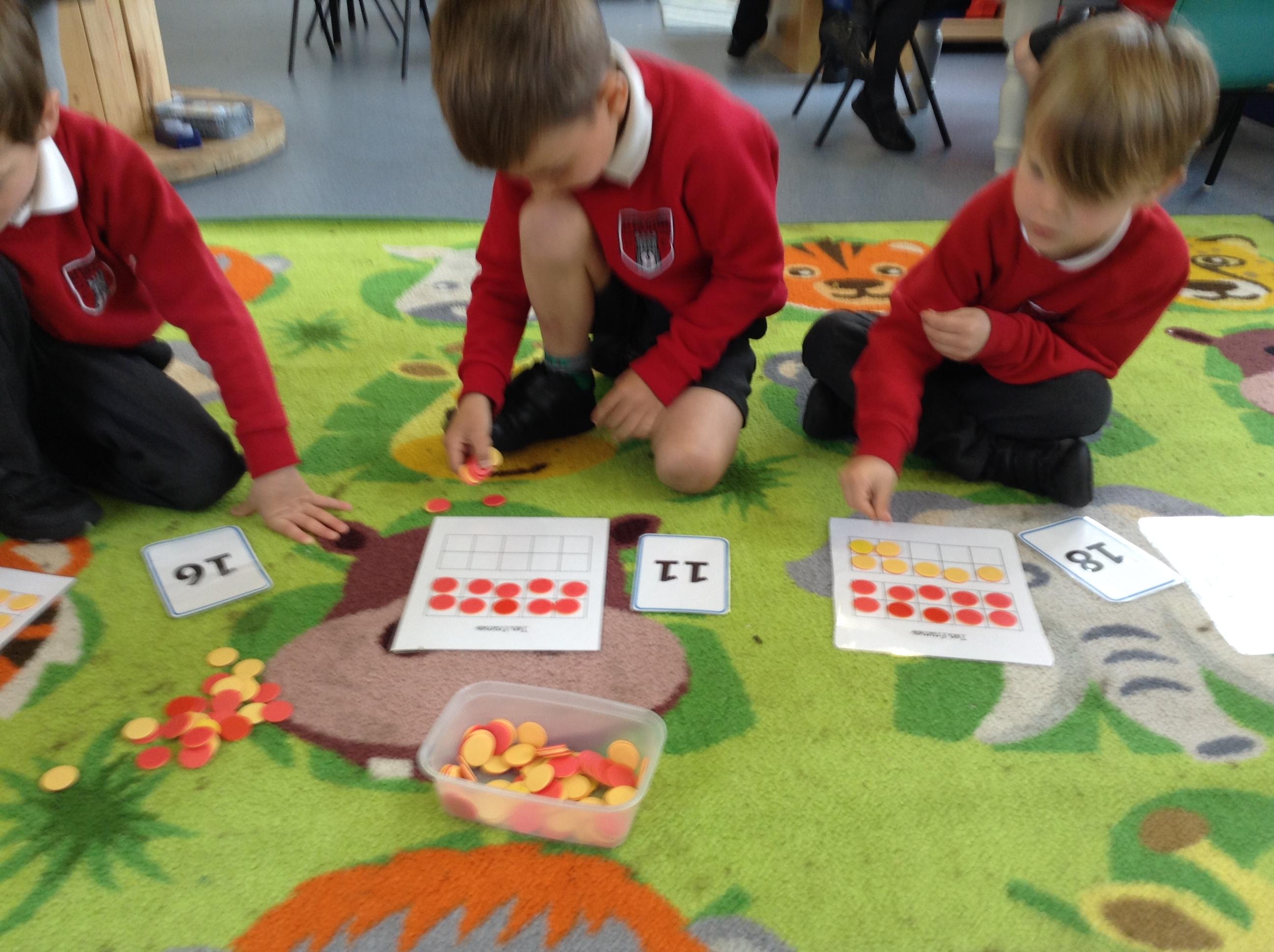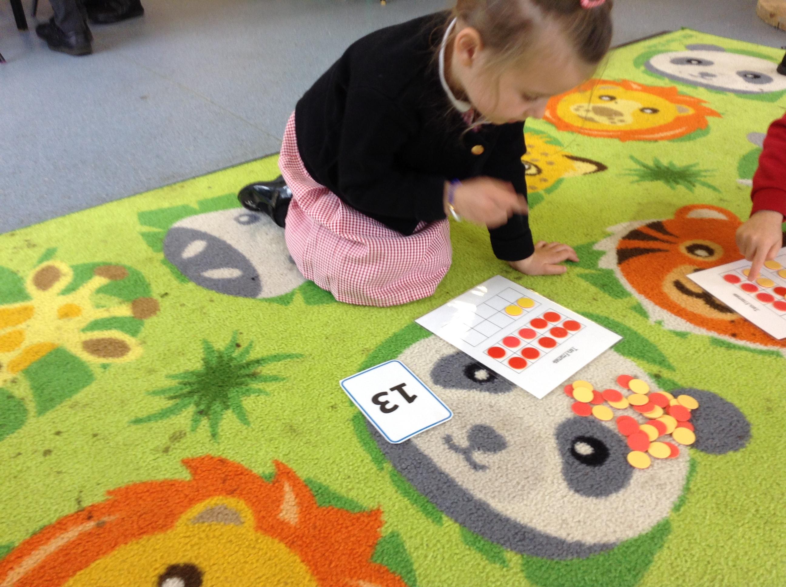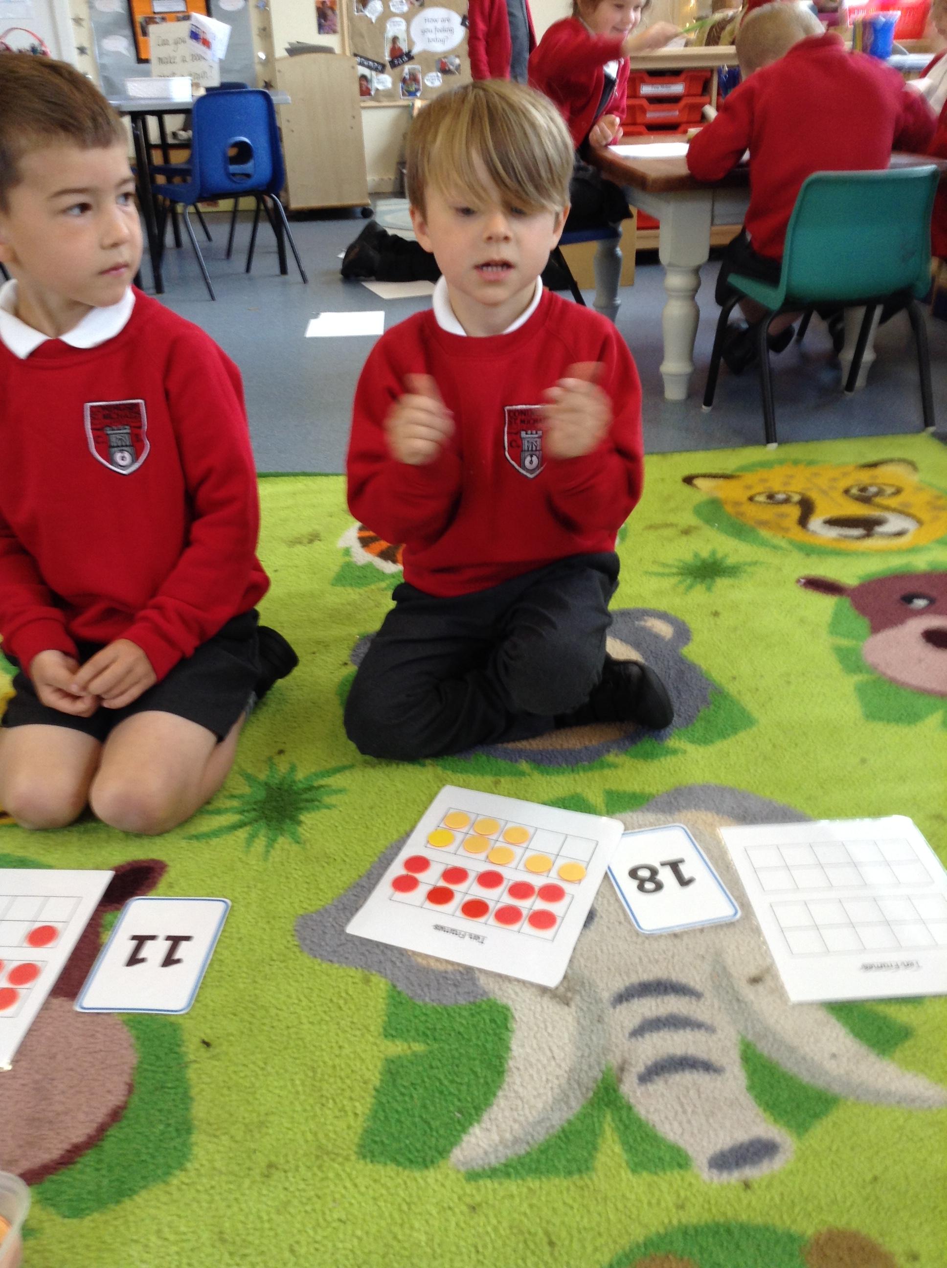 In maths we are looking at numbers form 11 - 20 and the children made their own board games this week and used larger numbers to make the track on their boards. We have been identifying numbers 11 - 20 and then counting out the corresponding number of counters on to ten frames.
