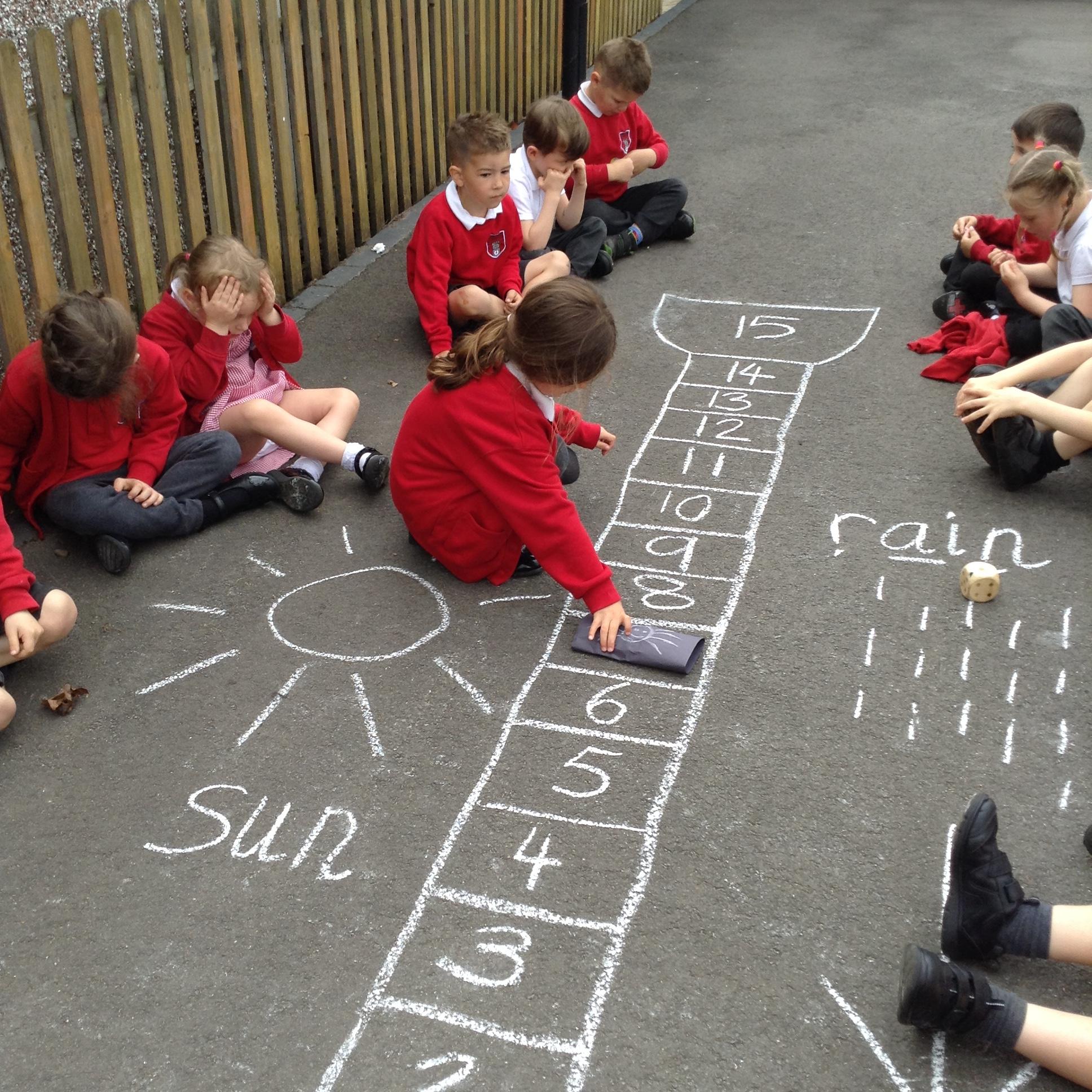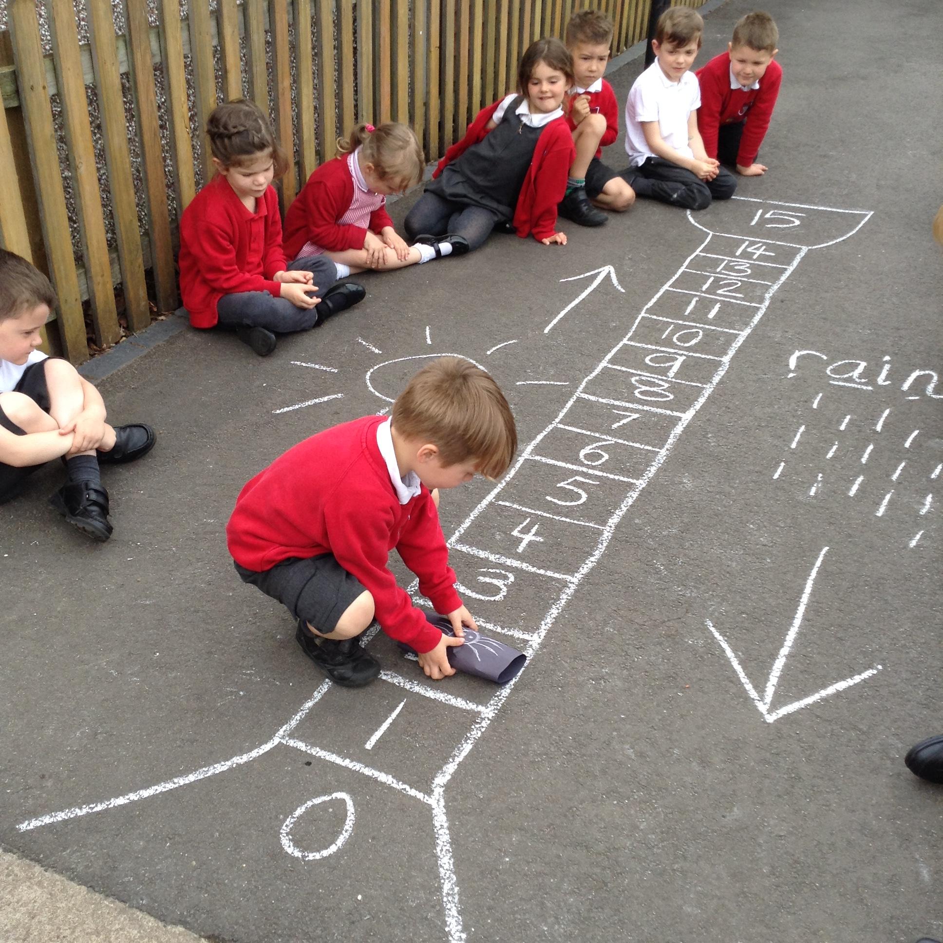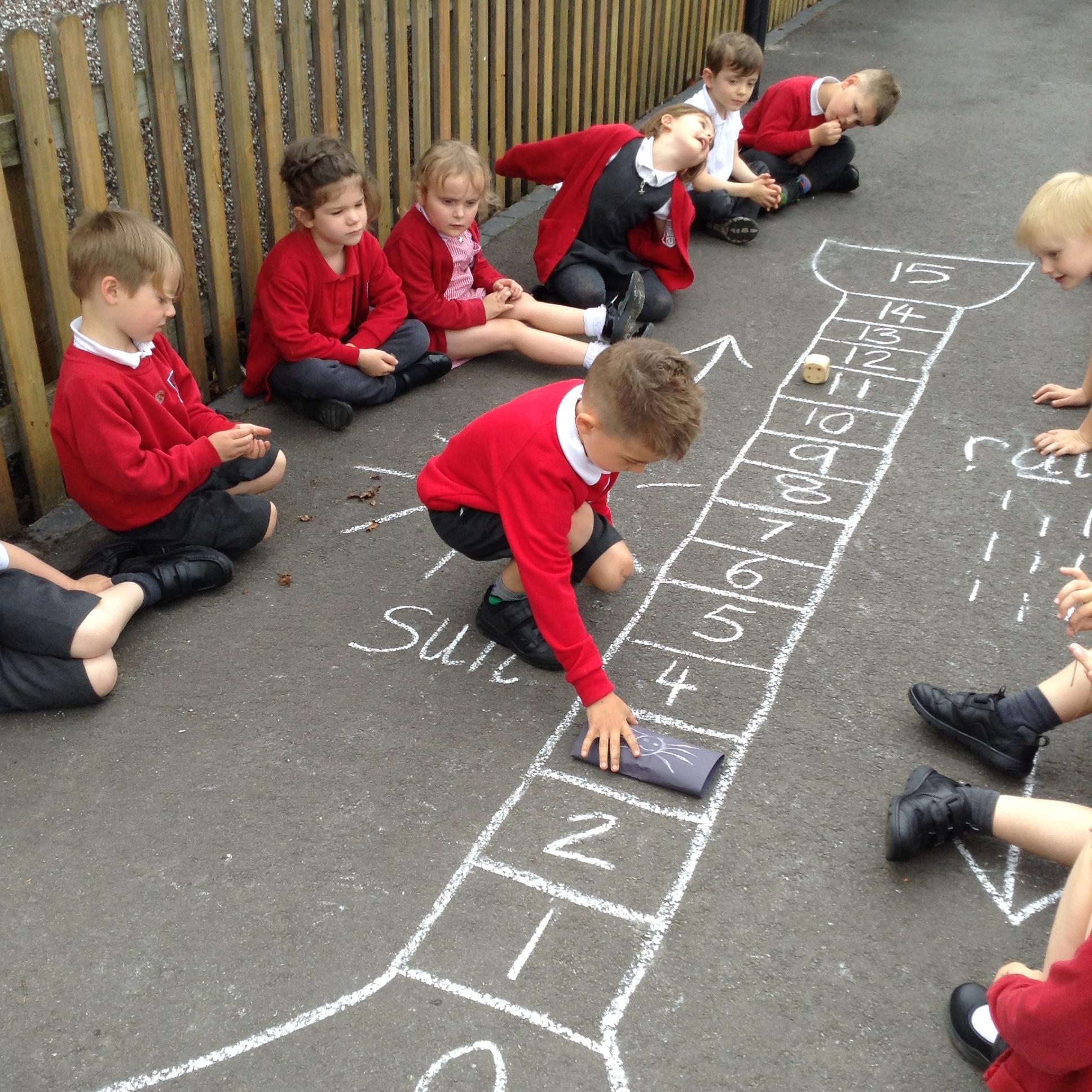 We made our own board game outside based around the rhyme Insy Winsy Spider and the children enjoyed rolling the dice and subitising the number and then moving up or down the drainpipe. The children loved the game so much we have been back to play it multiple times!