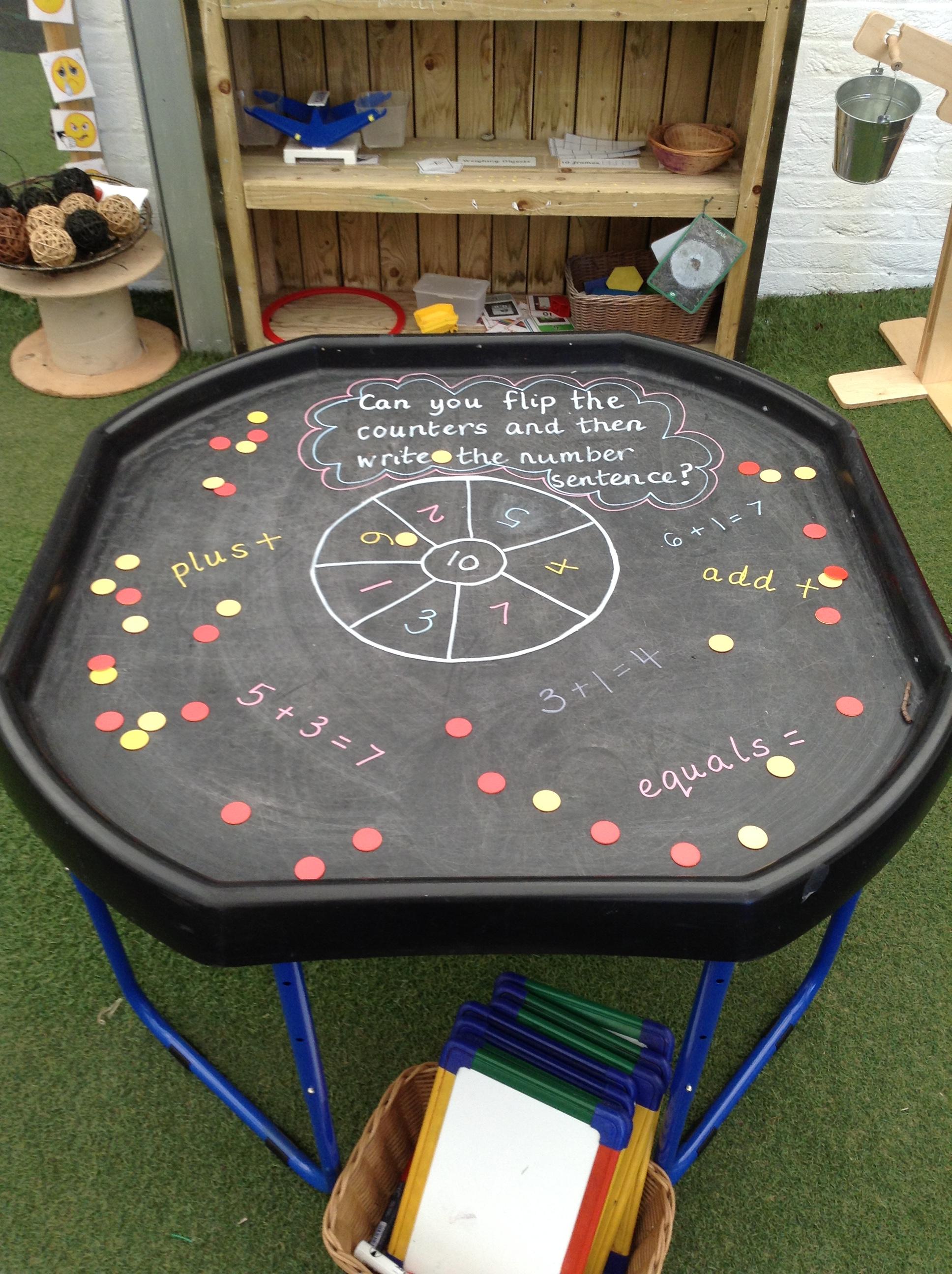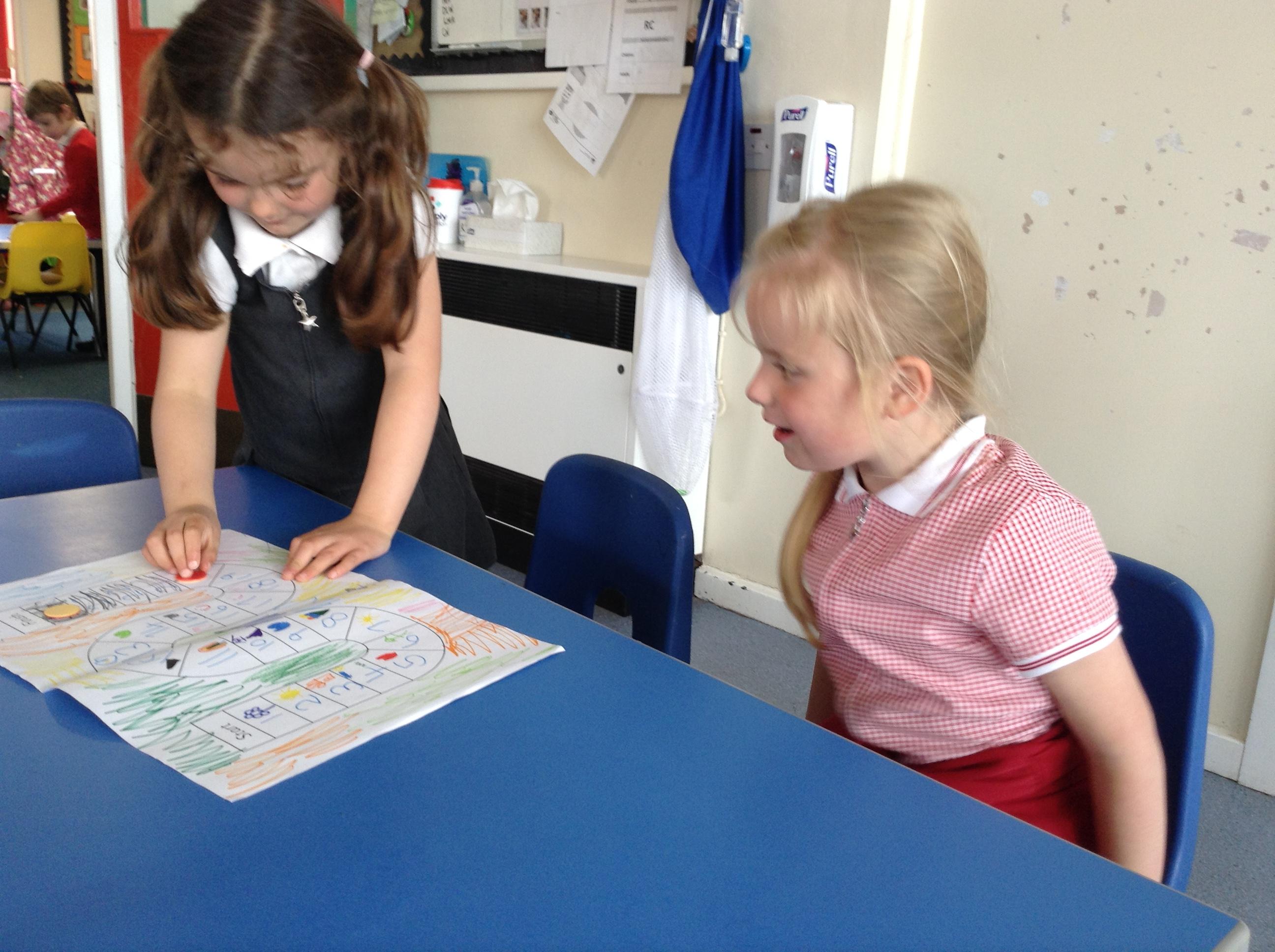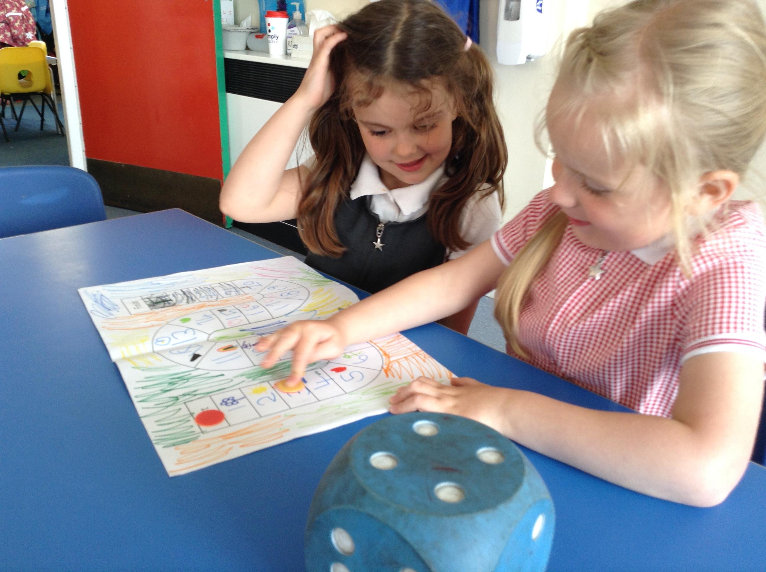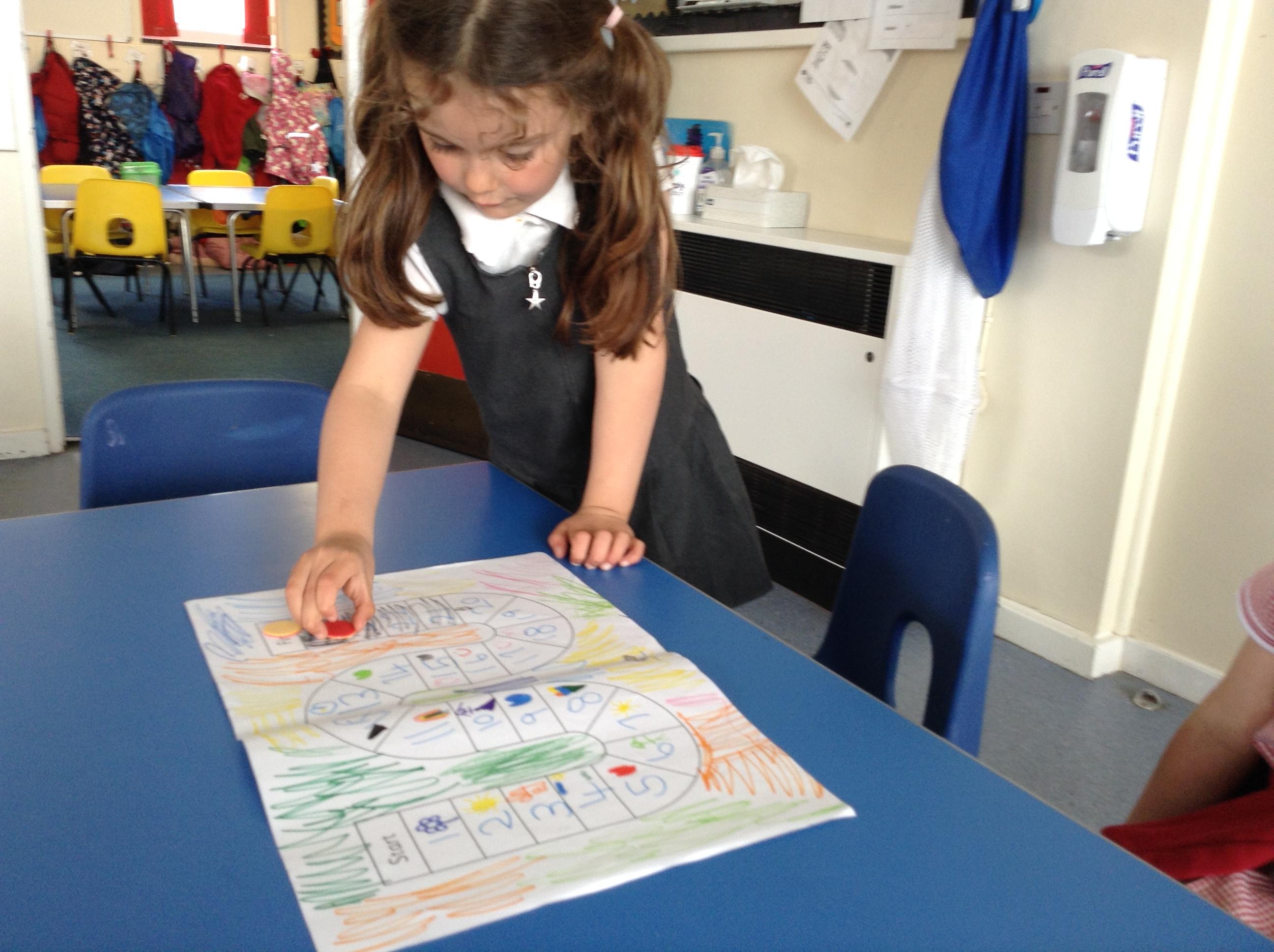 We made our own board game outside based around the rhyme Insy Winsy Spider and the children enjoyed rolling the dice and subitising the number and then moving up or down the drainpipe. The children loved the game so much we have been back to play it multiple times!