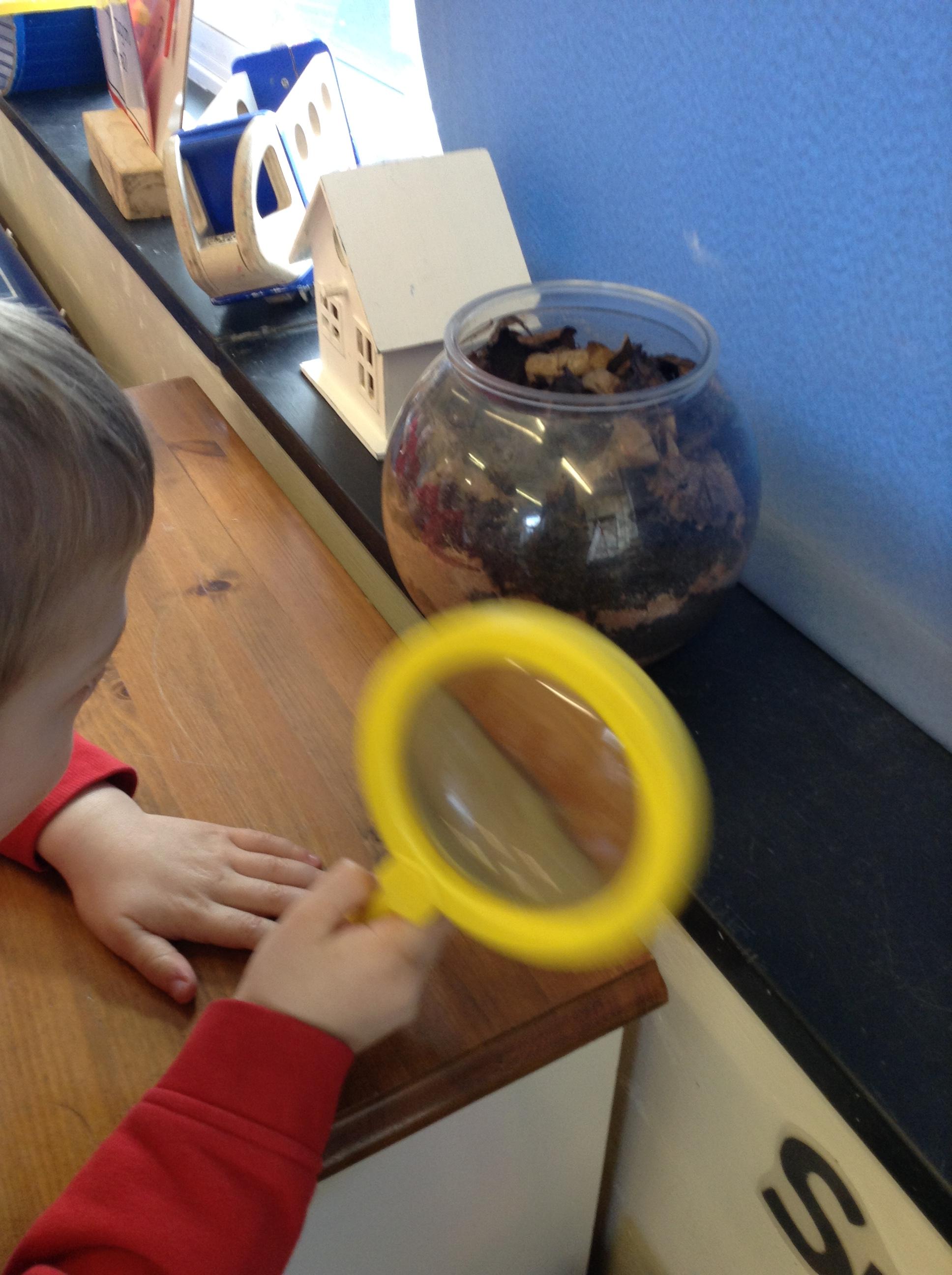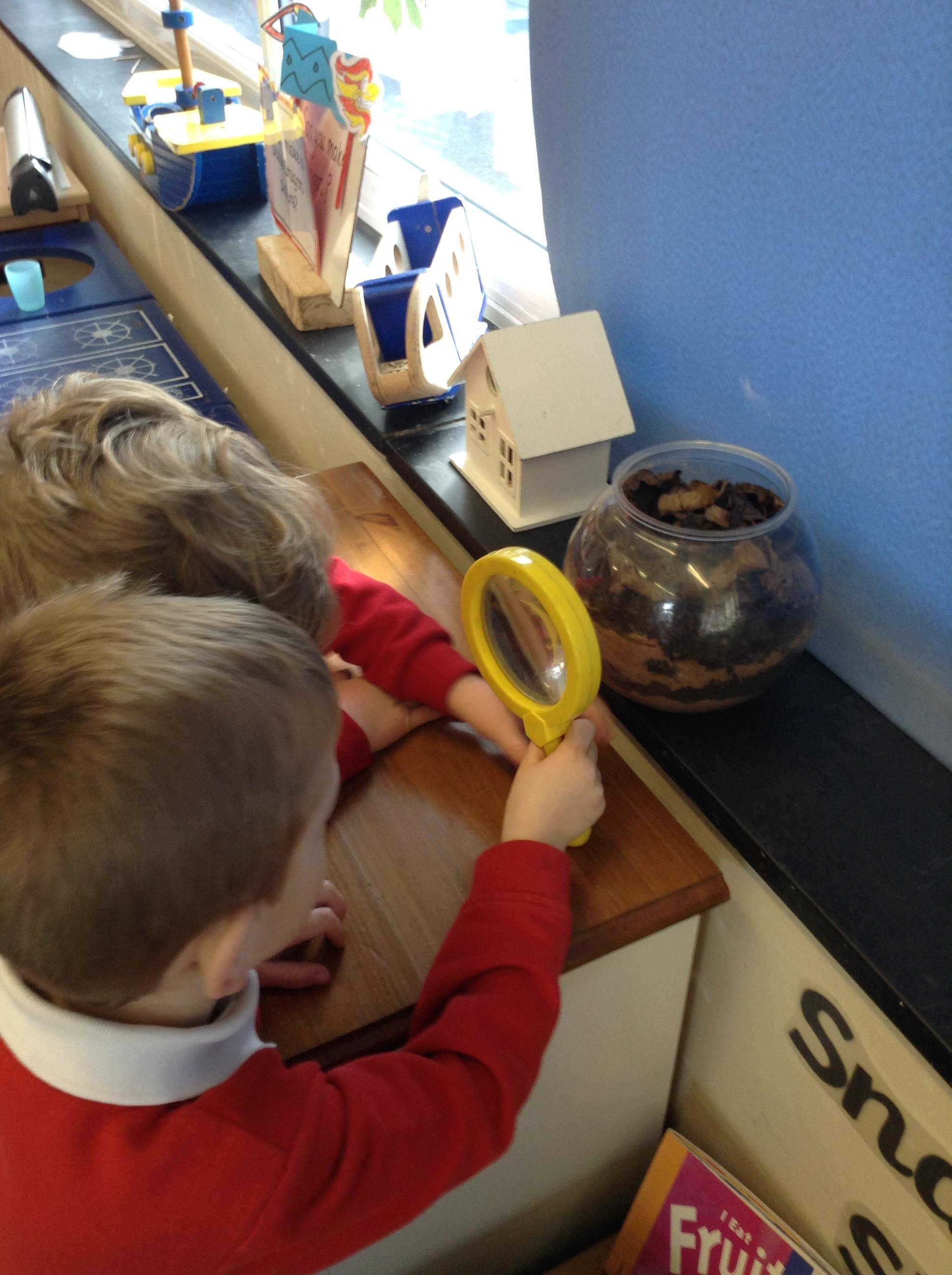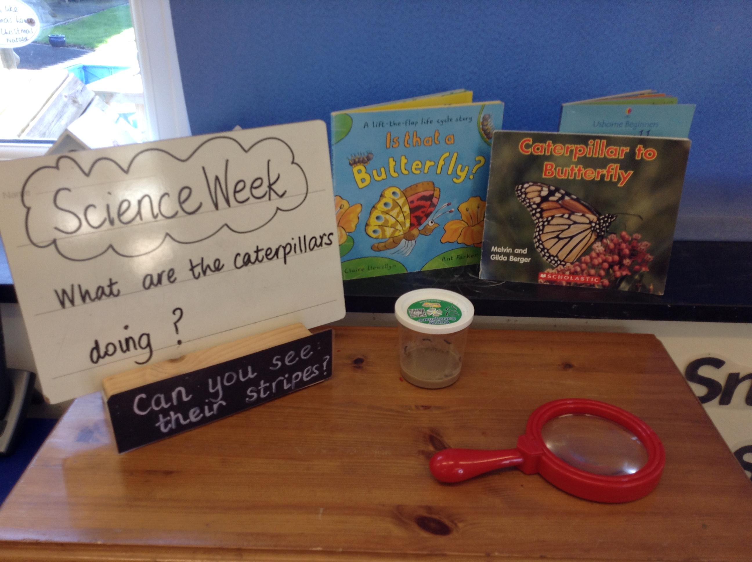 We have been doing lots of different activities related to science this week in class. The children have loved watching our caterpillars this week and looking at them through magnifying glasses.