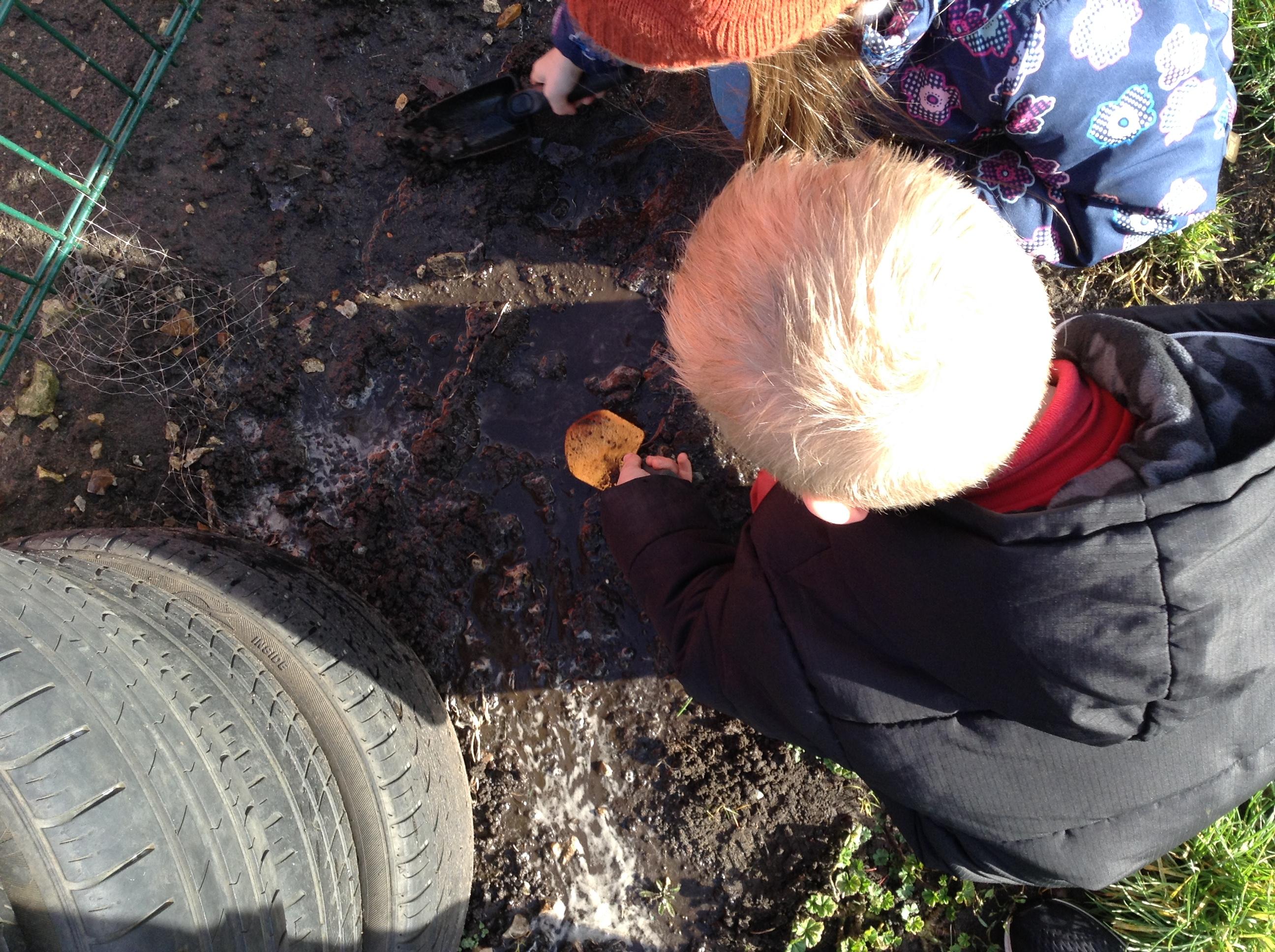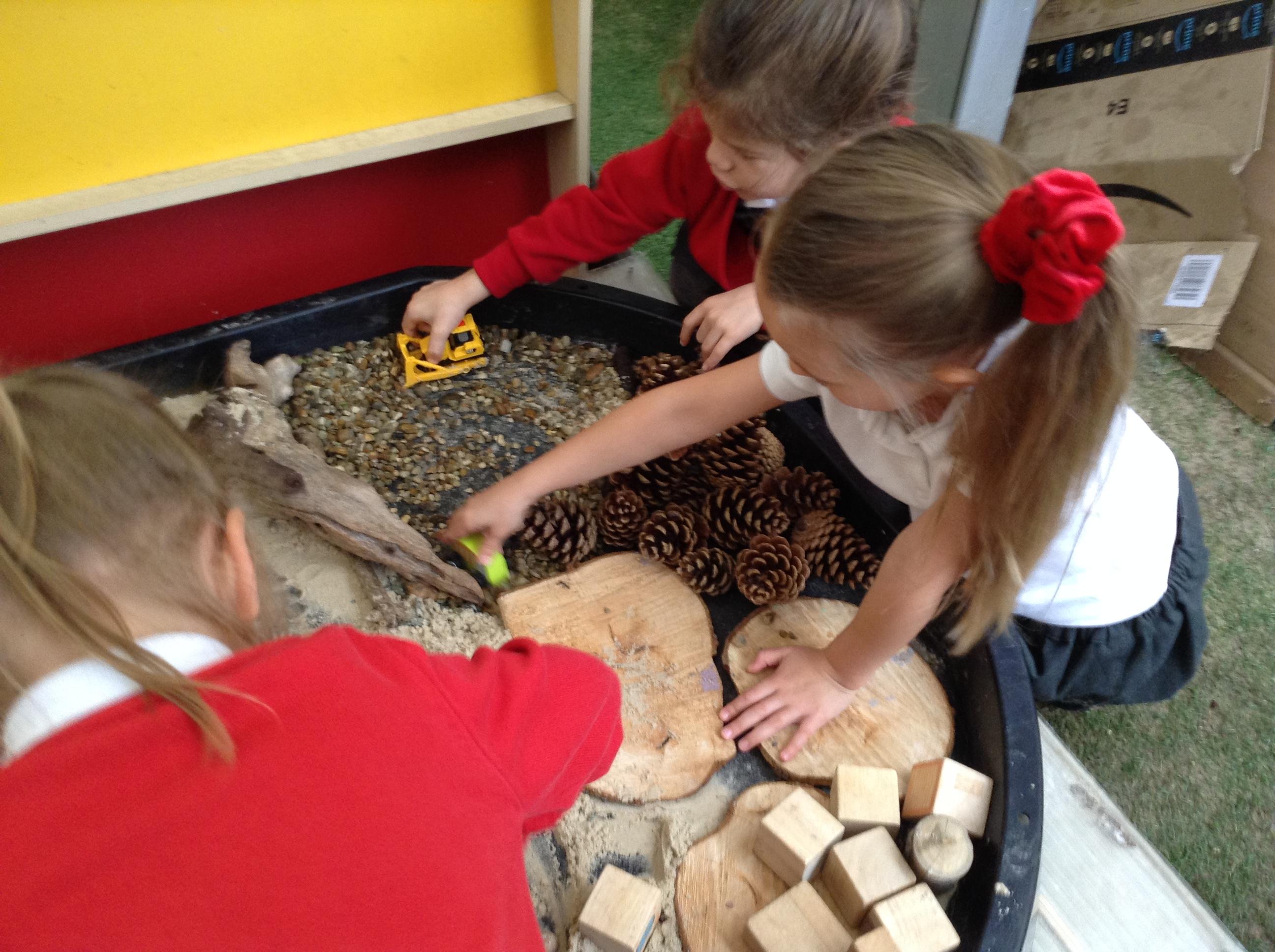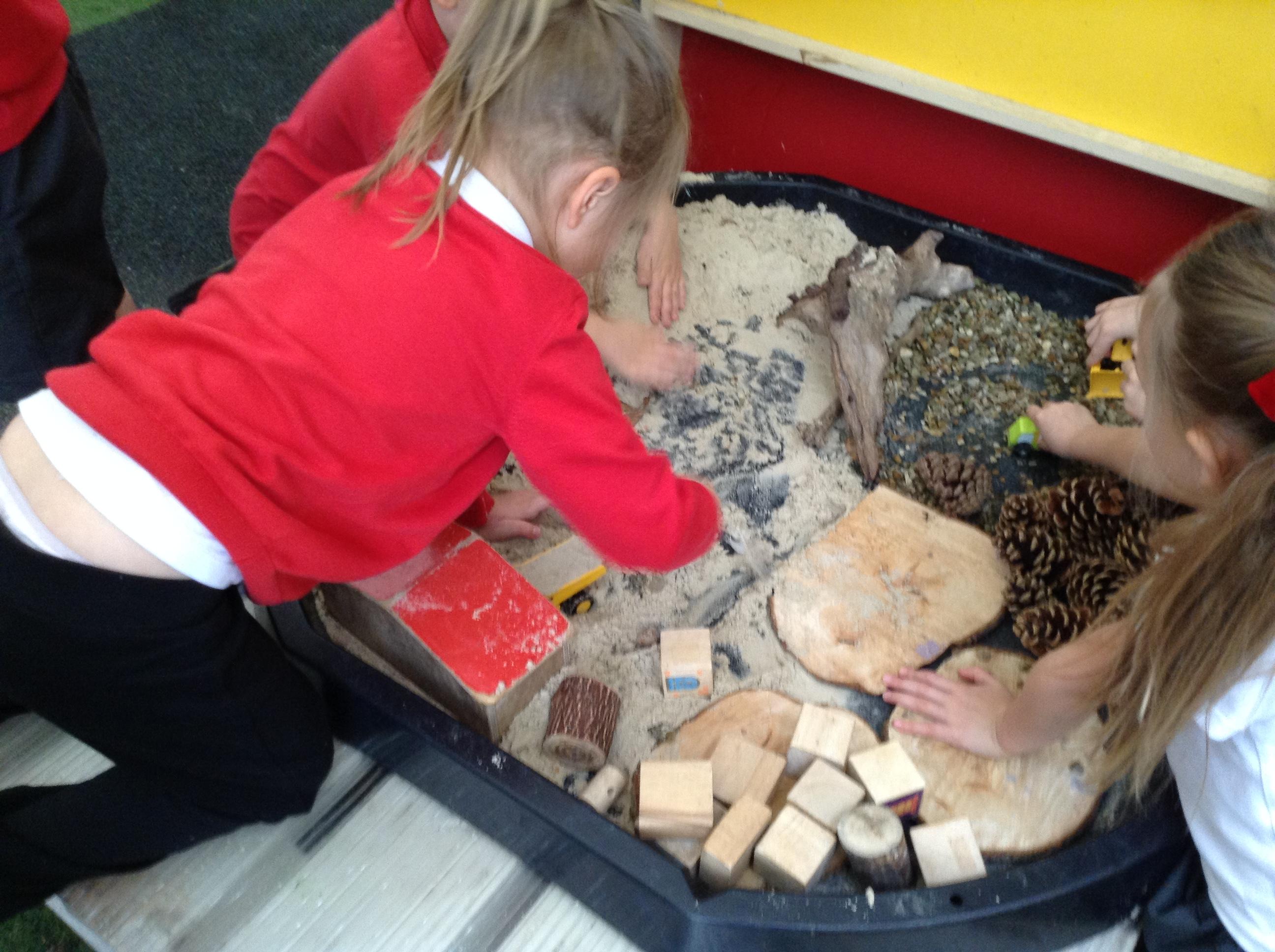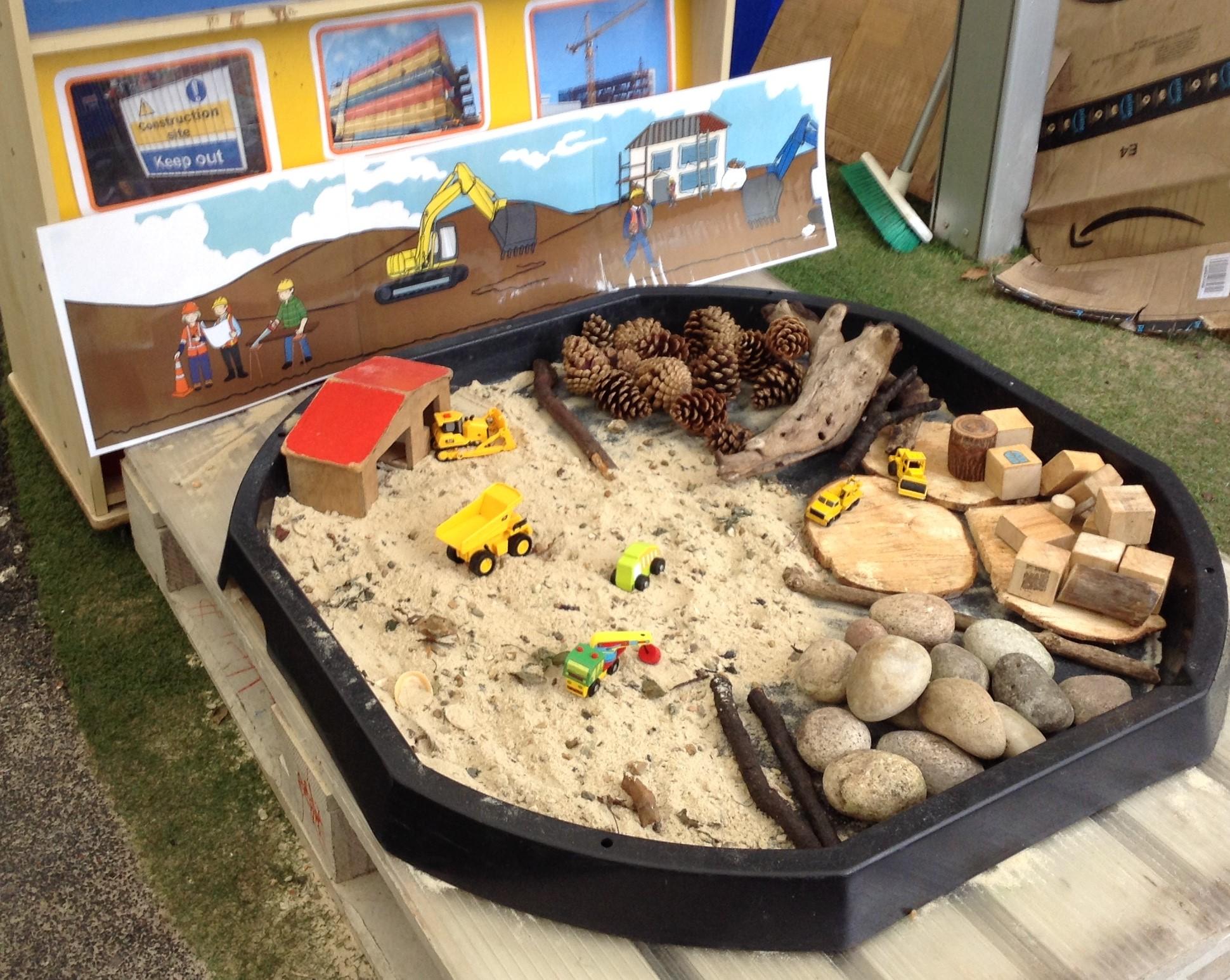 The children have been interested in construction vehicles this week so we have created a building site in our tuff spot in the courtyard.