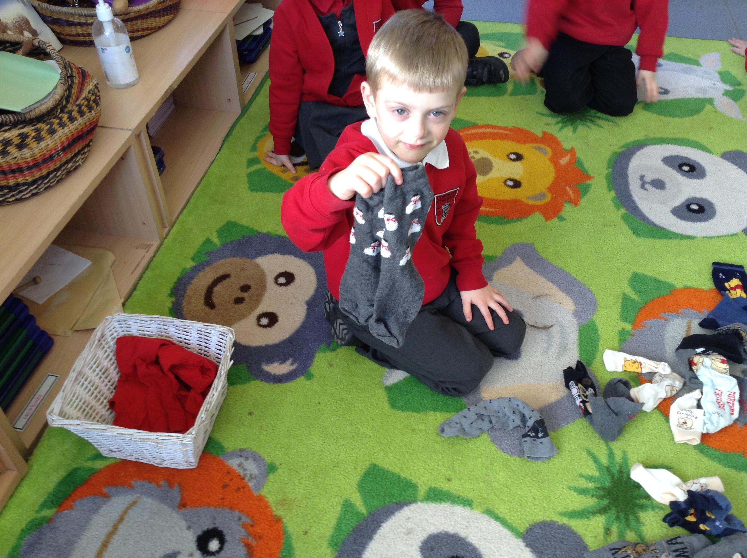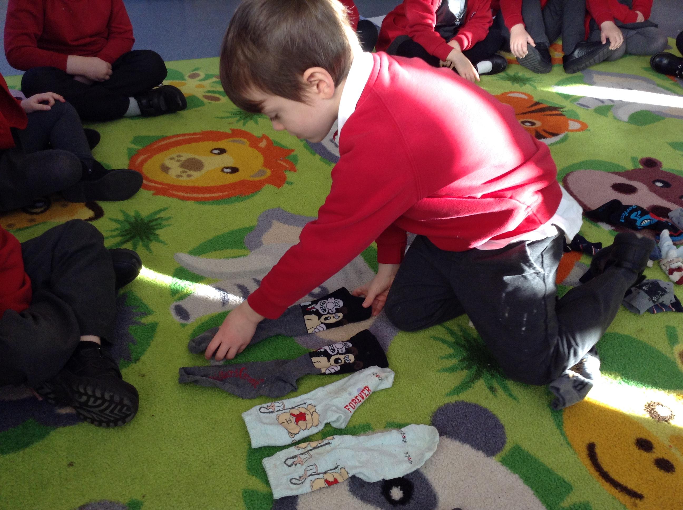 We have been talking about pairs in maths this week. The children found matching socks to make a pair of socks. We found other things that come in pairs and talked about how many were in a pair.