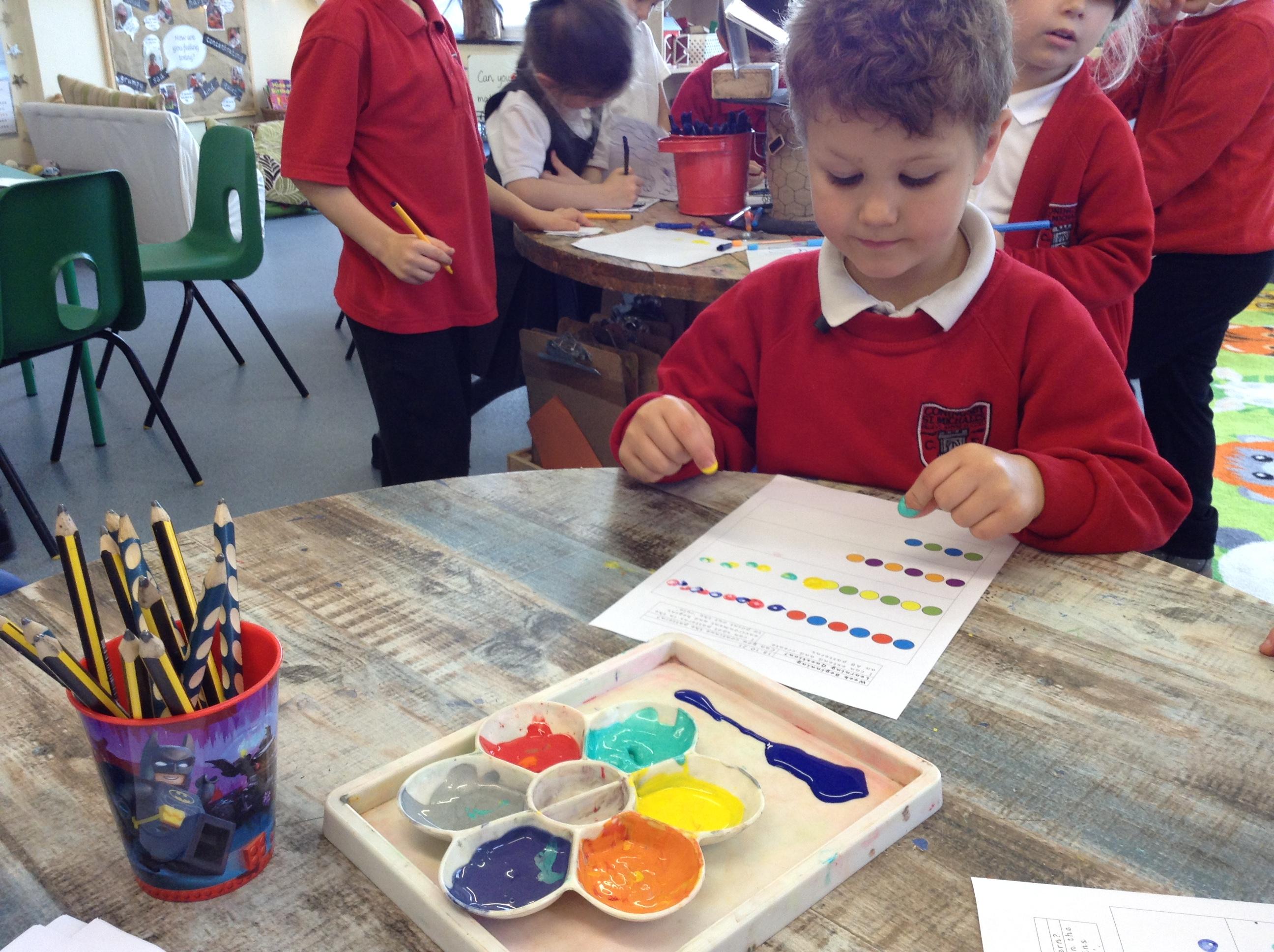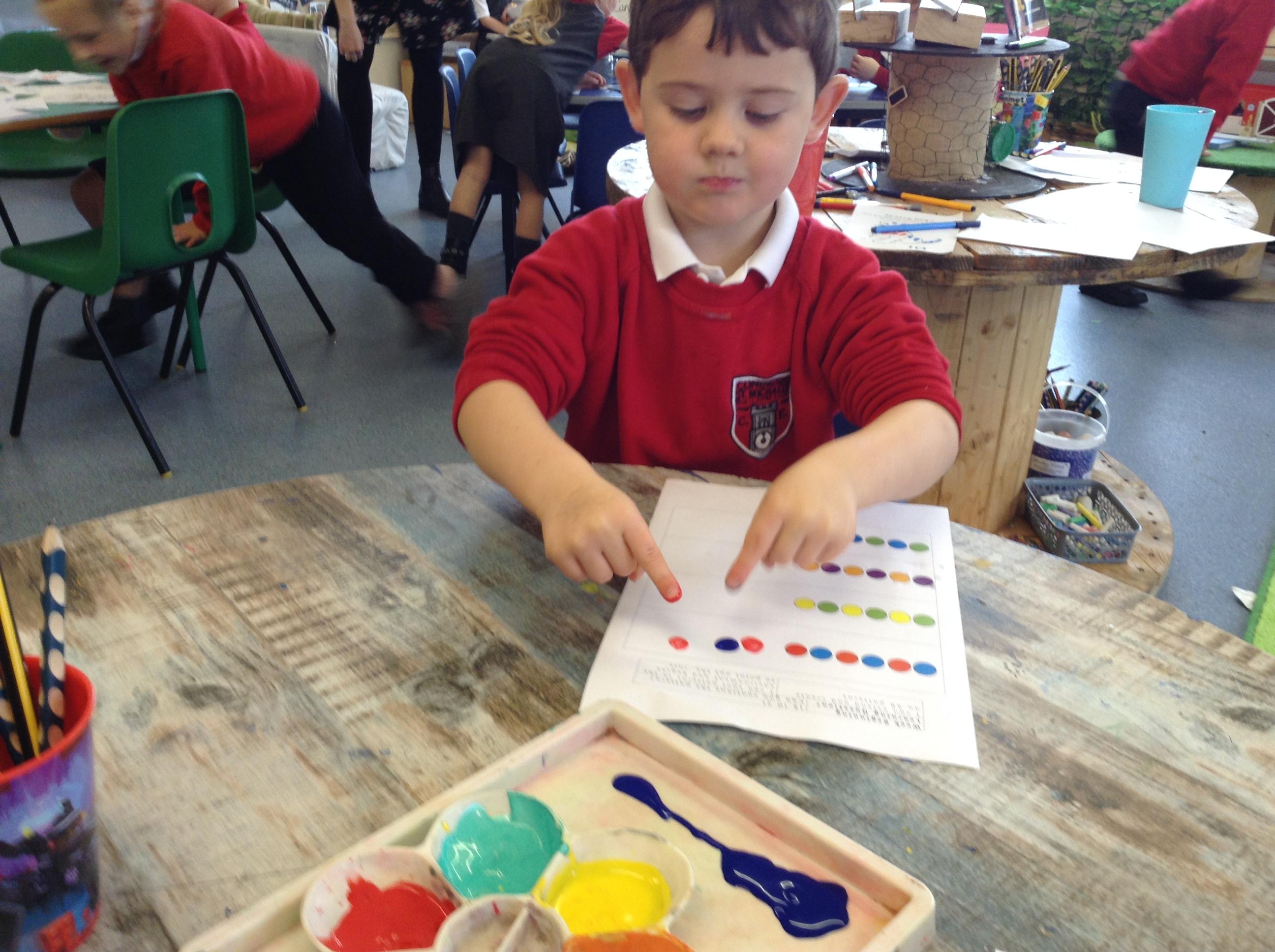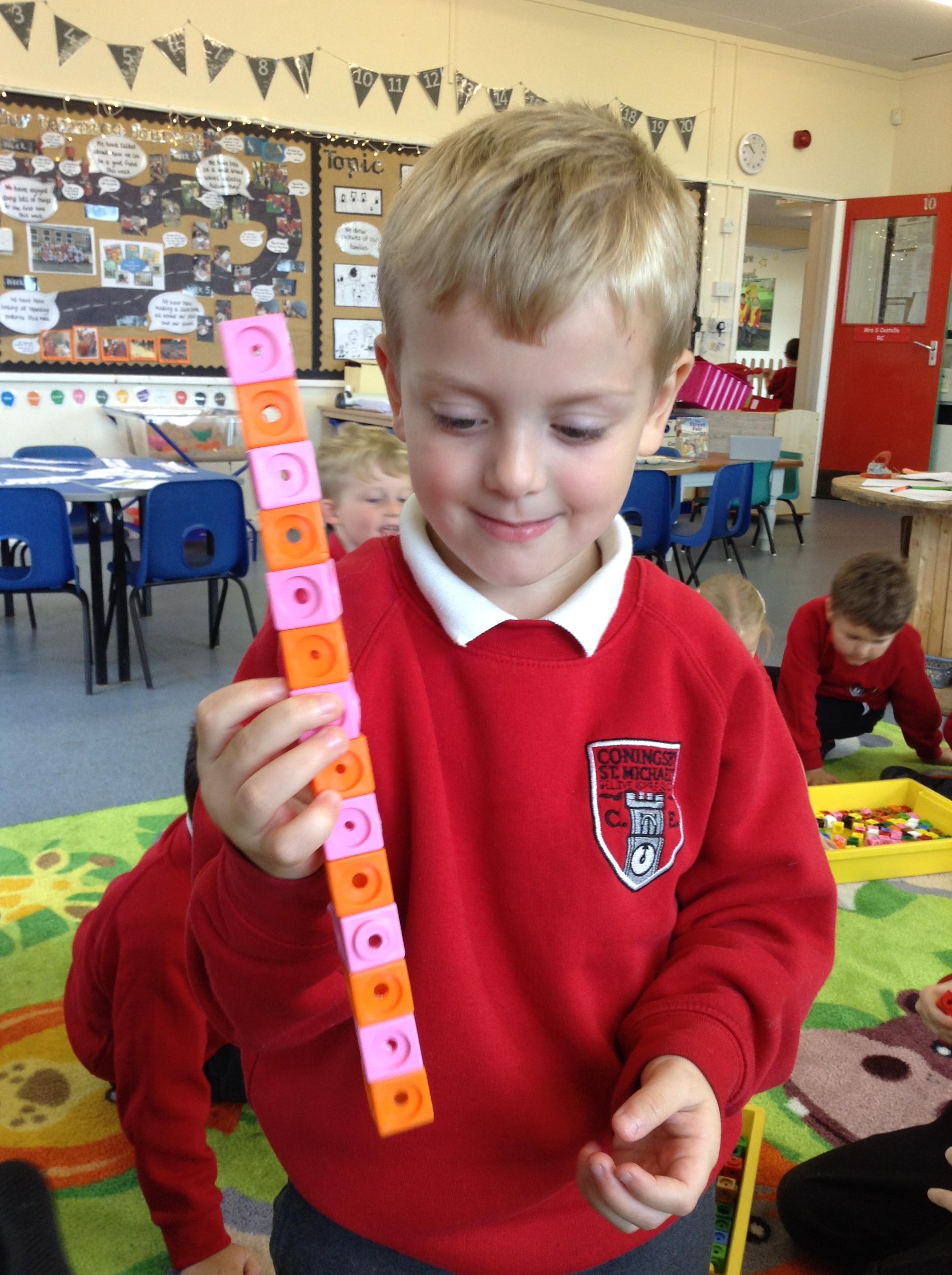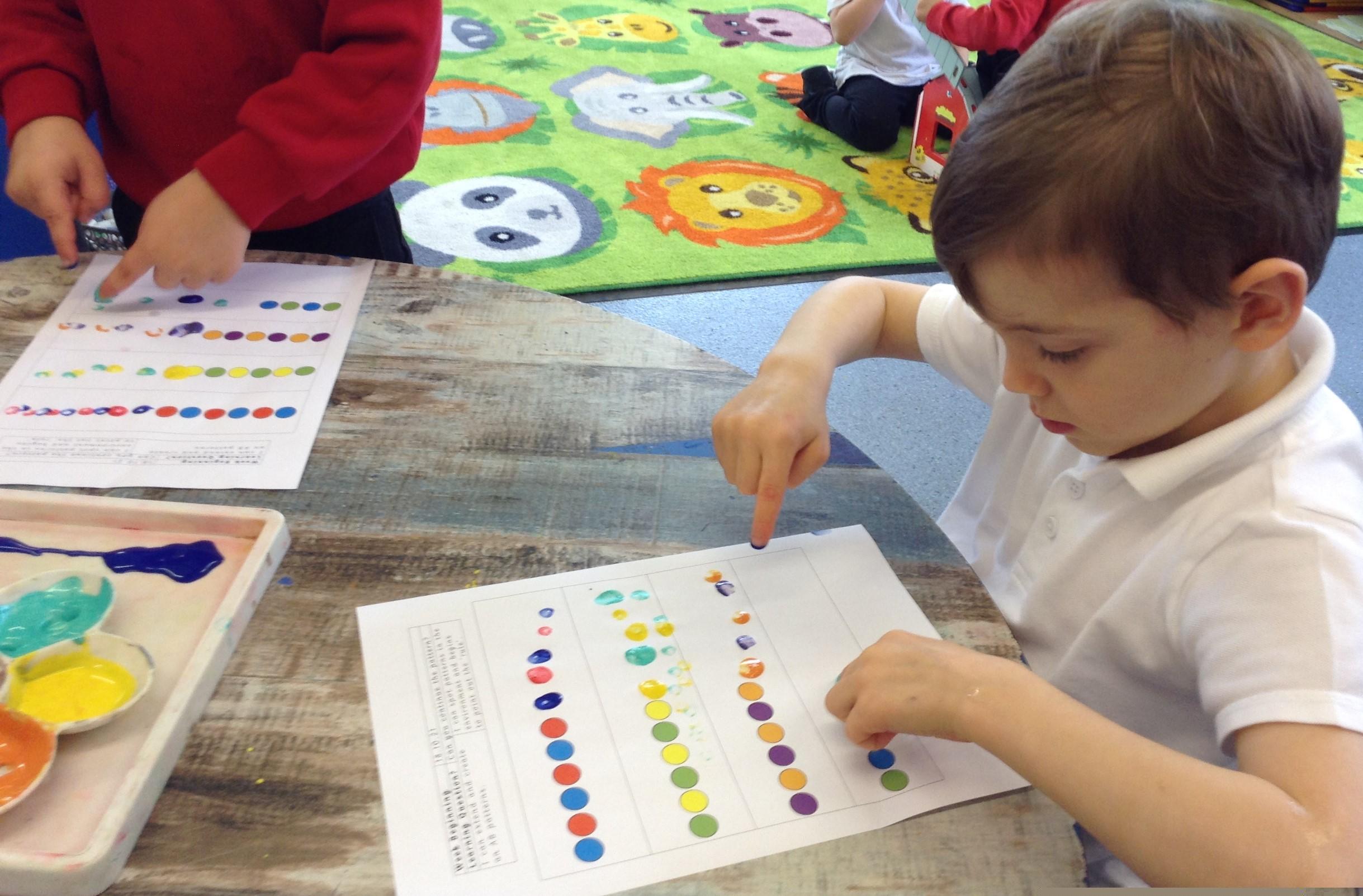 This week we have been looking at repeating patterns. The children made repeating patterns using multilink cubes and finger painting.