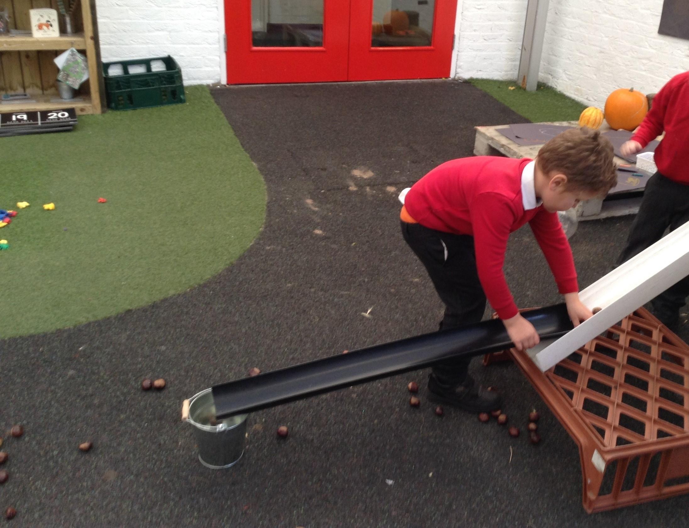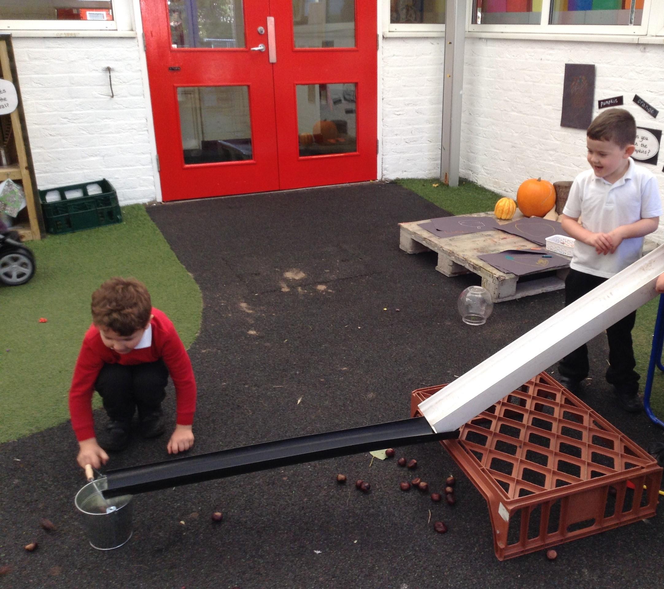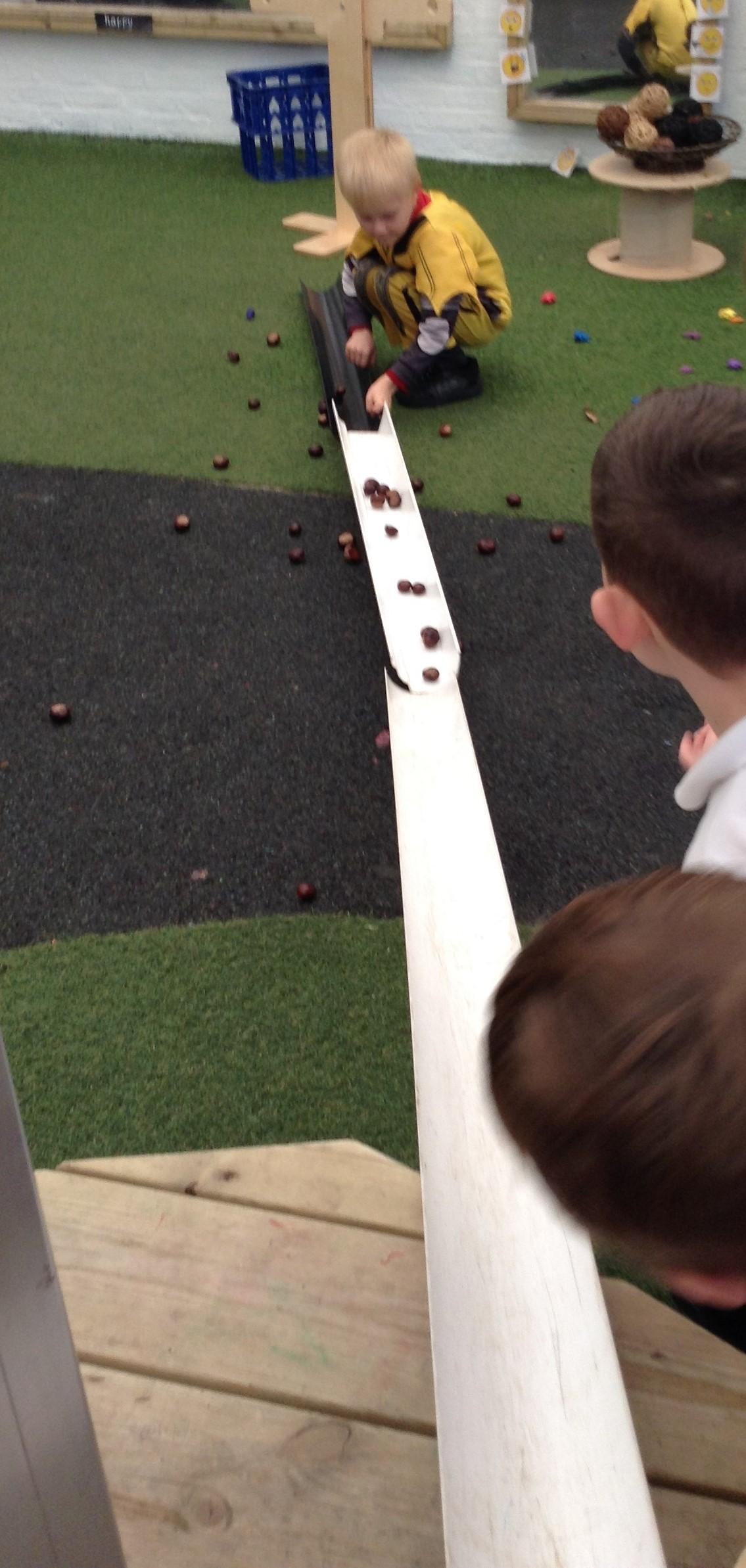 We have been investigating conker rolling in the courtyard using guttering. The children were problem solving joining together guttering and looking at how the gradient had an impact on how far the conkers rolled. It was great fun!