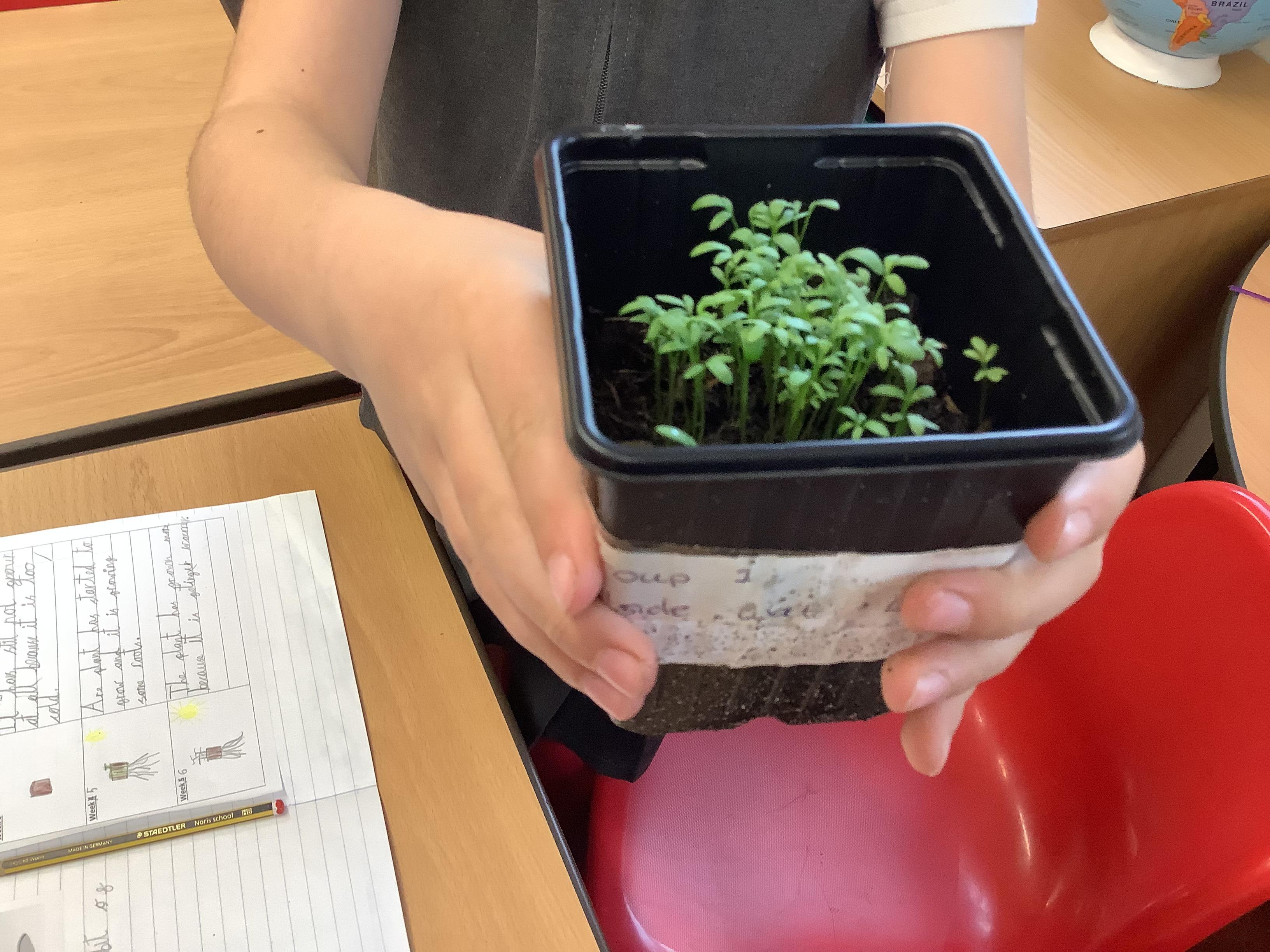 Children have been making observations of their investigations to see what has happened after 2 weeks. All the seeds that have been indoors have germinated and started to grow into plants, even in the dark and without water. However the seeds outside haven't germinated yet. Children have also planed radishes and are observing them grow.