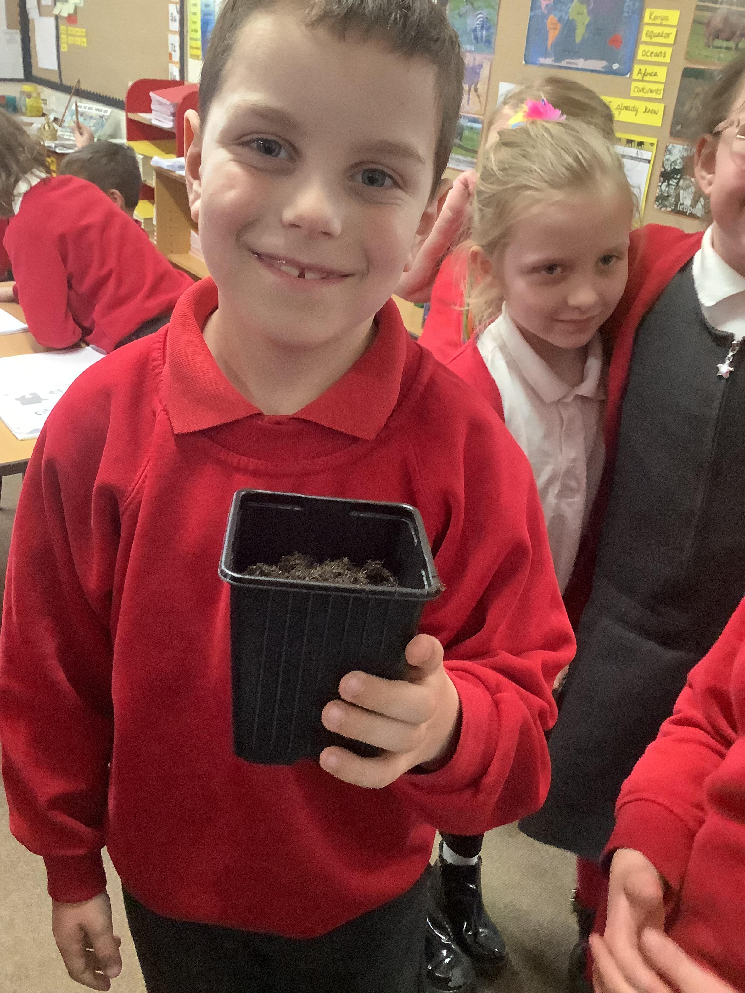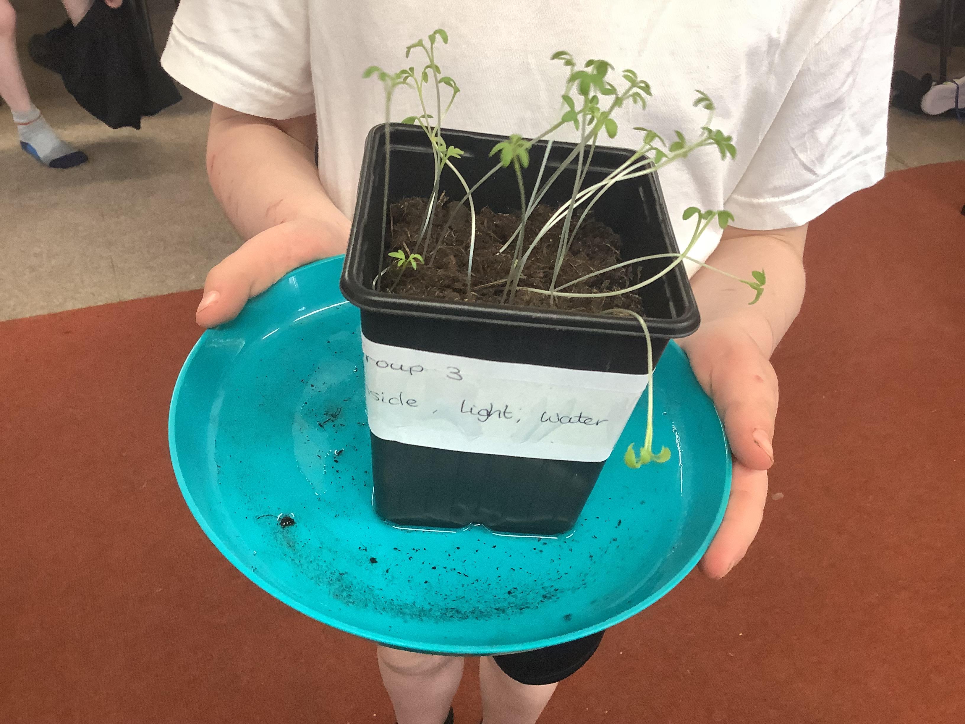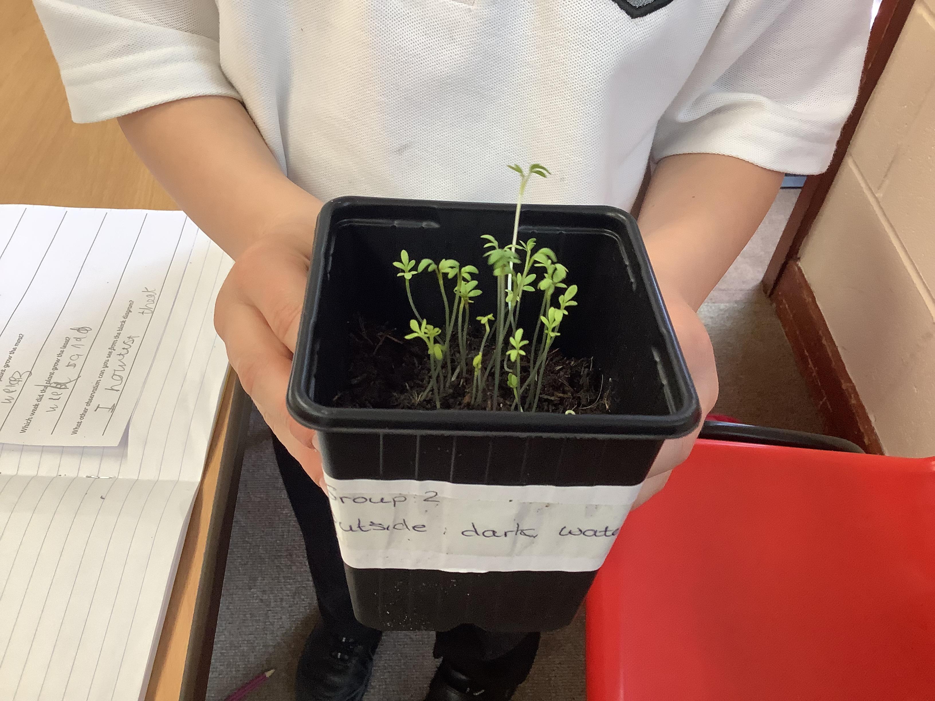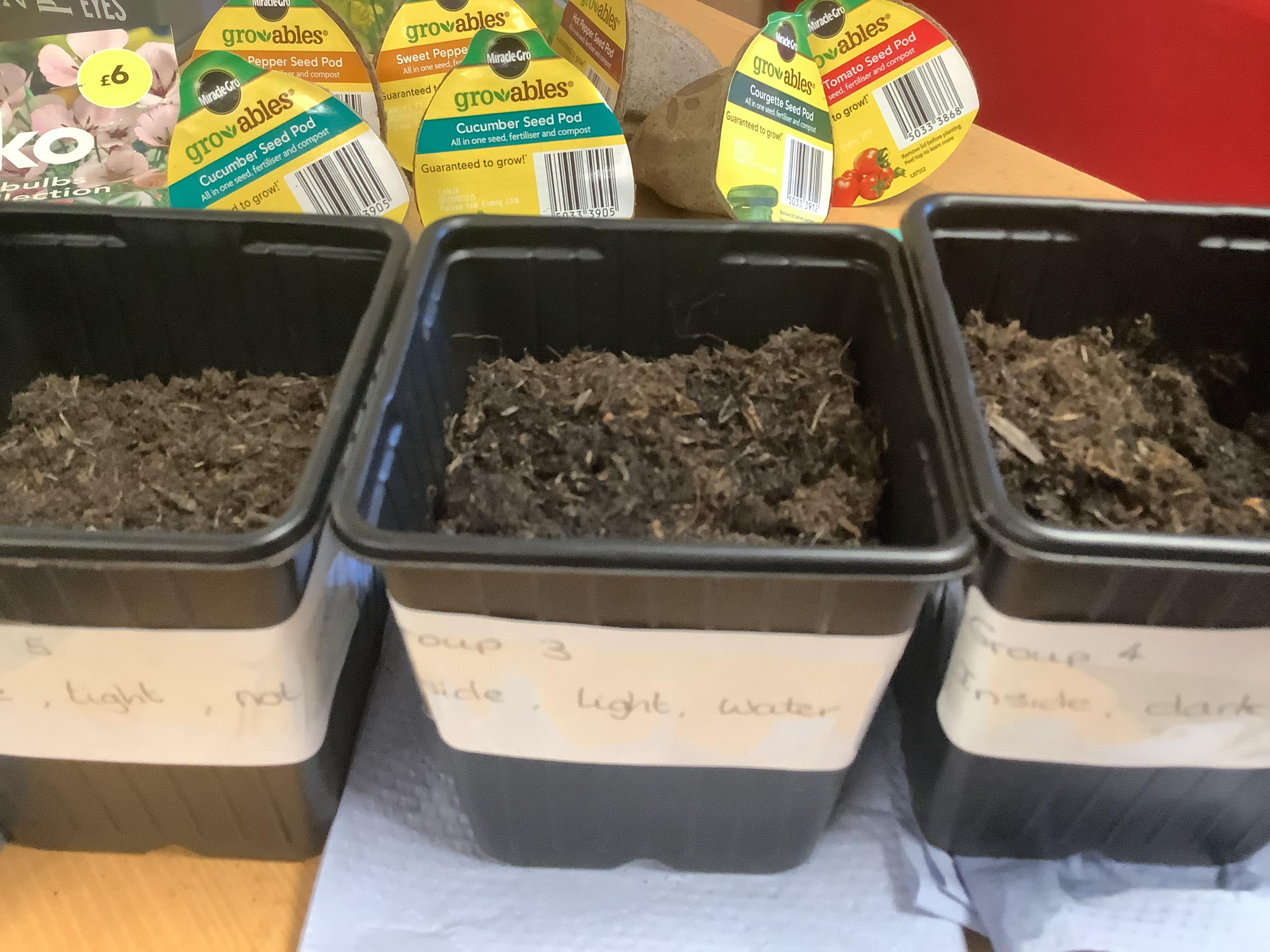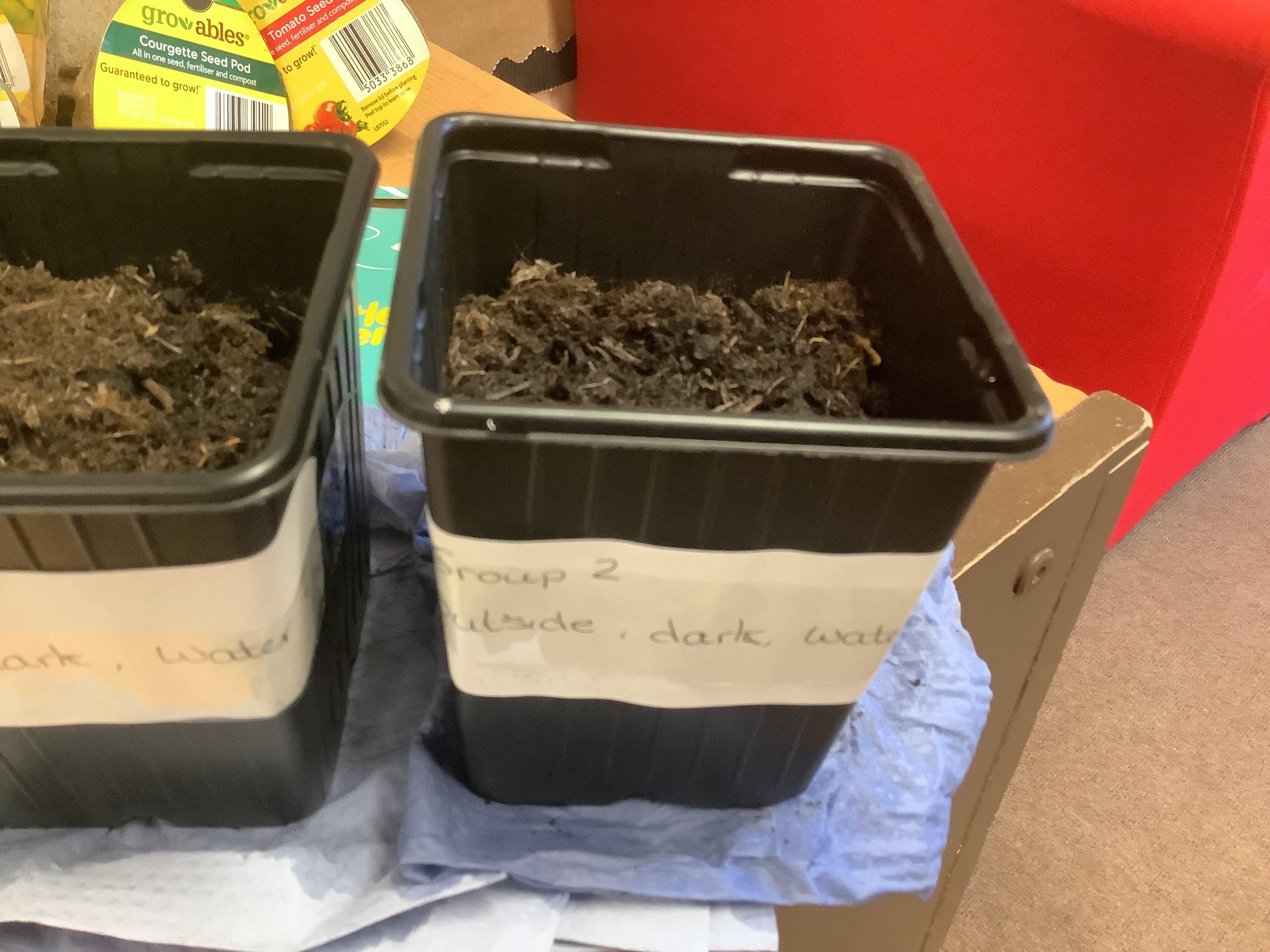 Children have started their learning of plants by looking at different bulbs and seeds. They were planting seeds so to investigate what seeds need to grow into plants they have placed their seeds in pots in different places, some are outside in the light, some are outside in the dark, in the cupboard but being watered and in the windowsills, one with water and one without. They will be observing them each week to see what happens.