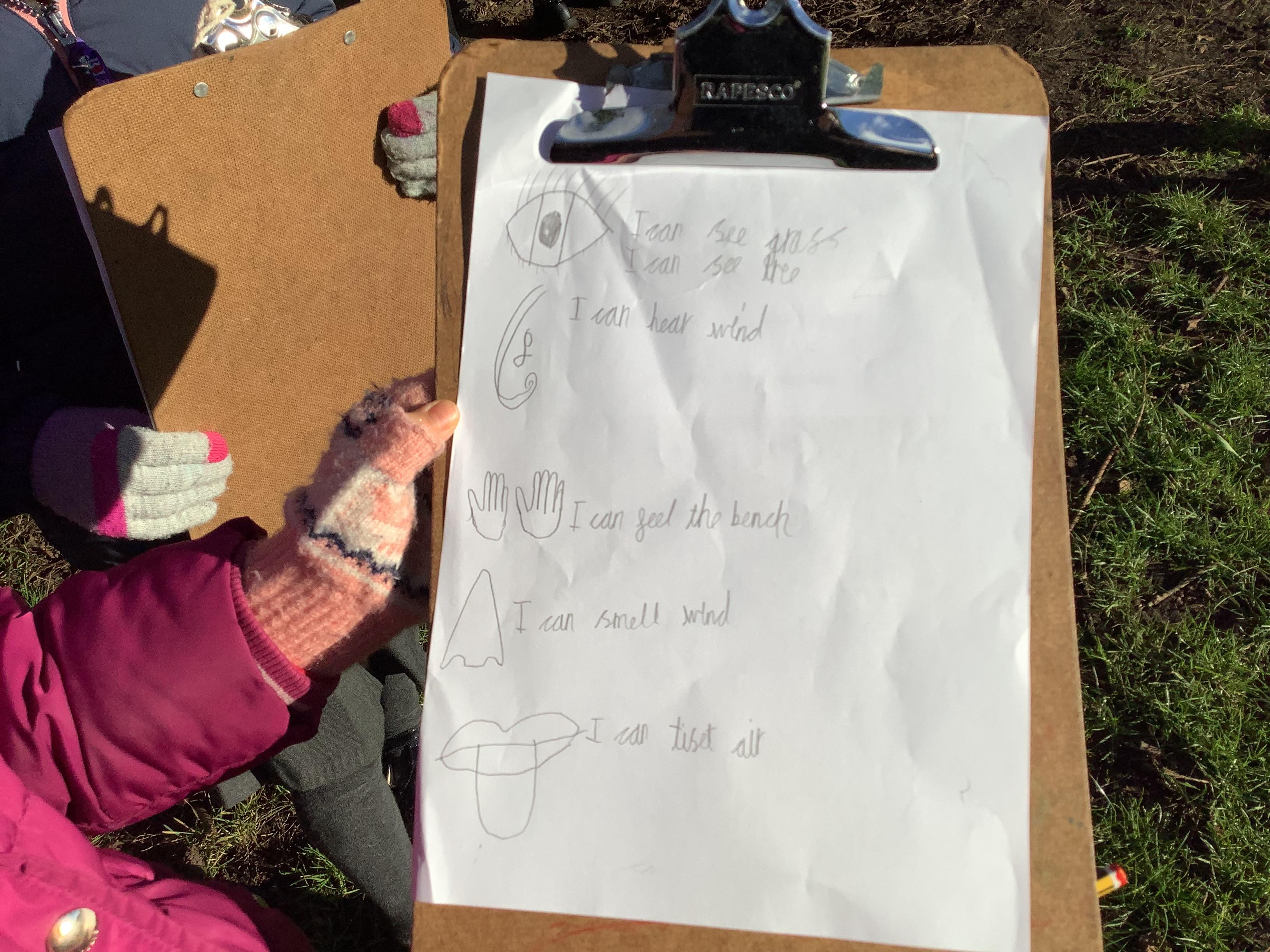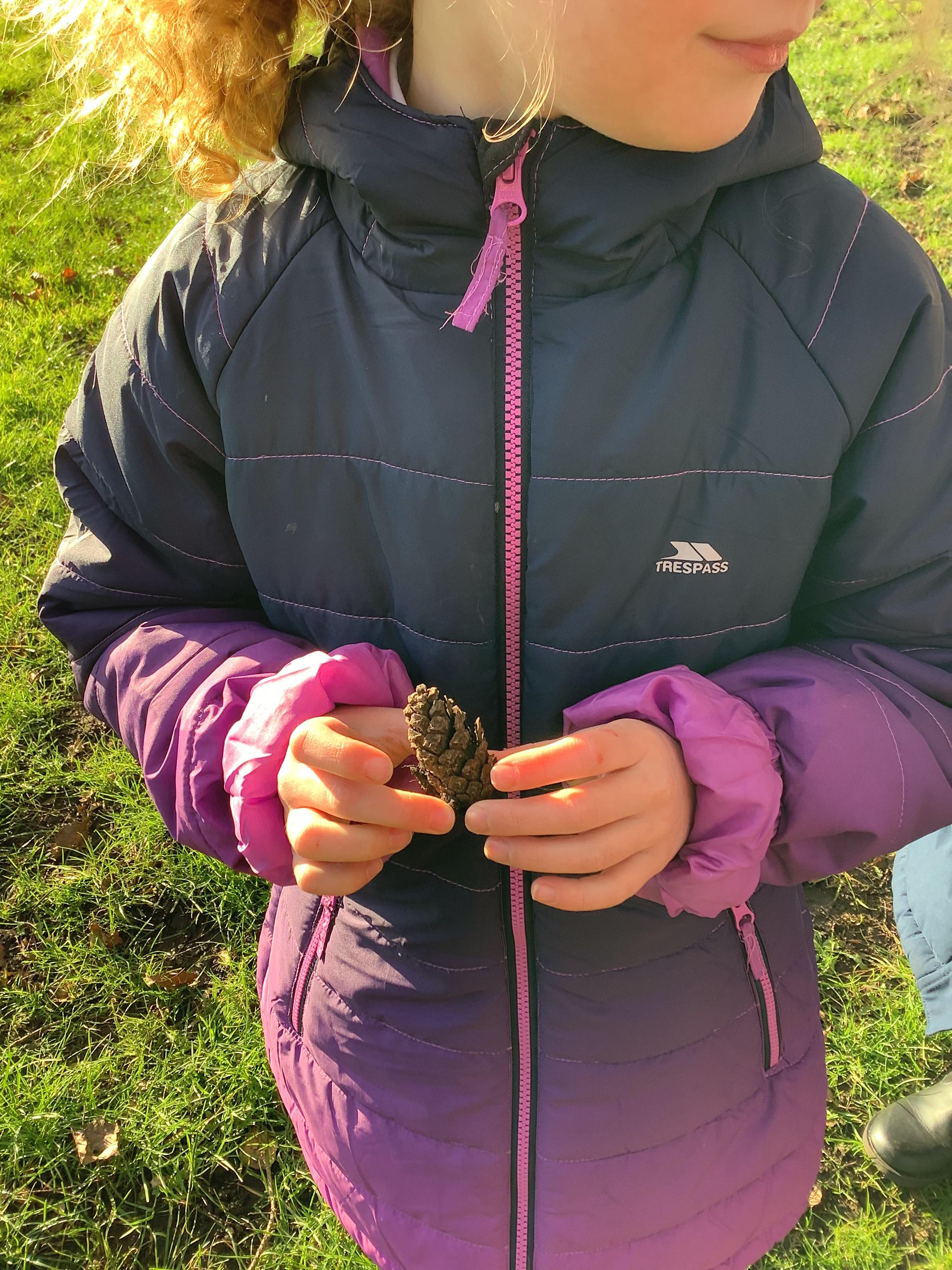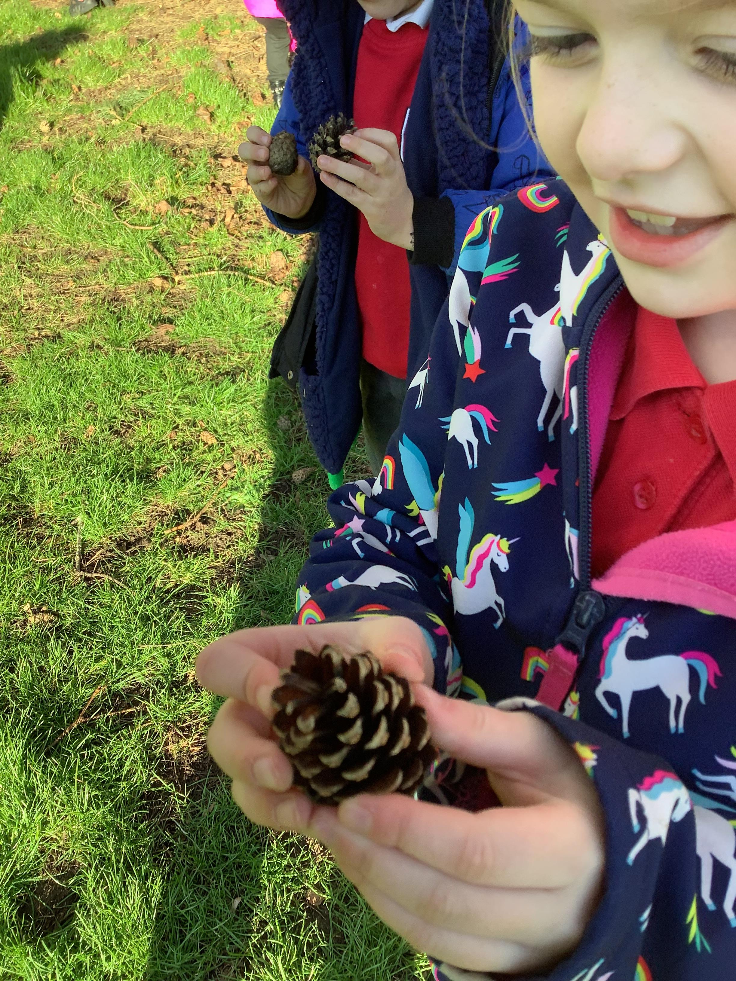 Today children went on a senses walk outside. They closed their eyes so they could hear more clearly and used their touch to feel leaves and pine cones.