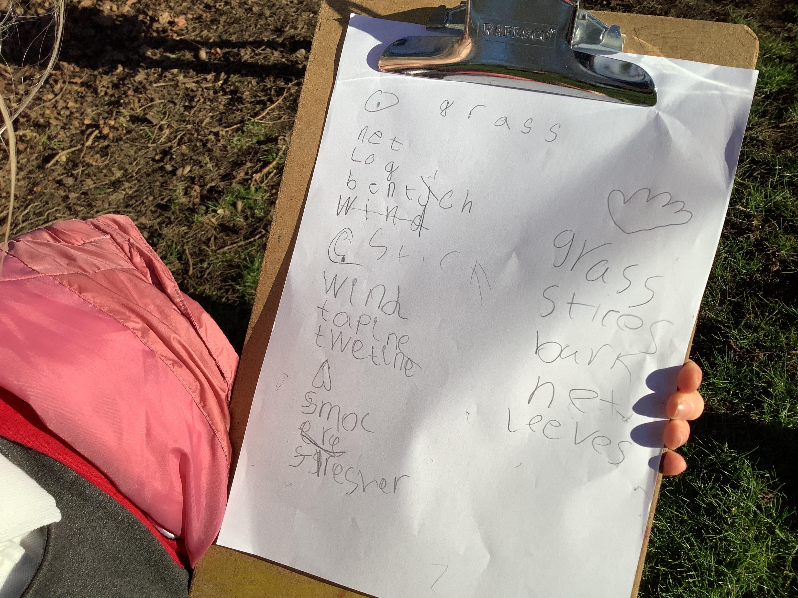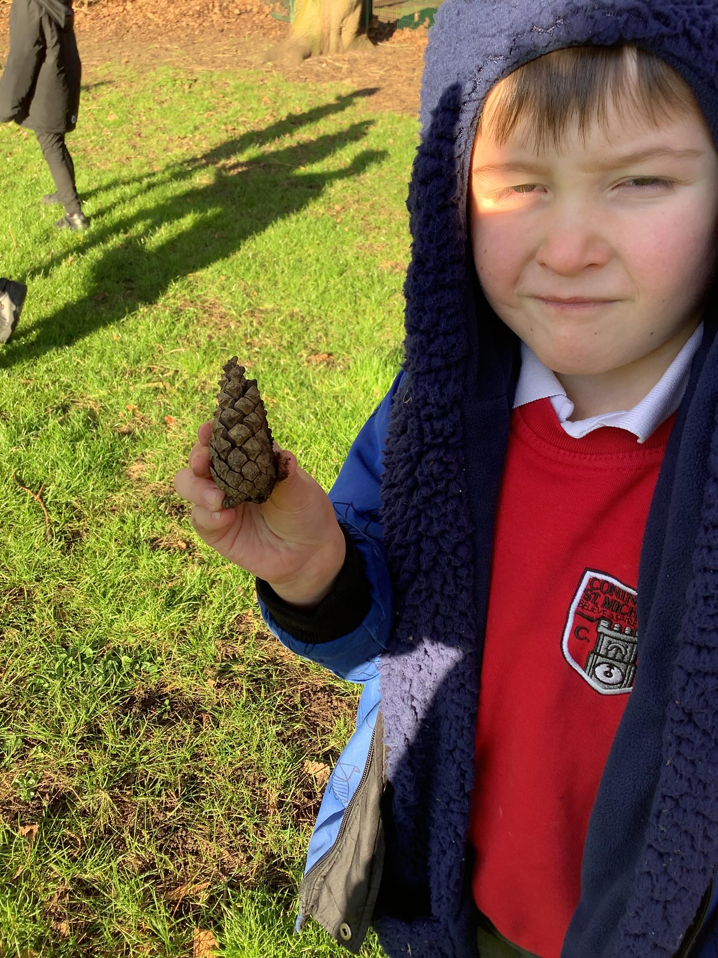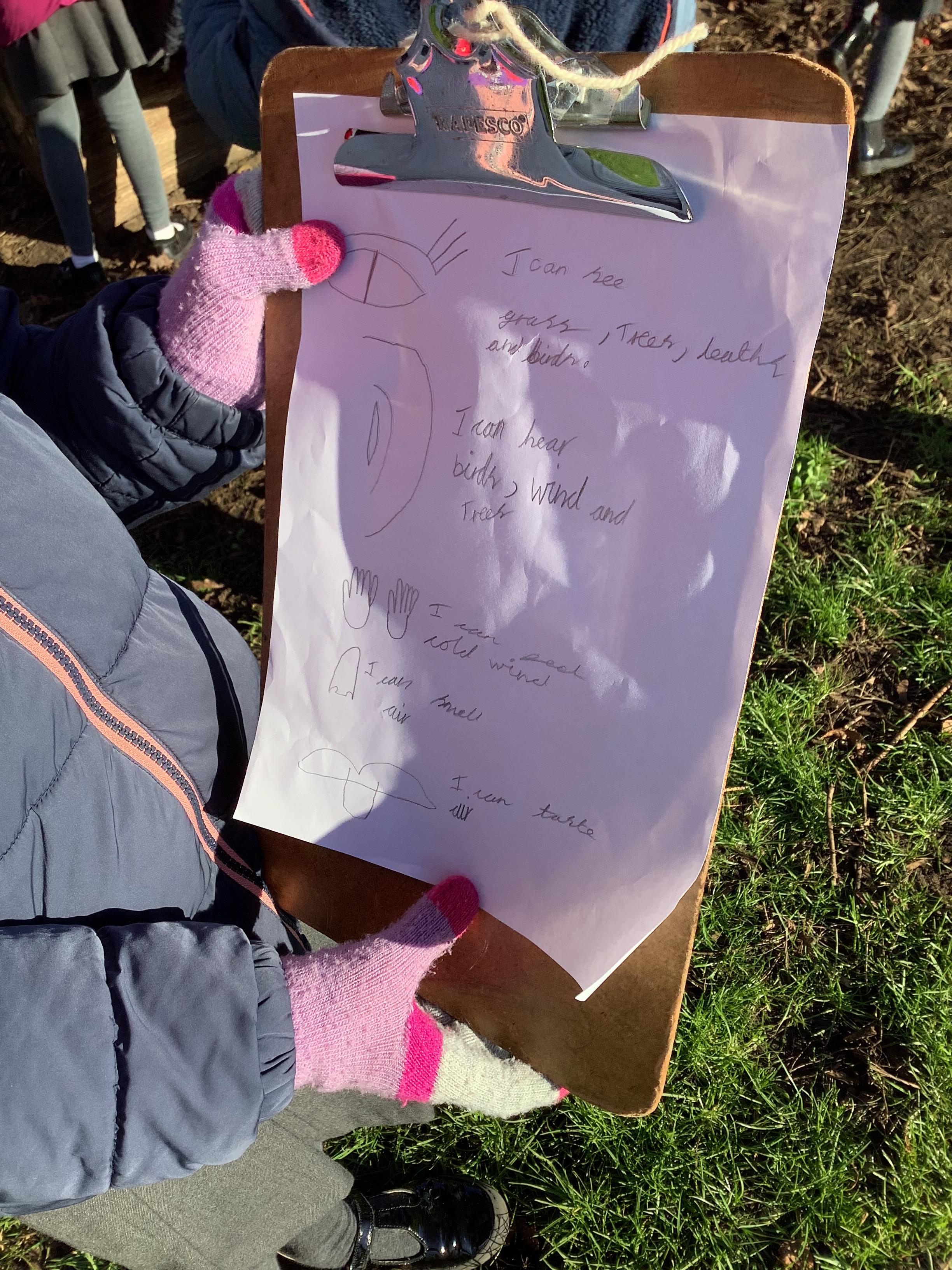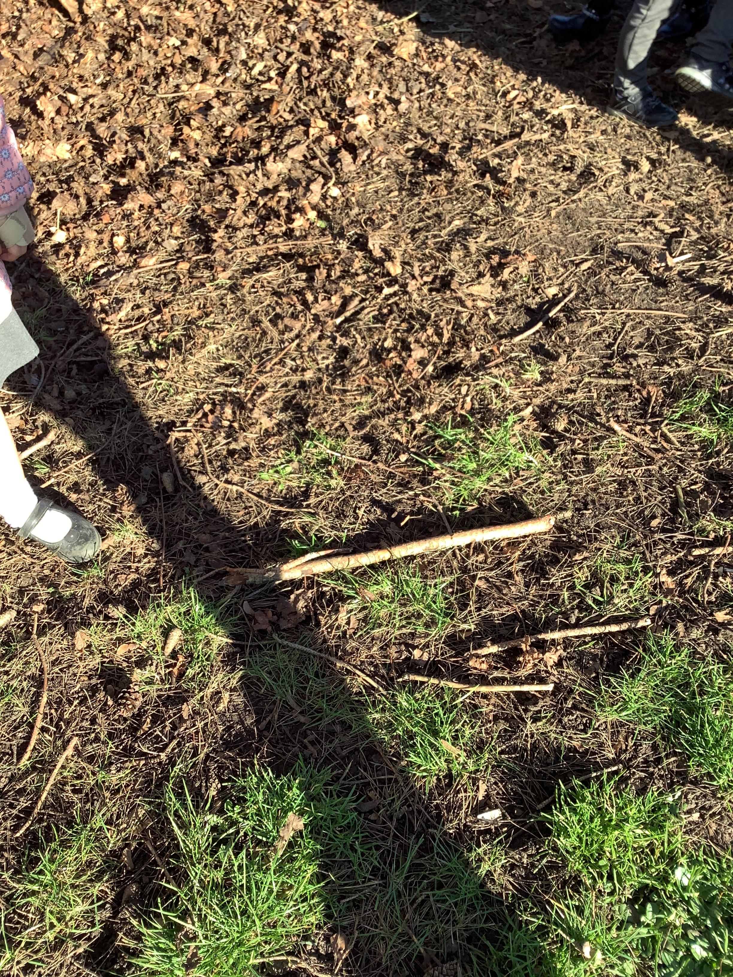 Today children went on a senses walk outside. They closed their eyes so they could hear more clearly and used their touch to feel leaves and pine cones.