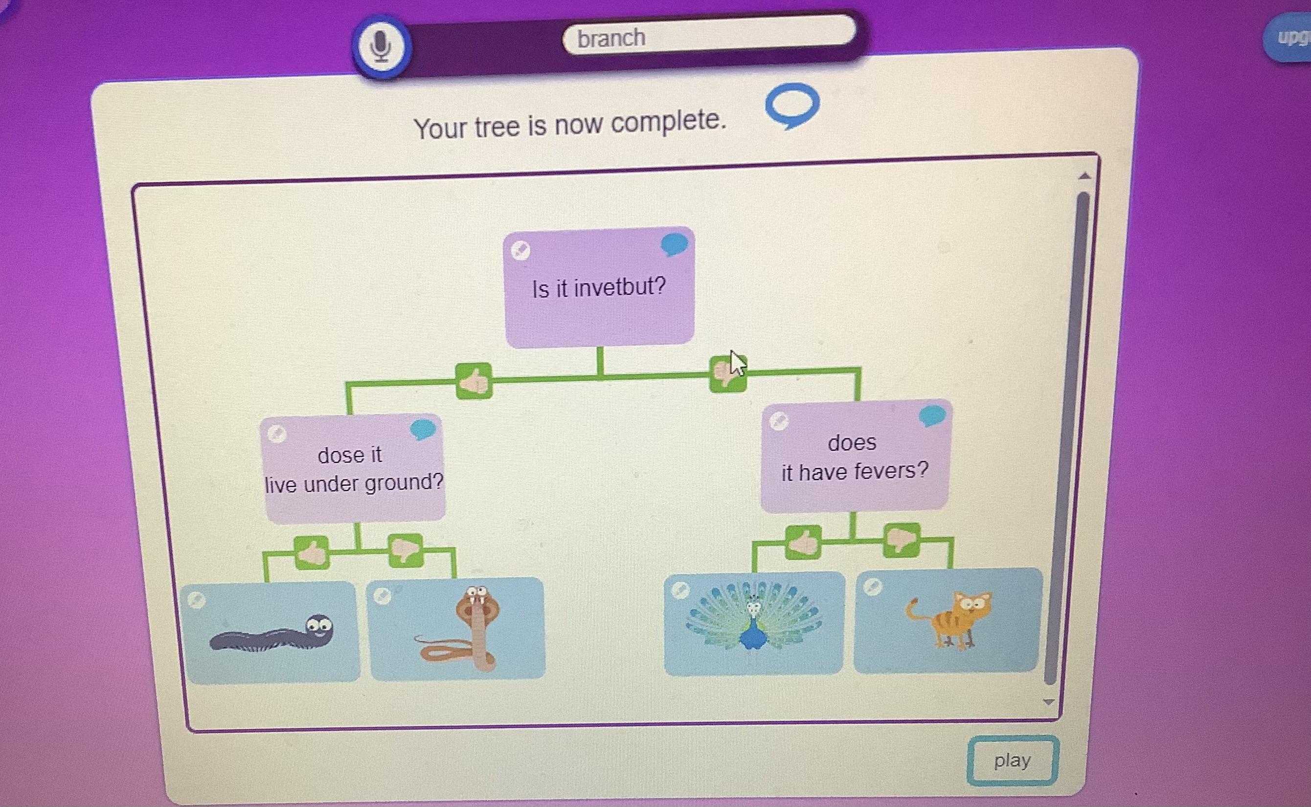 We looked at what a vertebrates and an invertebrates are and used this to help us create classification key. We then created our classification keys into classification key branching data bases on the laptops.