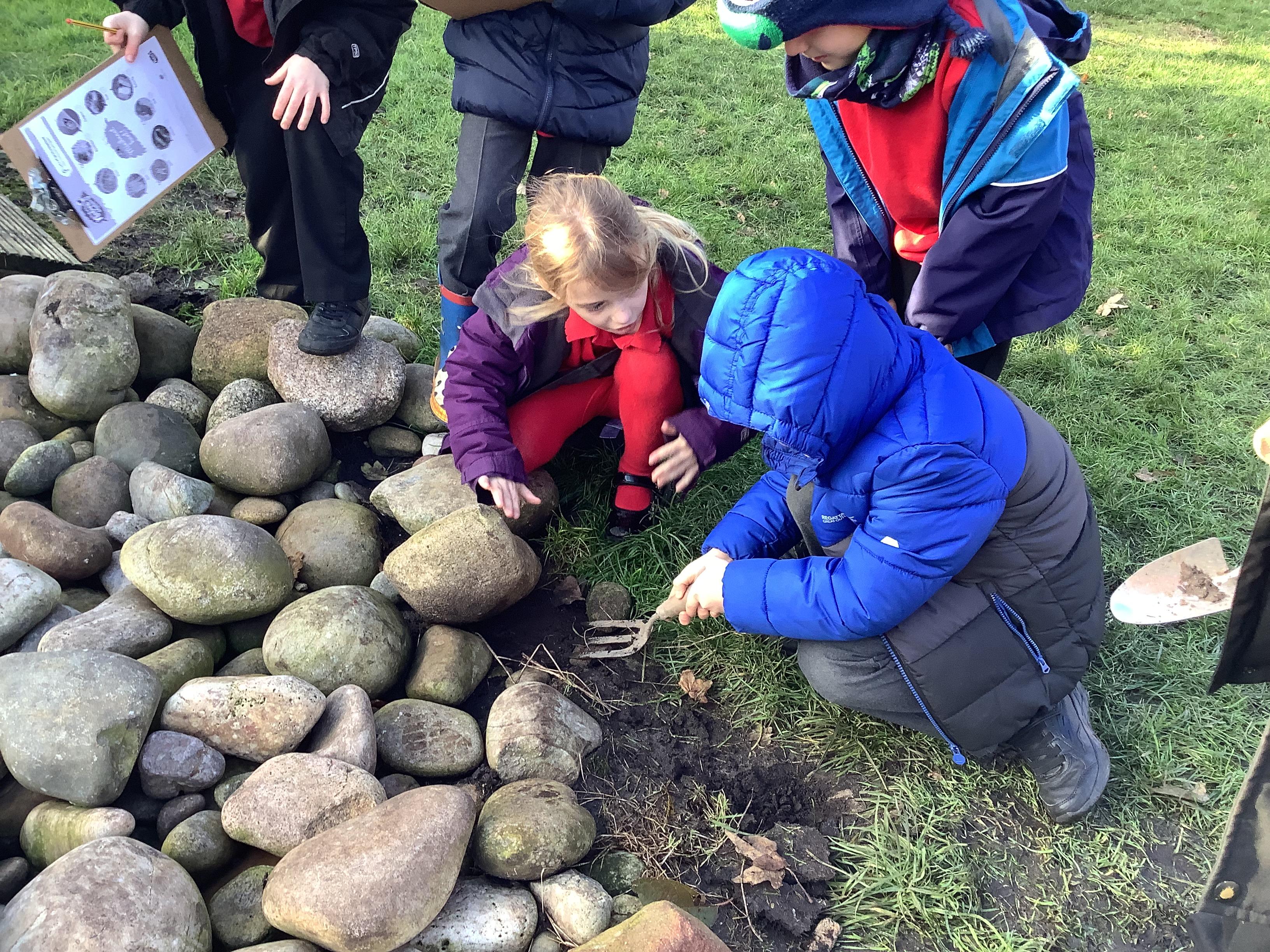 Children have started their new topic of, 'Living Things and their Habitats', by looking in the Mystical Garden for minibeasts! They looked under rocks, logs and soil to find wood lice, beetles, slugs, worms and spiders. Children were careful to just look at not touch as they decided they wouldn't like to be lifted up and removed from their homes! Children also learnt the term micro habitat when looking at the minibeasts.