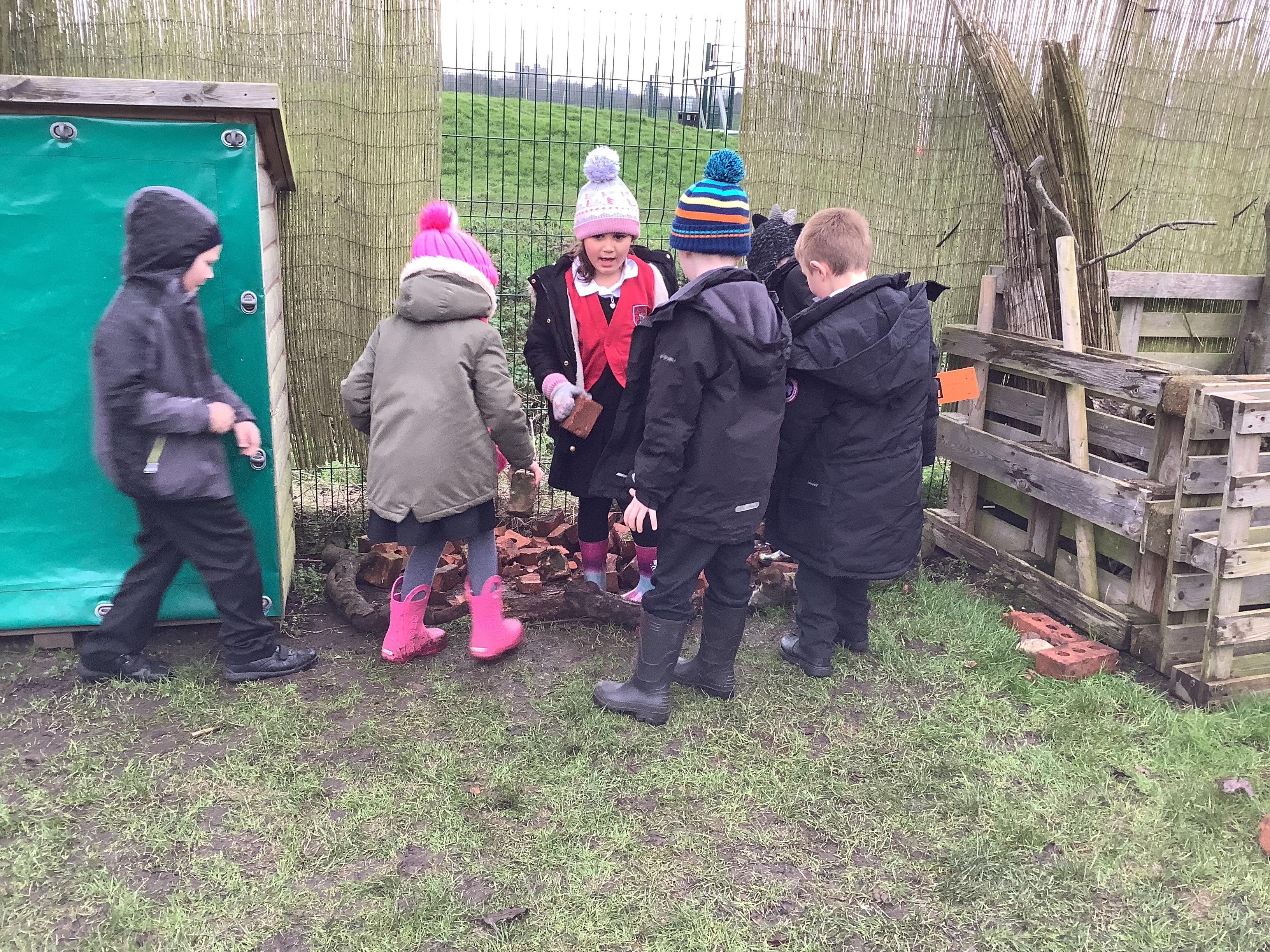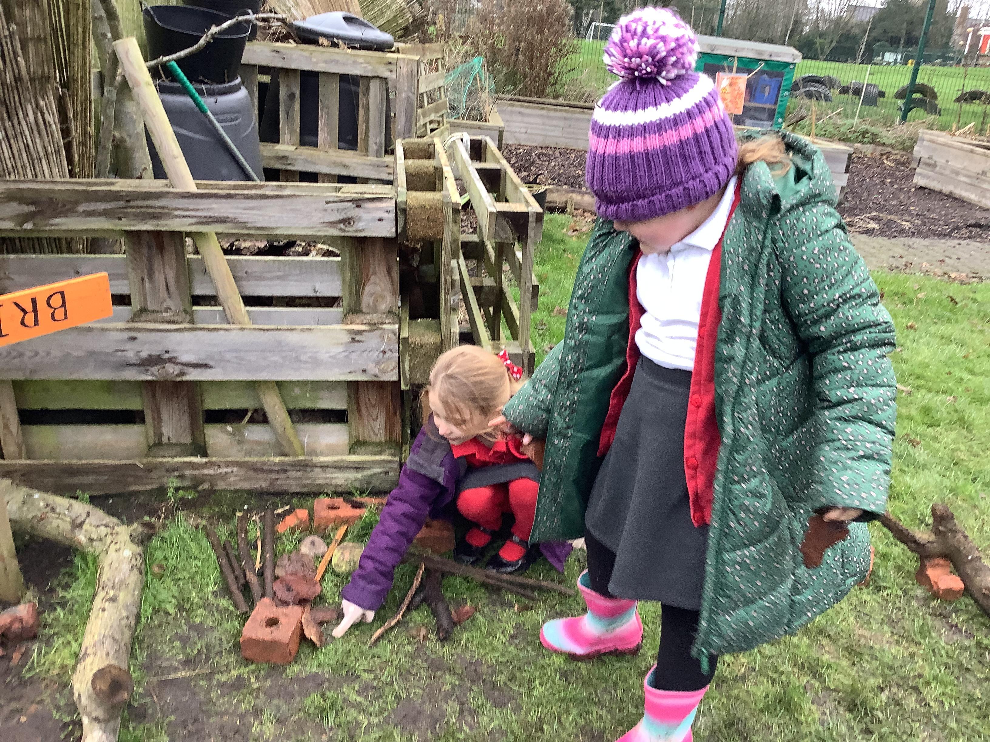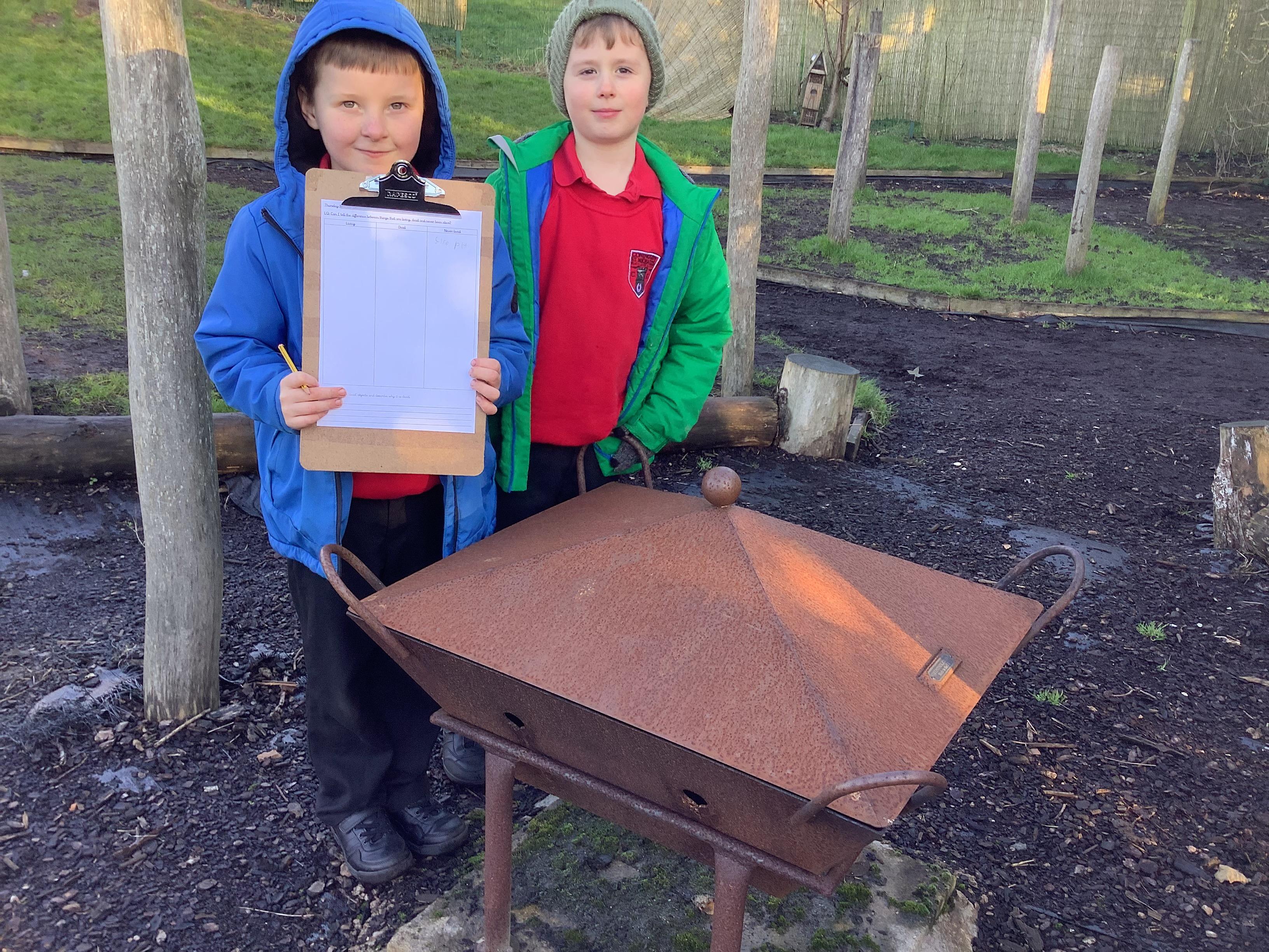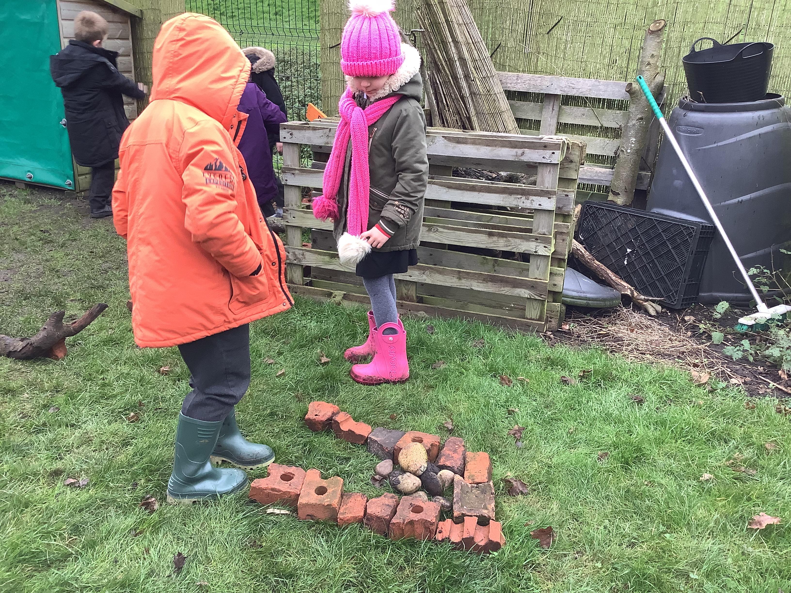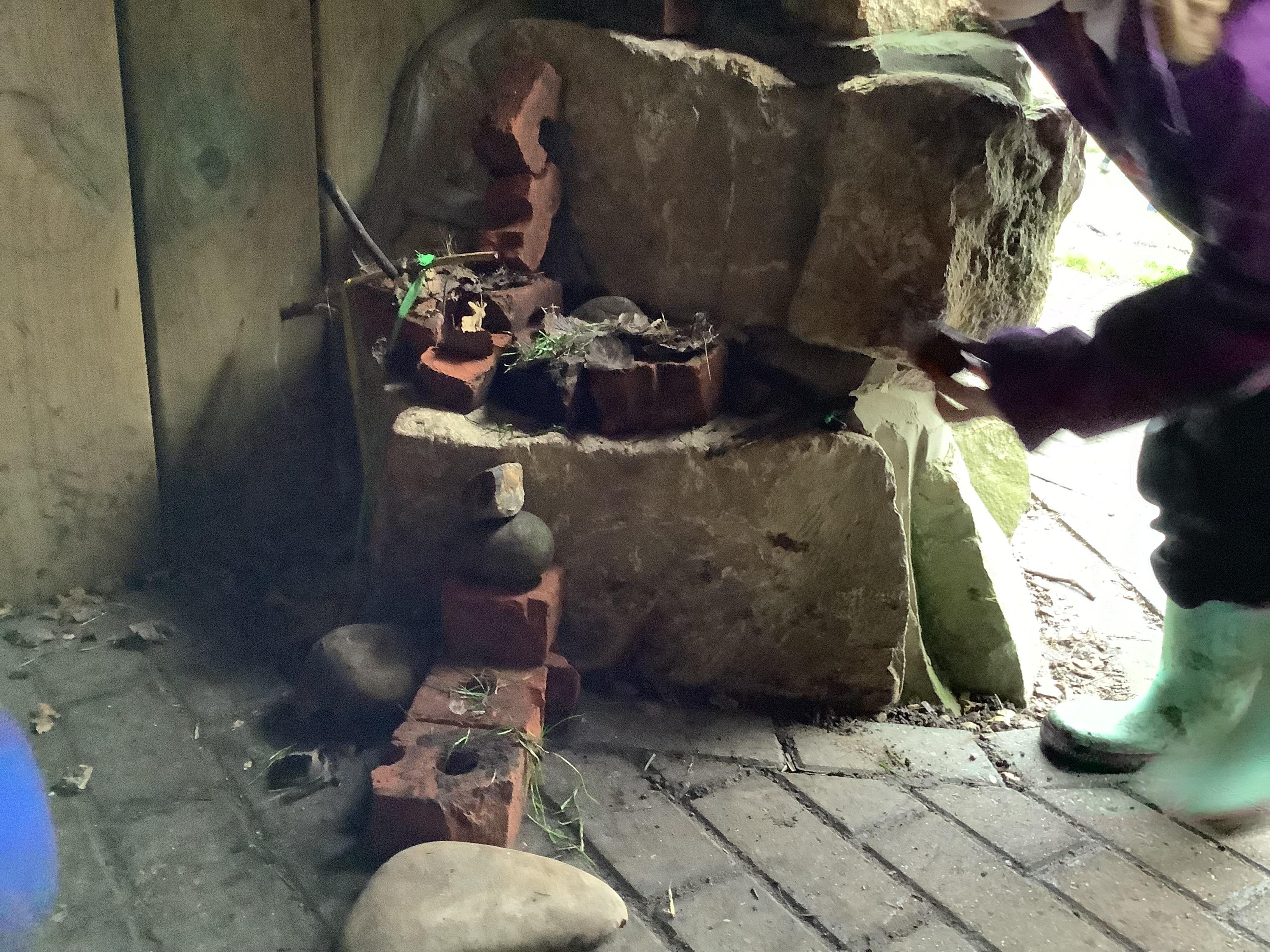 This week children have been continuing their learning by looking in the Mystical Garden at things that are, 'living, dead and never lived'. They found lots of things that are living especially as we have goats and chickens plus all the minibeasts that they have already discovered. They discovered that all the wooden buildings, such as the shelter, chicken coup, planters and bridges were dead because they had once been living when they were trees but have been chopped down and made into other things. They then looked for things that had never lived, such as the fire pit which is metal.