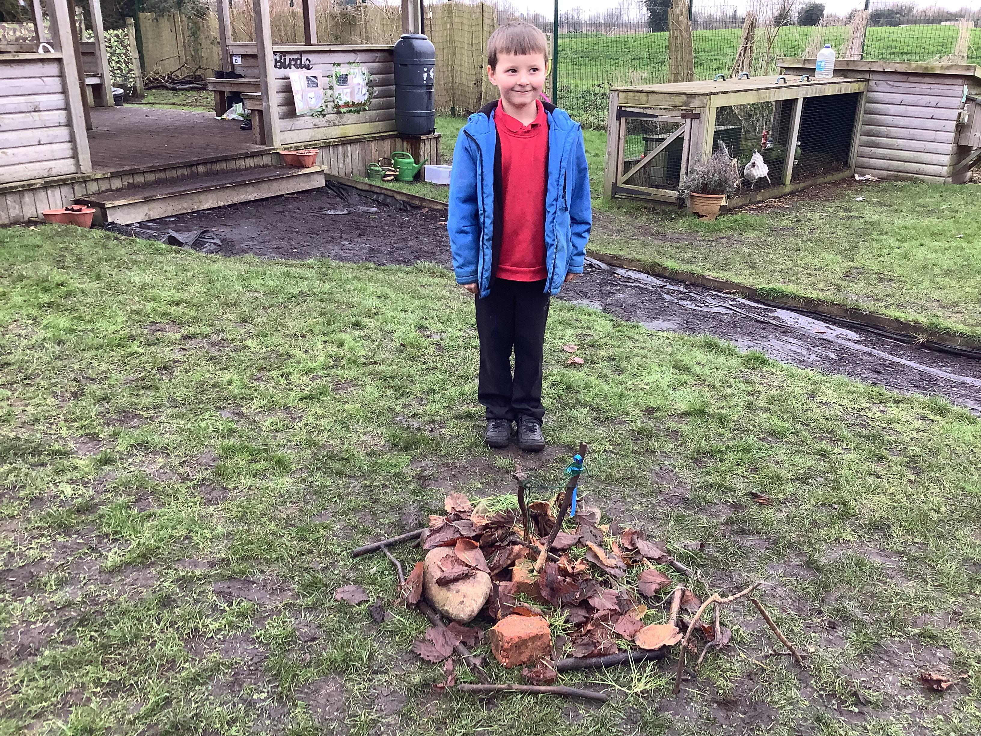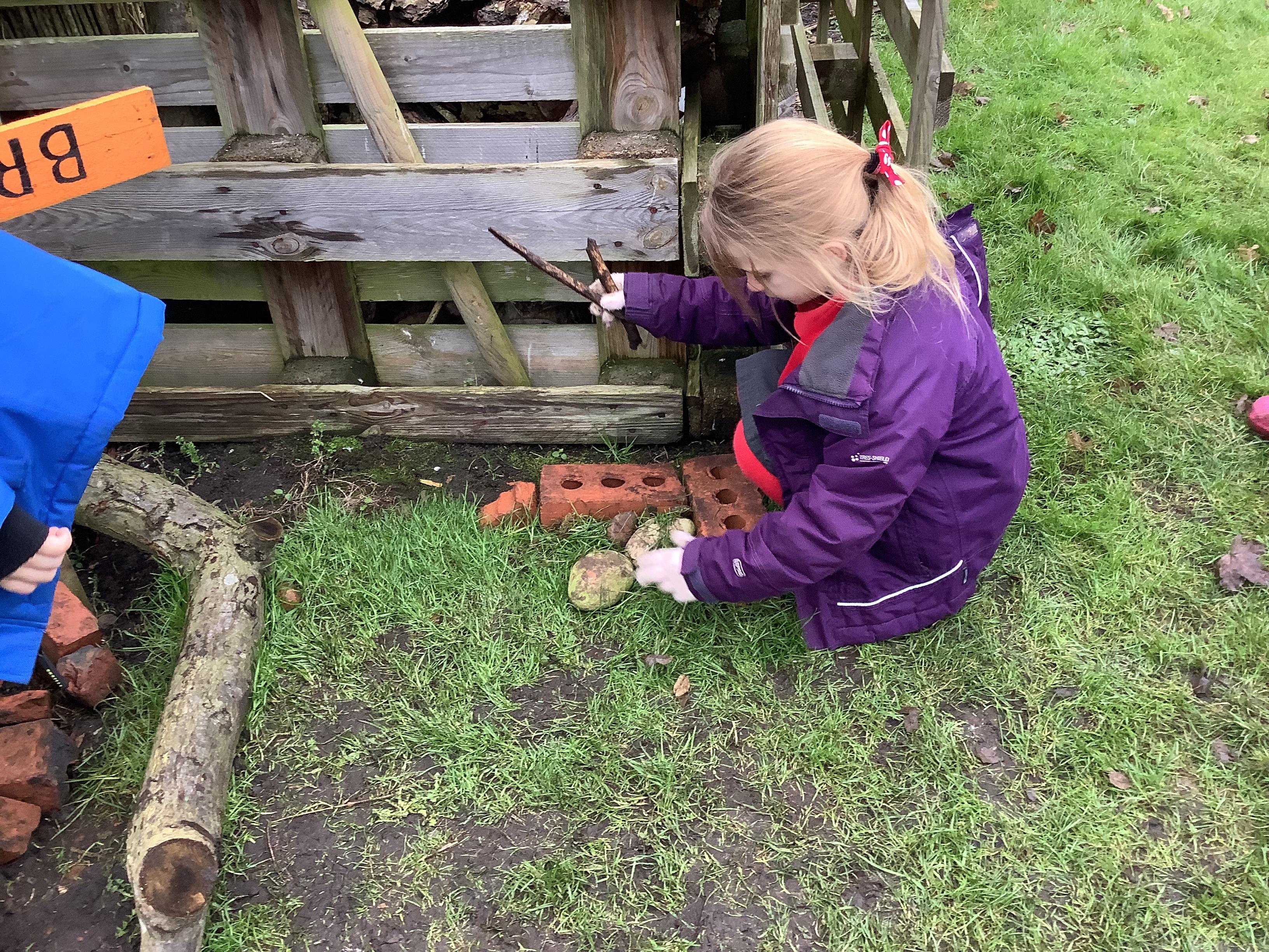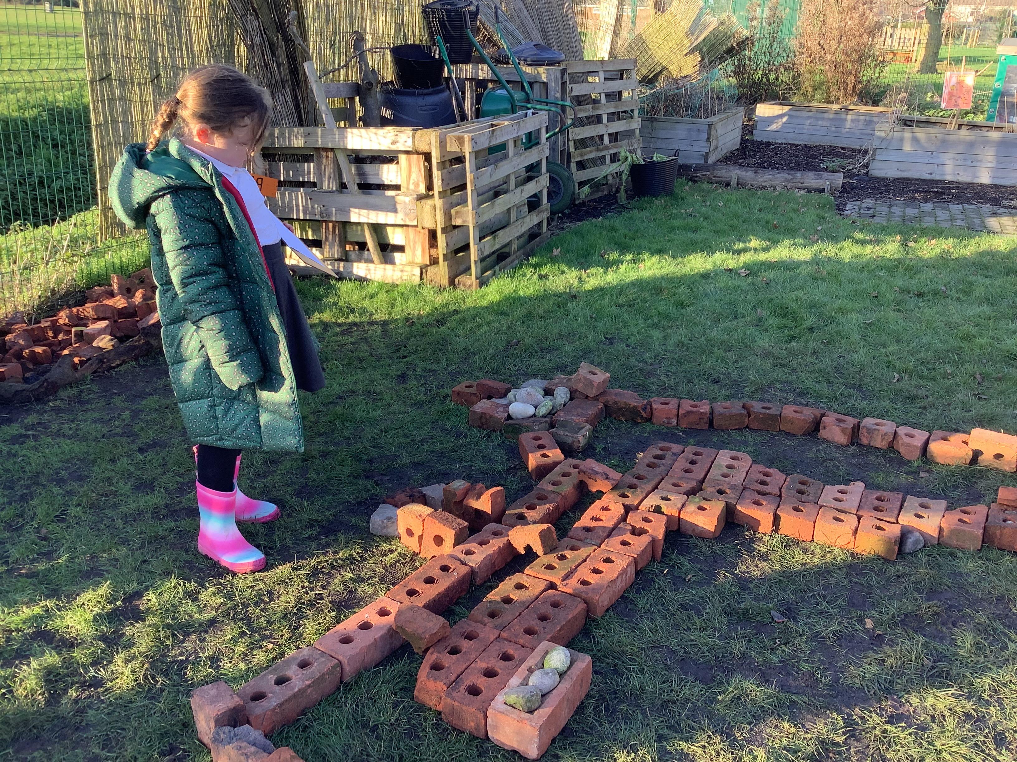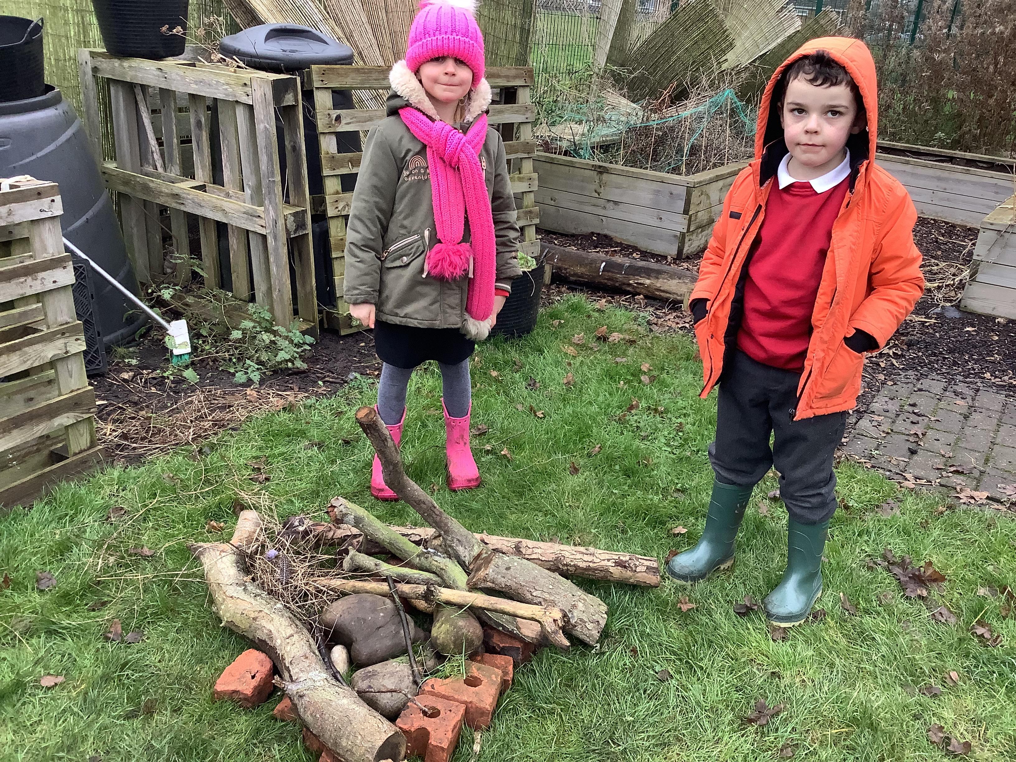 This week children have been continuing their learning by looking in the Mystical Garden at things that are, 'living, dead and never lived'. They found lots of things that are living especially as we have goats and chickens plus all the minibeasts that they have already discovered. They discovered that all the wooden buildings, such as the shelter, chicken coup, planters and bridges were dead because they had once been living when they were trees but have been chopped down and made into other things. They then looked for things that had never lived, such as the fire pit which is metal.