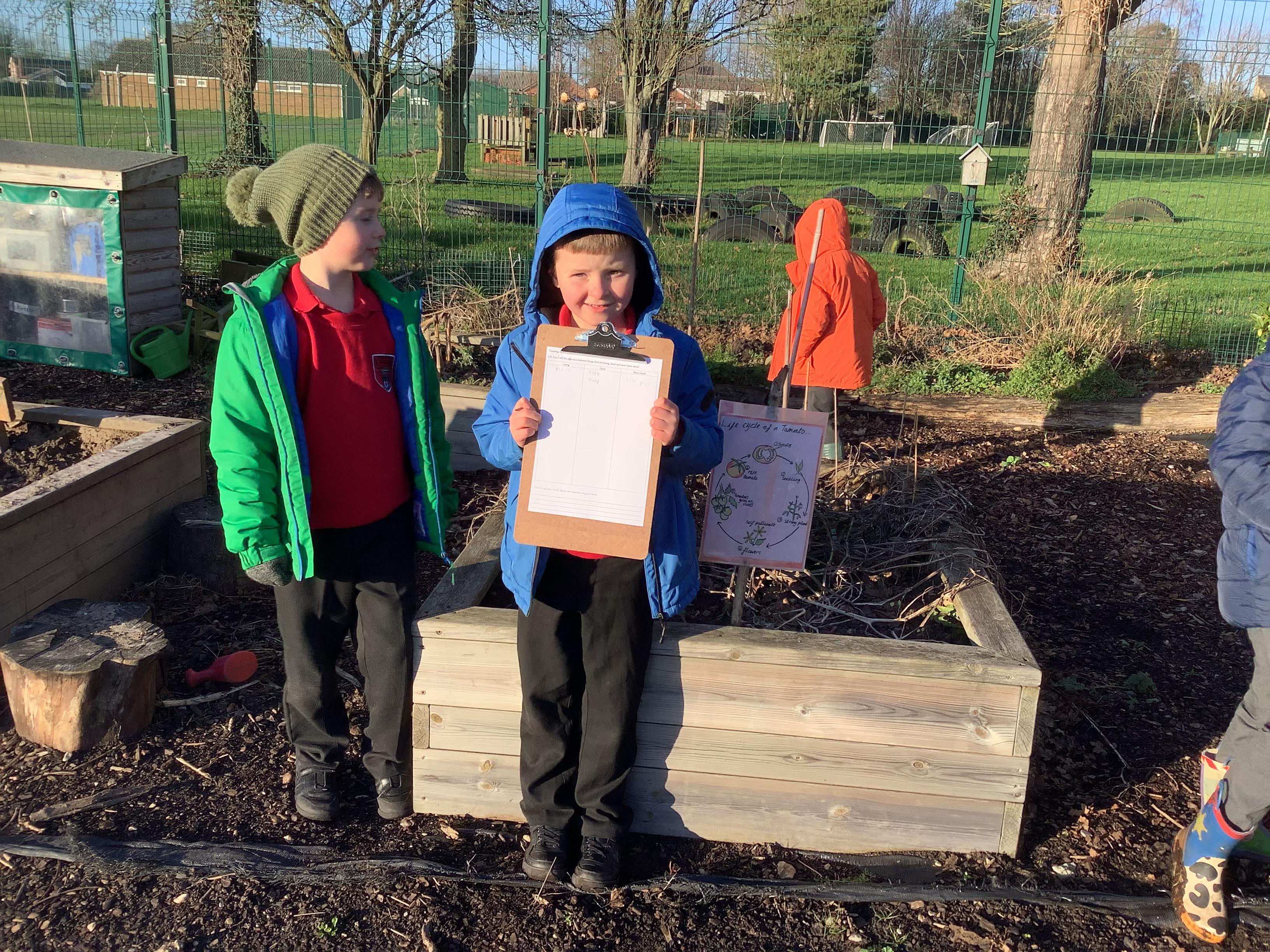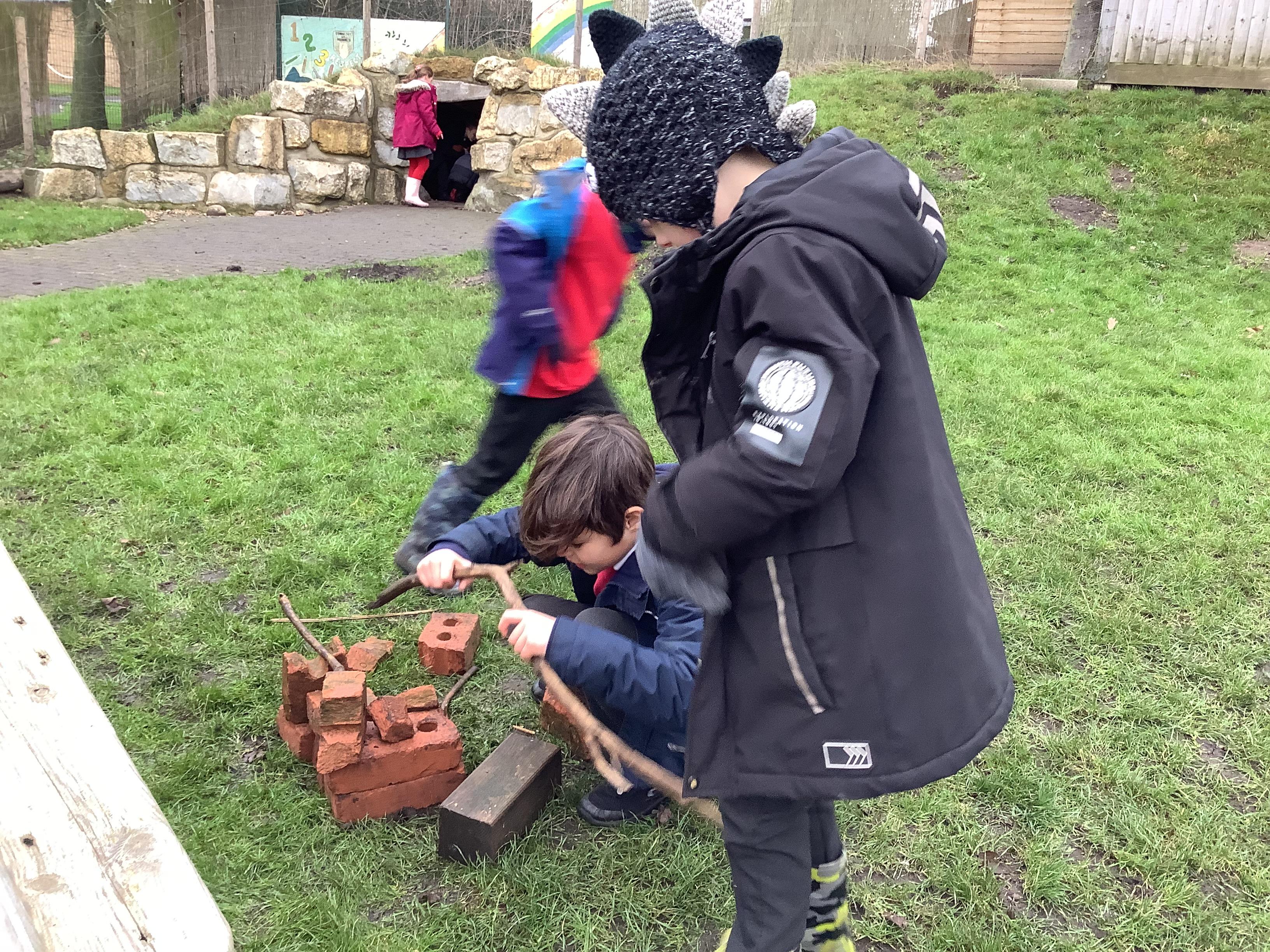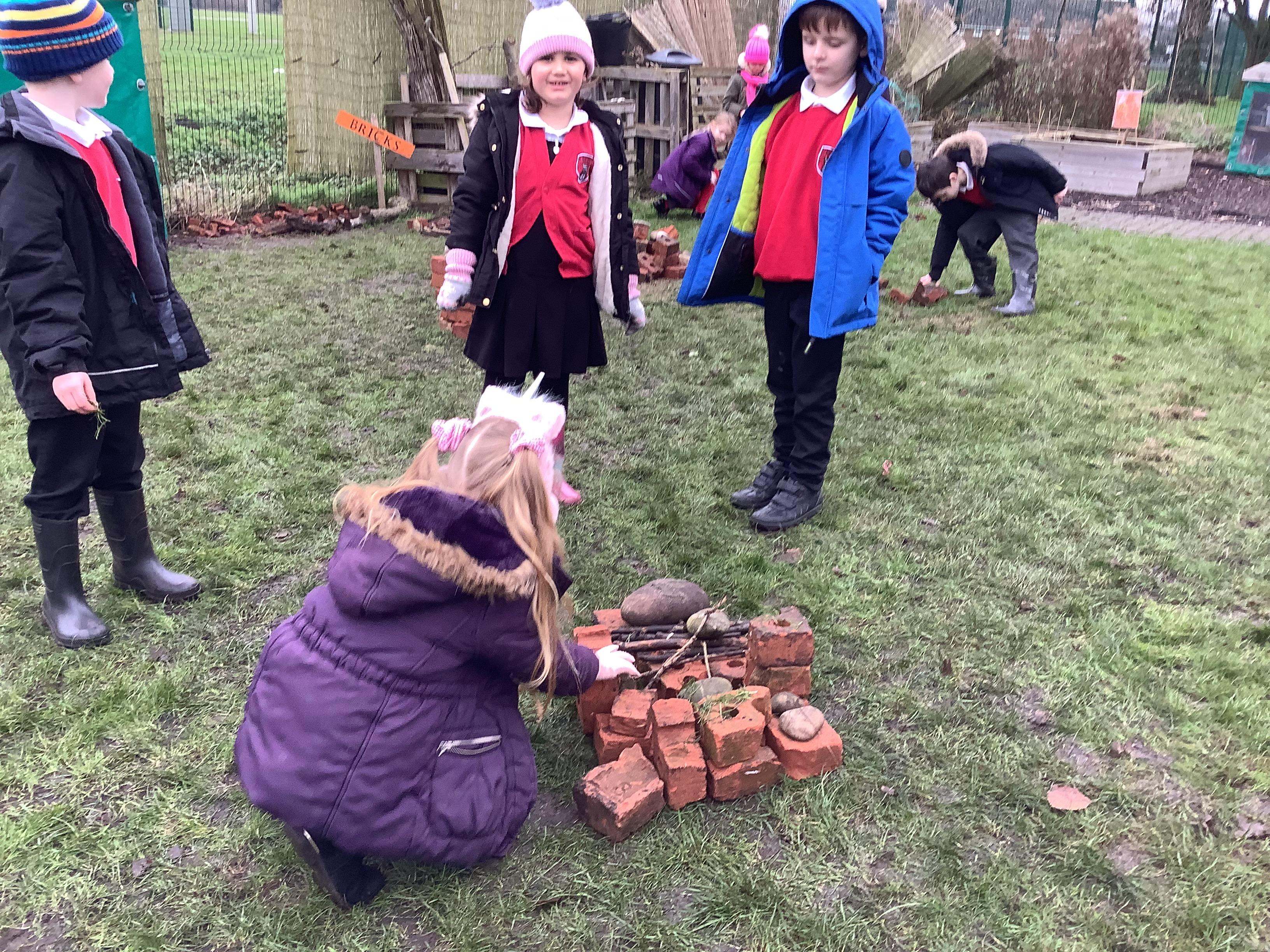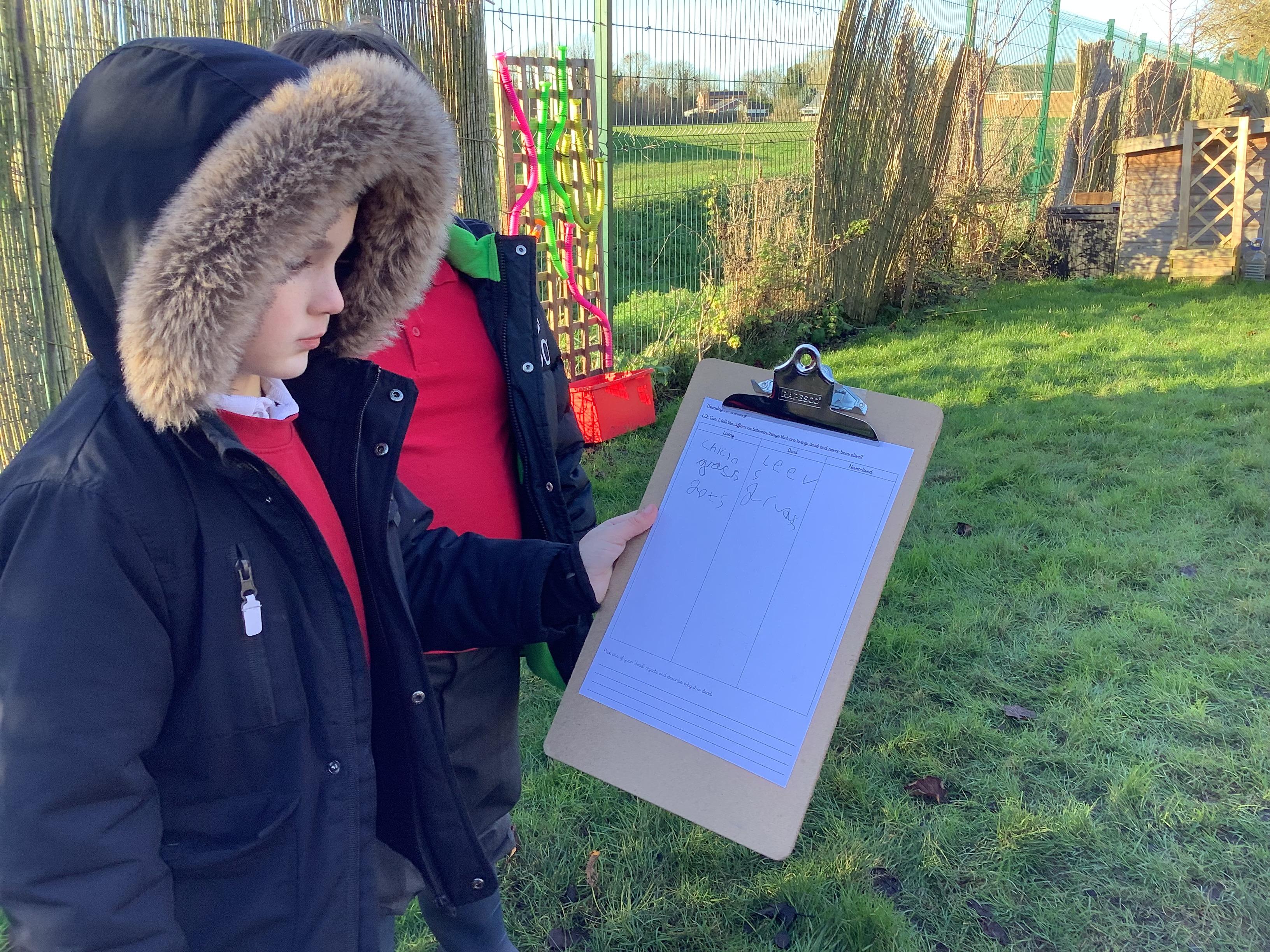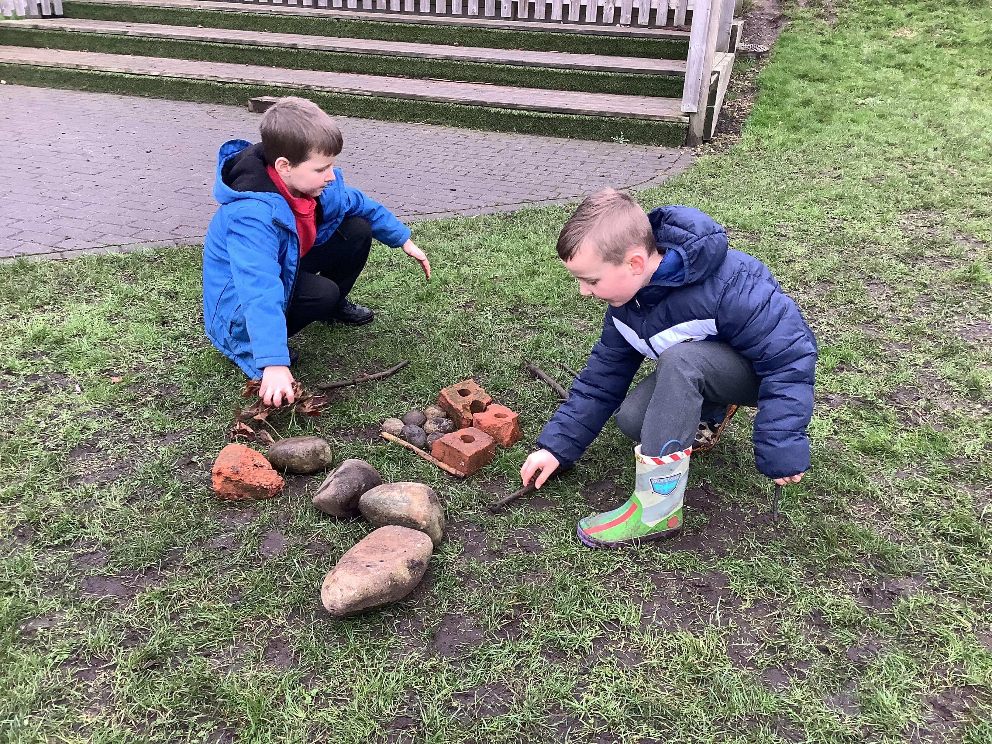 This week children have been continuing their learning by looking in the Mystical Garden at things that are, 'living, dead and never lived'. They found lots of things that are living especially as we have goats and chickens plus all the minibeasts that they have already discovered. They discovered that all the wooden buildings, such as the shelter, chicken coup, planters and bridges were dead because they had once been living when they were trees but have been chopped down and made into other things. They then looked for things that had never lived, such as the fire pit which is metal.