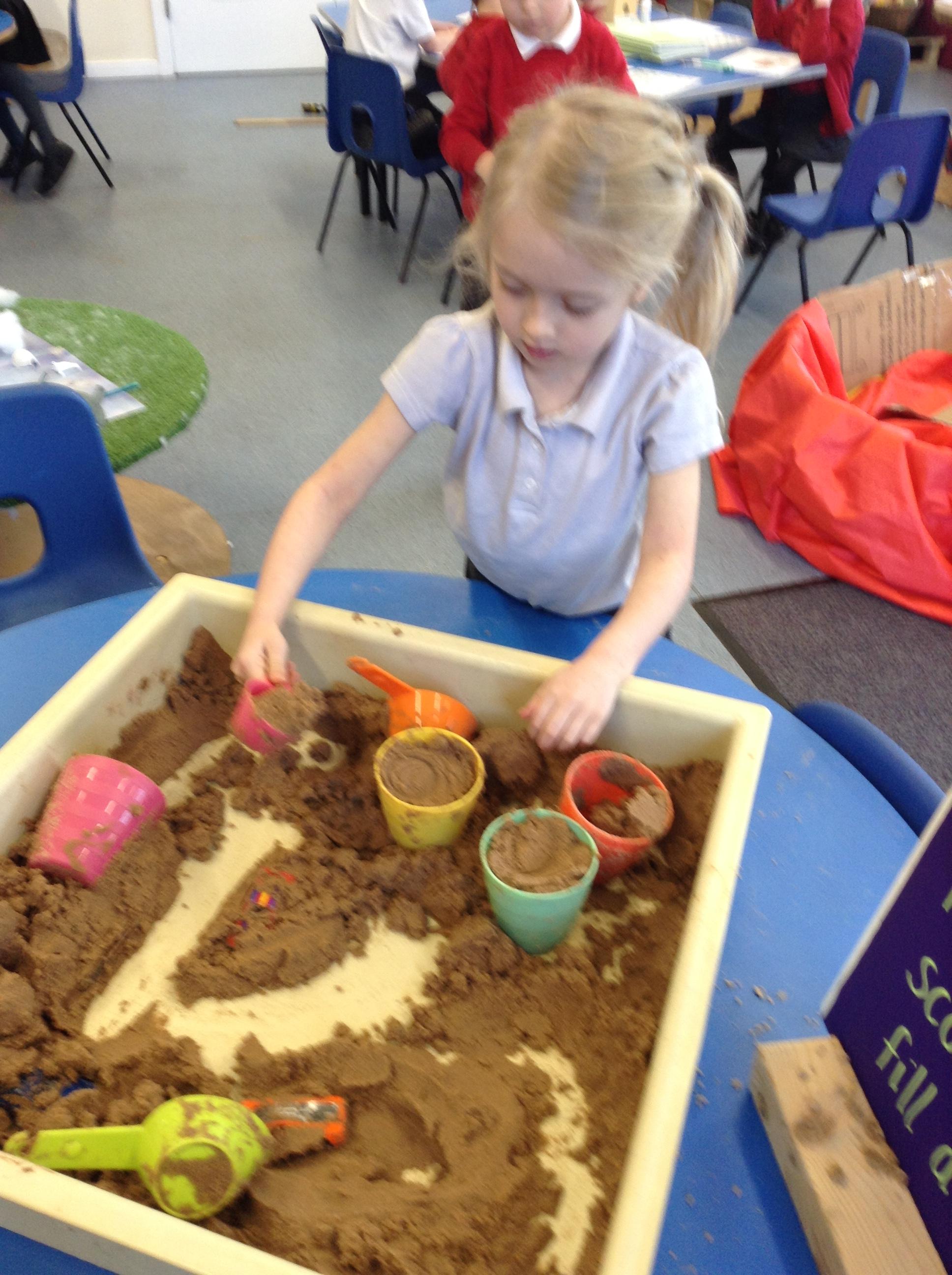 We used bottles with water in and described how full the bottle was using language full, empty, nearly empty and nearly full. The children enjoyed using different sized scoops and cups to find out how many scoops of sand it took to fill a cup.