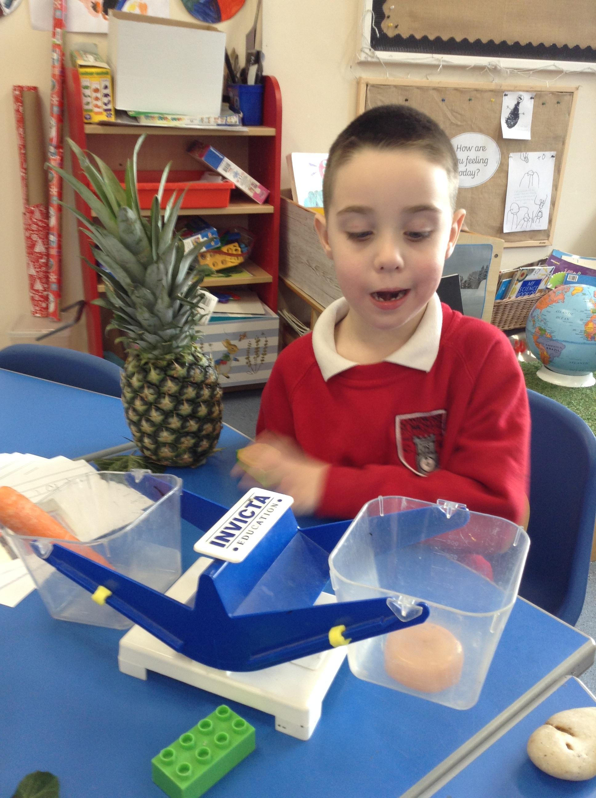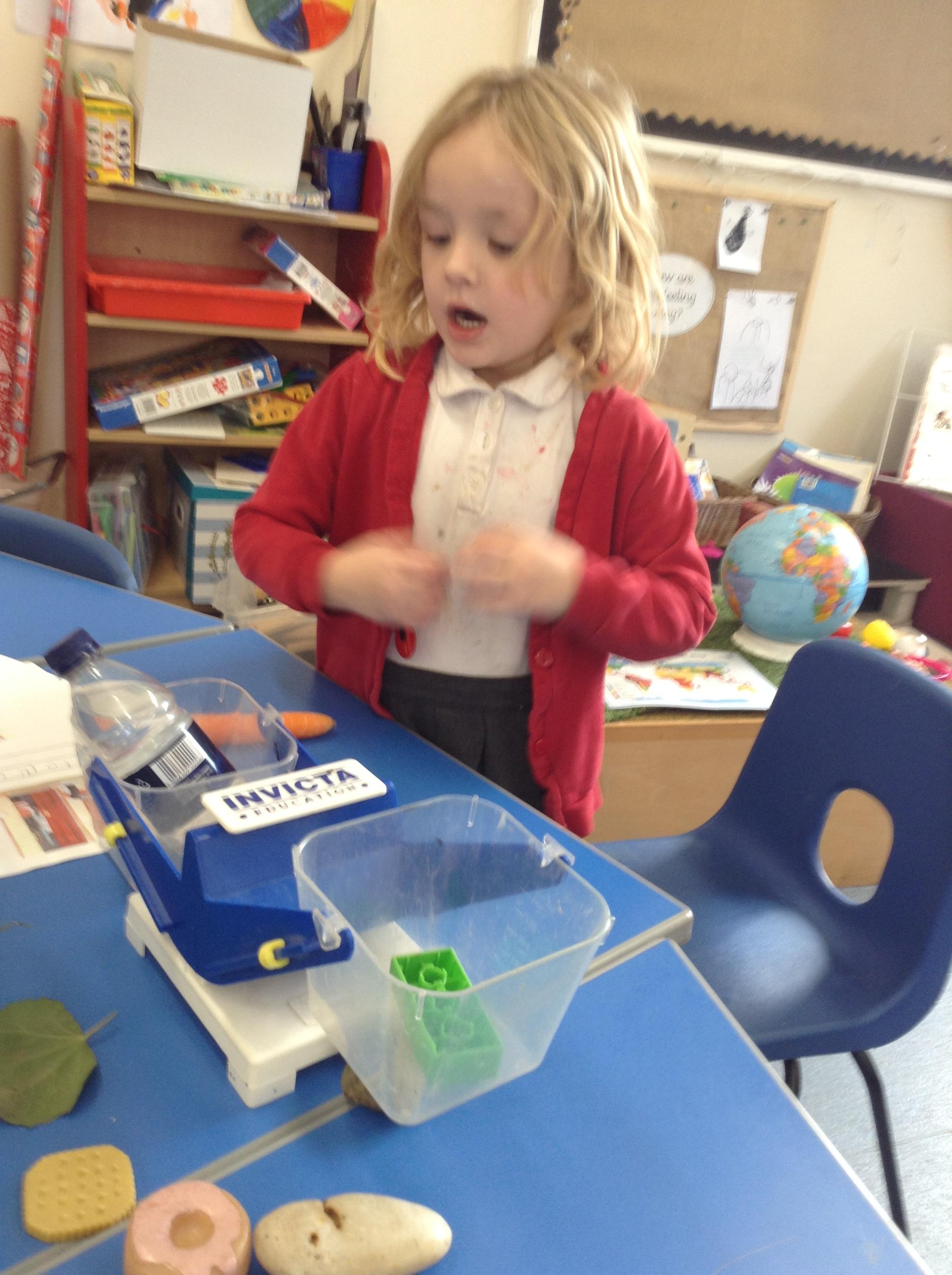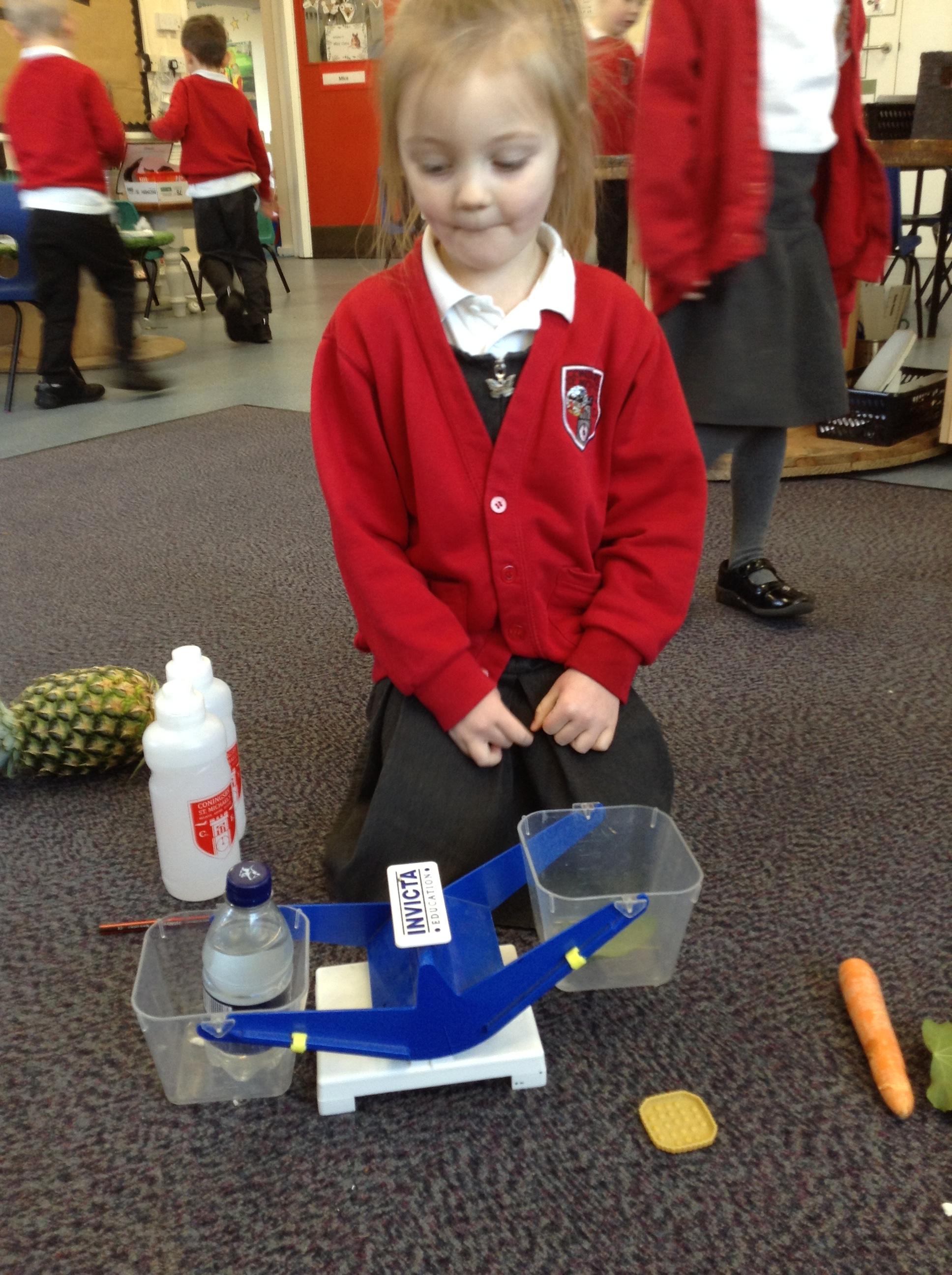 In maths this week we have been looking at weight and capacity. On Monday we used the balancing scales to weigh different objects and then we used mathematical language to describe what we saw.
